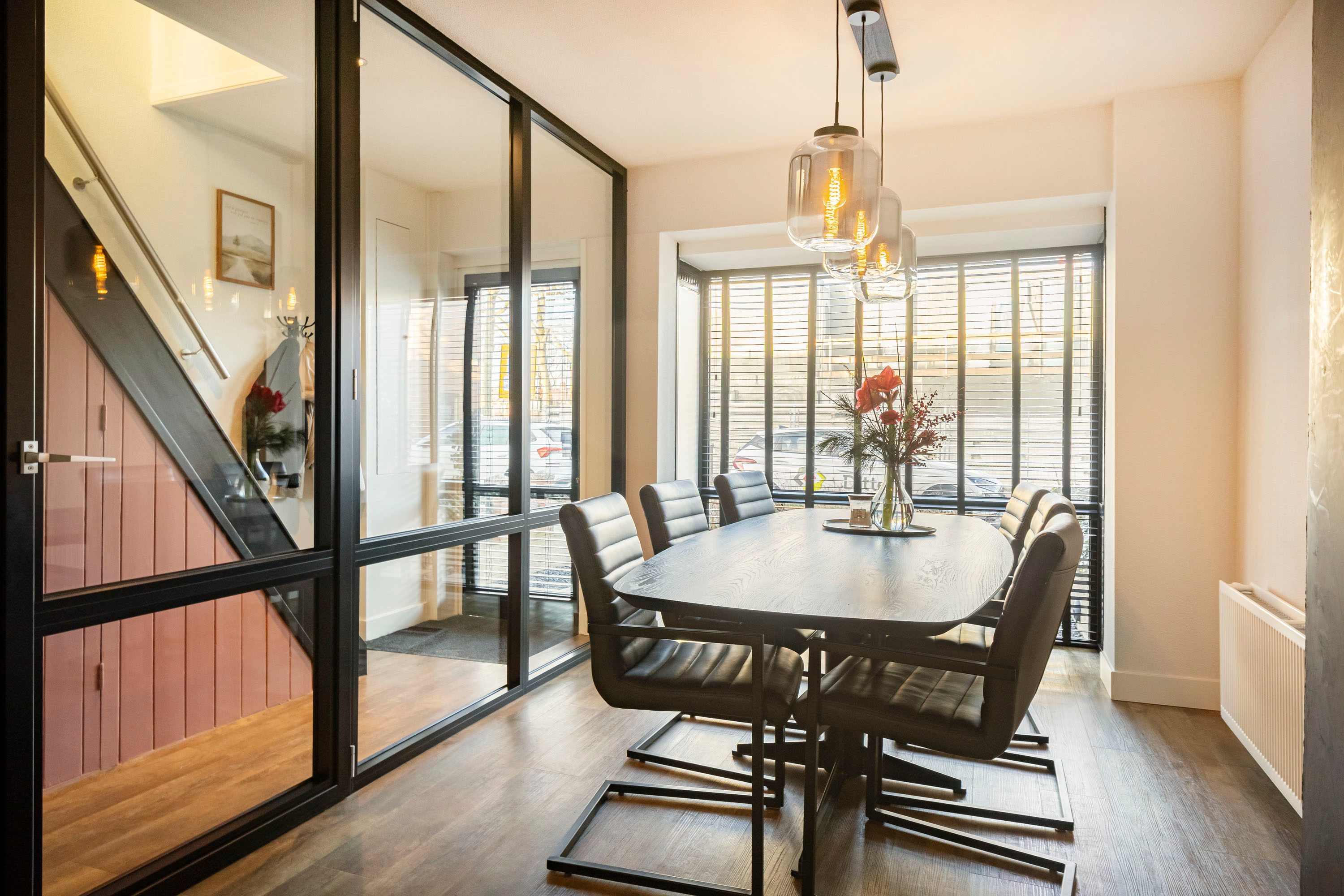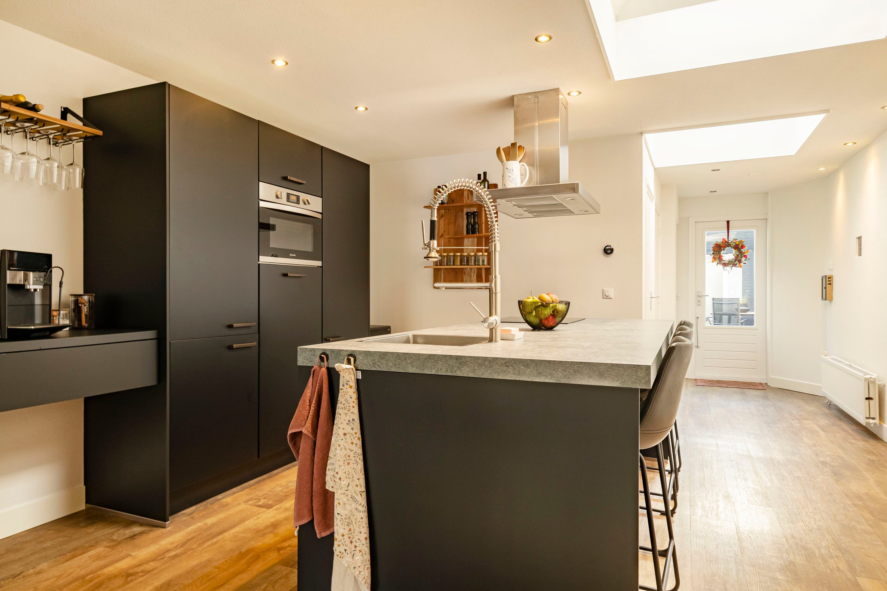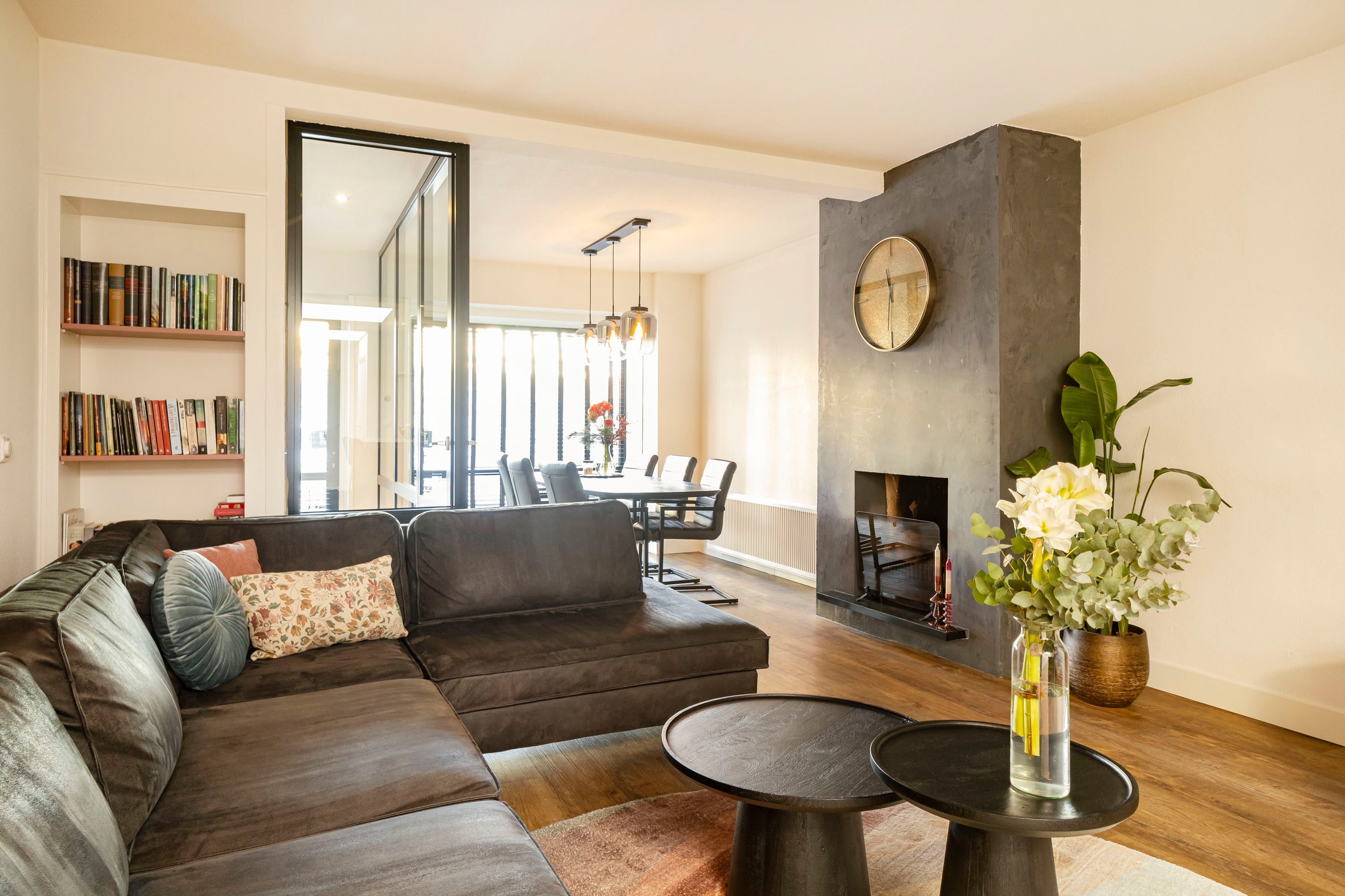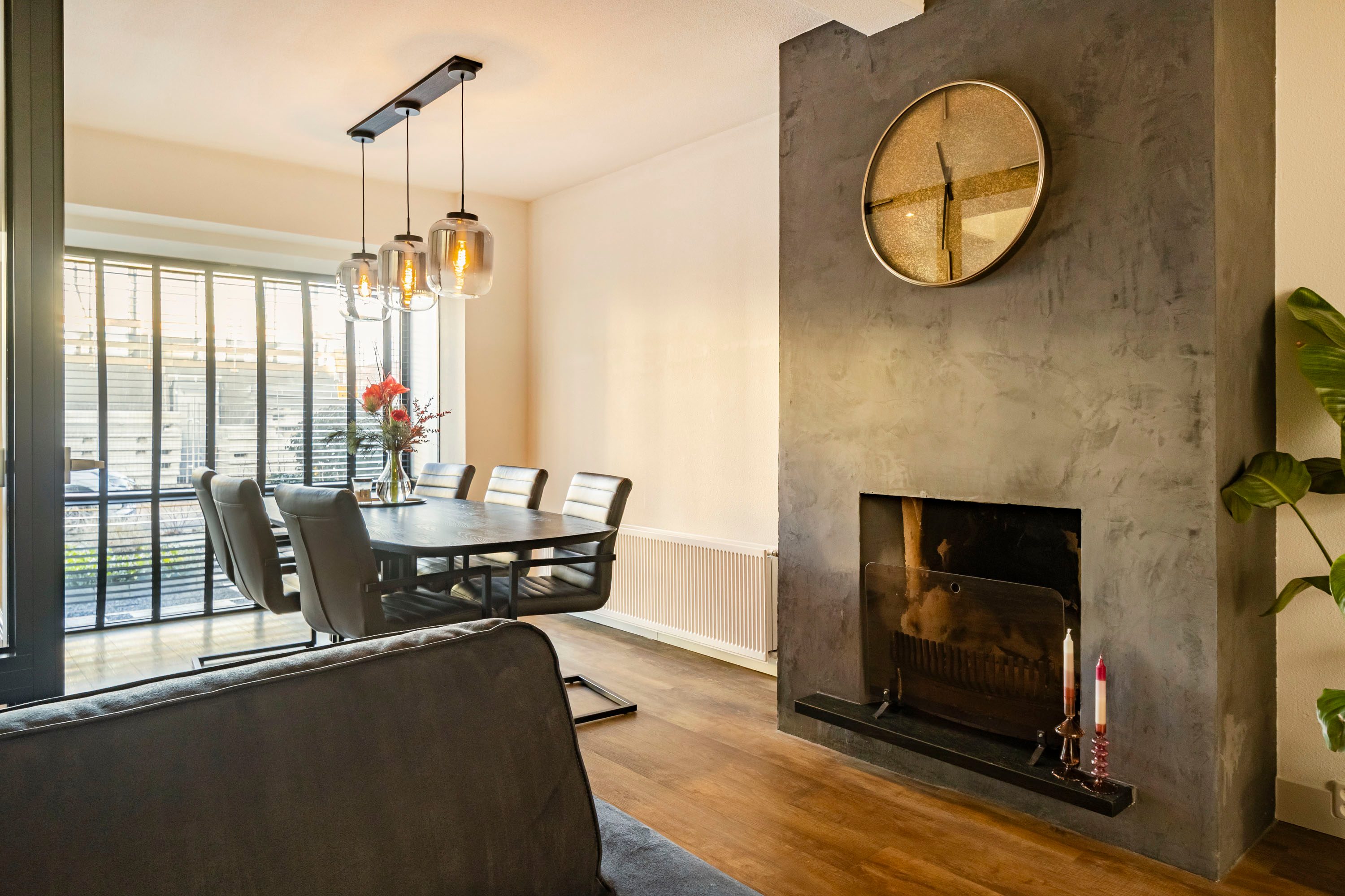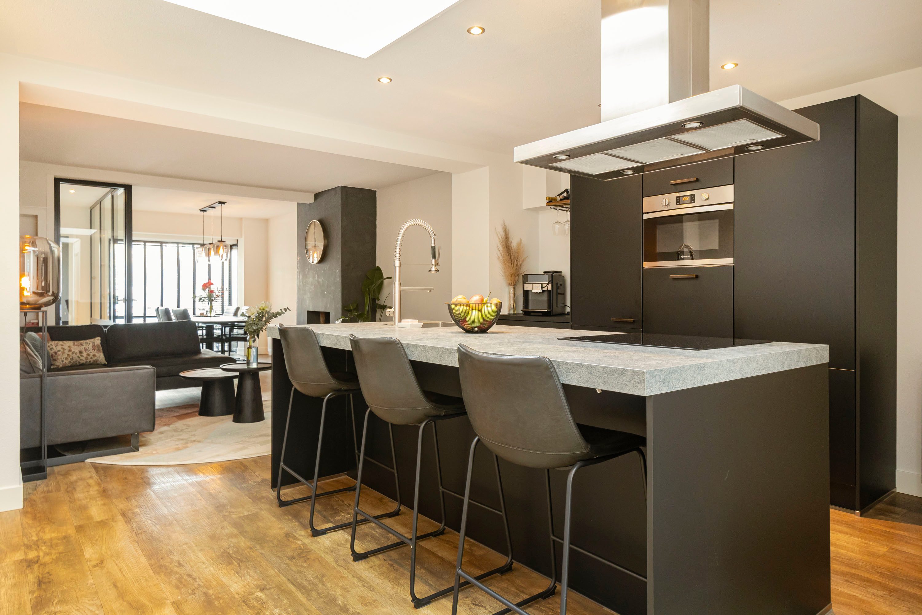 Bij binnenkomst via de entree, waar zich ook de meterkast en de trap bevinden, valt direct de stijlvolle zwarte glazen pui op. Deze eyecatcher biedt een prachtige doorkijk naar de woonkamer en zet meteen de juiste toon voor de rest van het huis. De royale woonkamer ademt sfeer en biedt aan de voorzijde een heerlijke plek voor een grote eettafel in de lichte erker. In het hart van de kamer nodigt de open haard uit tot gezellige avonden in de zithoek. De aangrenzende designkeuken is een droom voor elke kookliefhebber, compleet met een chic kookeiland, zwarte kastenwand en hoogwaardige inbouwapparatuur zoals een inductiekookplaat en oven.