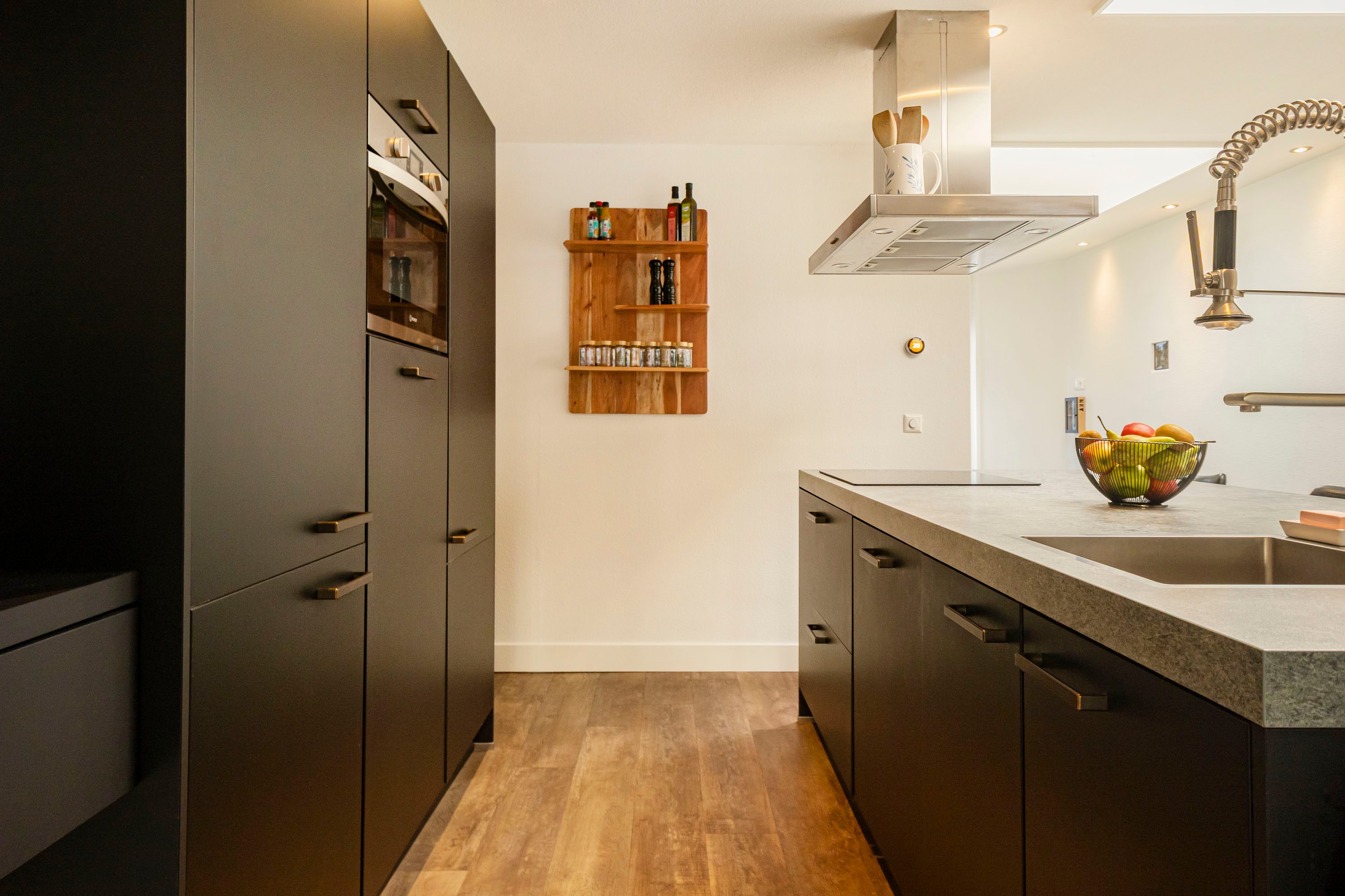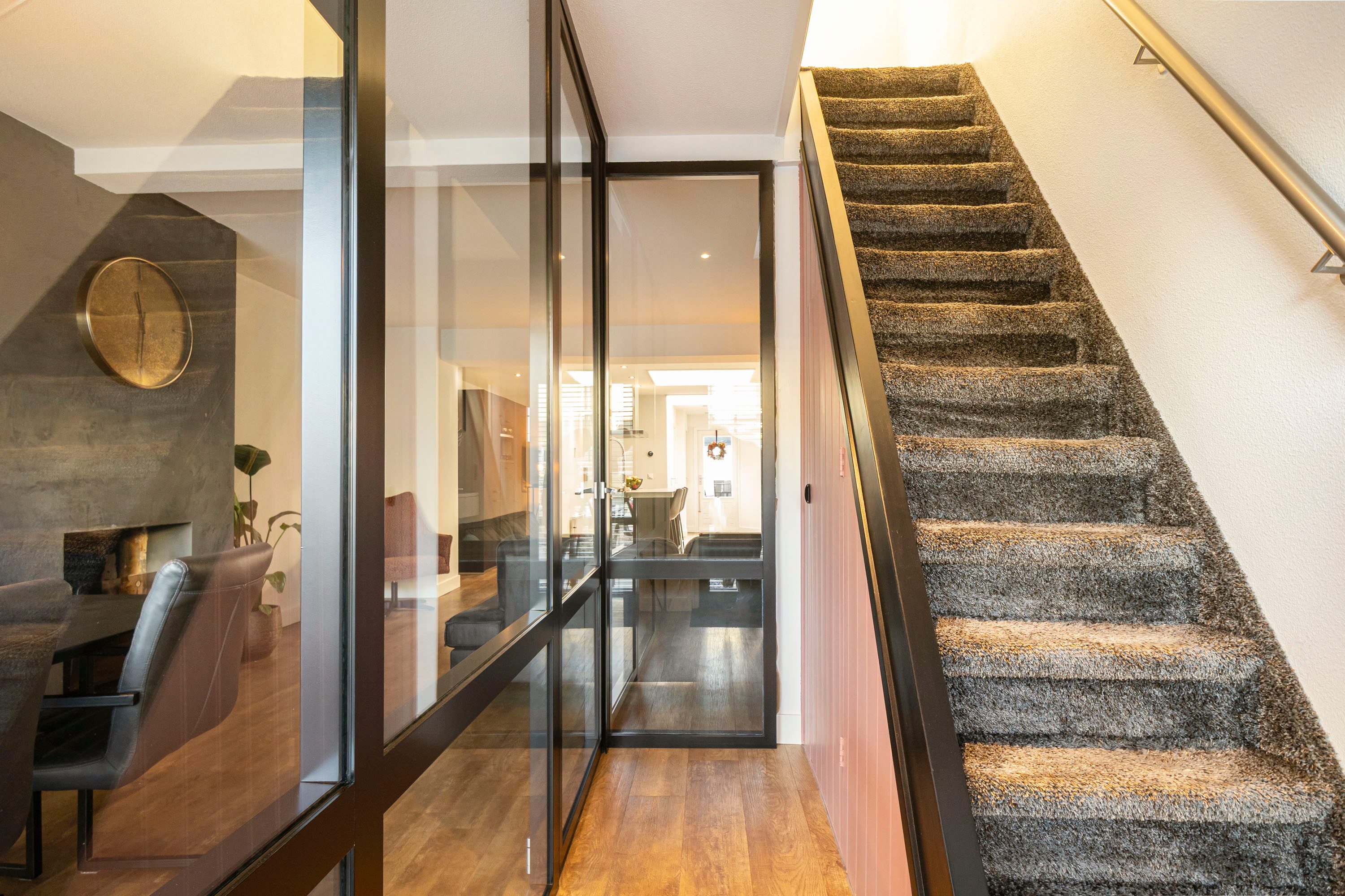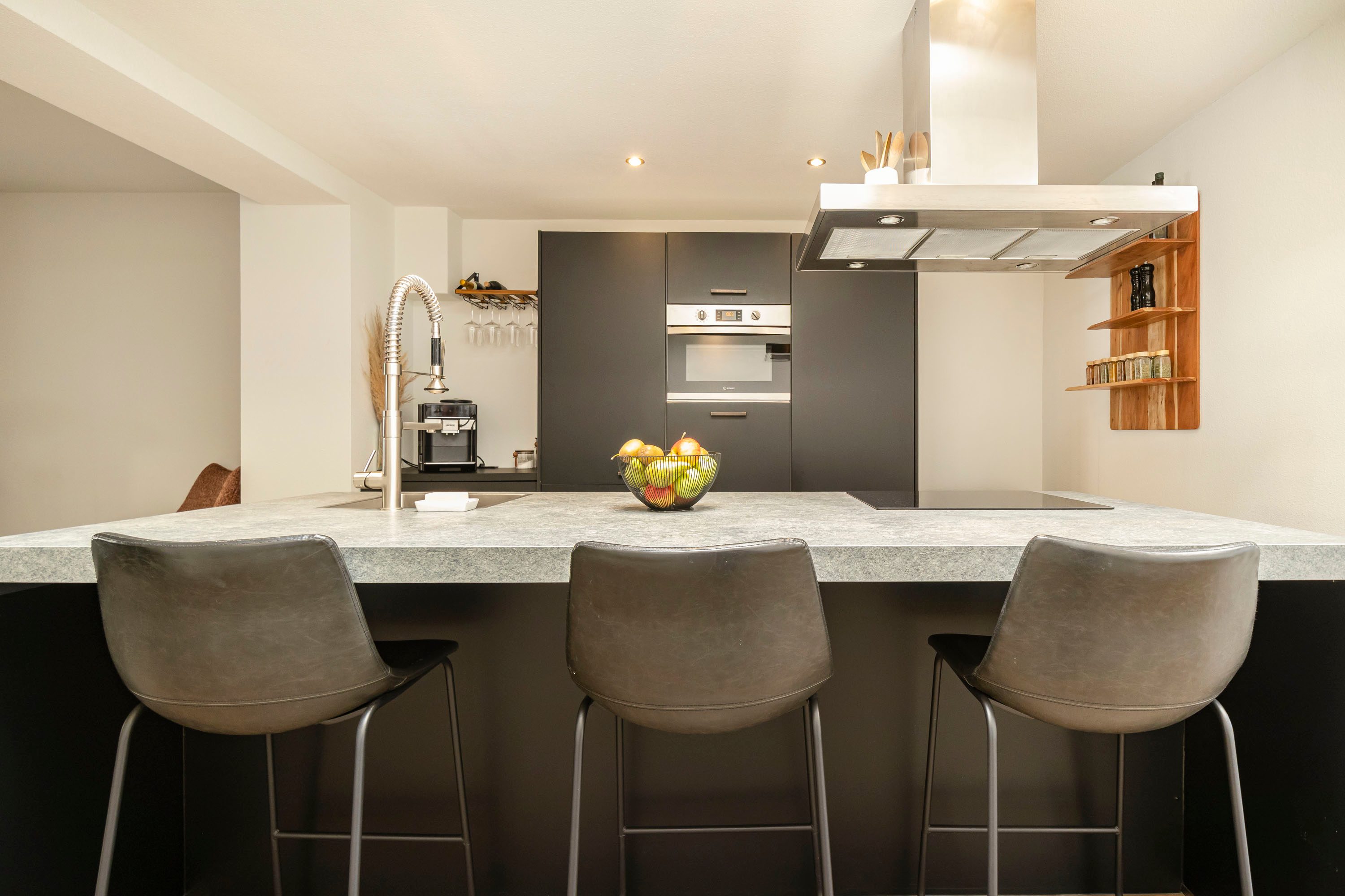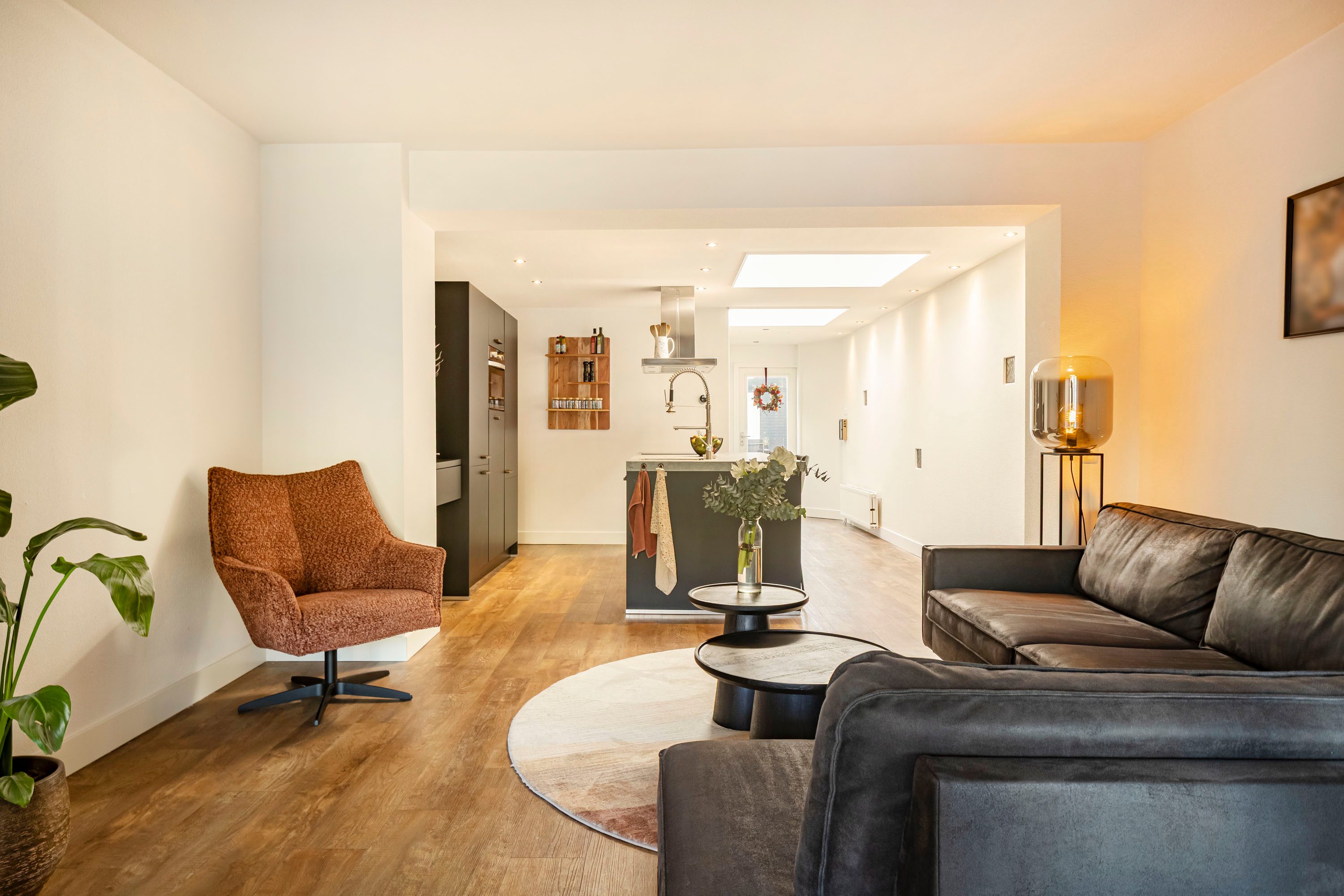 Bij binnenkomst via de entree, waar zich ook de meterkast en de trap bevinden, valt direct de stijlvolle zwarte glazen pui op. Deze eyecatcher biedt een prachtige doorkijk naar de woonkamer en zet meteen de juiste toon voor de rest van het huis. De royale woonkamer ademt sfeer en biedt aan de voorzijde een heerlijke plek voor een grote eettafel in de lichte erker. In het hart van de kamer nodigt de open haard uit tot gezellige avonden in de zithoek. De aangrenzende designkeuken is een droom voor elke kookliefhebber, compleet met een chic kookeiland, zwarte kastenwand en hoogwaardige inbouwapparatuur zoals een inductiekookplaat en oven.