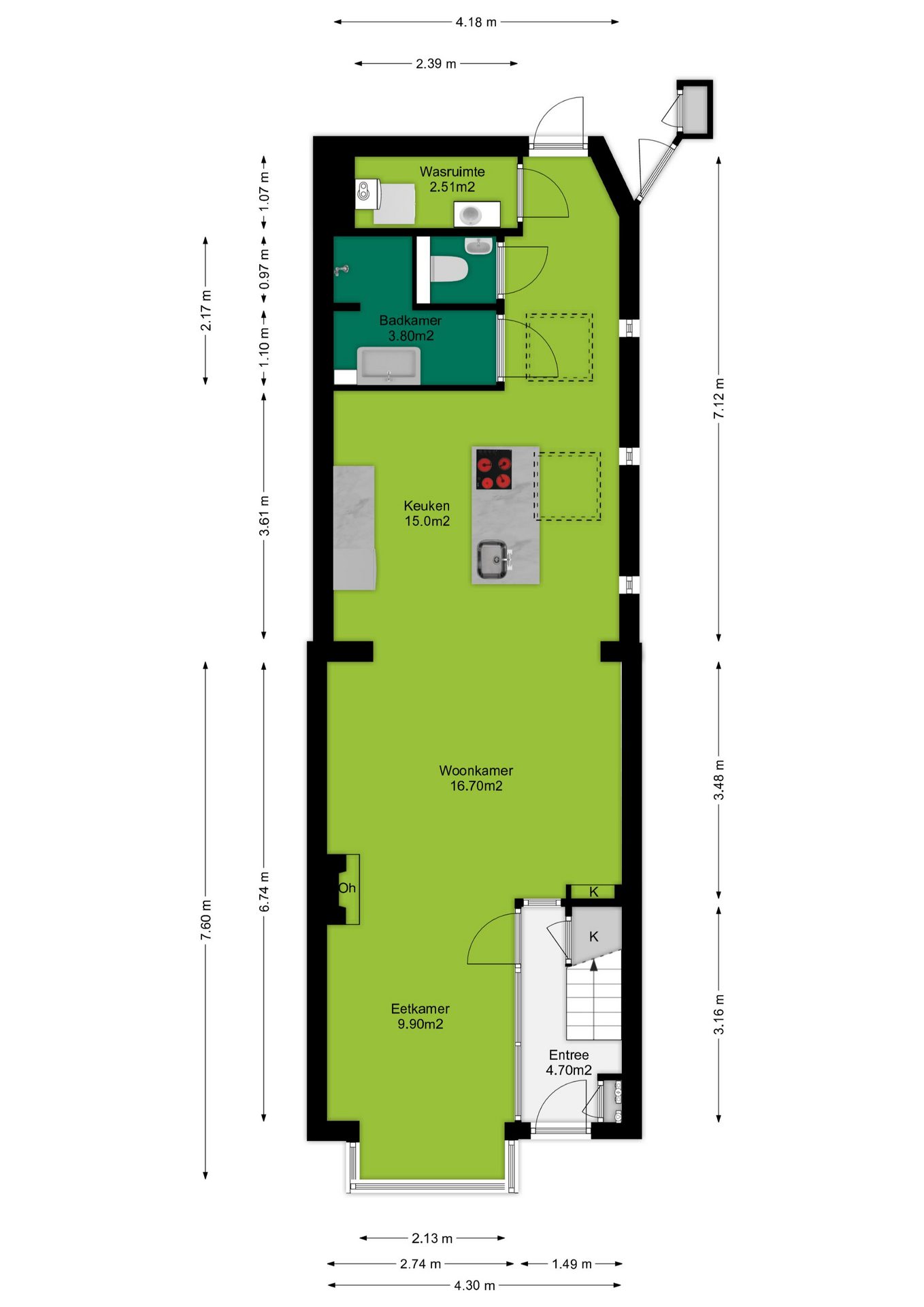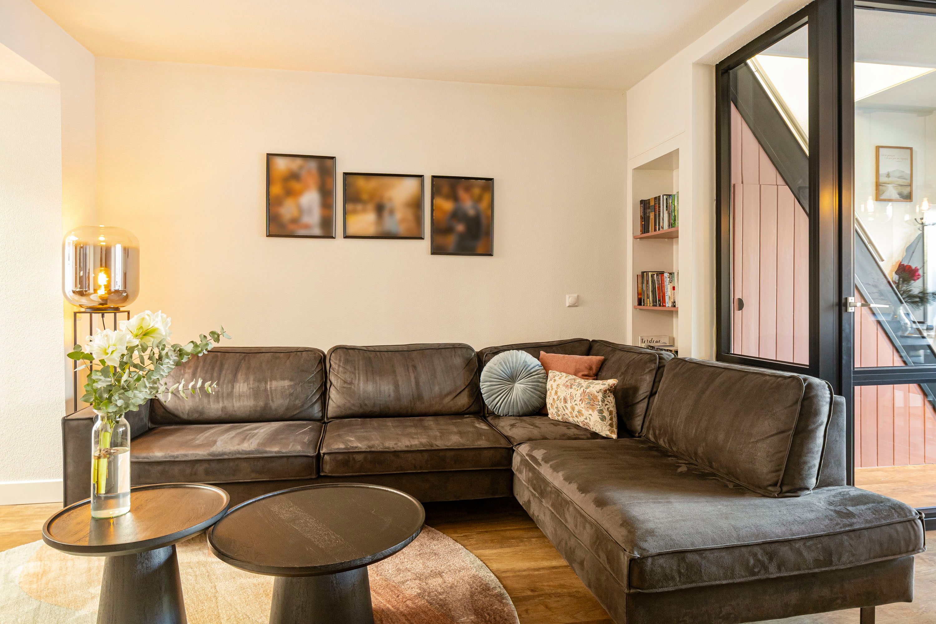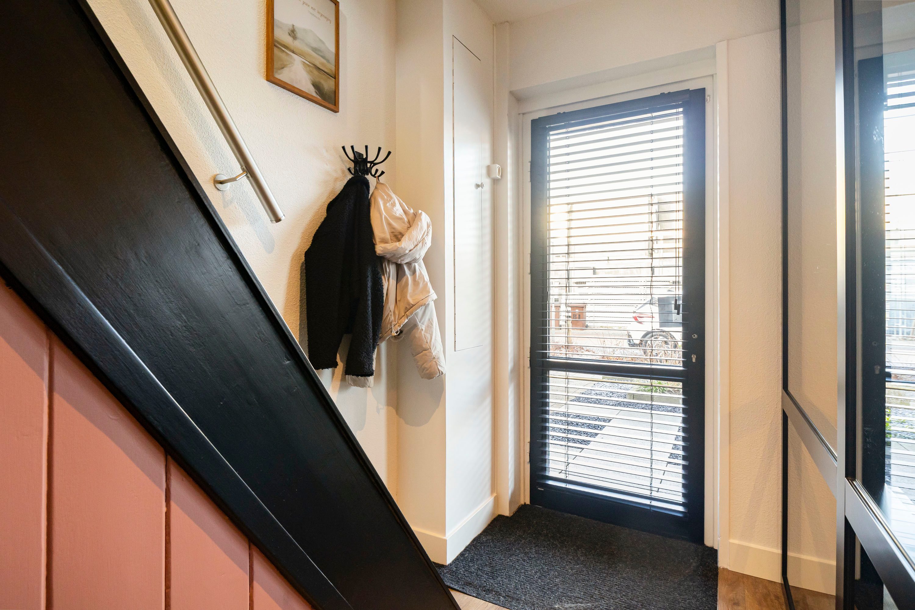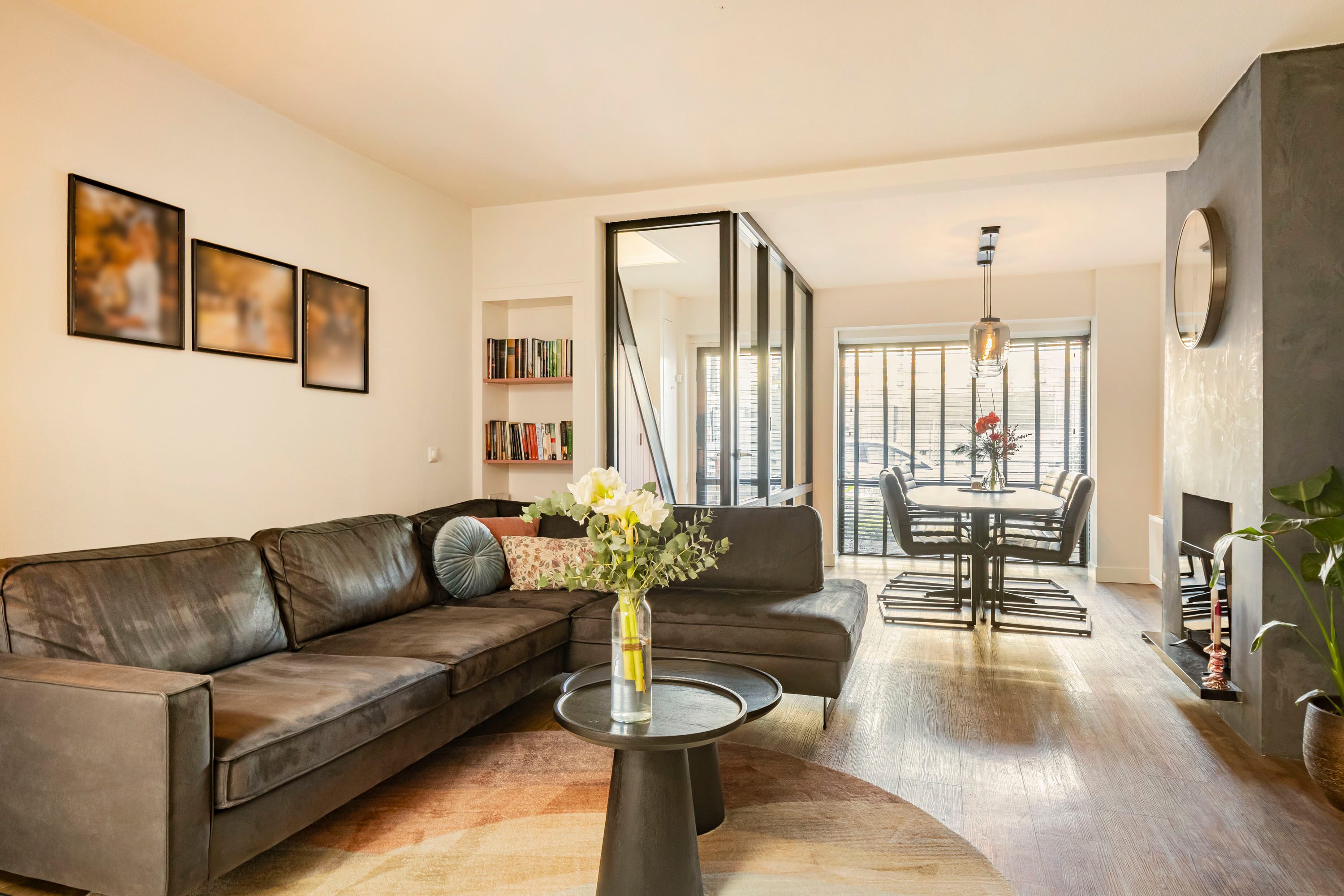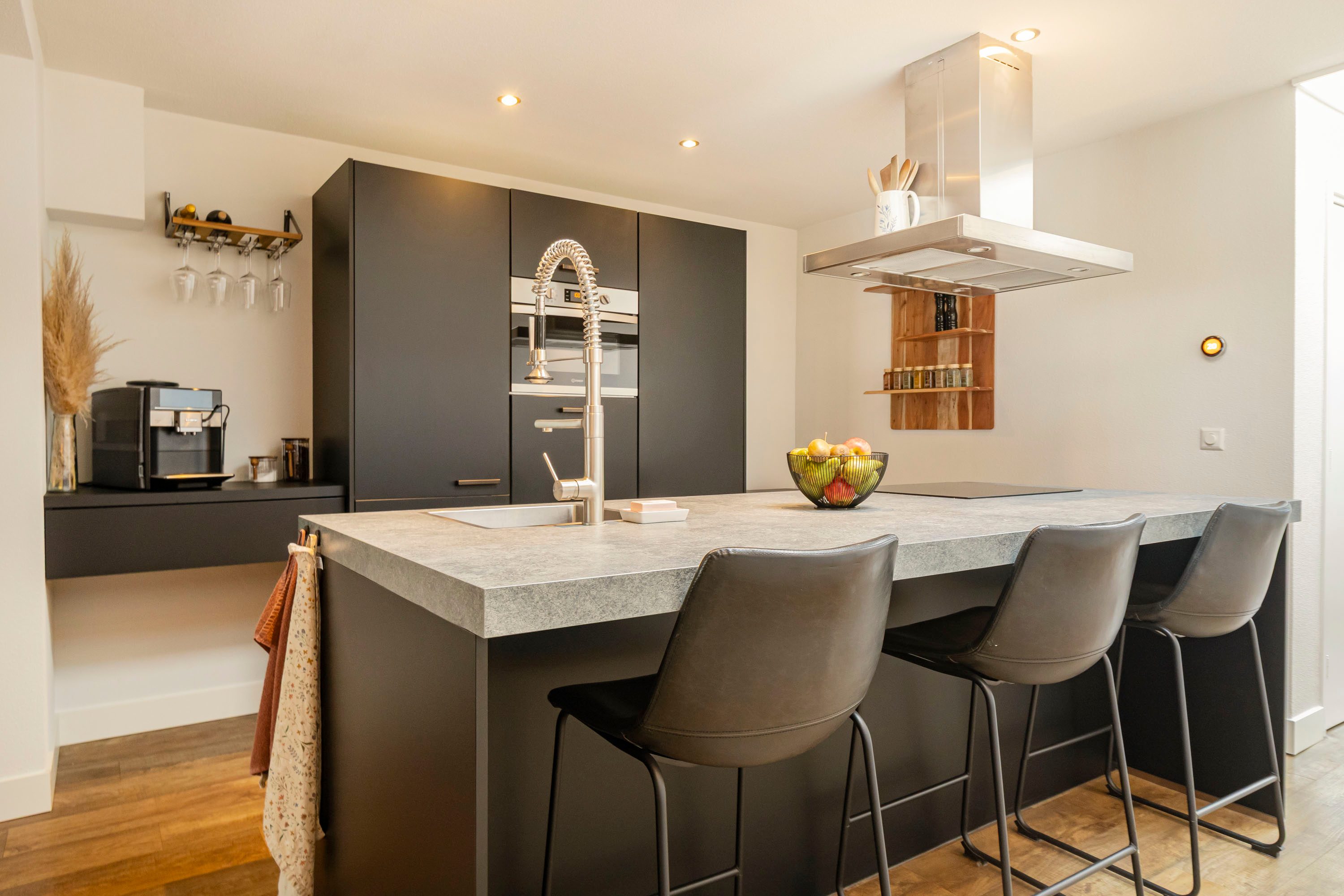 Bij binnenkomst via de entree, waar zich ook de meterkast en de trap bevinden, valt direct de stijlvolle zwarte glazen pui op. Deze eyecatcher biedt een prachtige doorkijk naar de woonkamer en zet meteen de juiste toon voor de rest van het huis. De royale woonkamer ademt sfeer en biedt aan de voorzijde een heerlijke plek voor een grote eettafel in de lichte erker. In het hart van de kamer nodigt de open haard uit tot gezellige avonden in de zithoek. De aangrenzende designkeuken is een droom voor elke kookliefhebber, compleet met een chic kookeiland, zwarte kastenwand en hoogwaardige inbouwapparatuur zoals een inductiekookplaat en oven.