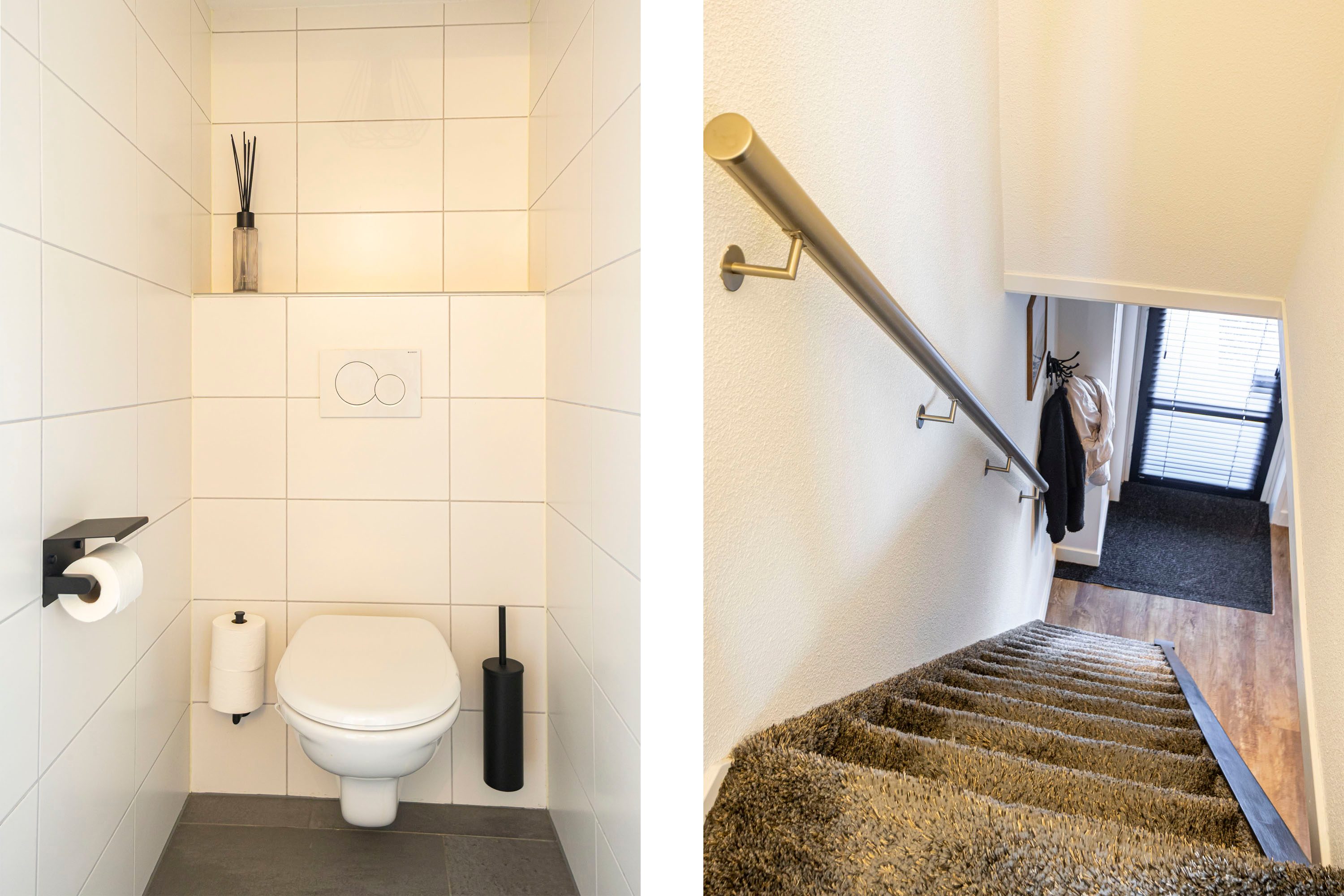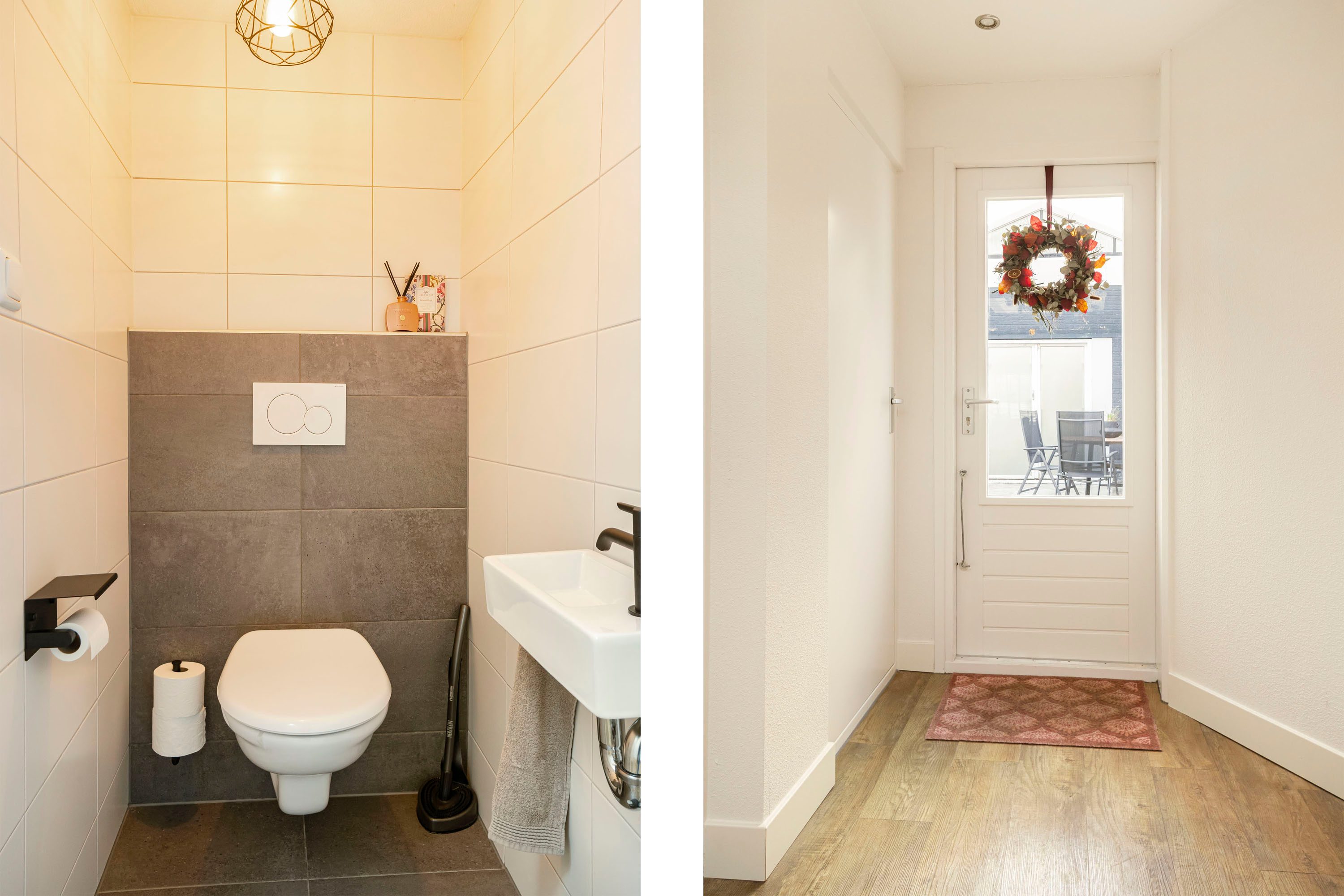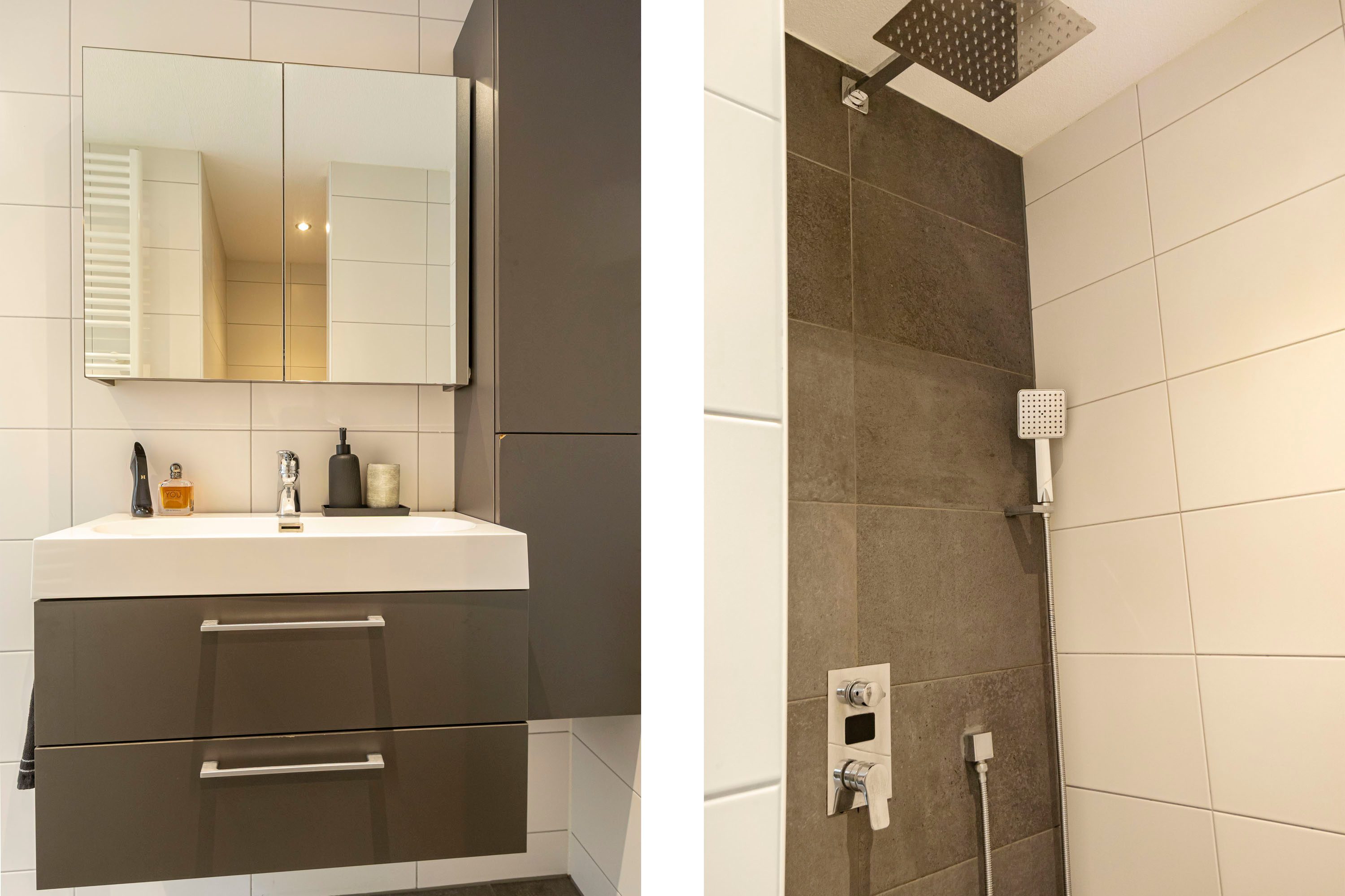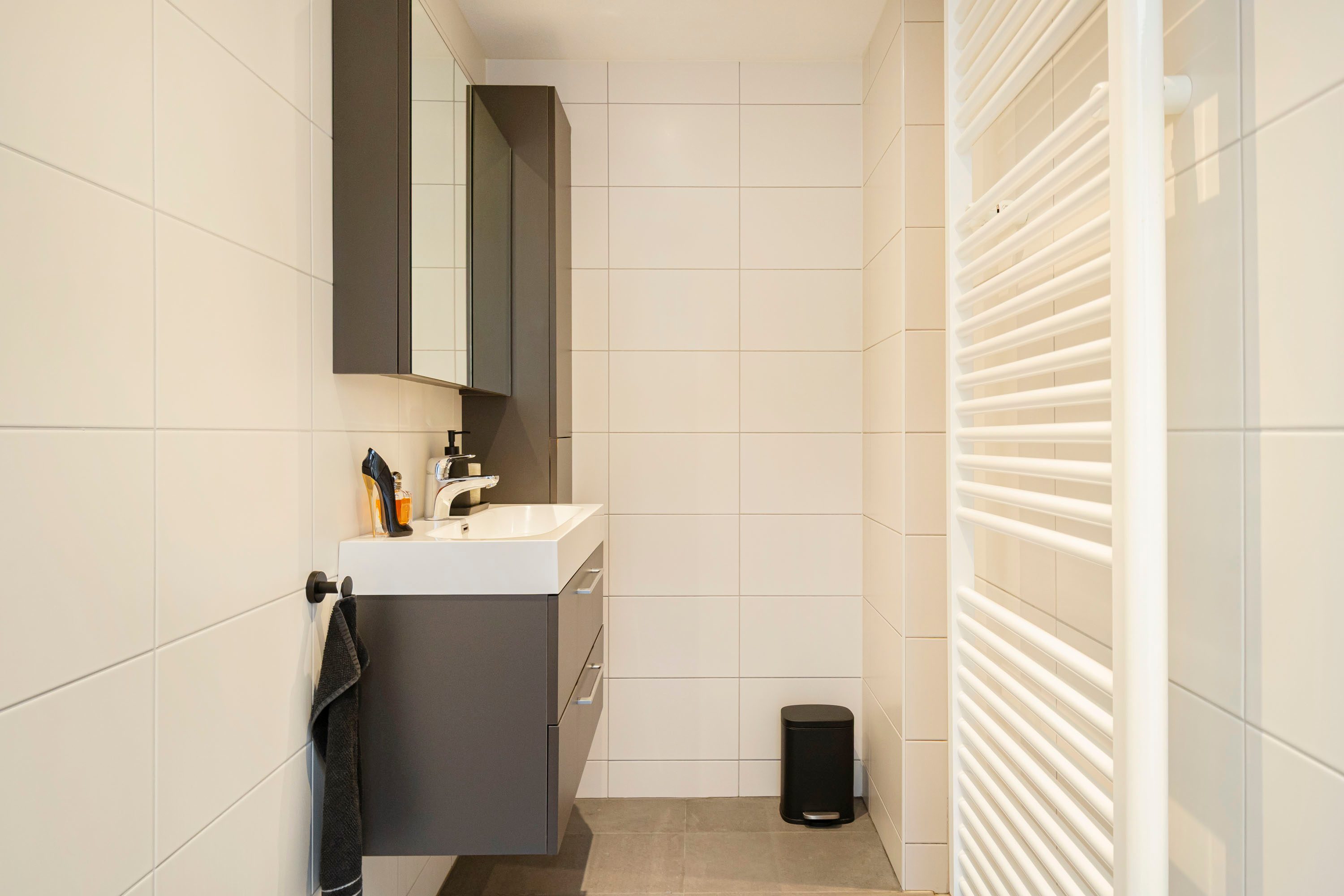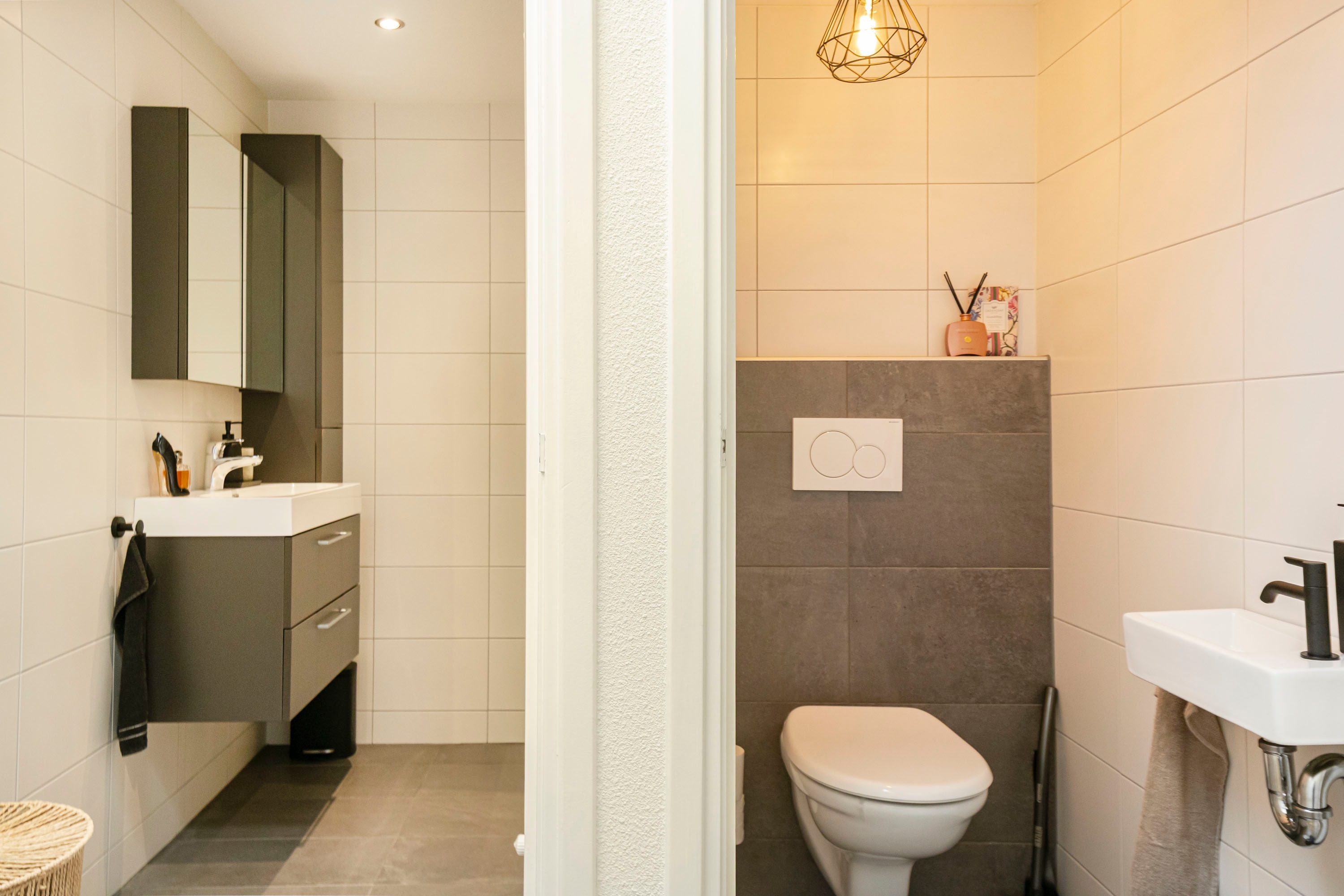 Aan de achterzijde van de woning vindt u de sanitaire ruimtes en praktische voorzieningen. De moderne badkamer is strak afgewerkt met witte wandtegels en een grijze vloer, en is uitgerust met een comfortabele inloopdouche en een breed wastafelmeubel. Het separate toilet is in dezelfde moderne stijl uitgevoerd. Daarnaast is er een functionele wasruimte met plek voor de cv-opstelling, de wasmachine en een extra spoelbak.