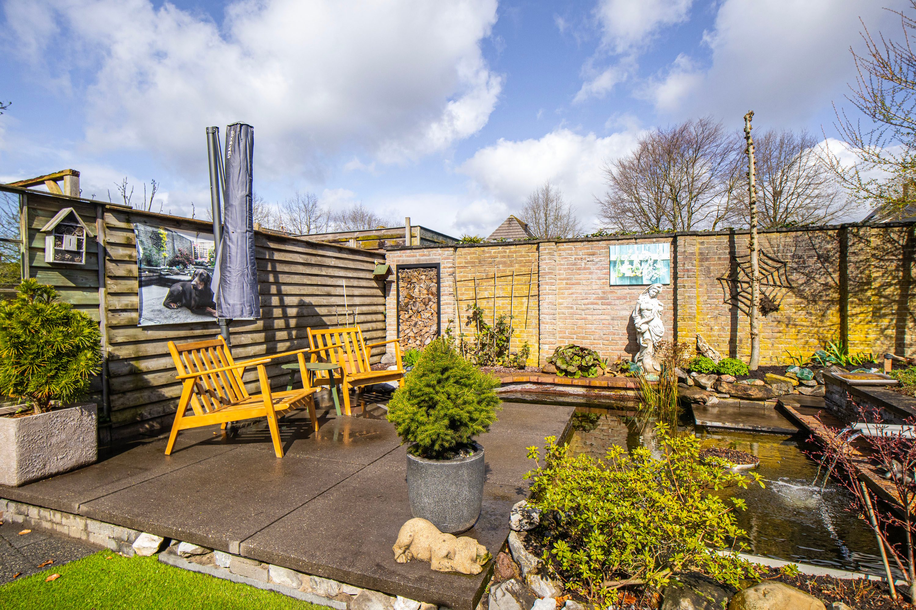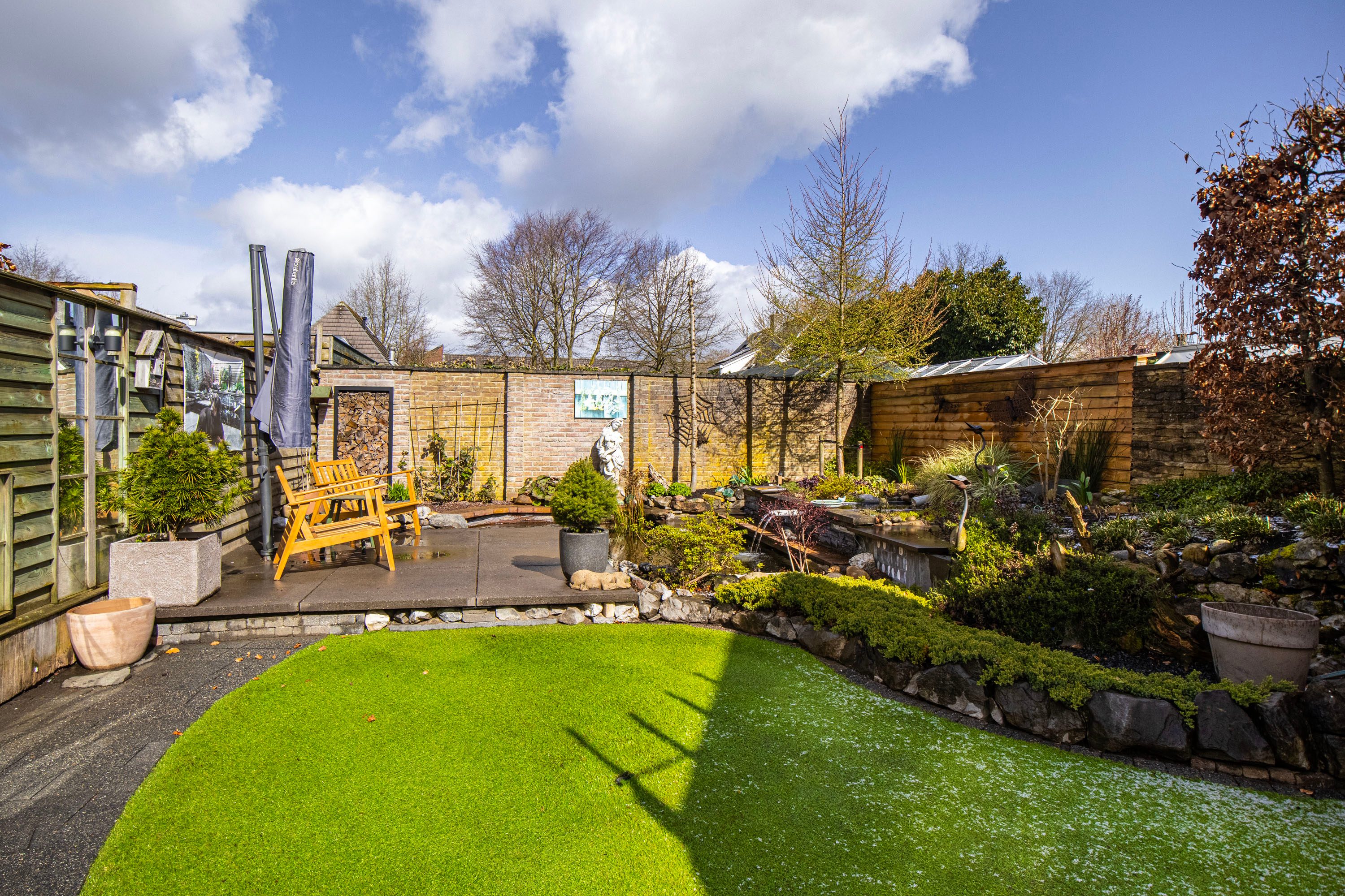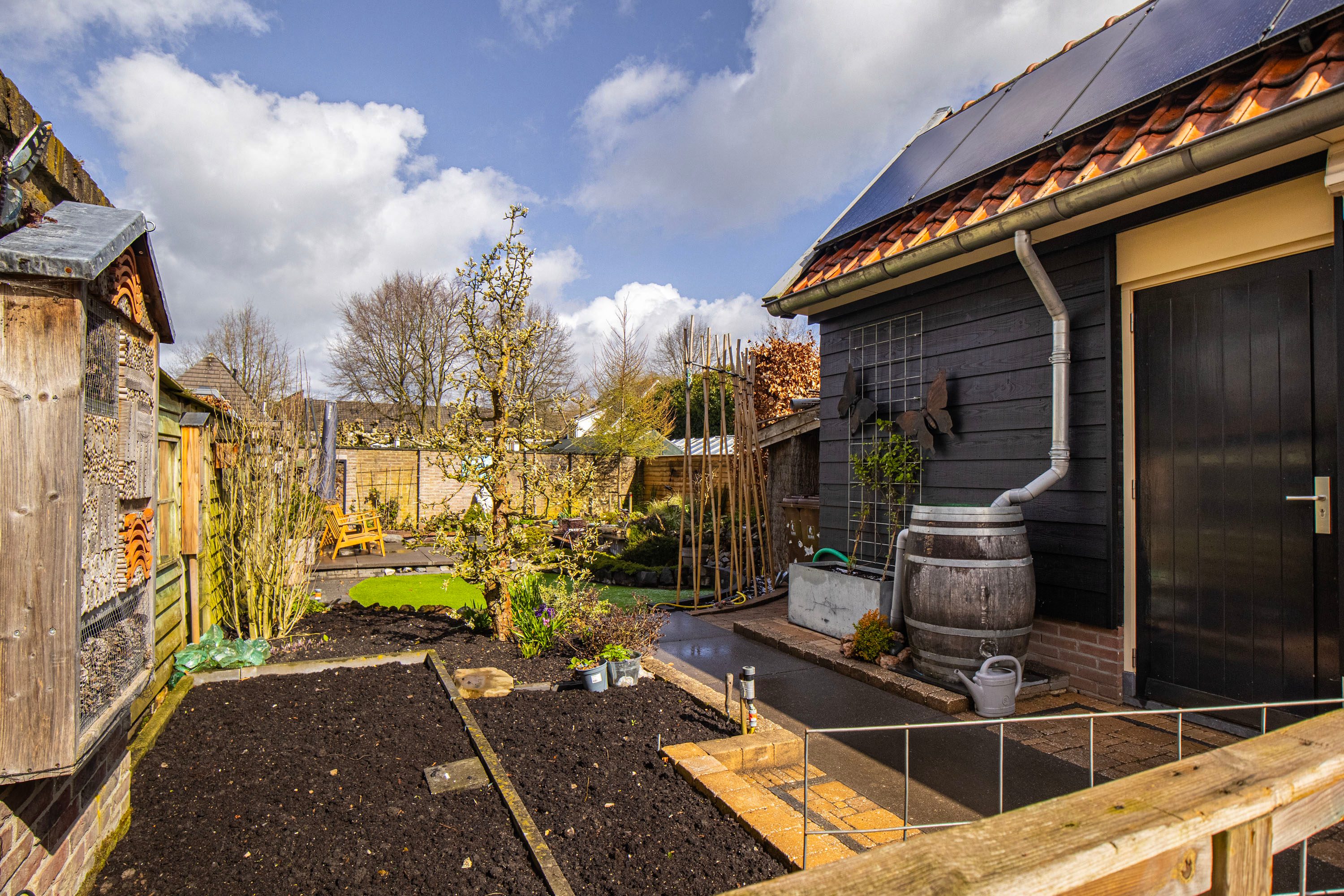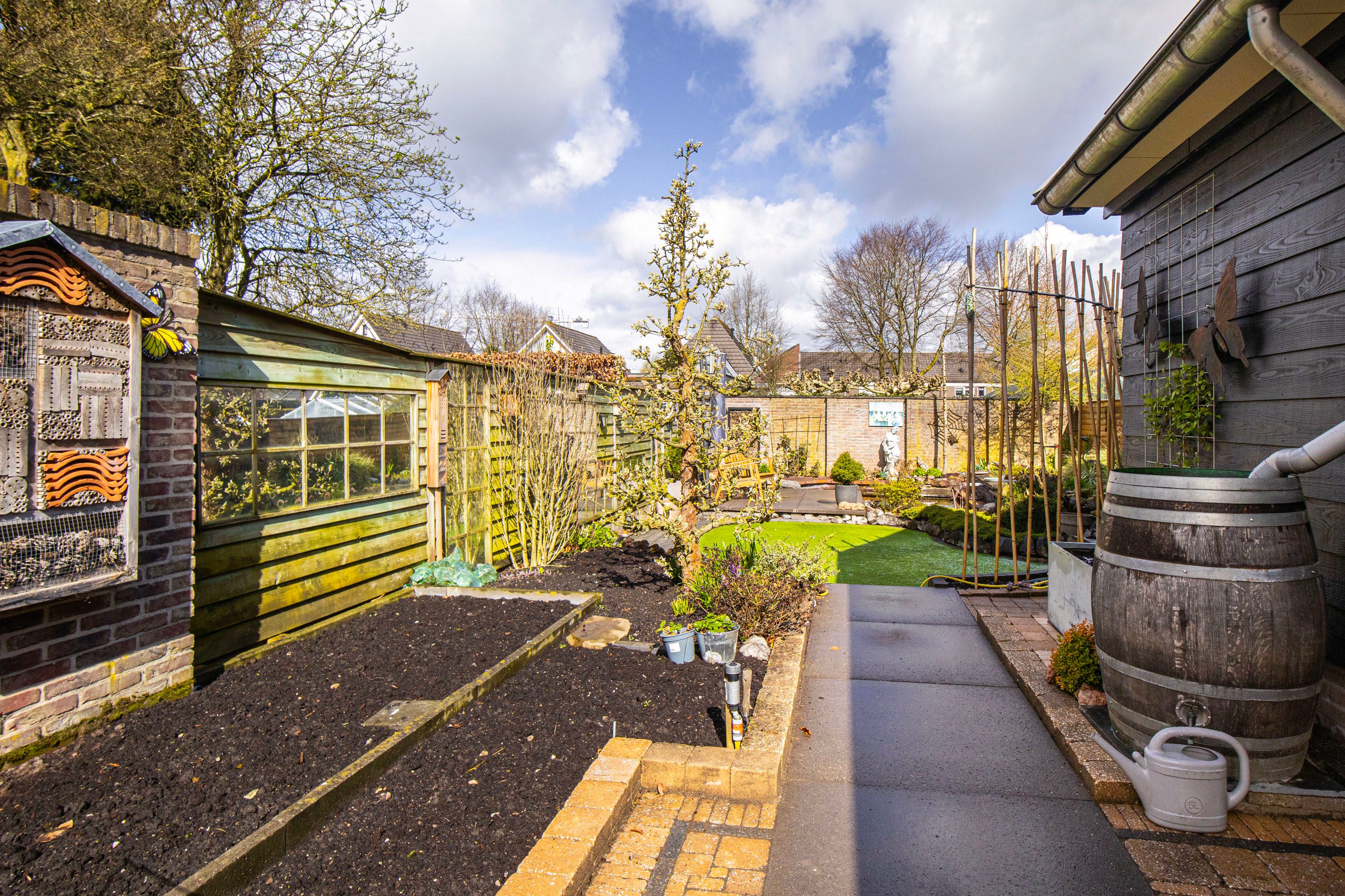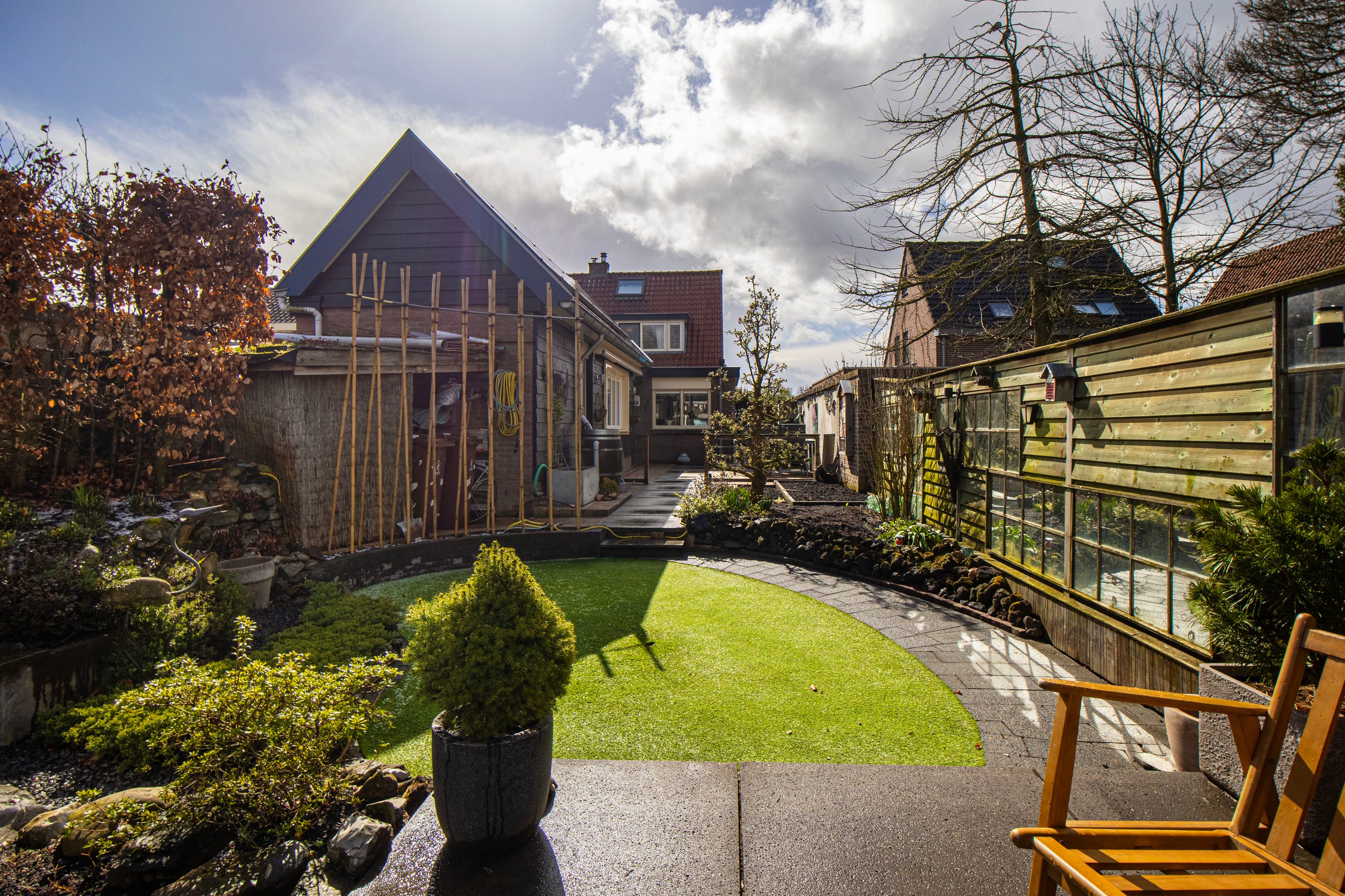 De achtertuin is gelegen op het noordwesten, waardoor je na een werkdag heerlijk van de middag- en avondzon kunt genieten. De tuin is sfeervol aangelegd met een terras, een groen gazon en een charmante vijver.