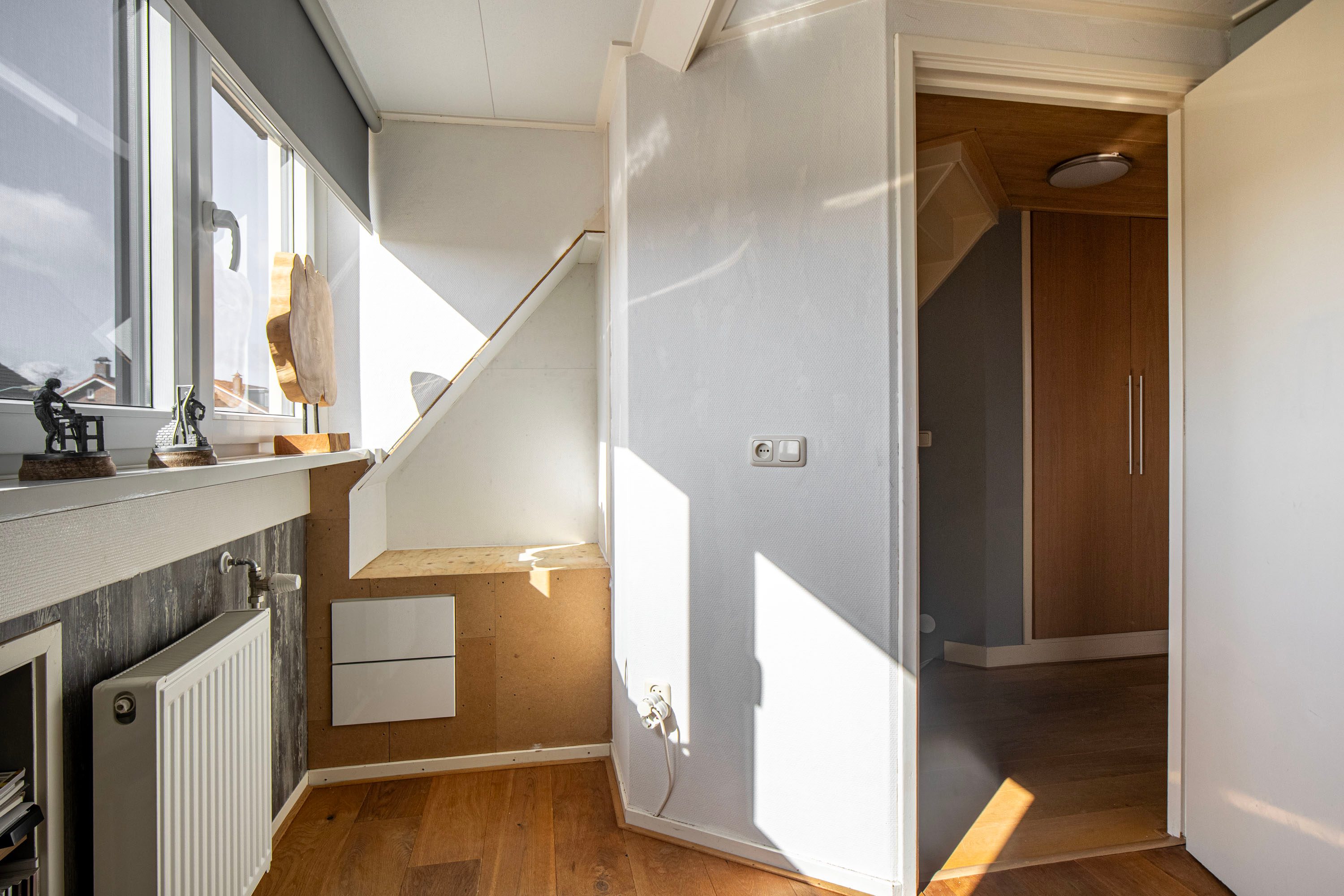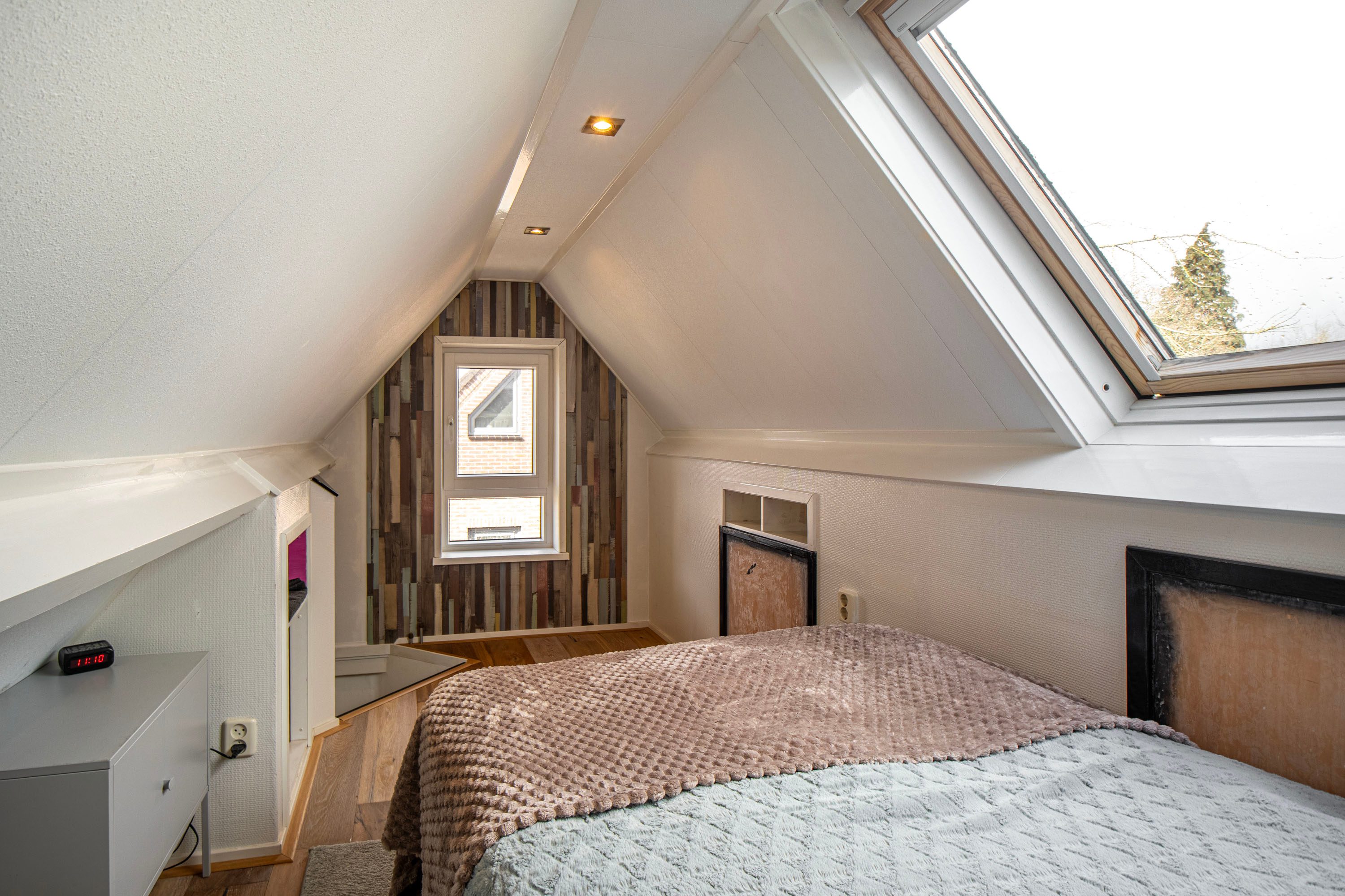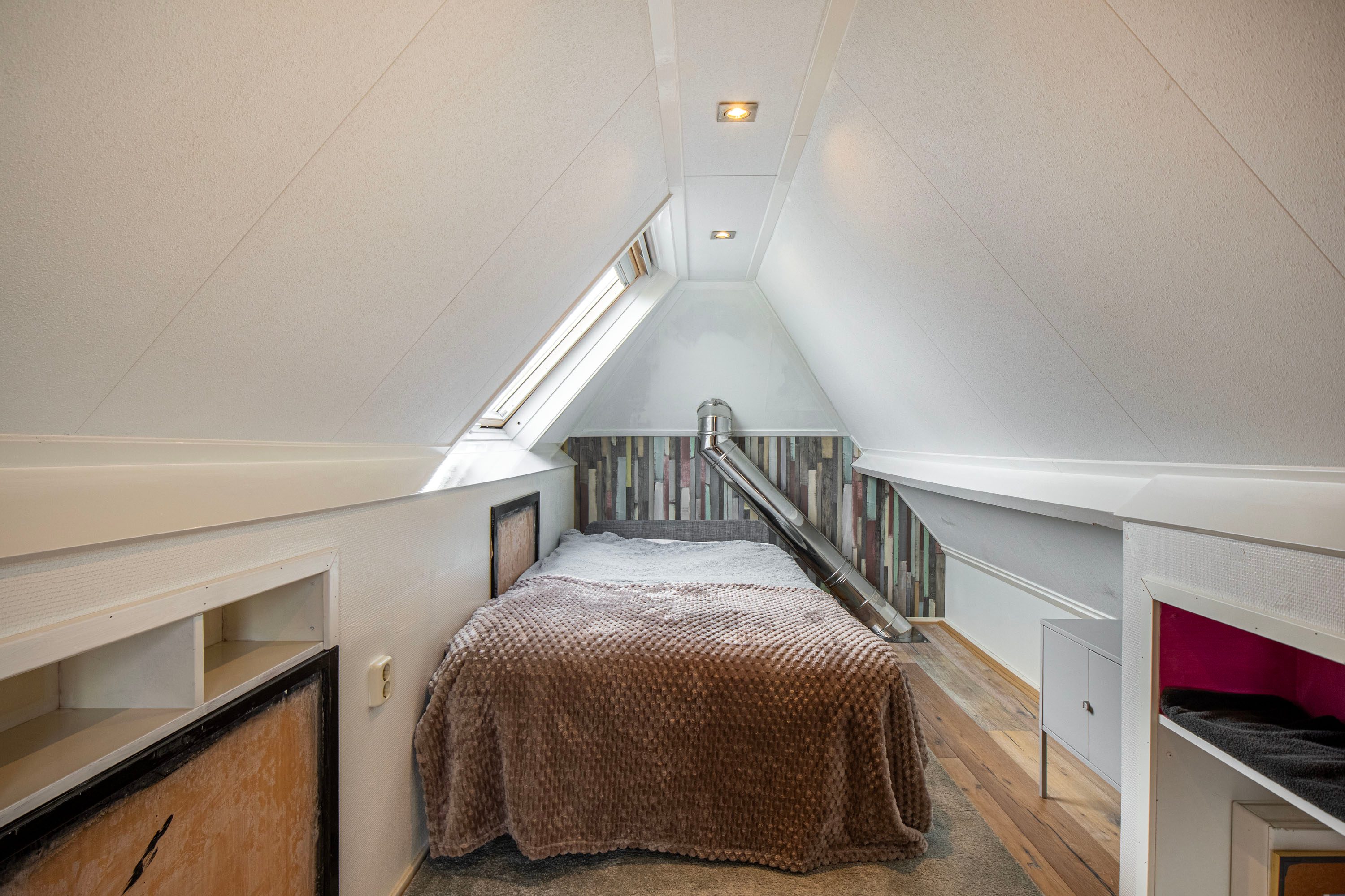 2e verdieping: Via een vaste trap bereik je de vliering. Hier is een verrassend leuke derde slaap-/logeerkamer gecreëerd (ca. 6 m²). Een knusse ruimte met veel privacy, die tevens dienst kan doen als extra bergruimte.