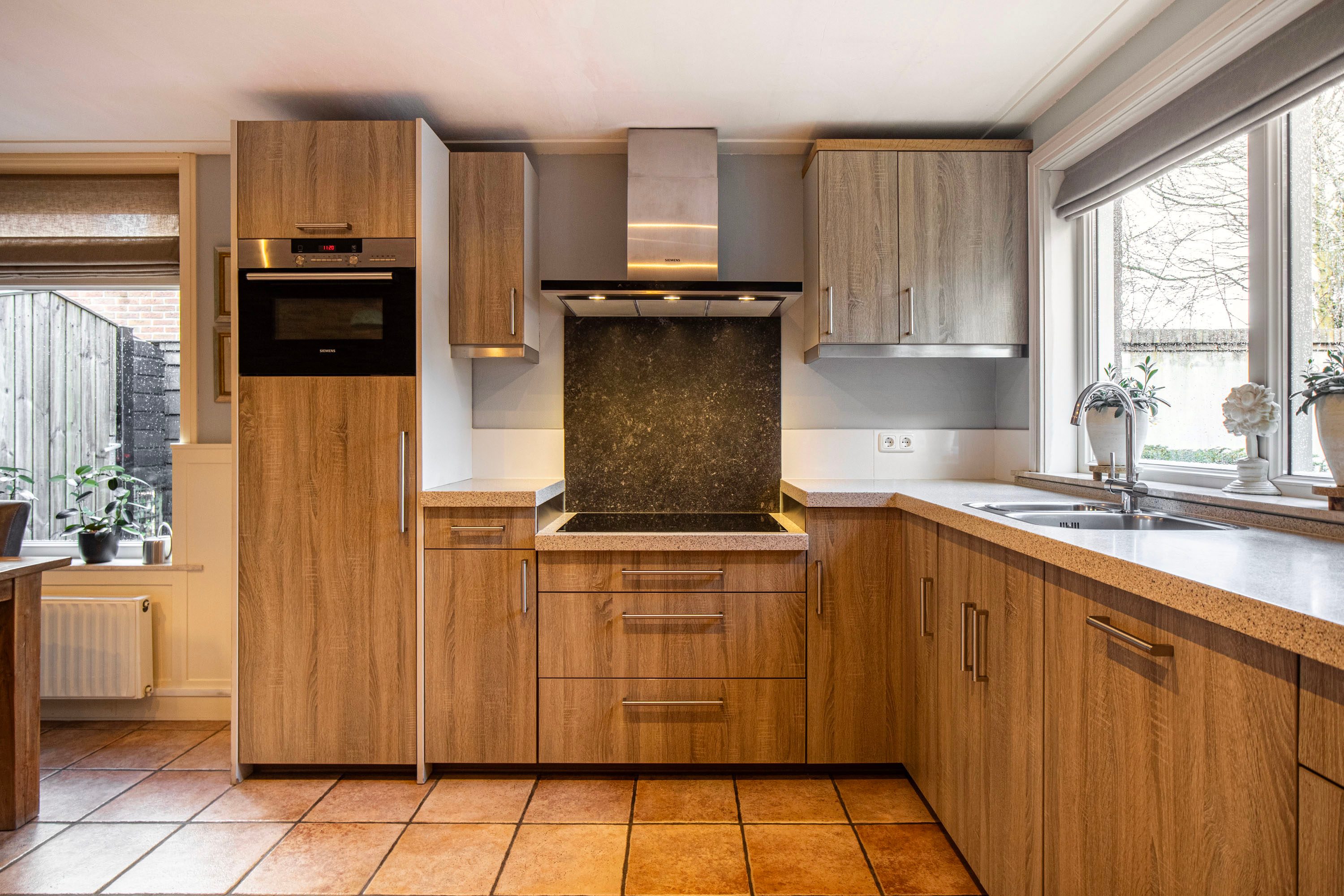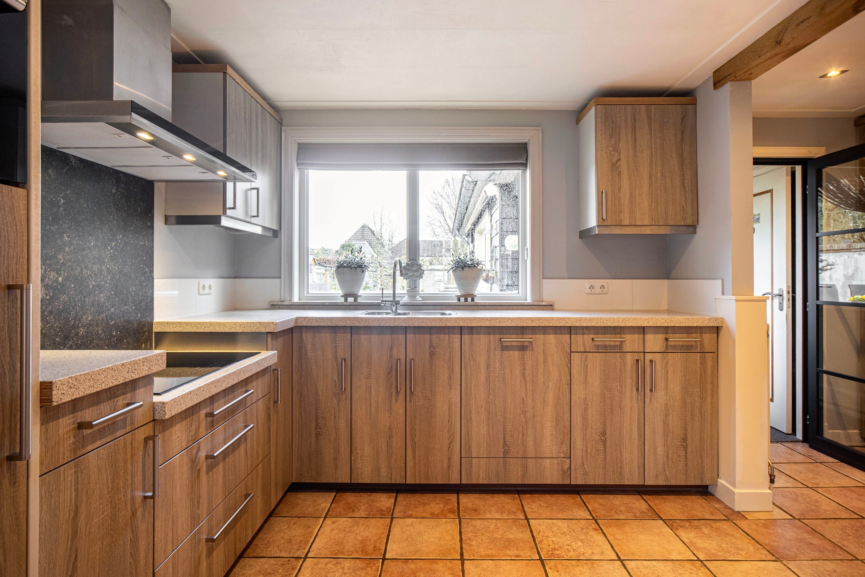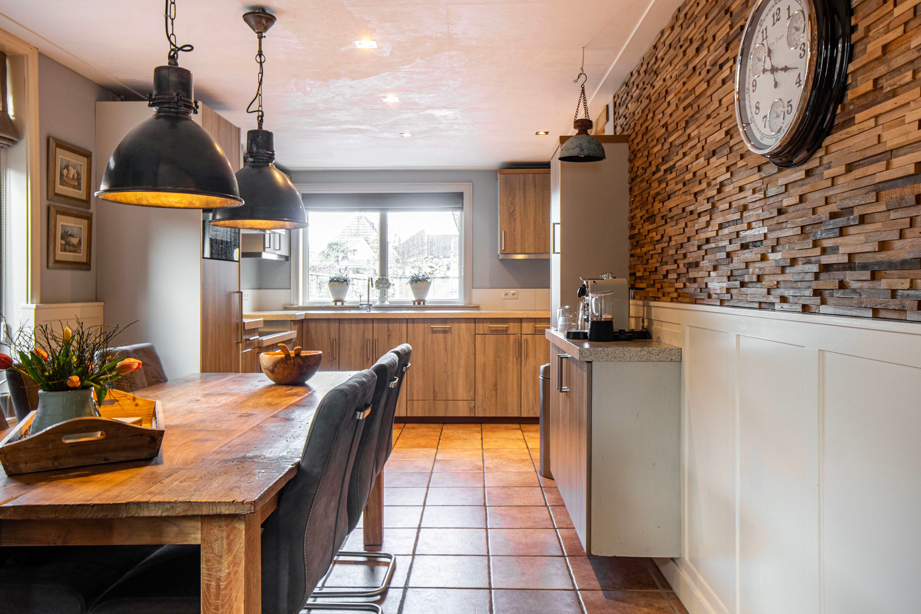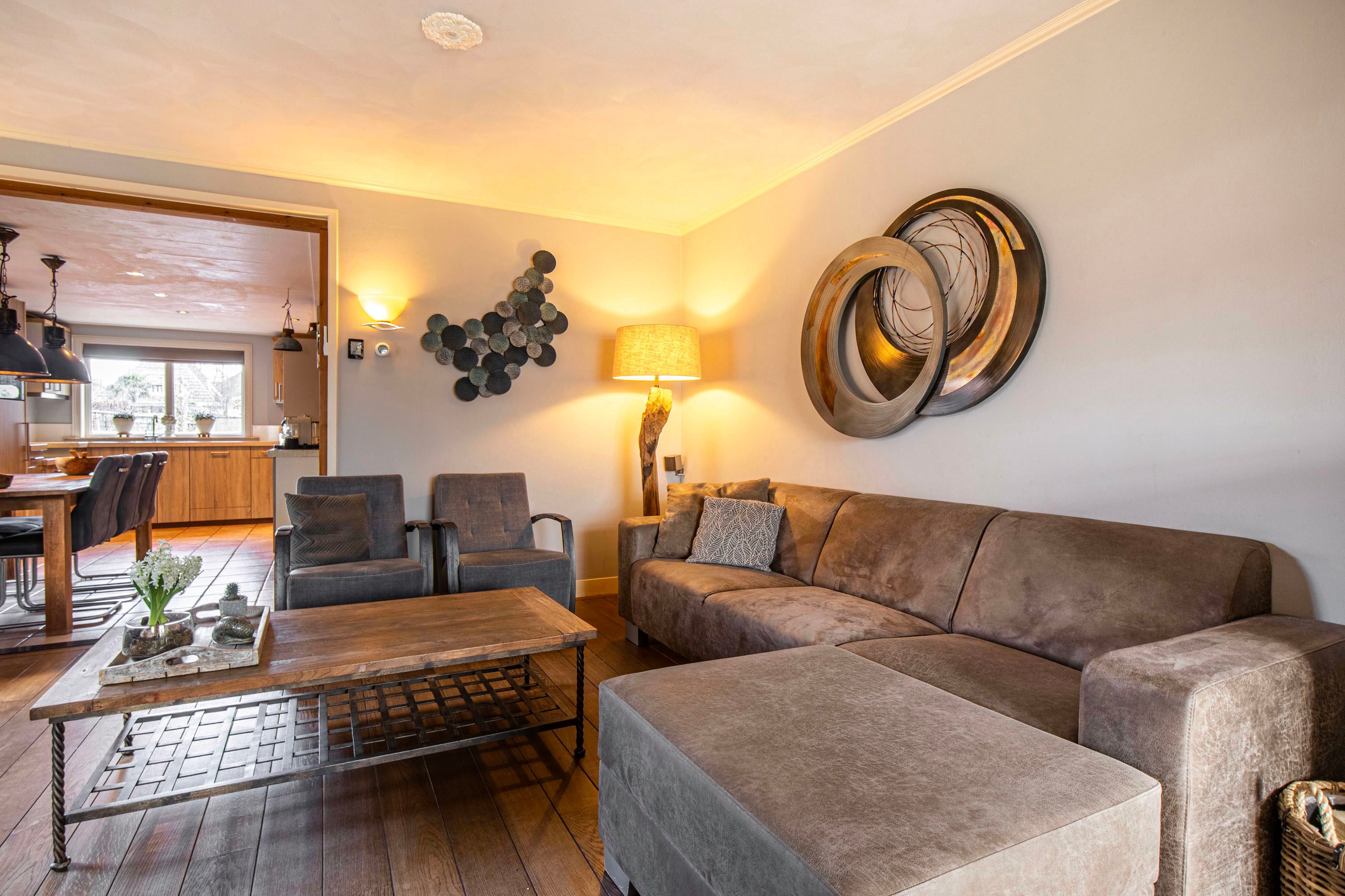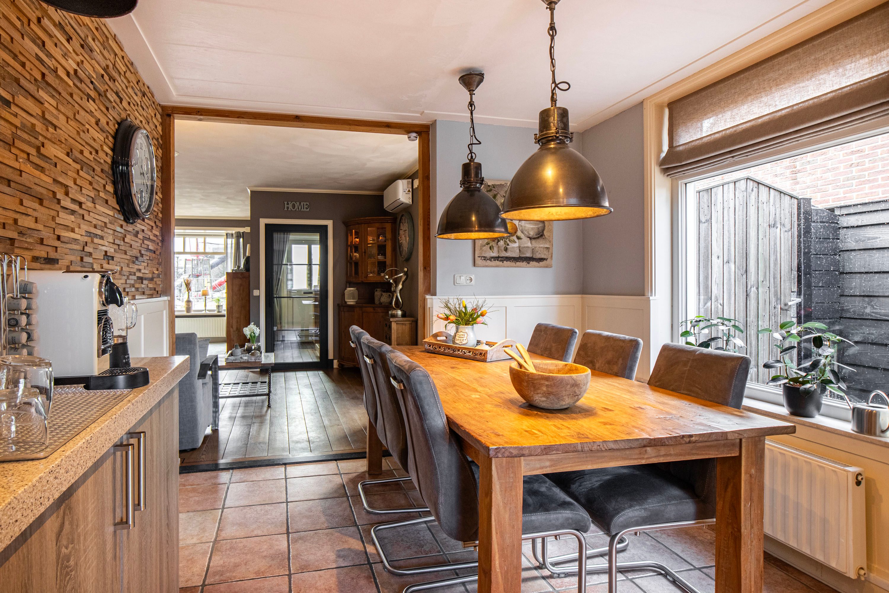 Begane grond: Bij binnenkomst in de hal proef je direct de sfeer van de woning. Vanuit hier bereik je de royale, lichte woonkamer van ca. 26 m². De grote raampartijen zorgen voor een prachtige lichtinval en de houtkachel biedt extra gezelligheid tijdens koude winteravonden. Aansluitend vind je de dichte woonkeuken (16 m²), de ideale plek voor een grote eettafel waar je urenlang kunt natafelen. De keuken dateert uit 2000 en de inbouwapparatuur, waaronder de kookplaat, koelkast, vriezer en vaatwasser, is vernieuwd in 2013.
