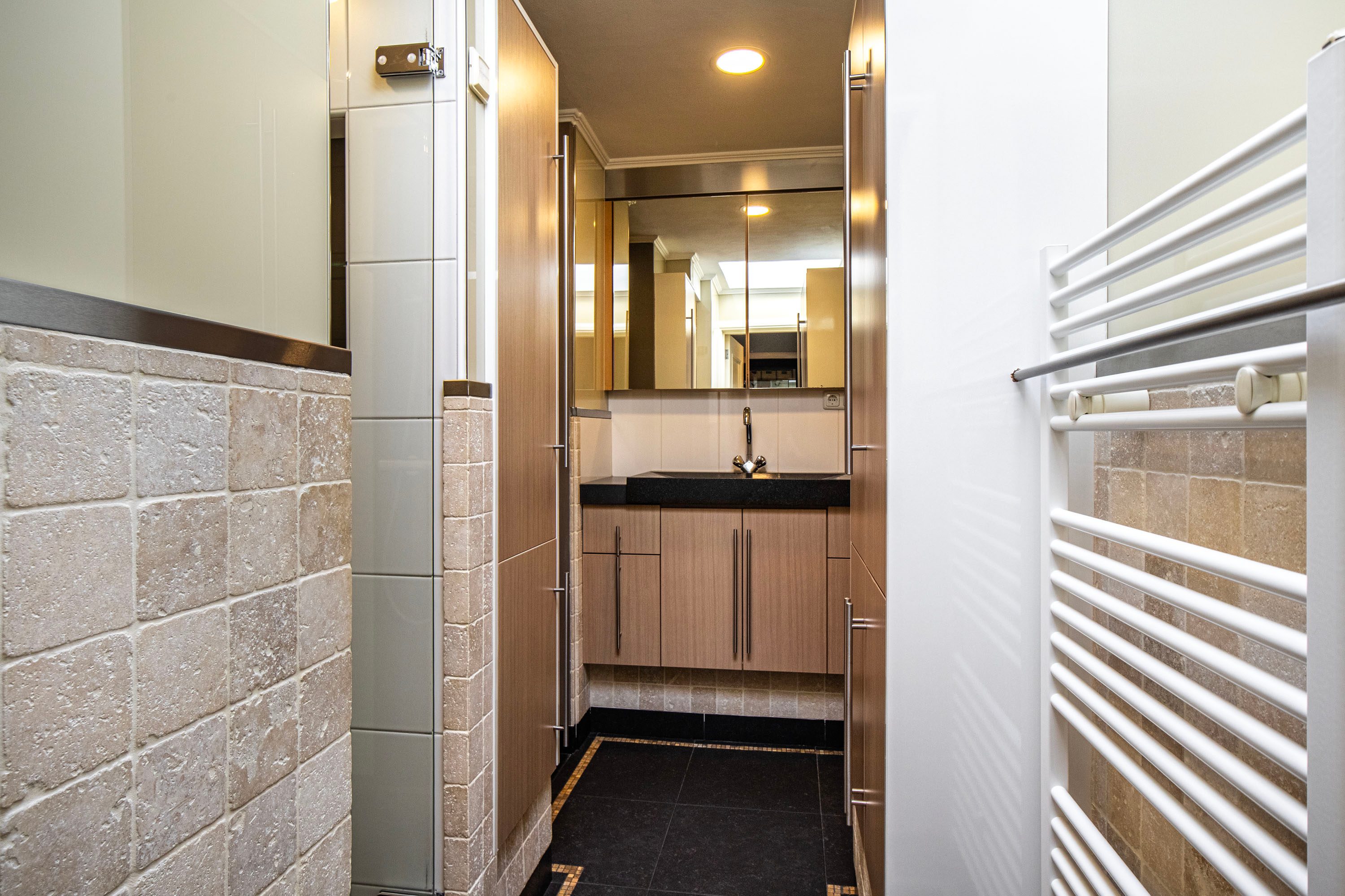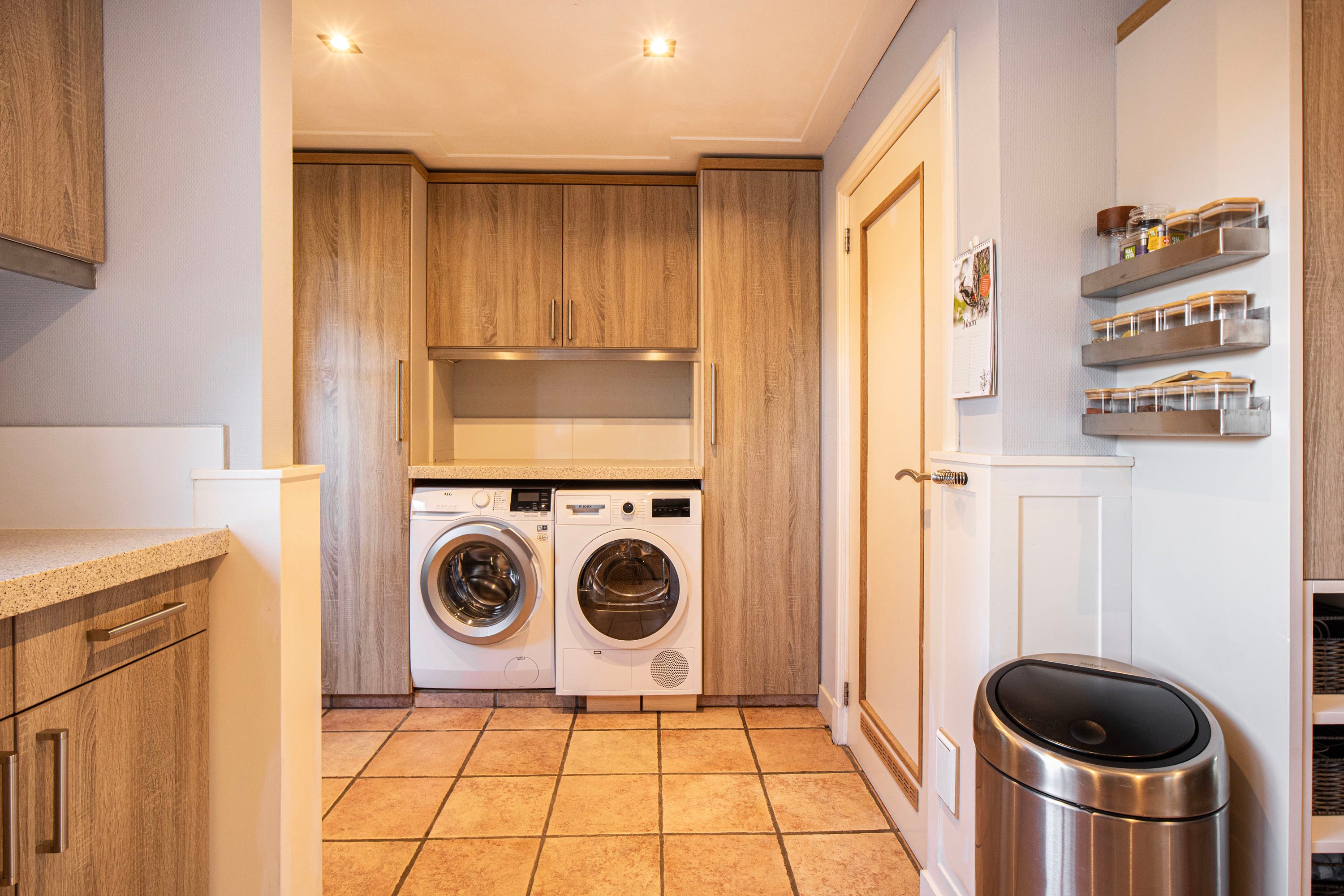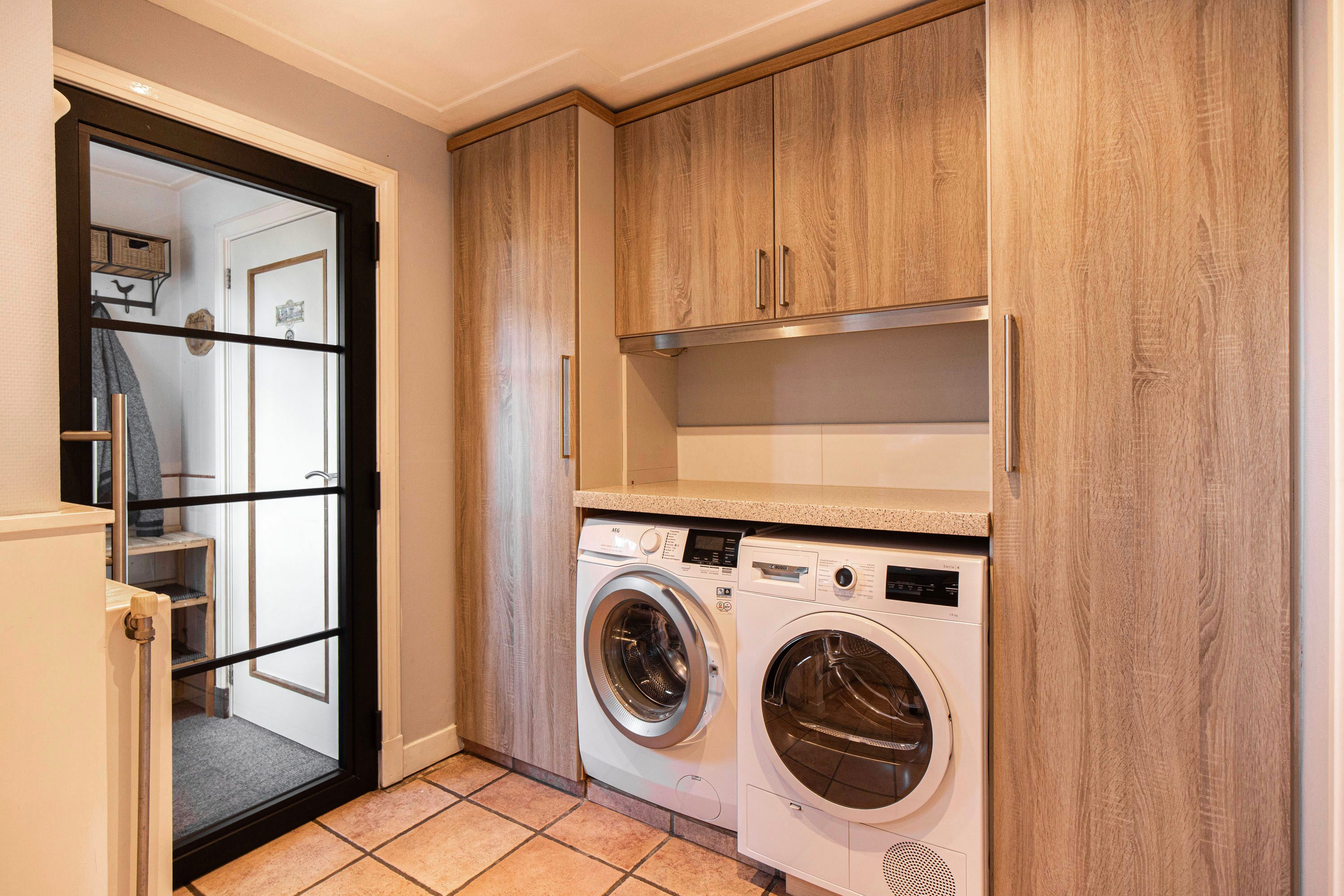 In de praktische bijkeuken is ruimte voor de was opstelling. De badkamer op de begane grond is keurig afgewerkt en beschikt over een douche, wastafelmeubel en kastruimte. De badkamer dateert ongeveer uit 2008. Tevens is er een separaat toilet aanwezig. Aan de achterzijde bevindt zich de multifunctionele kantoorruimte (ca. 10 m²), ideaal voor thuiswerkers of als hobbykamer.
