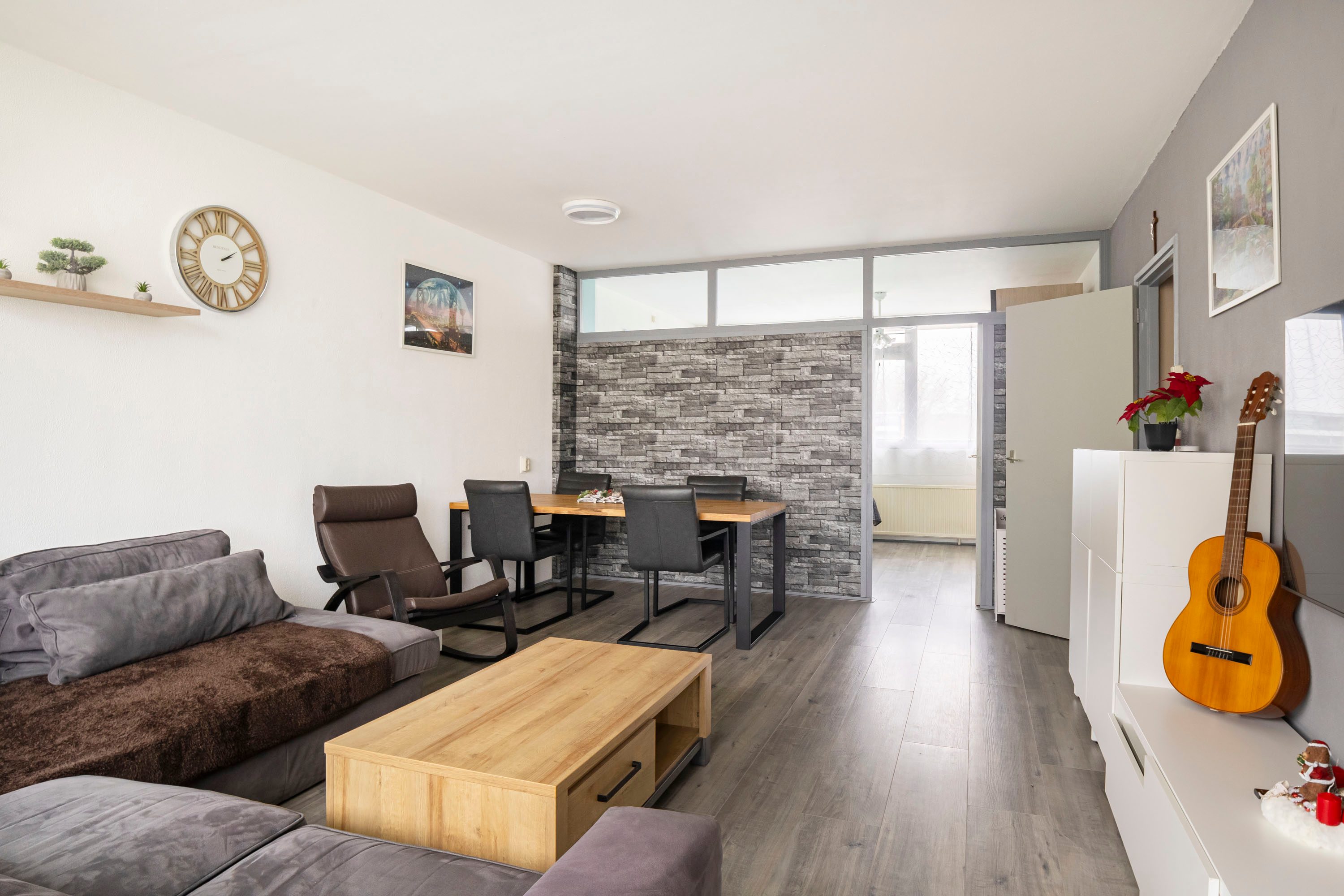 Door een lift of de trap kom je bij de 5de verdieping. Eenmaal aangekomen bij het appartement kom je via de entree, waar tevens de meterkast is gesitueerd, bereik je de ruime woonkamer van 25,5 m². Dankzij het grote raam aan de achterzijde valt er volop natuurlijk licht binnen. Er is voldoende ruimte voor een comfortabele hoekbank en het eetgedeelte is hier eveneens gesitueerd.
