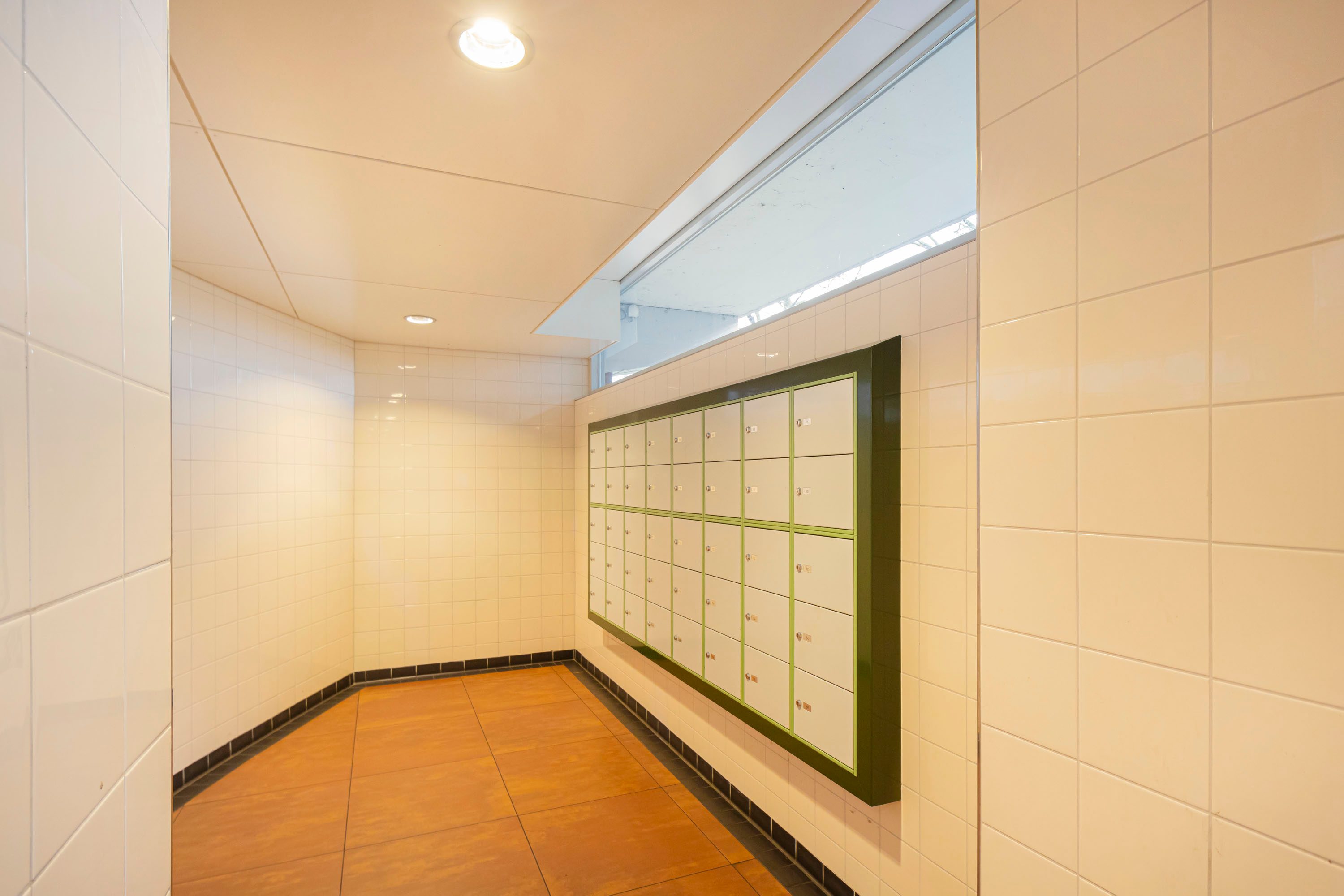 Door middel van de beveiligde entree kom je bij de centrale hal, waar je toegang hebt tot de lift maar ook tot de praktische berging in de onderbouw.
