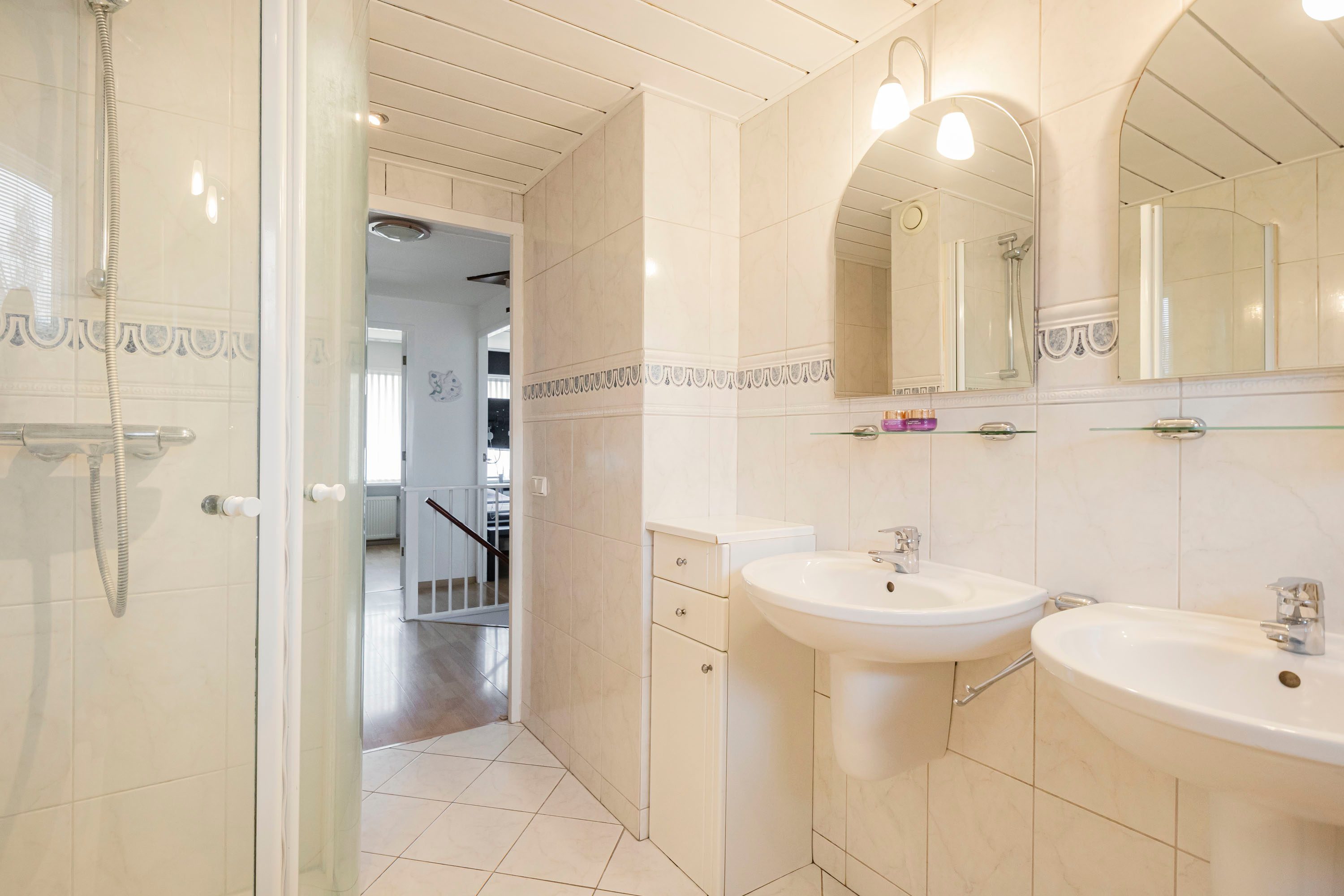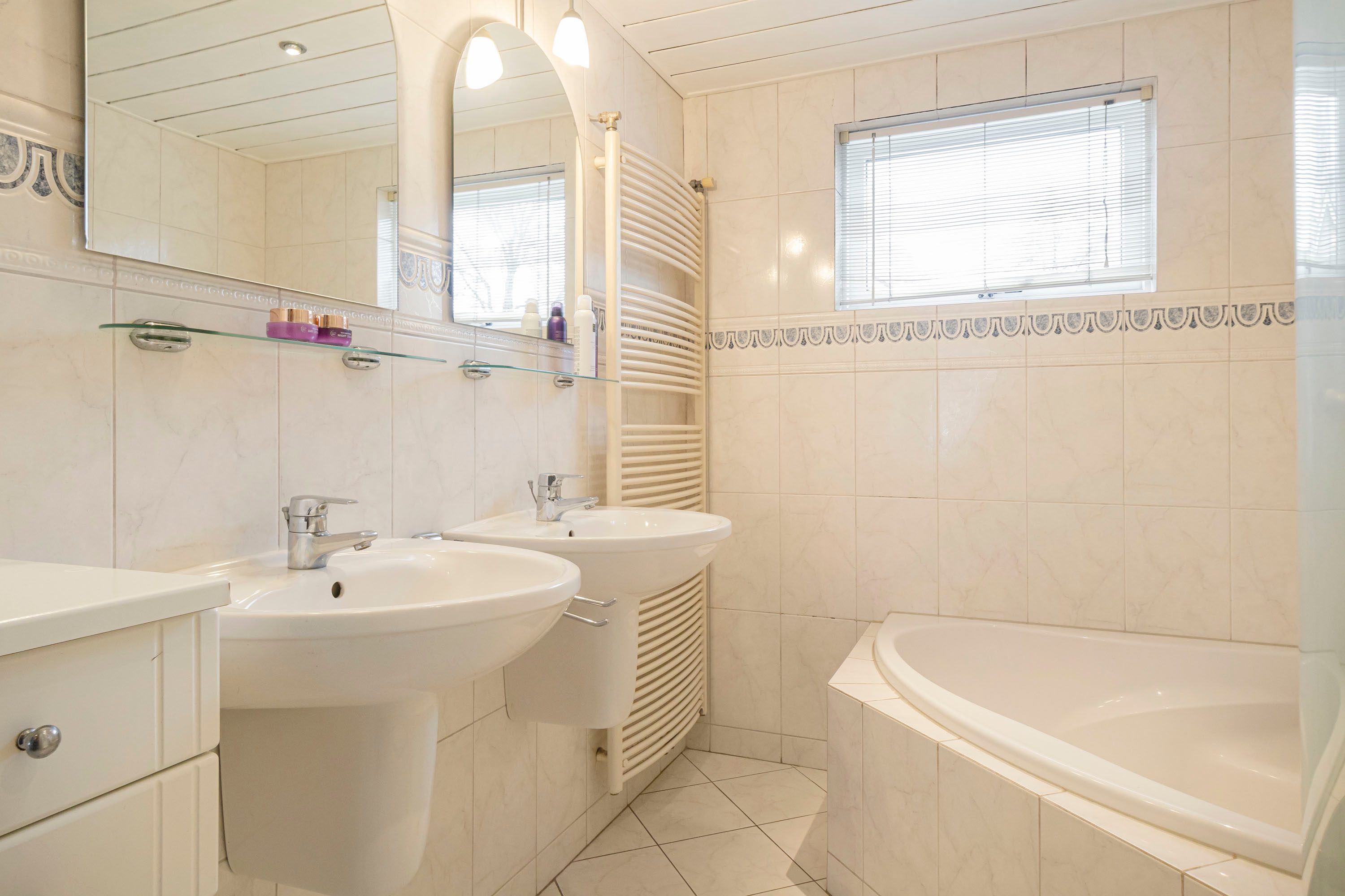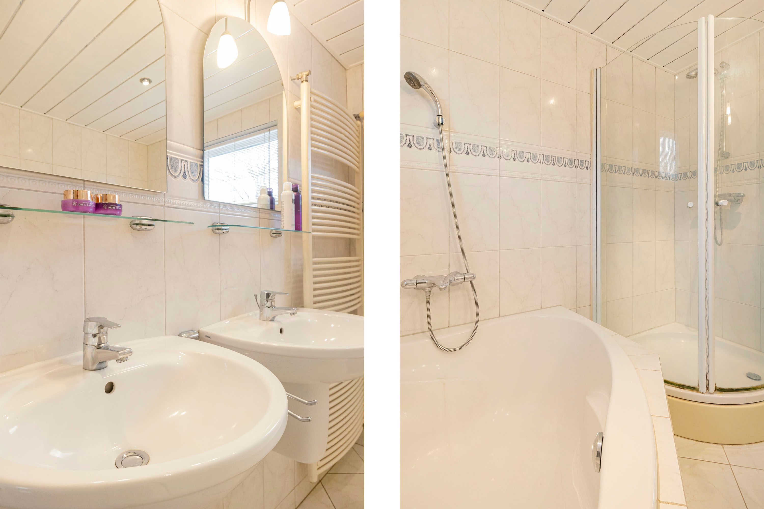De badkamer is met 7,3 m² van een zeer prettig formaat en uitgerust met een dubbele wastafel, ligbad, douche en 2e toilet. Dankzij het te openen raam is er naast mechanische ventilatie ook natuurlijke ventilatie aanwezig.