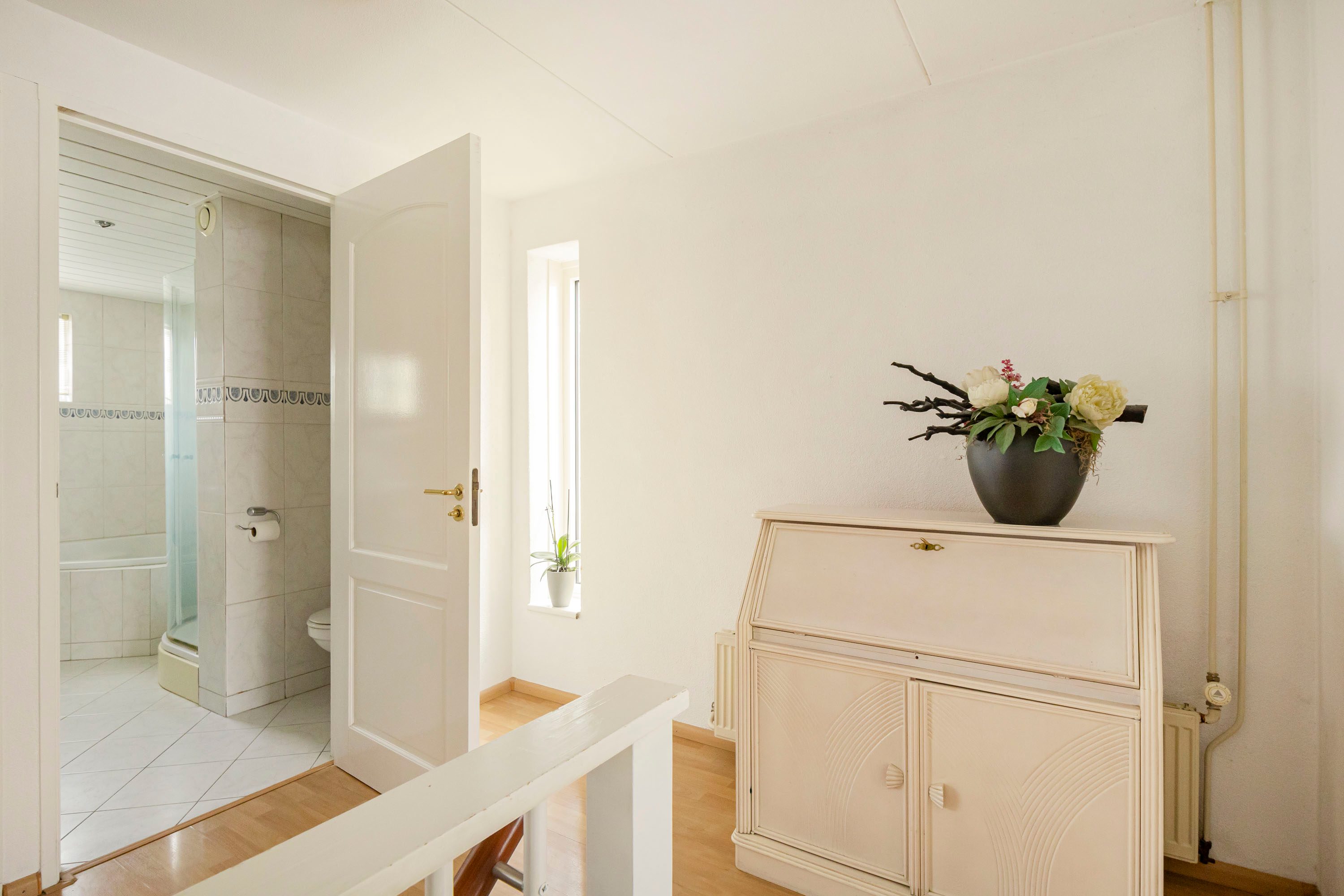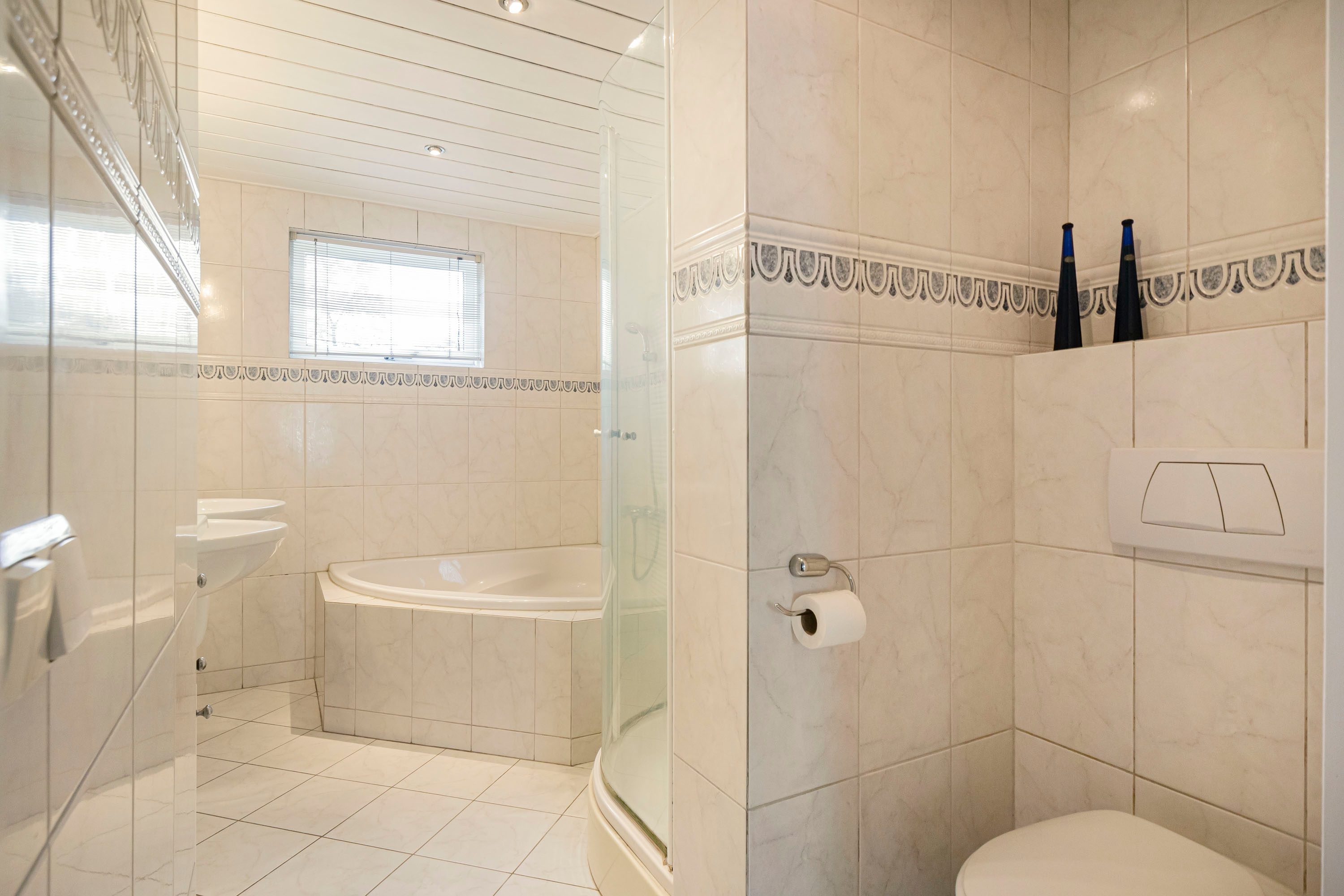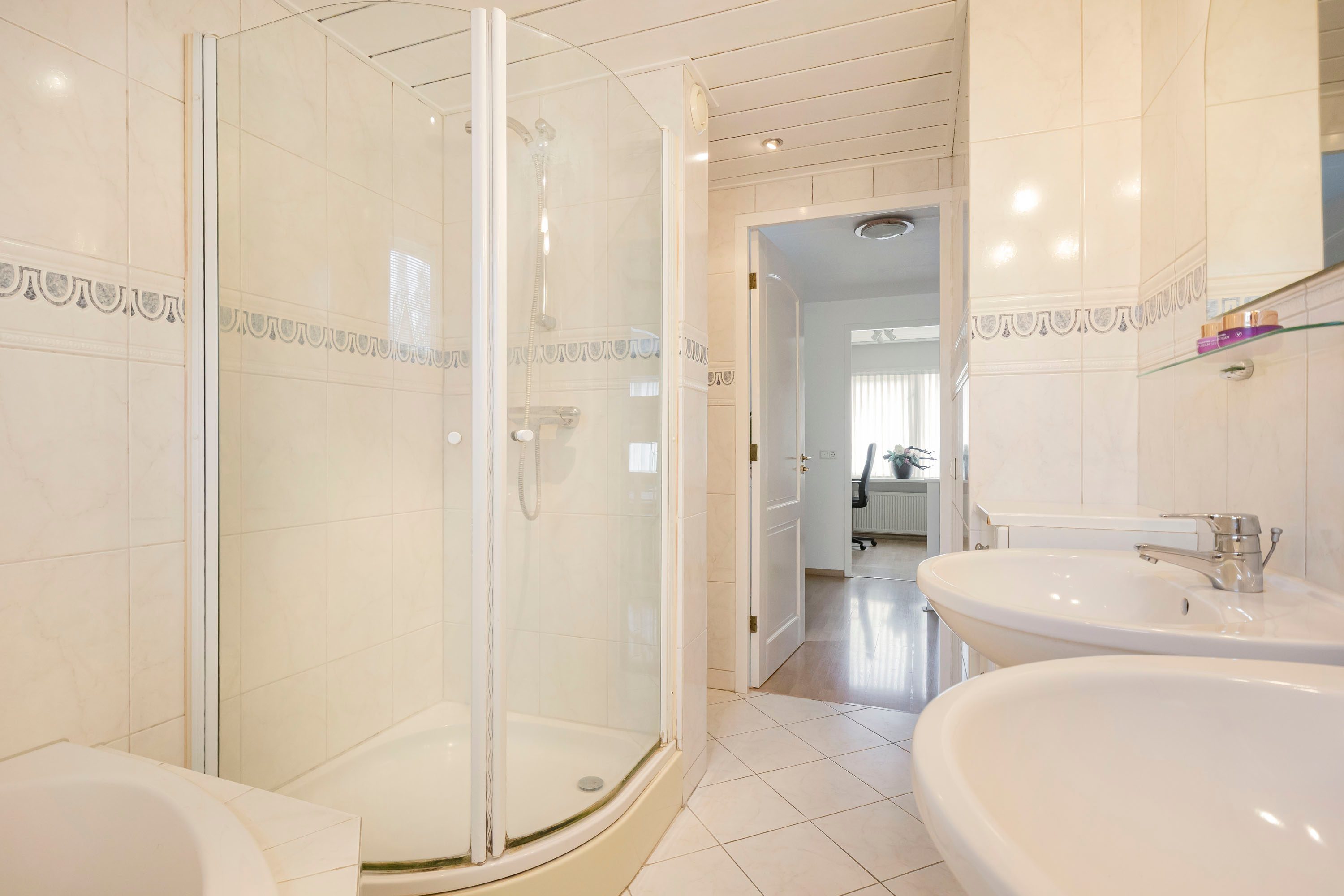 De badkamer is met 7,3 m² van een zeer prettig formaat en uitgerust met een dubbele wastafel, ligbad, douche en 2e toilet. Dankzij het te openen raam is er naast mechanische ventilatie ook natuurlijke ventilatie aanwezig.