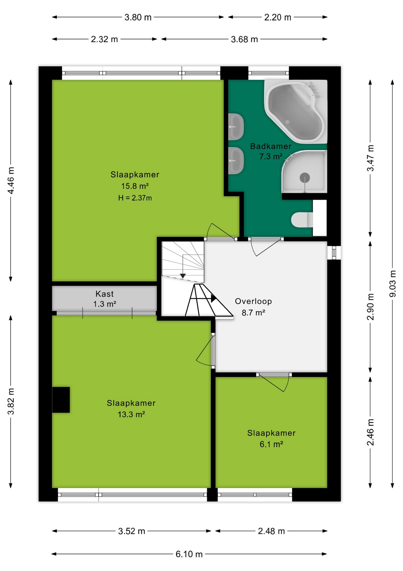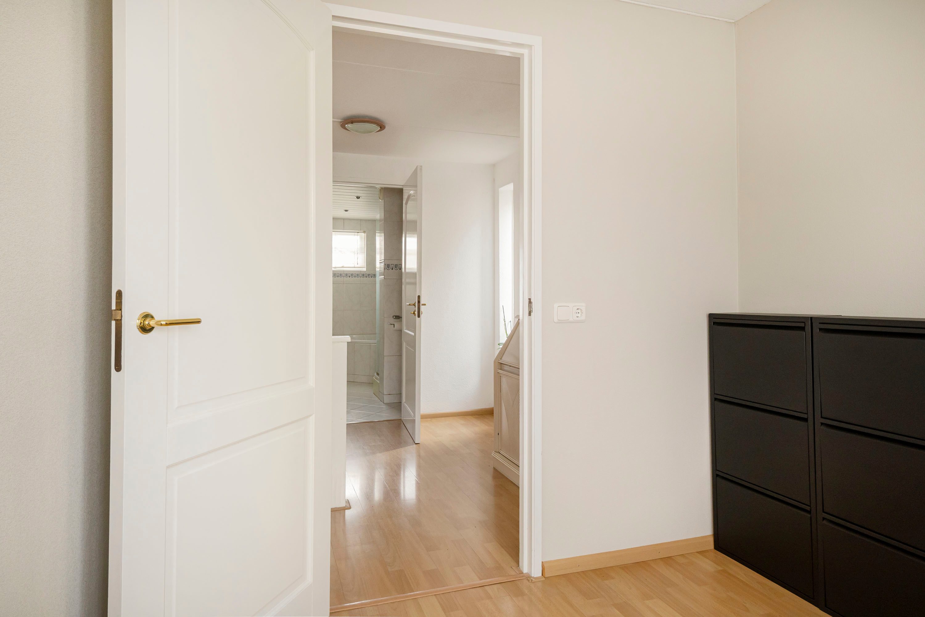 Door middel van de vaste trap kom je op de eerste verdieping welke toegang geeft tot de overloop en alle vertrekken. Hier bevinden zich drie slaapkamers met afmetingen van 15,8 m², 13,3 m² en 6,1 m². De slaapkamer van 13,3 m² beschikt over een inbouwkast en alle kamers genieten van grote raampartijen en veel daglichttoetreding. De rolluiken op de eerste verdieping zijn elektrisch bedienbaar door een afstandsbediening.