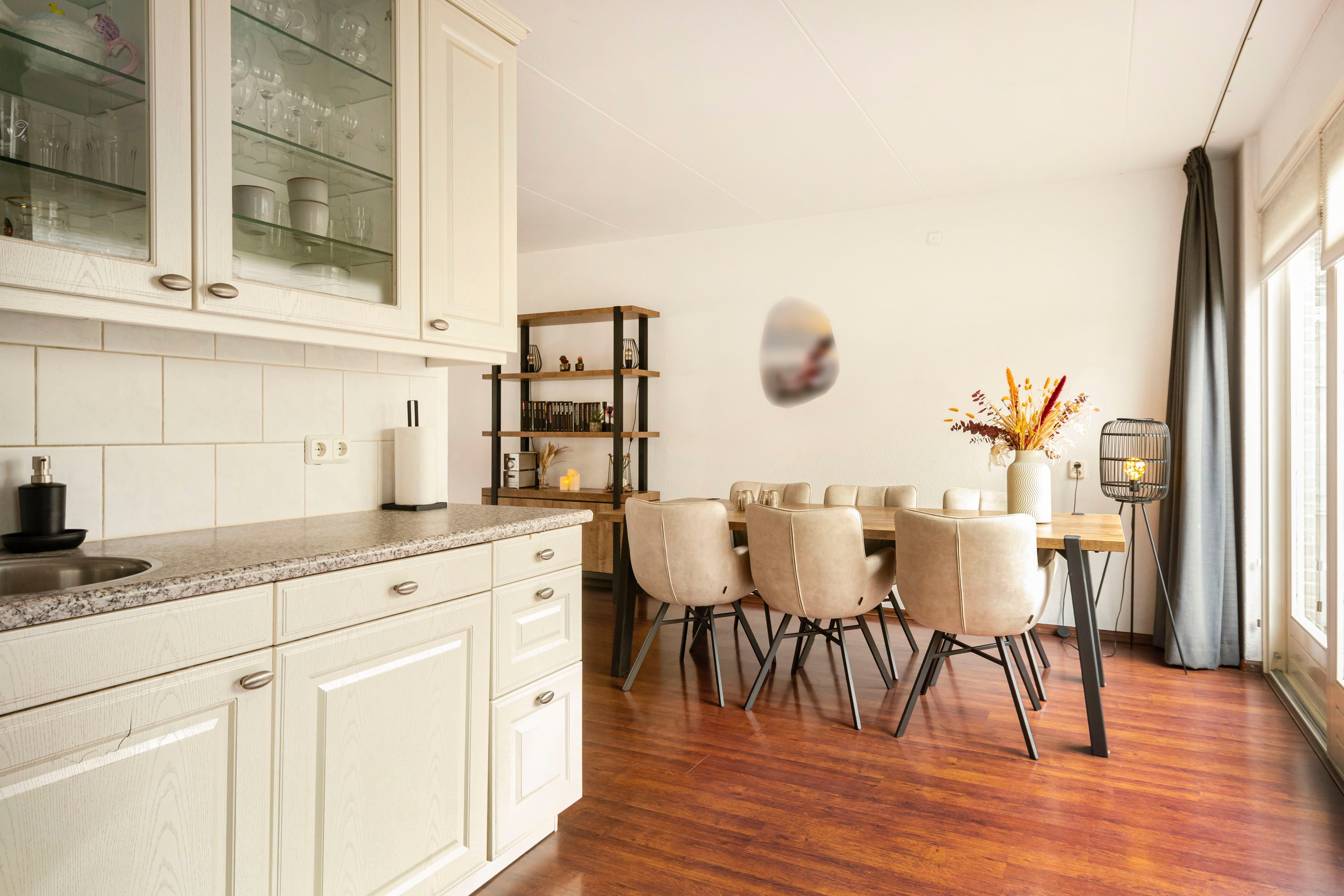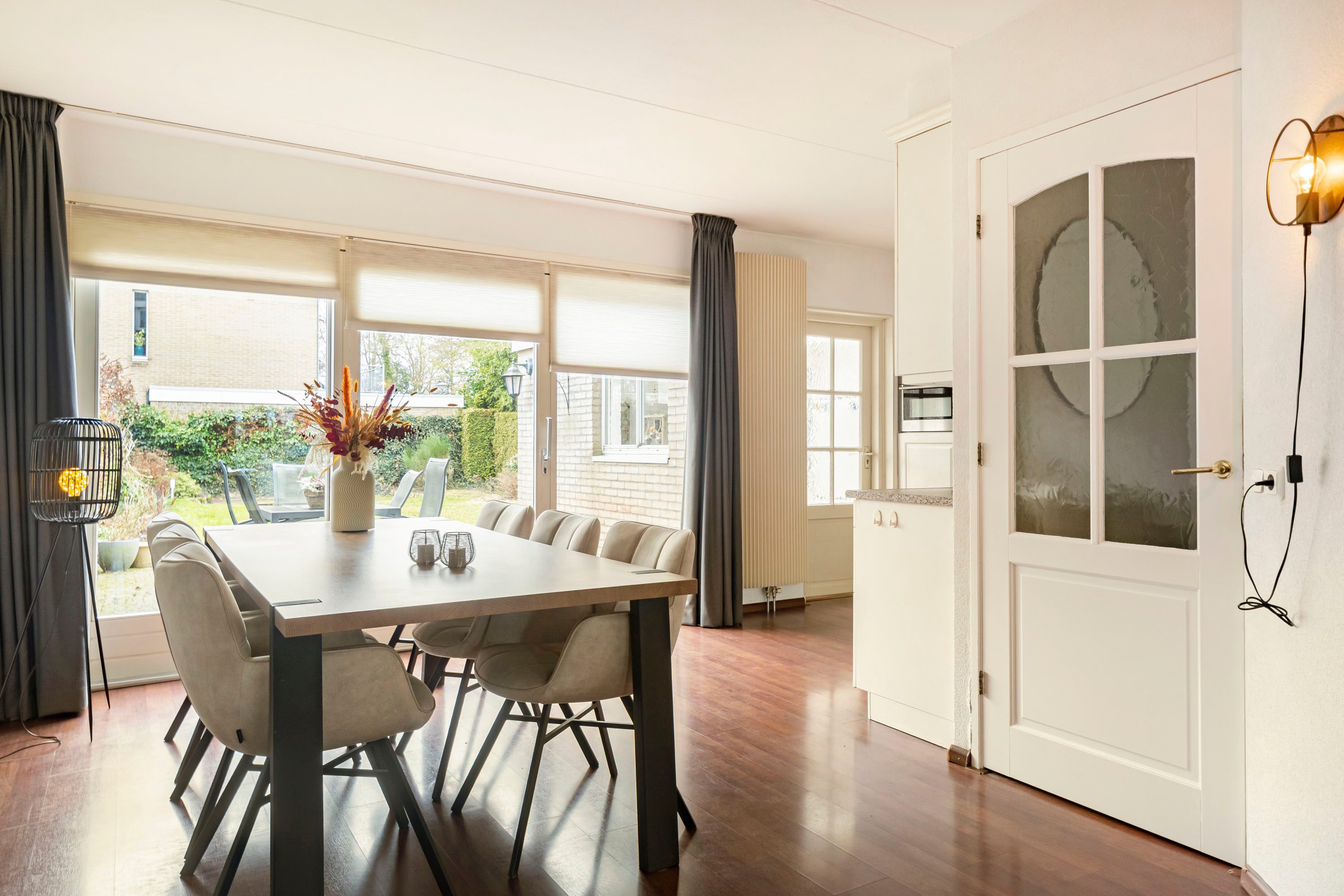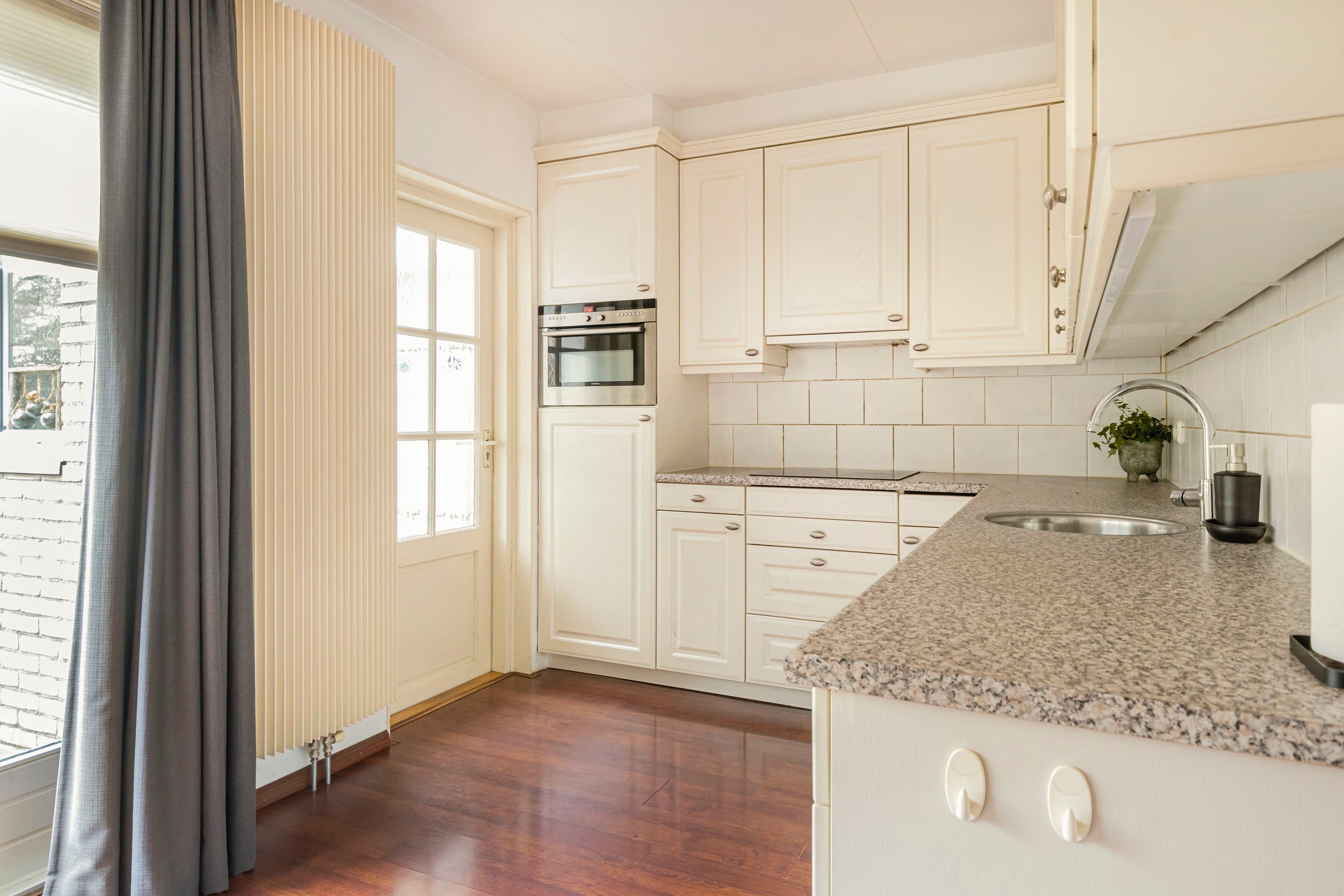 Aan de achterzijde van de woning bevindt zich het eetgedeelte, dat dankzij de schuifpui direct in verbinding staat met de zonnige en diepe achtertuin. Aansluitend ligt de L-vormige keuken van 7,6 m², uitgevoerd met crèmekleurige keukenkastjes en een licht werkblad. De keuken is voorzien van diverse inbouwapparatuur, waaronder een inductiekookplaat, afzuigkap, combimagnetron, koelkast en vaatwasser. Vanuit de keuken is tevens de praktische bijkeuken van 6,1 m² bereikbaar.