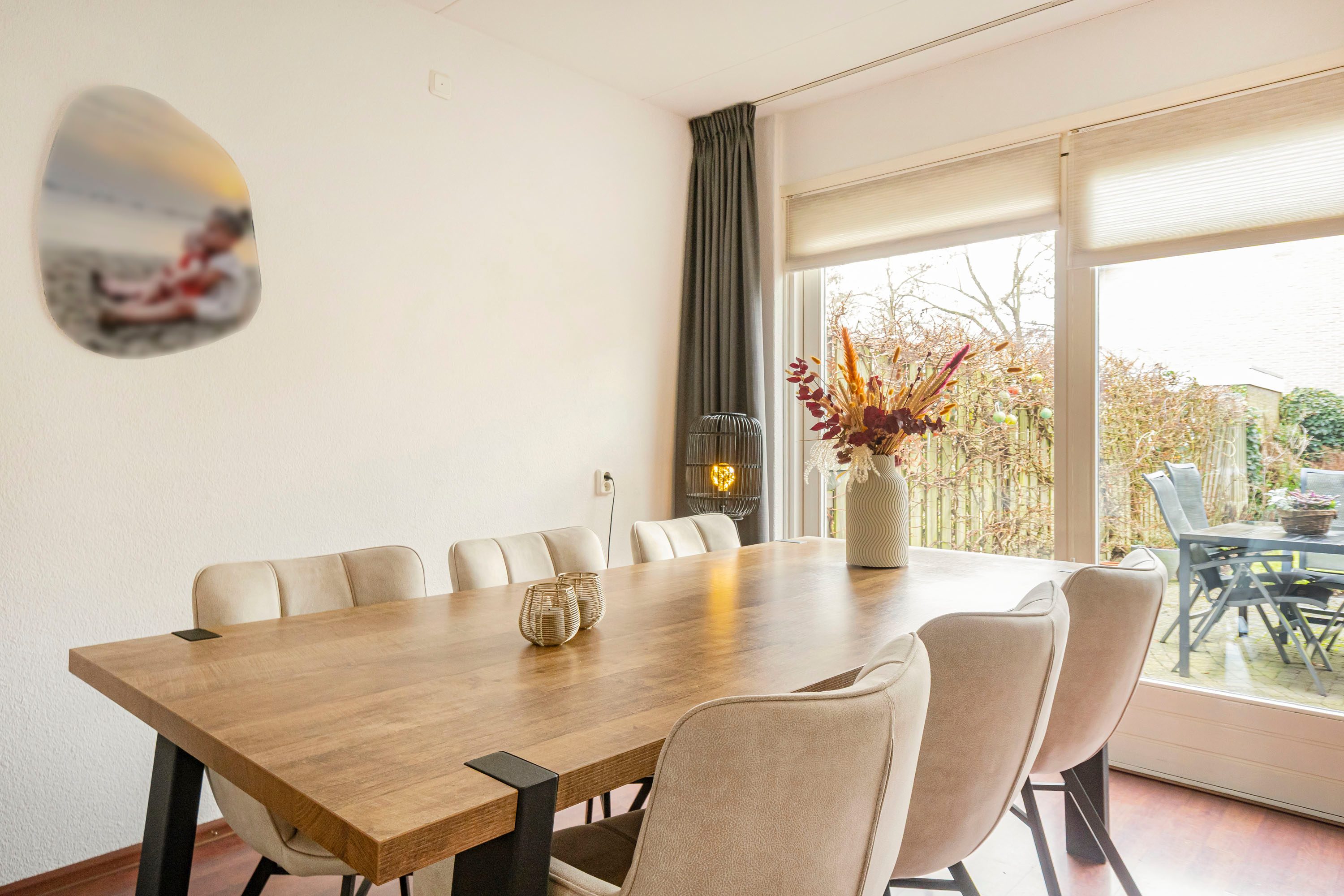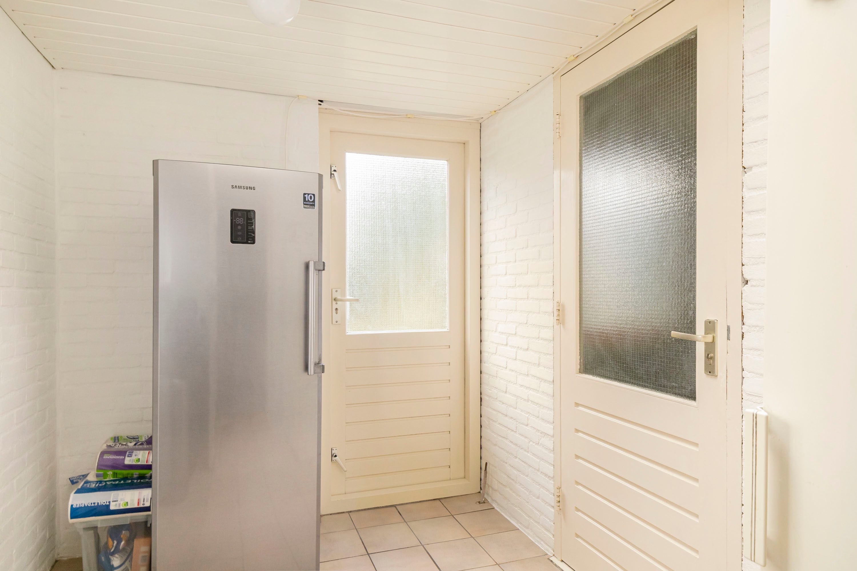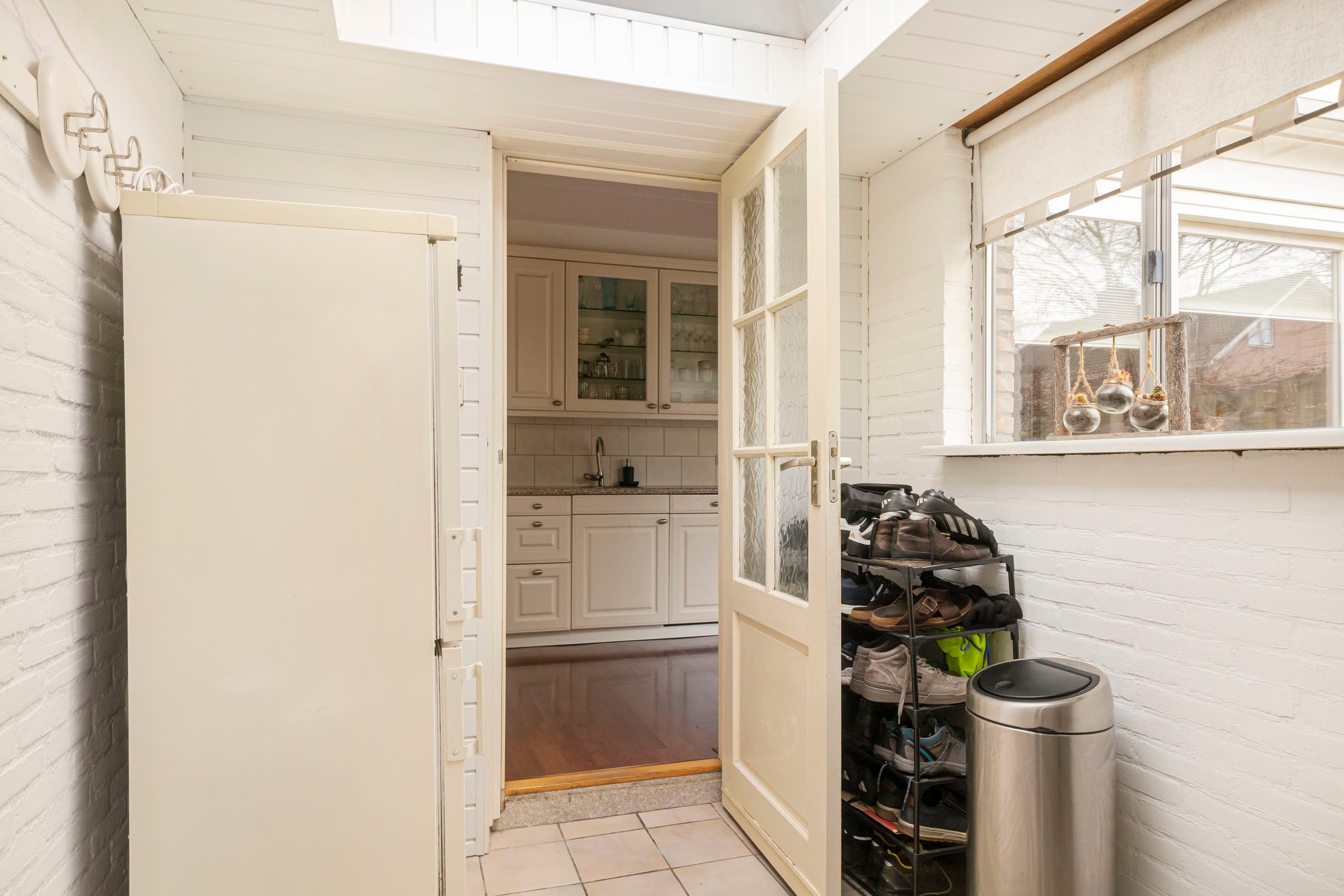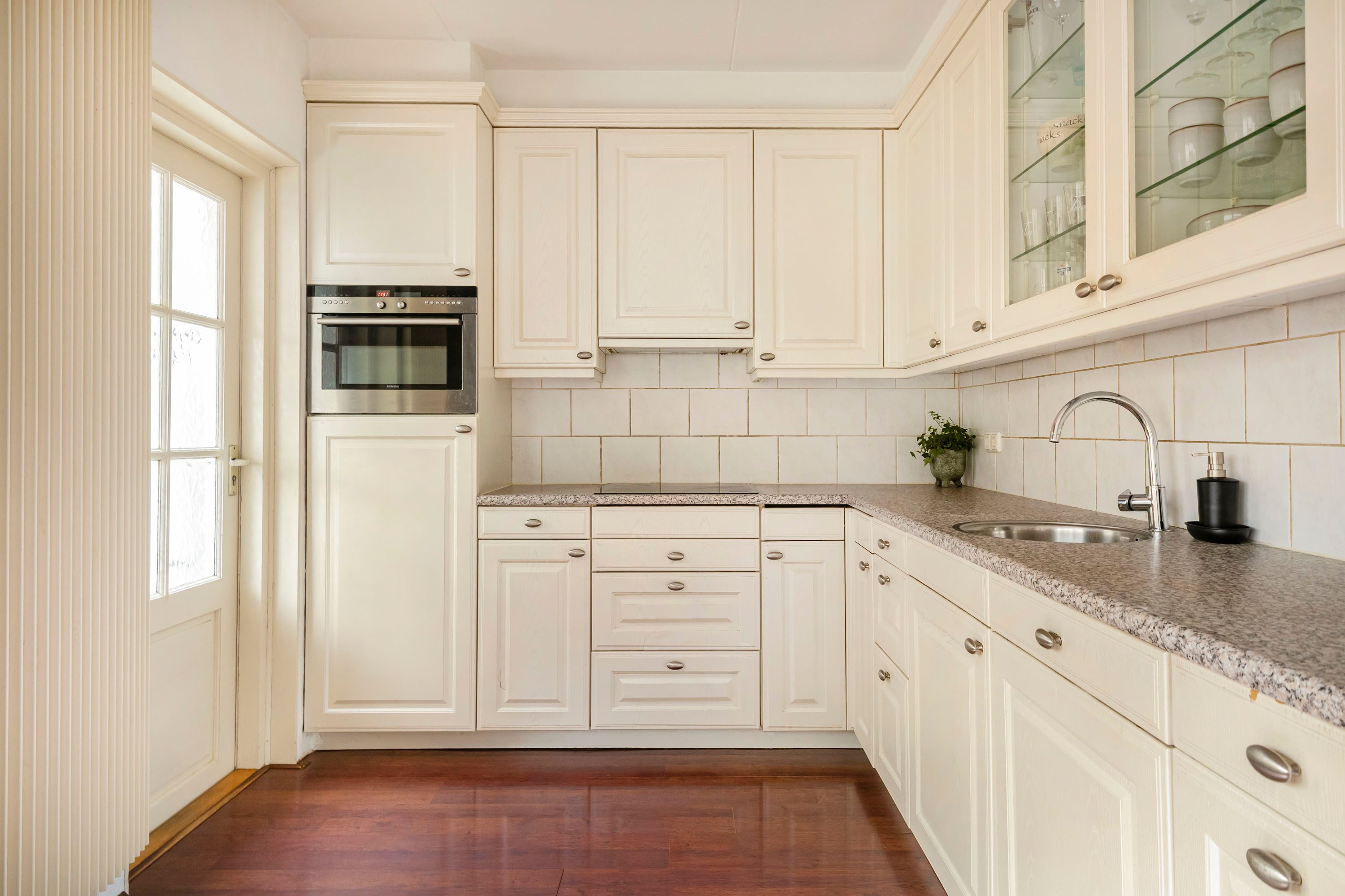 Aan de achterzijde van de woning bevindt zich het eetgedeelte, dat dankzij de schuifpui direct in verbinding staat met de zonnige en diepe achtertuin. Aansluitend ligt de L-vormige keuken van 7,6 m², uitgevoerd met crèmekleurige keukenkastjes en een licht werkblad. De keuken is voorzien van diverse inbouwapparatuur, waaronder een inductiekookplaat, afzuigkap, combimagnetron, koelkast en vaatwasser. Vanuit de keuken is tevens de praktische bijkeuken van 6,1 m² bereikbaar.