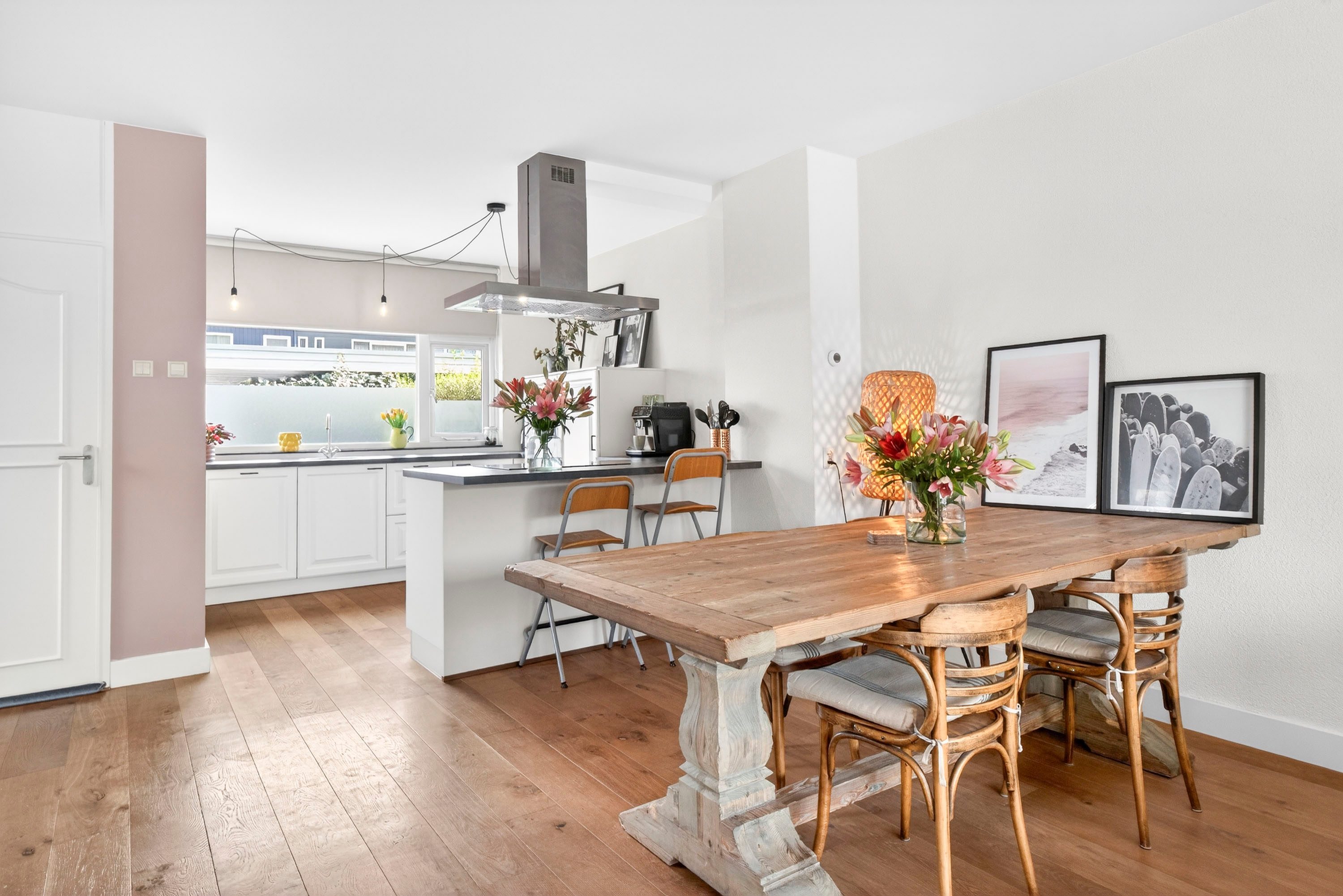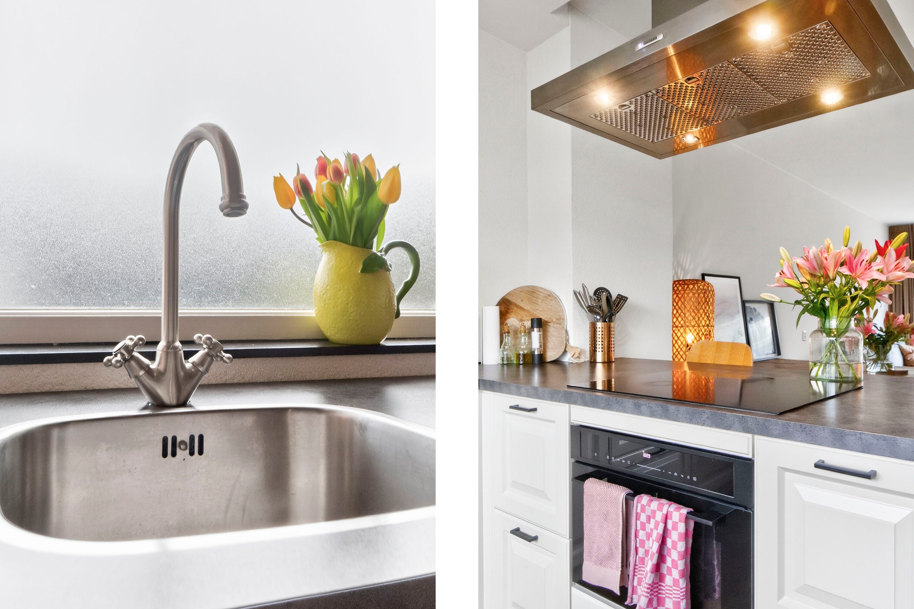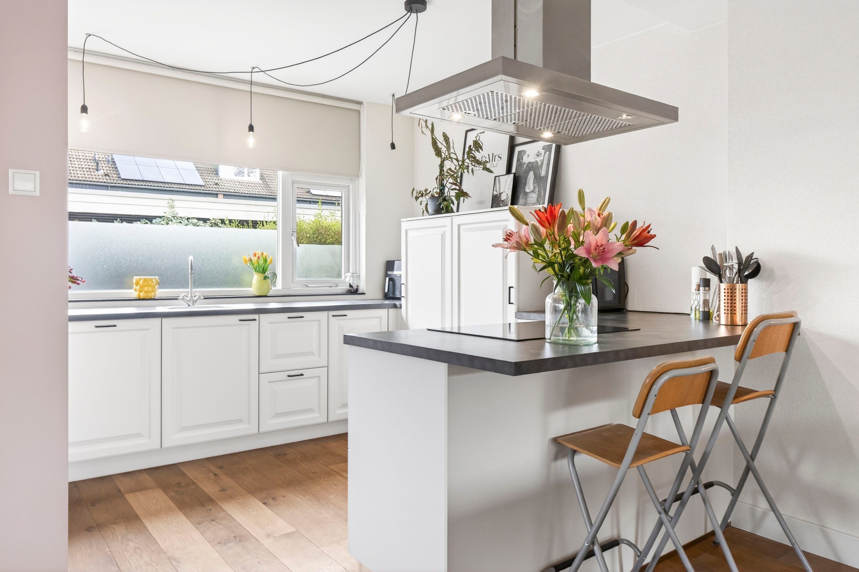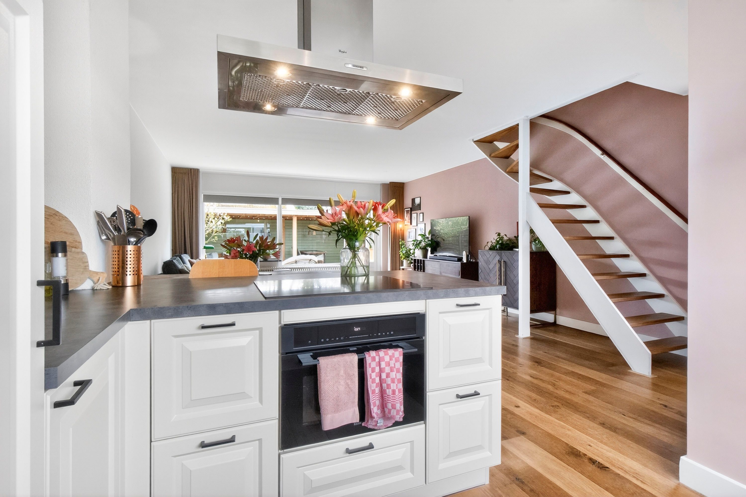 Aan de voorzijde bevindt zich de open keuken, het hart van het huis voor wie van koken houdt. De keuken is opgesteld in een hoek waar je gezellig kunt aanschuiven voor het ontbijt of een drankje terwijl er gekookt wordt. Je vindt hier alle gewenste apparatuur, zoals een kookplaat met RVS-afzuigkap, een oven, vaatwasser en een koelkast. Het grote raam boven het aanrecht geeft een fijn uitzicht op de rustige straat aan de voorzijde.