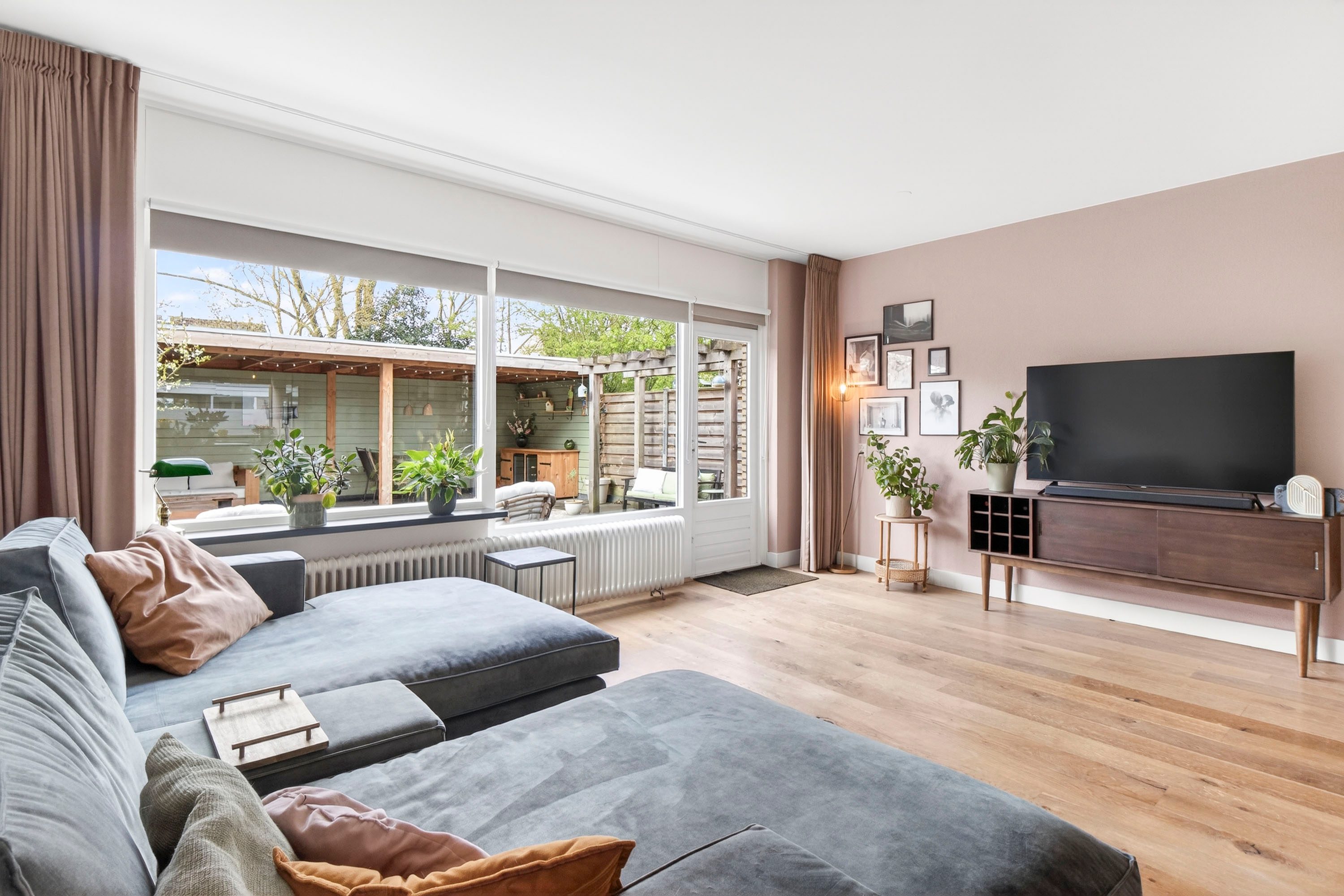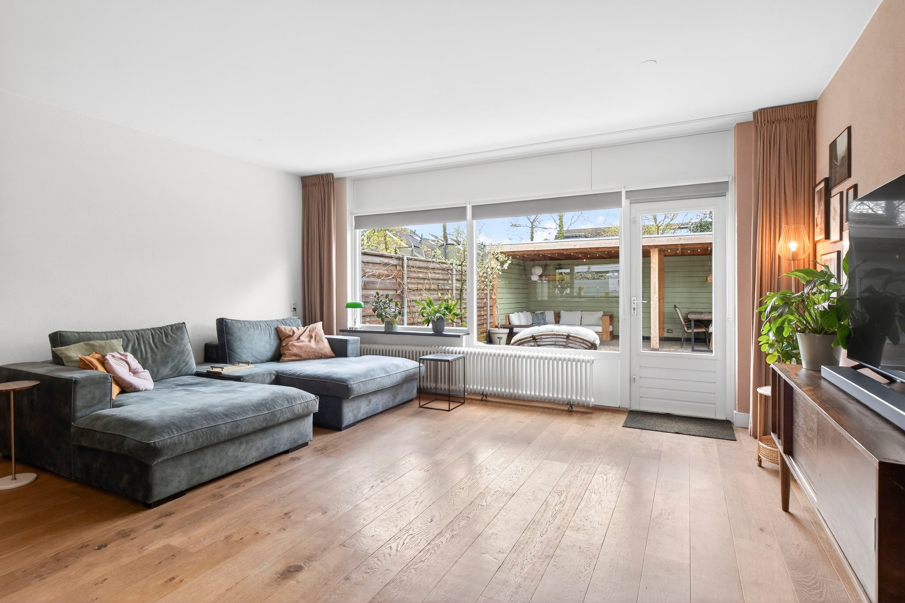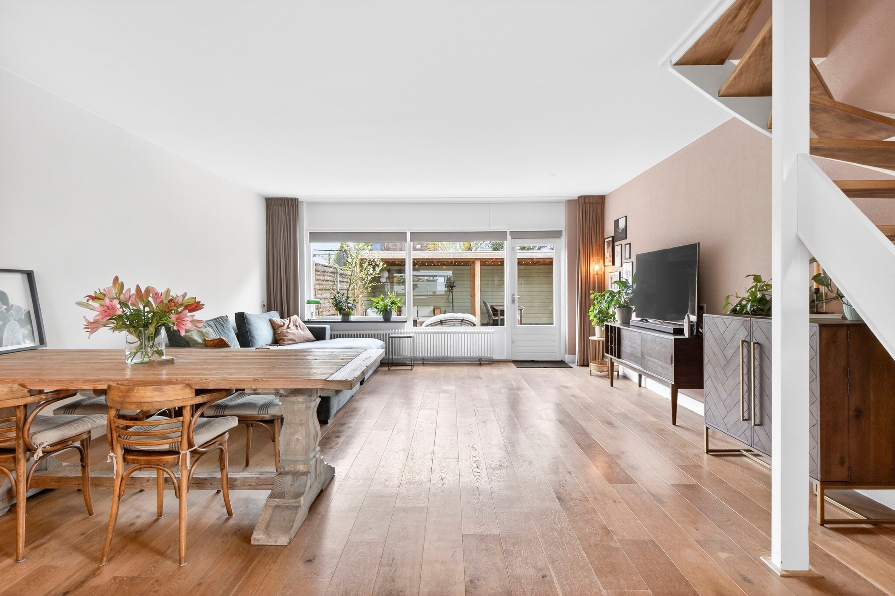 Je parkeert de auto droog onder je eigen carport en komt binnen in een lichte, verzorgde hal. Hier vind je het moderne toilet met fonteintje en de trapopgang. Zodra je de woonkamer binnenstapt, valt op hoe licht en ruimtelijk de woning is. De woonkamer is volledig tuingericht; door de grote raampartijen aan de achterzijde stroomt het daglicht naar binnen en heb je een mooi uitzicht op je terras. De warme houtlook vloer is over de gehele verdieping doorgelegd, wat zorgt voor eenheid en rust.