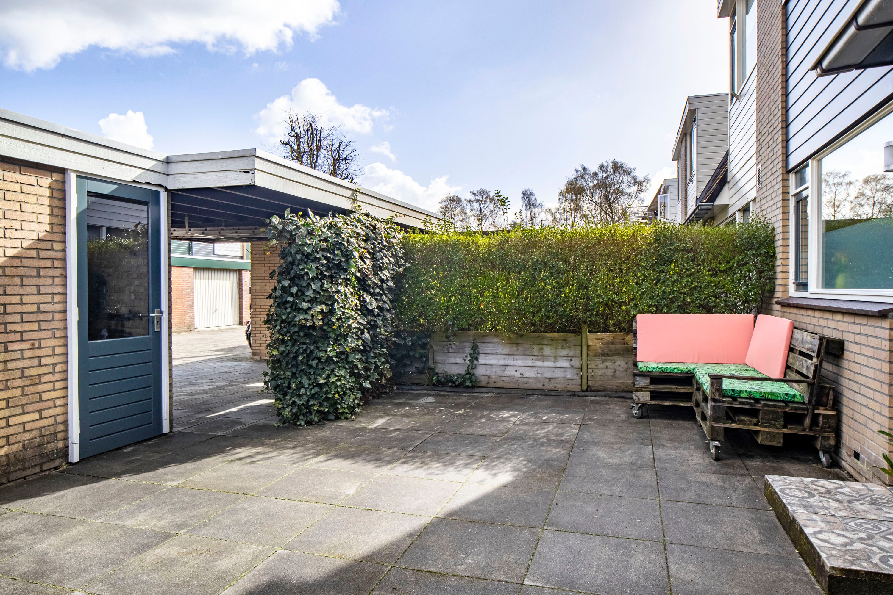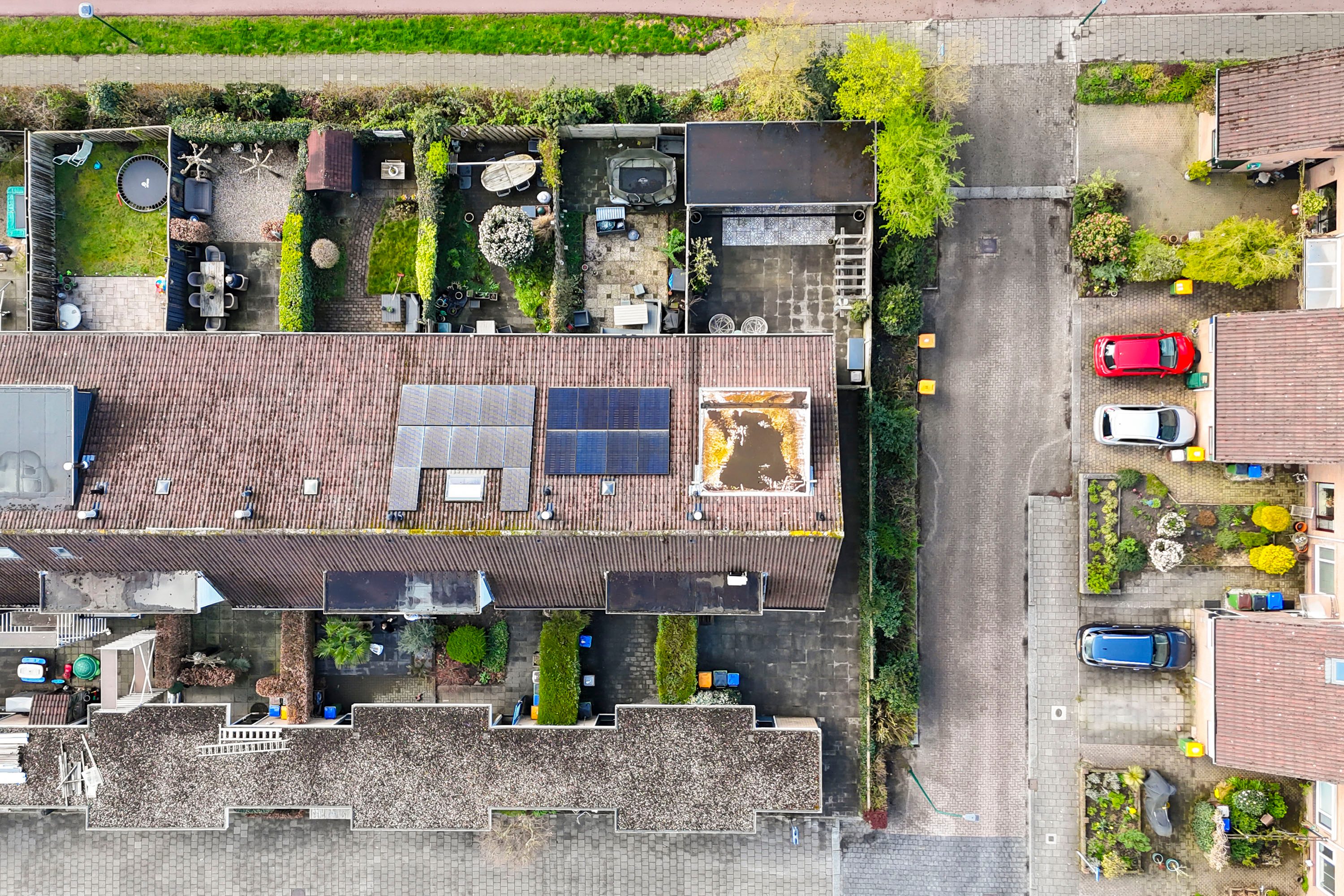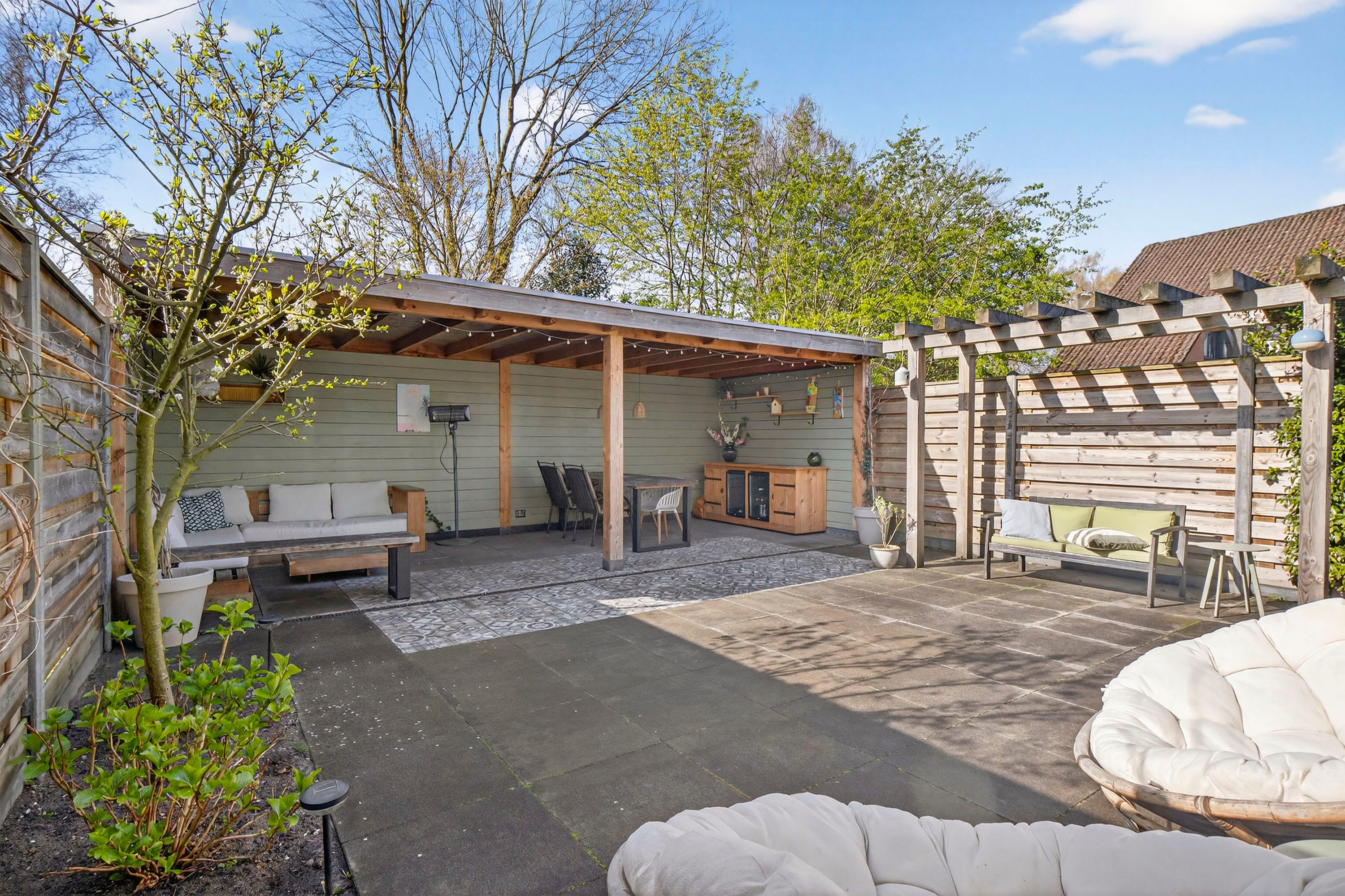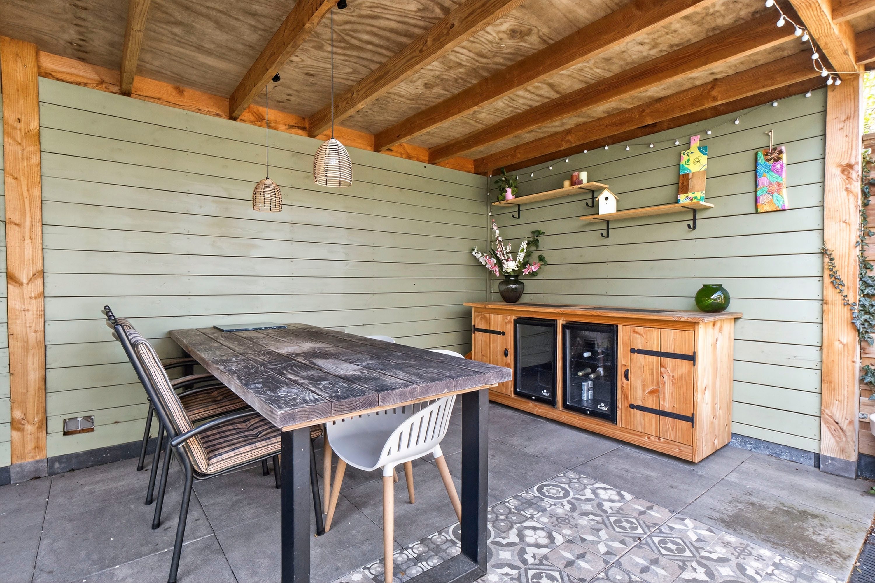 De achtertuin is echt een verlengstuk van je woonkamer, zeker door de ligging op het zonnige zuidwesten. De tuin is met zorg aangelegd met een mix van moderne bestrating en vaste beplanting. Achterin de tuin staat de 'eyecatcher': een robuuste houten overkapping die functioneert als een volwaardige buitenkamer.
