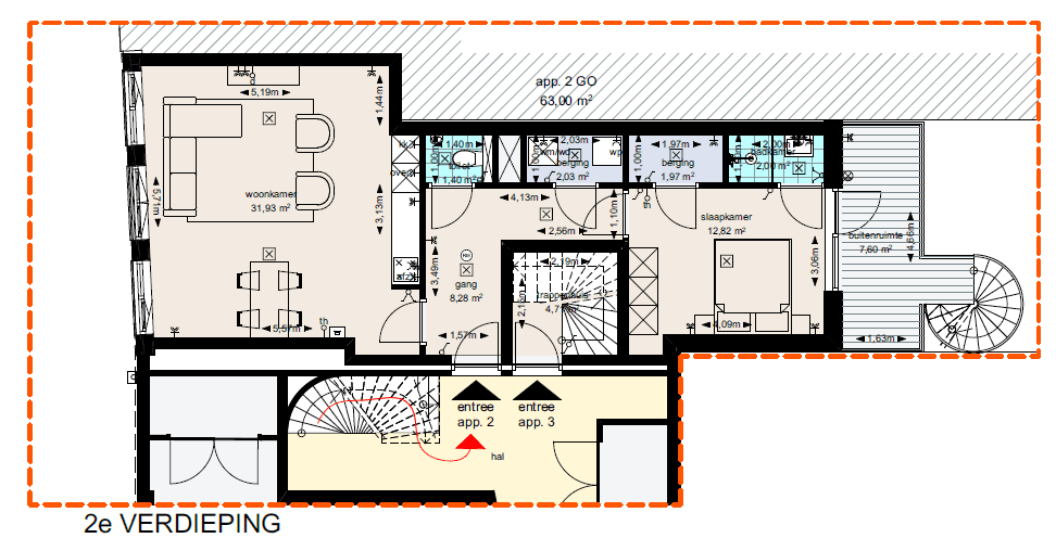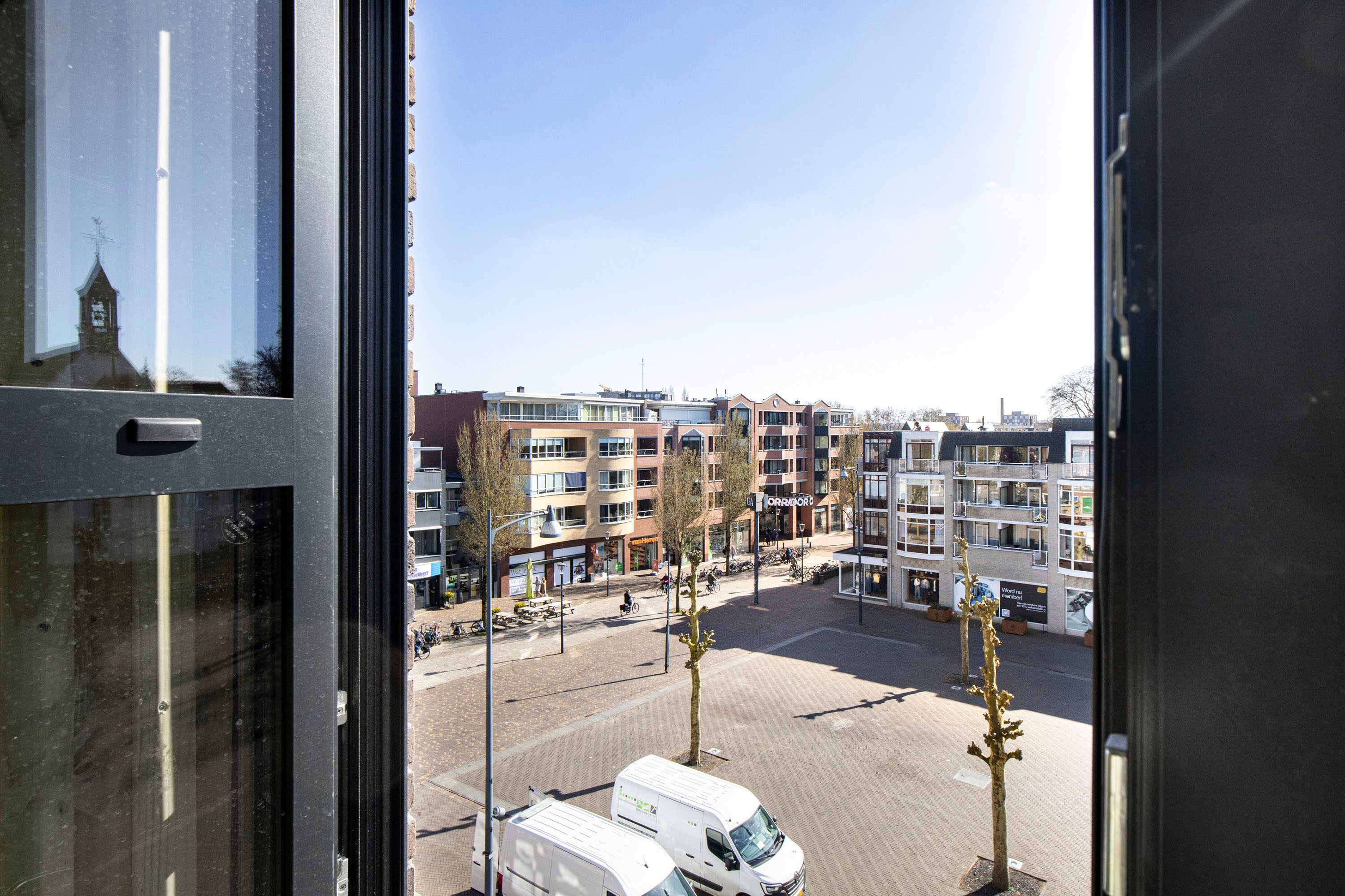 De hal geeft toegang tot alle vertrekken. De woonkamer heeft een afmeting van maar liefst 32m² en is voorzien van grote raampartijen waardoor er heerlijk veel lichtinval aanwezig is en waar je echt kunt genieten van een prachtig uitzicht over de markt van Veenendaal. De open keuken kan geheel naar eigen wens gecreëerd worden. Via de hal is het separate toilet en de technische ruimte met witgoedaansluiting te vinden.