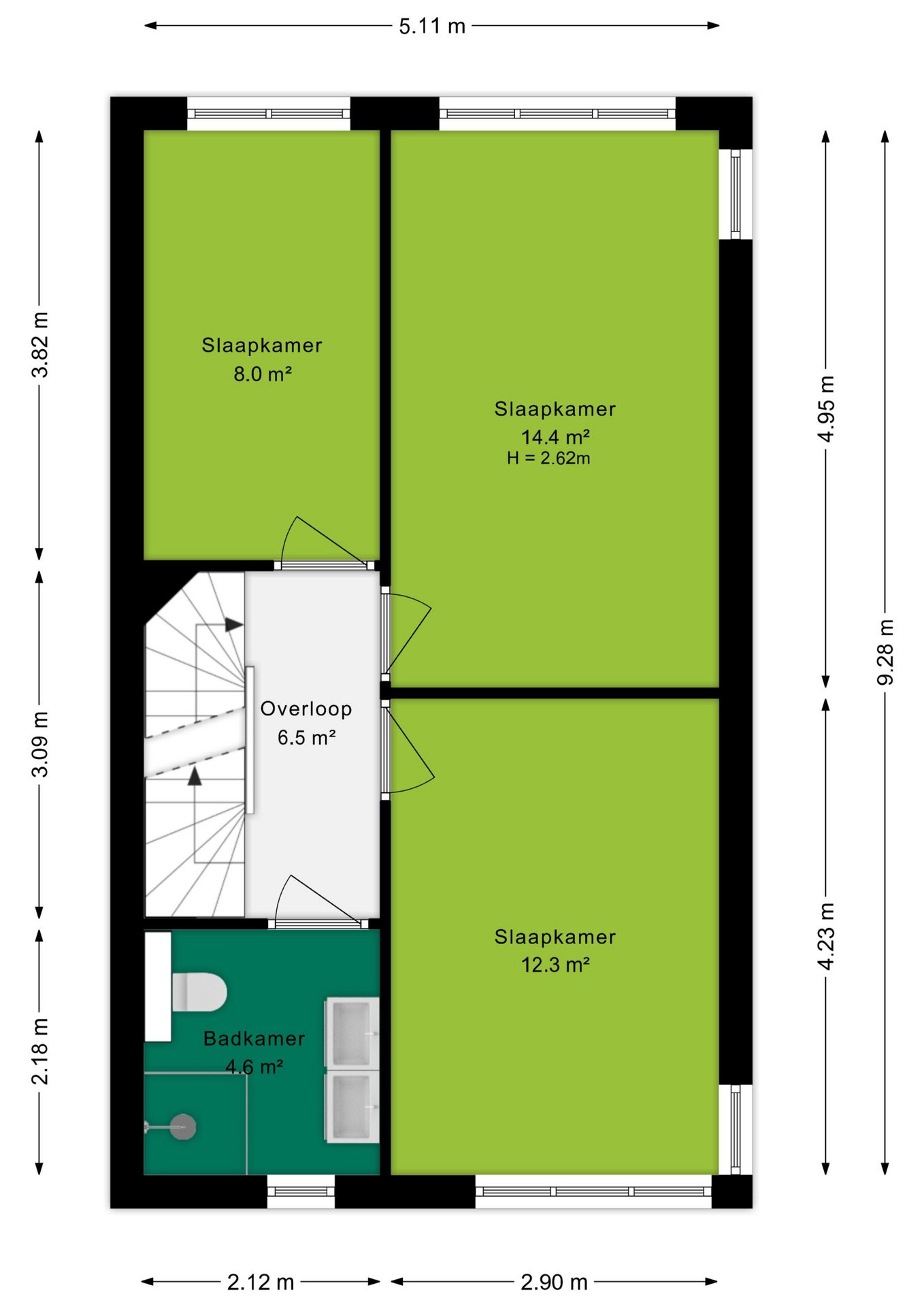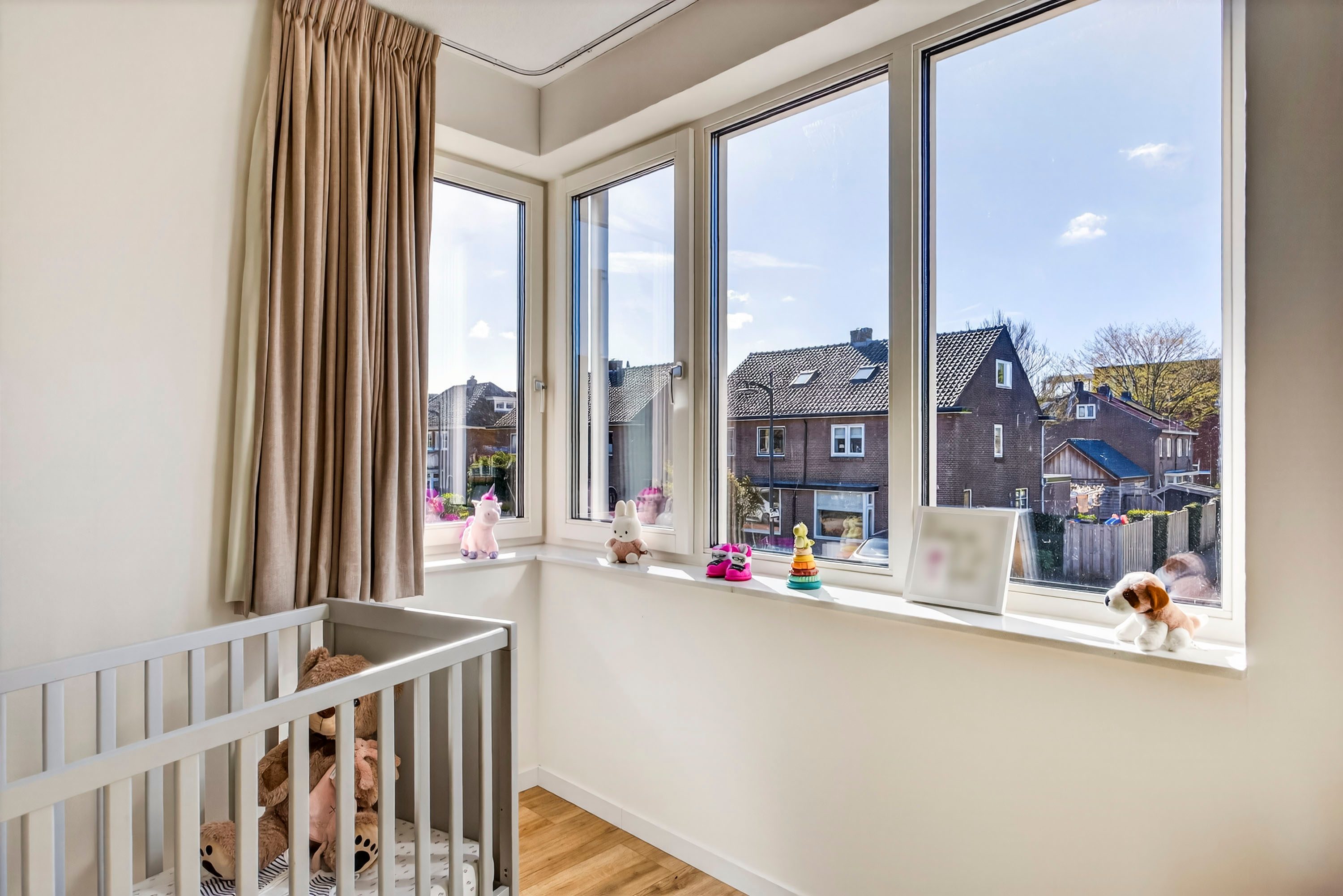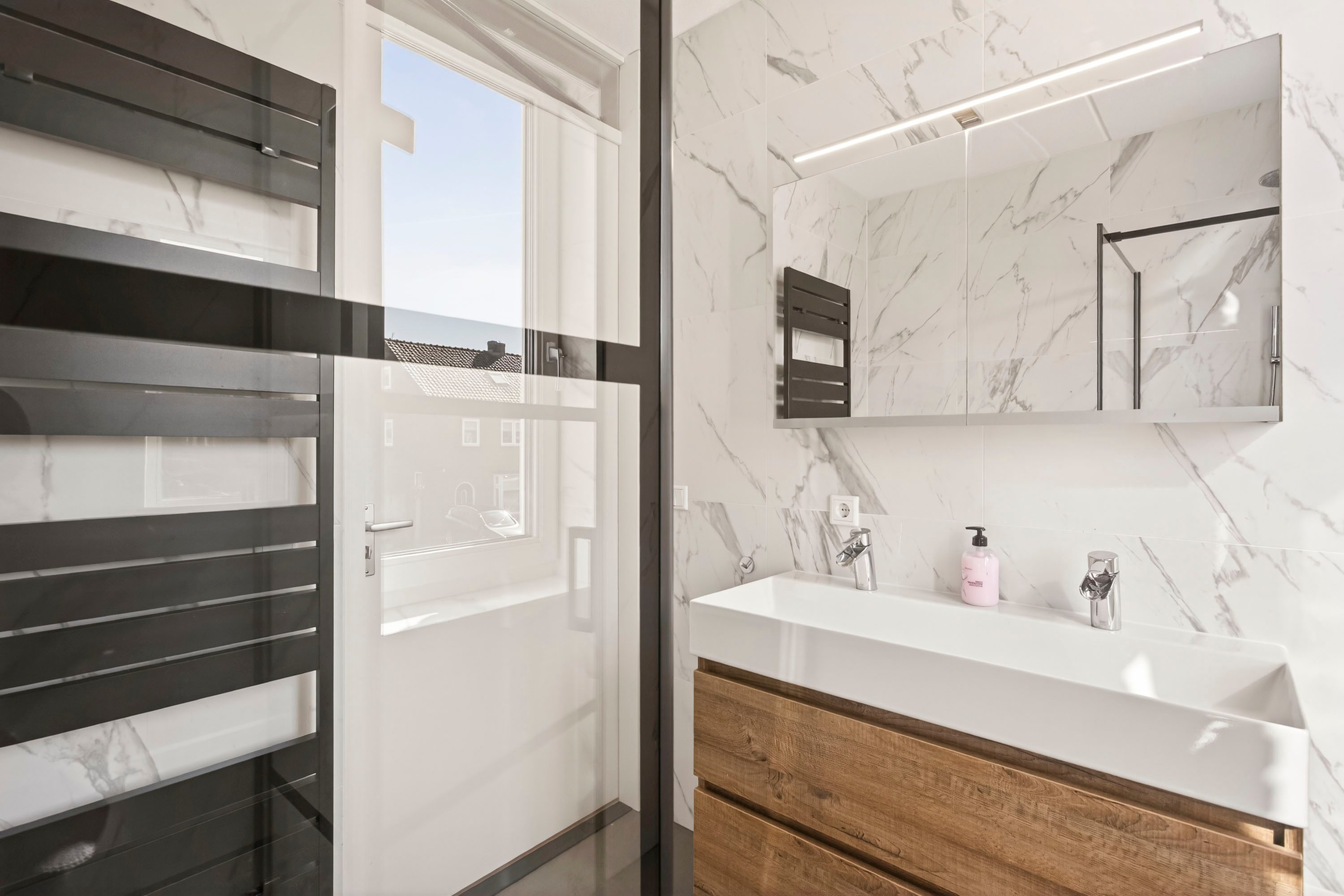 Via de vaste trap kom je op de eerste verdieping. Op de eerste verdieping zijn drie goede slaapkamers van circa 14 m², 12 m² en 8 m². Of je ze nu inricht als slaapkamer, kinderkamer of kantoor; de ruimte is er. De badkamer is modern en stijlvol betegeld. Je hebt hier een douchecabine, een dubbele wastafel met spiegel en een tweede toilet.