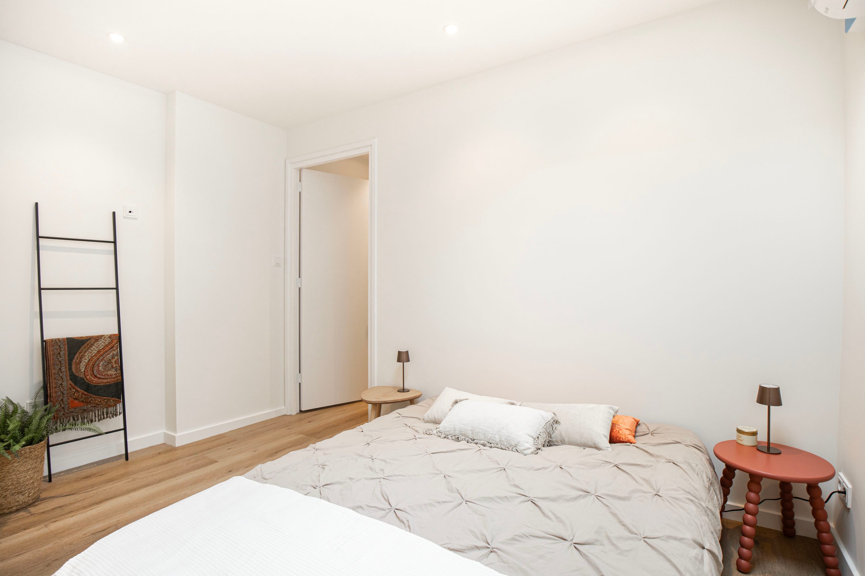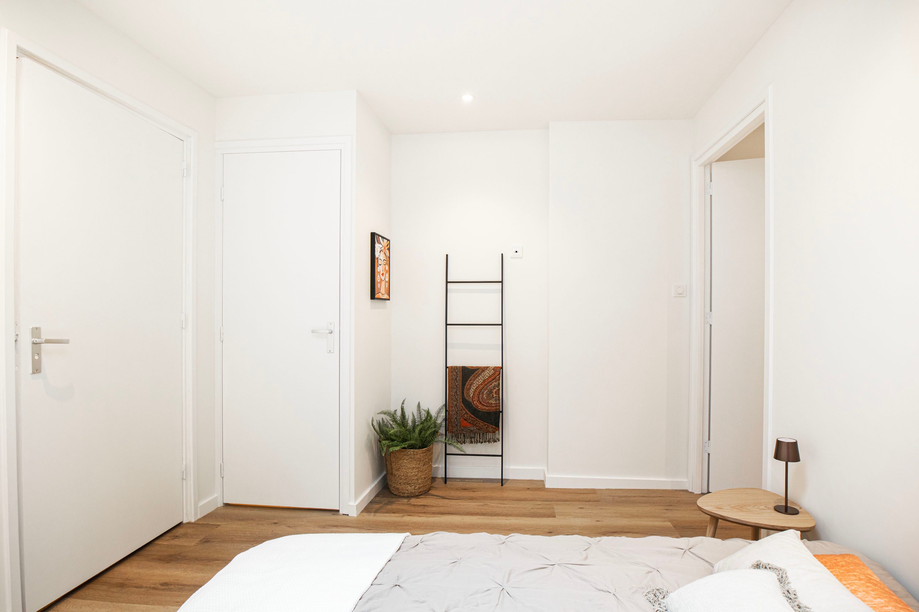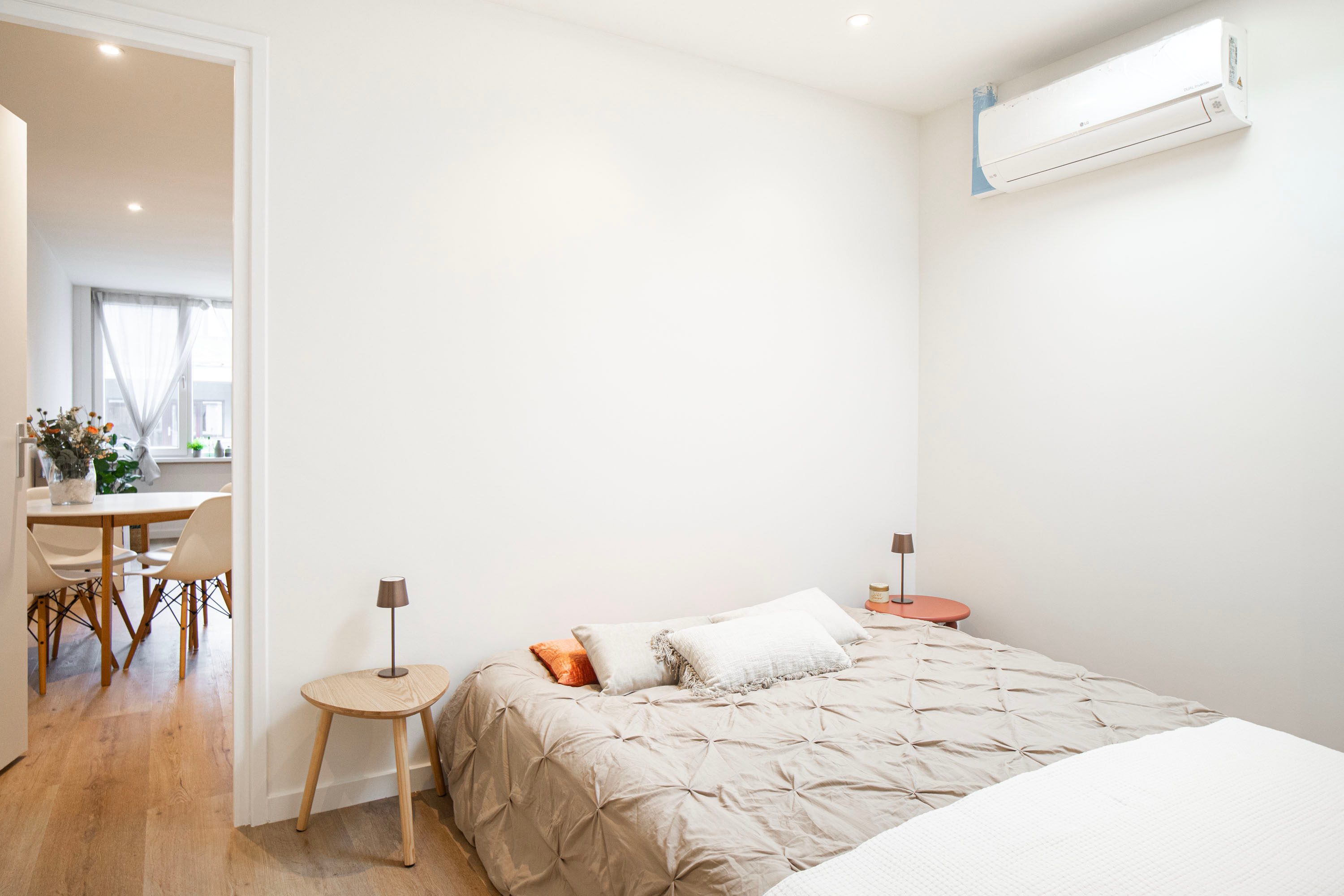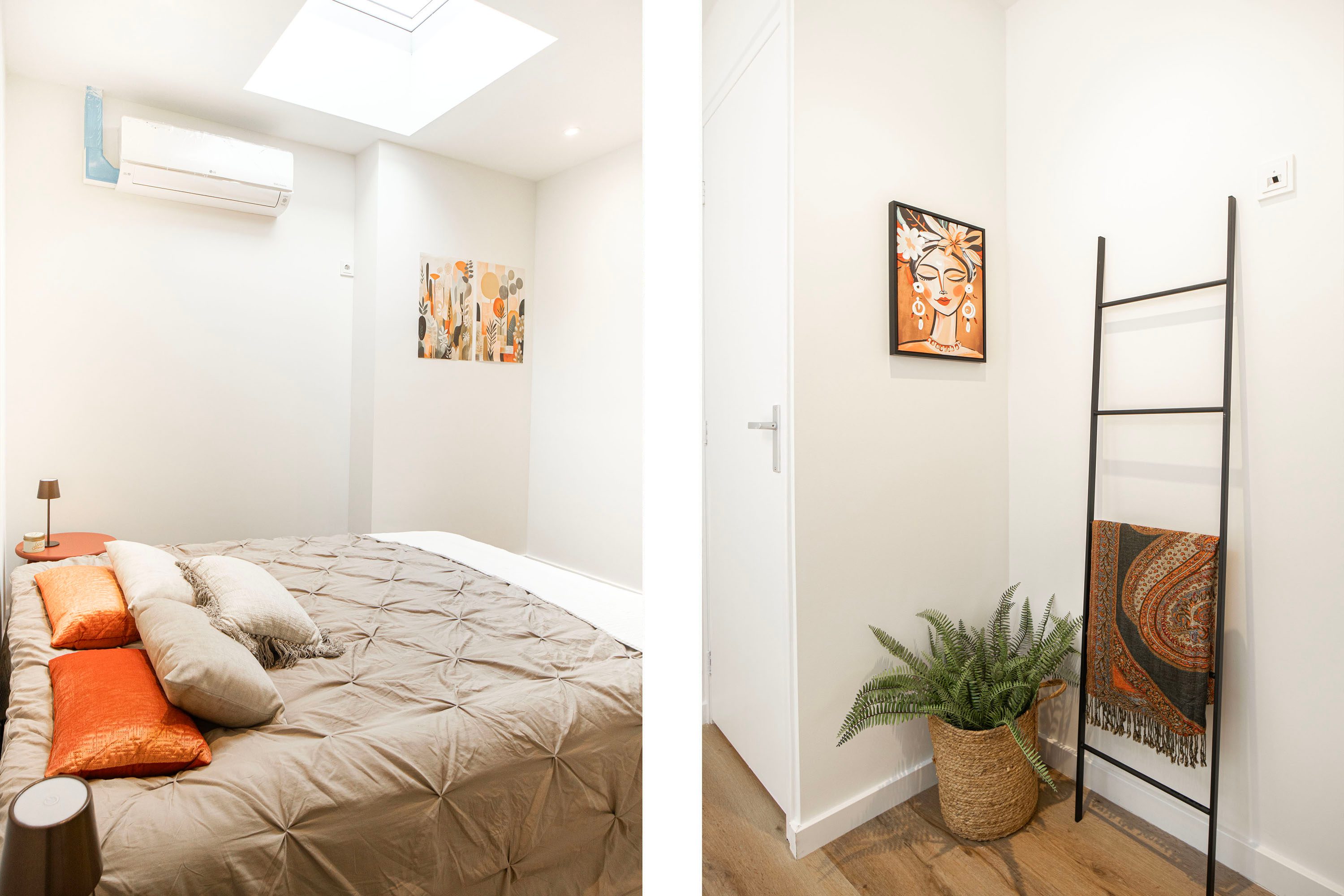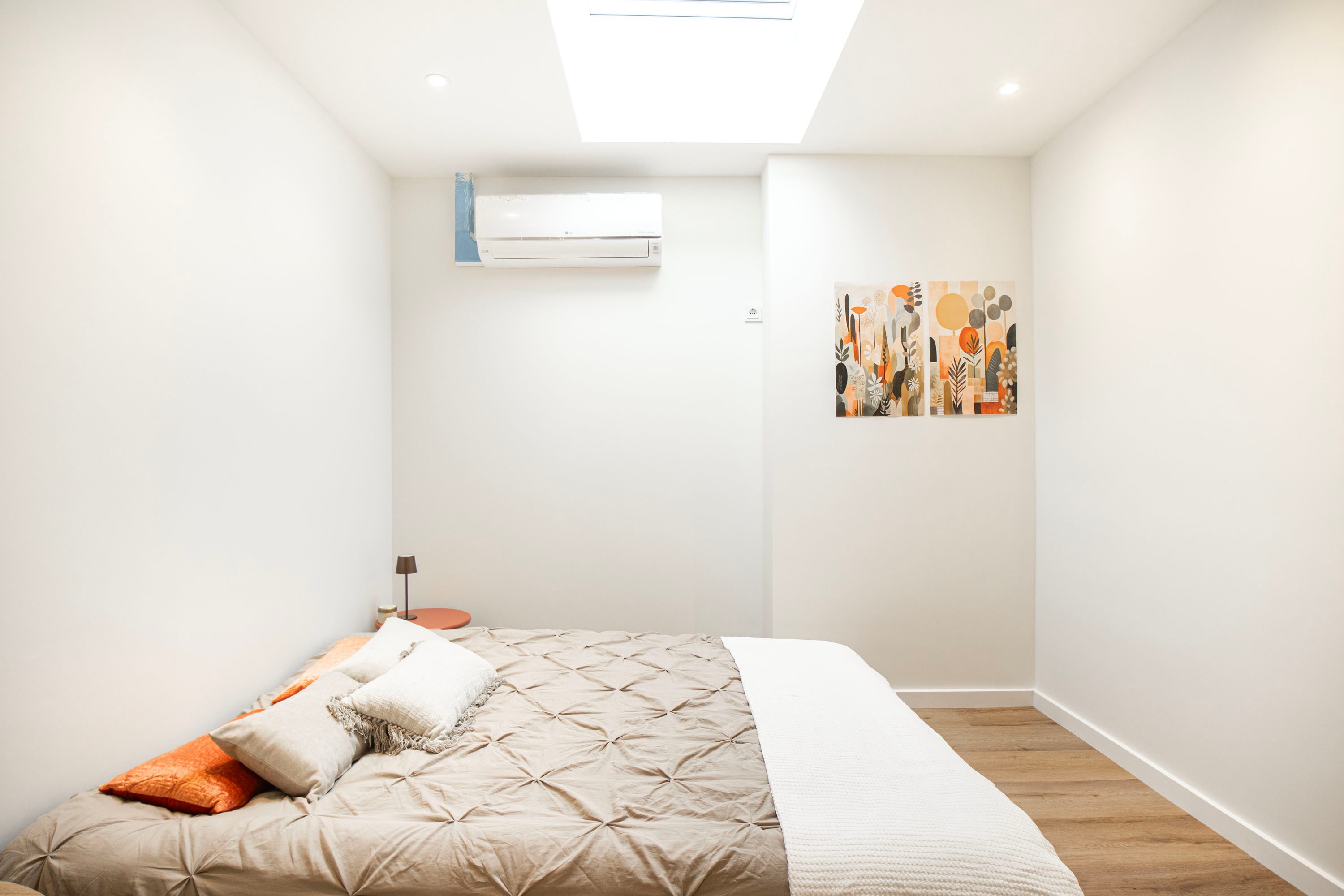 Aangrenzend bevindt zich een ruime slaapkamer. In het plafond een te openen lichtkoepel voor daglicht en de gewenste natuurlijke ventilatie. Ook in de slaapkamer hangt airco voor het verwarmen en koelen. Achter een deur zitten de aansluitingen voor de wasmachine en droger.