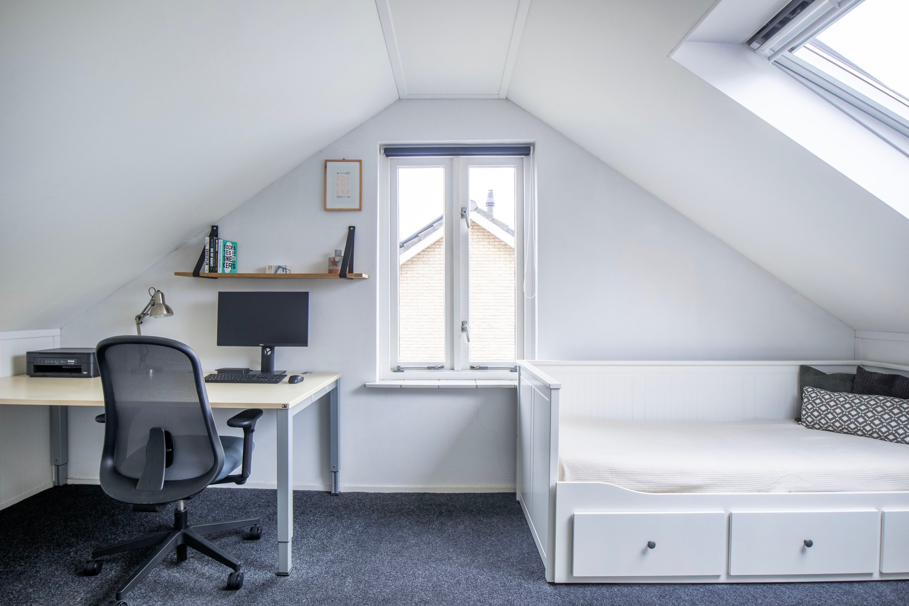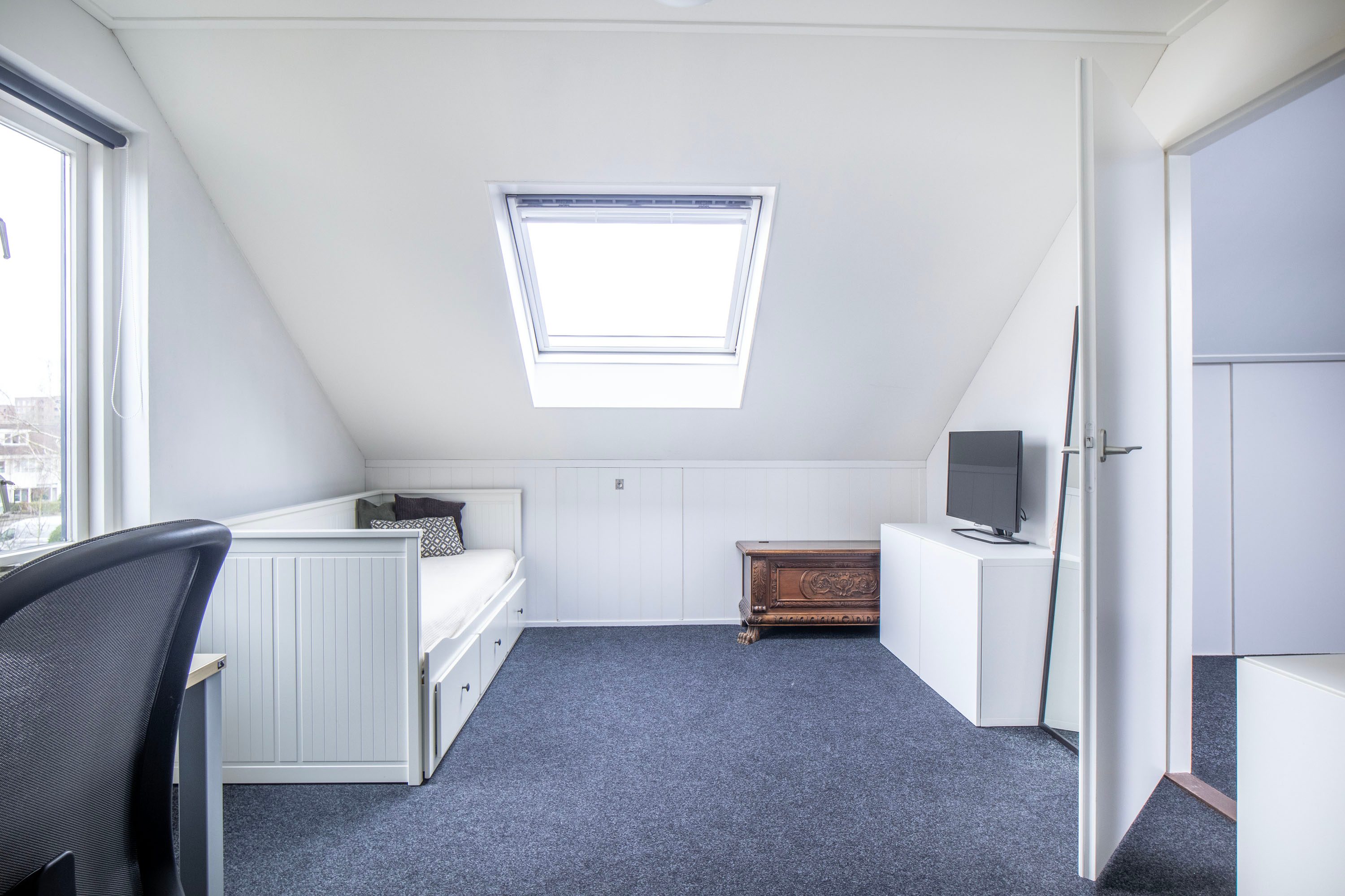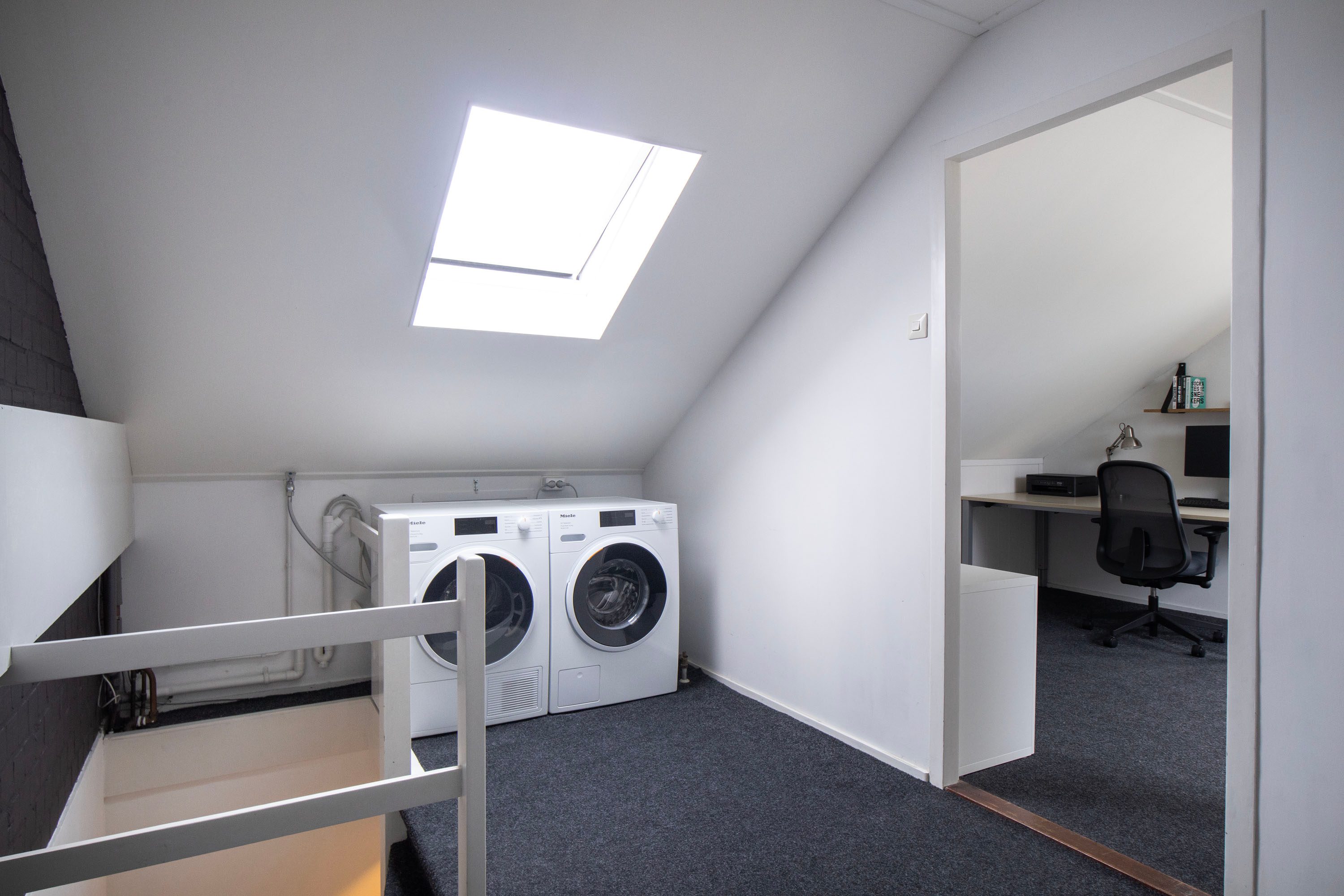 Via een vaste trap bereik je de ruime voorzolder met cv-opstelling (Nefit Proline NXT HRC 30, 2025), wasmachineaansluiting en dakraam. De vierde slaapkamer is verrassend ruim, beschikt over veel bergruimte achter knieschotten en is voorzien van een Velux dakraam. Deze verdieping is afgewerkt met vloerbedekking.