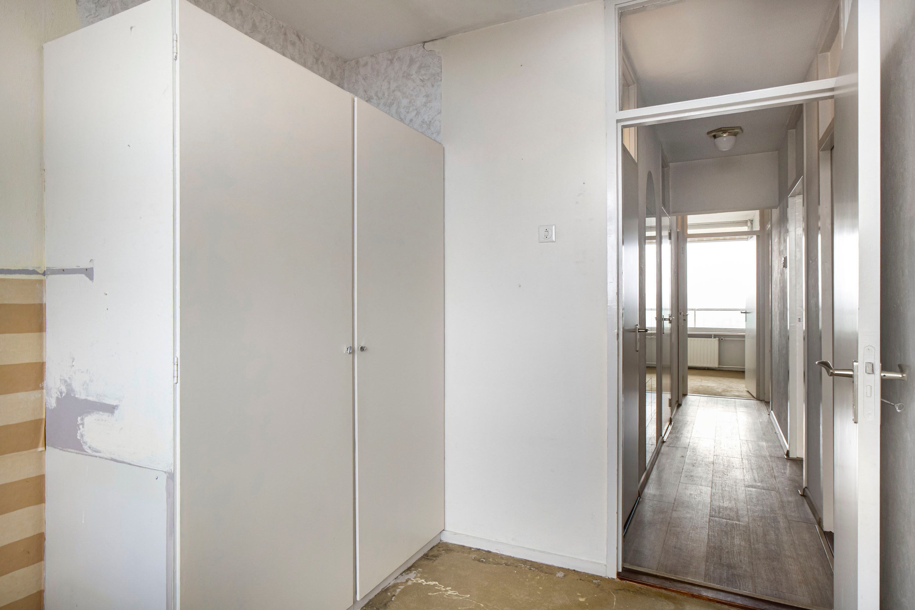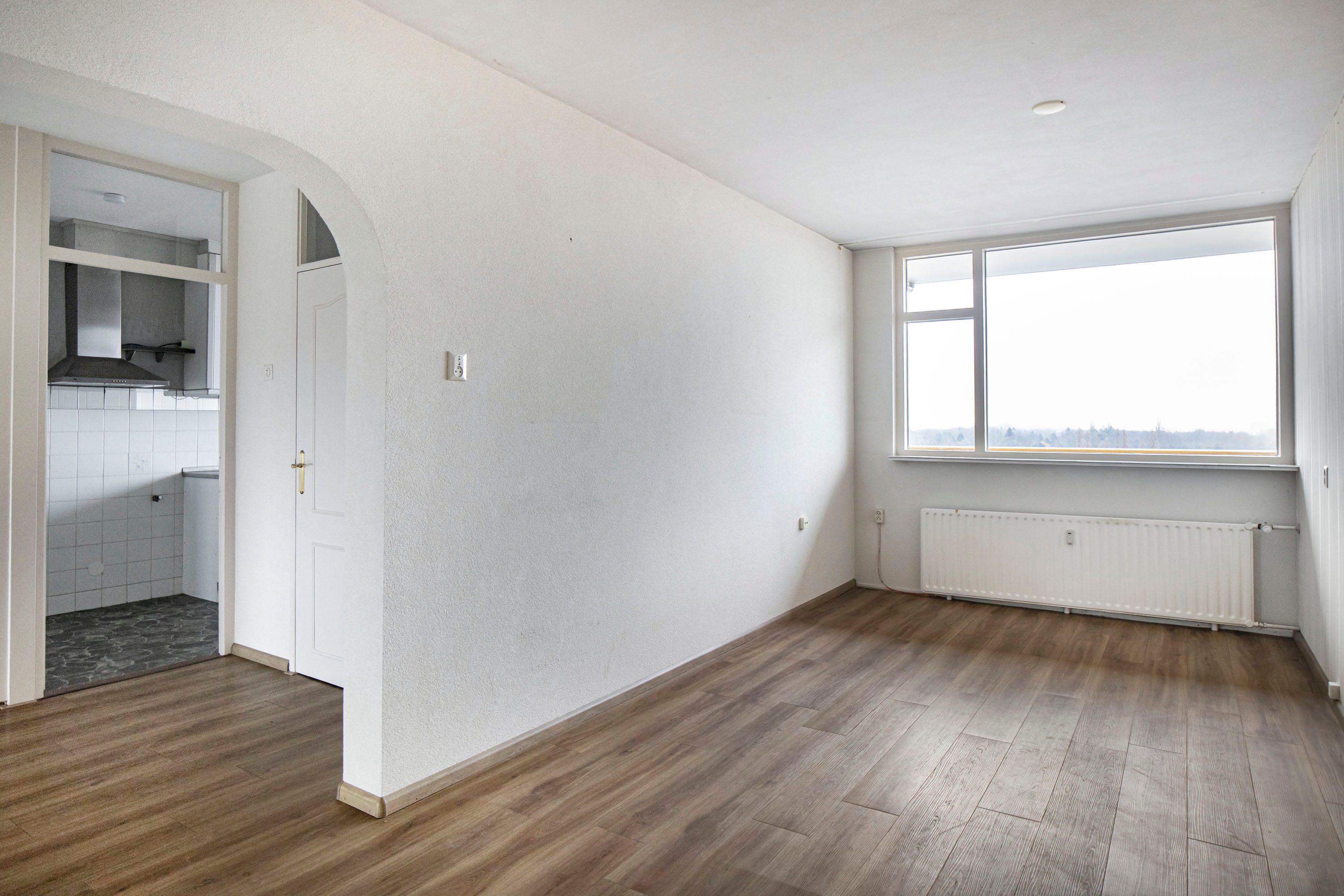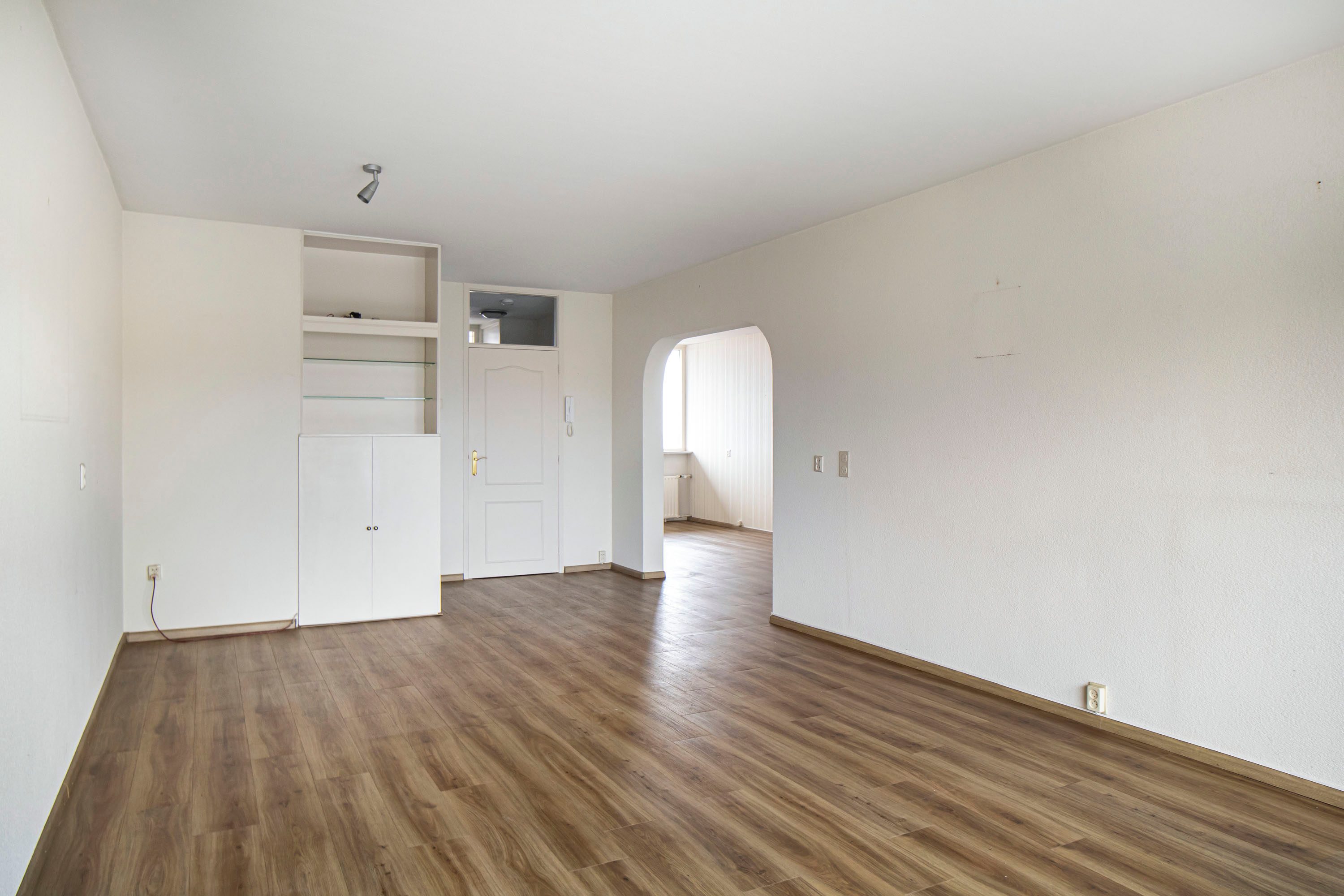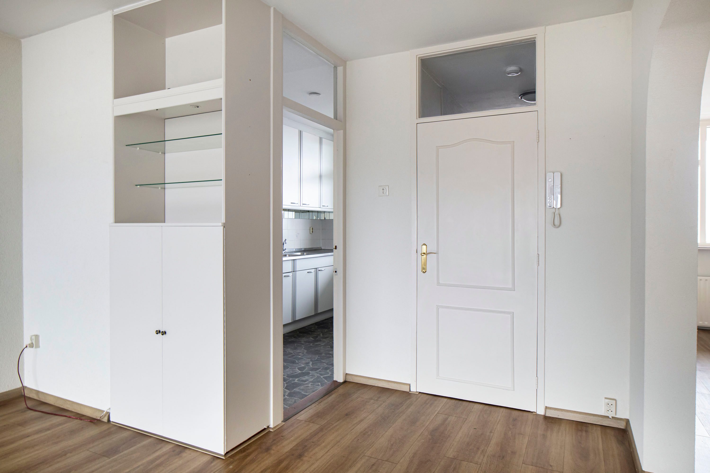 Via de entree kom je binnen in de hal met de meterkast en een vaste kastenwand. Vanuit hier loop je door naar de ruime woonkamer, waar je direct het vrije uitzicht en de prettige lichtinval ervaart. De woonkamer geeft toegang tot het balkon, gelegen op het zuidwesten, een heerlijke plek waar je een groot deel van de dag van de zon kunt genieten. Daarnaast is er in de woonkamer een vaste inbouwkast, handig voor extra bergruimte.