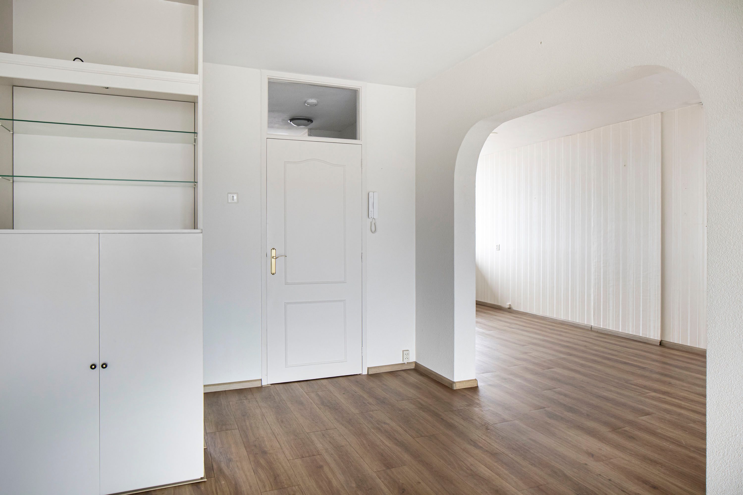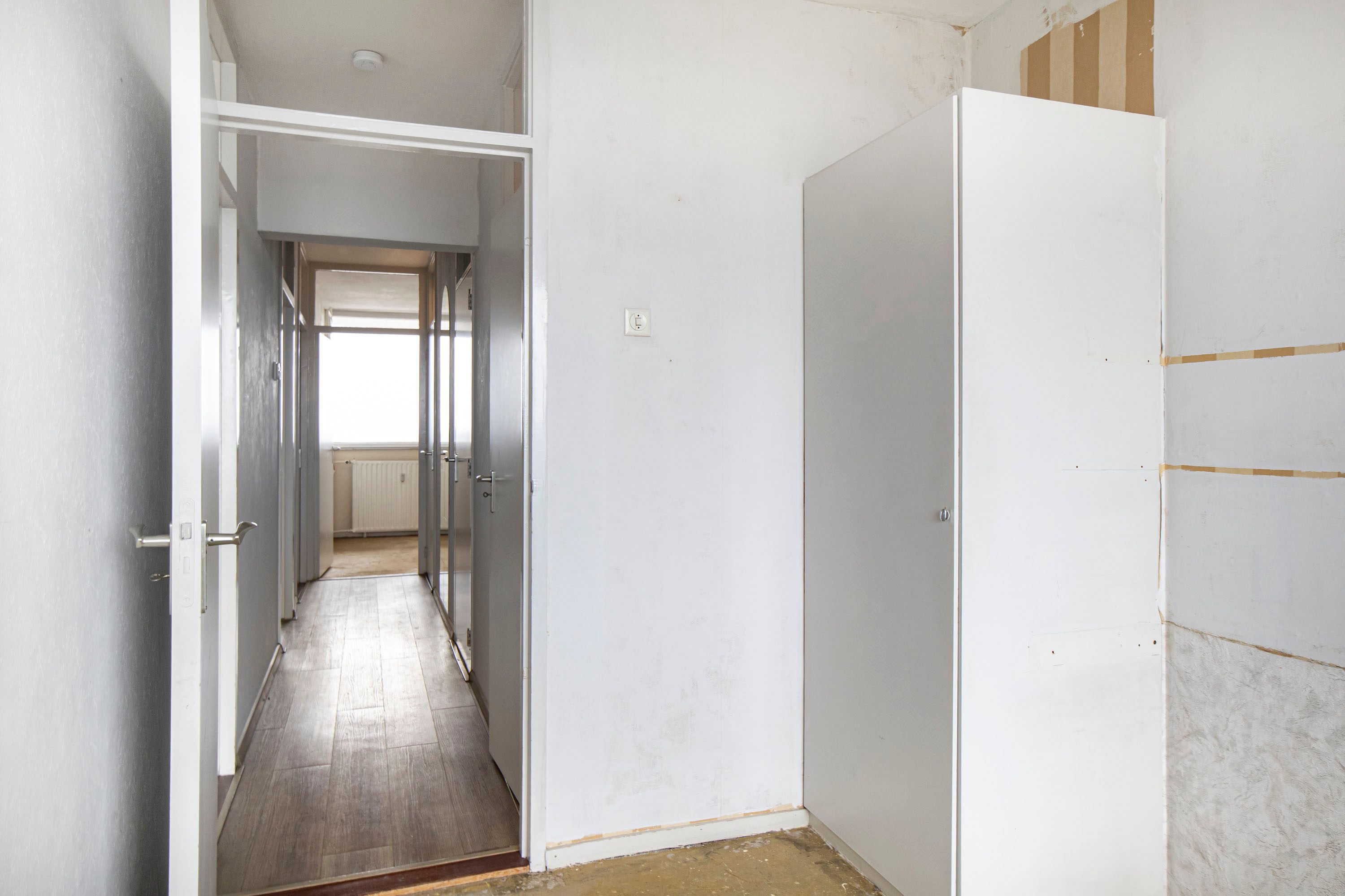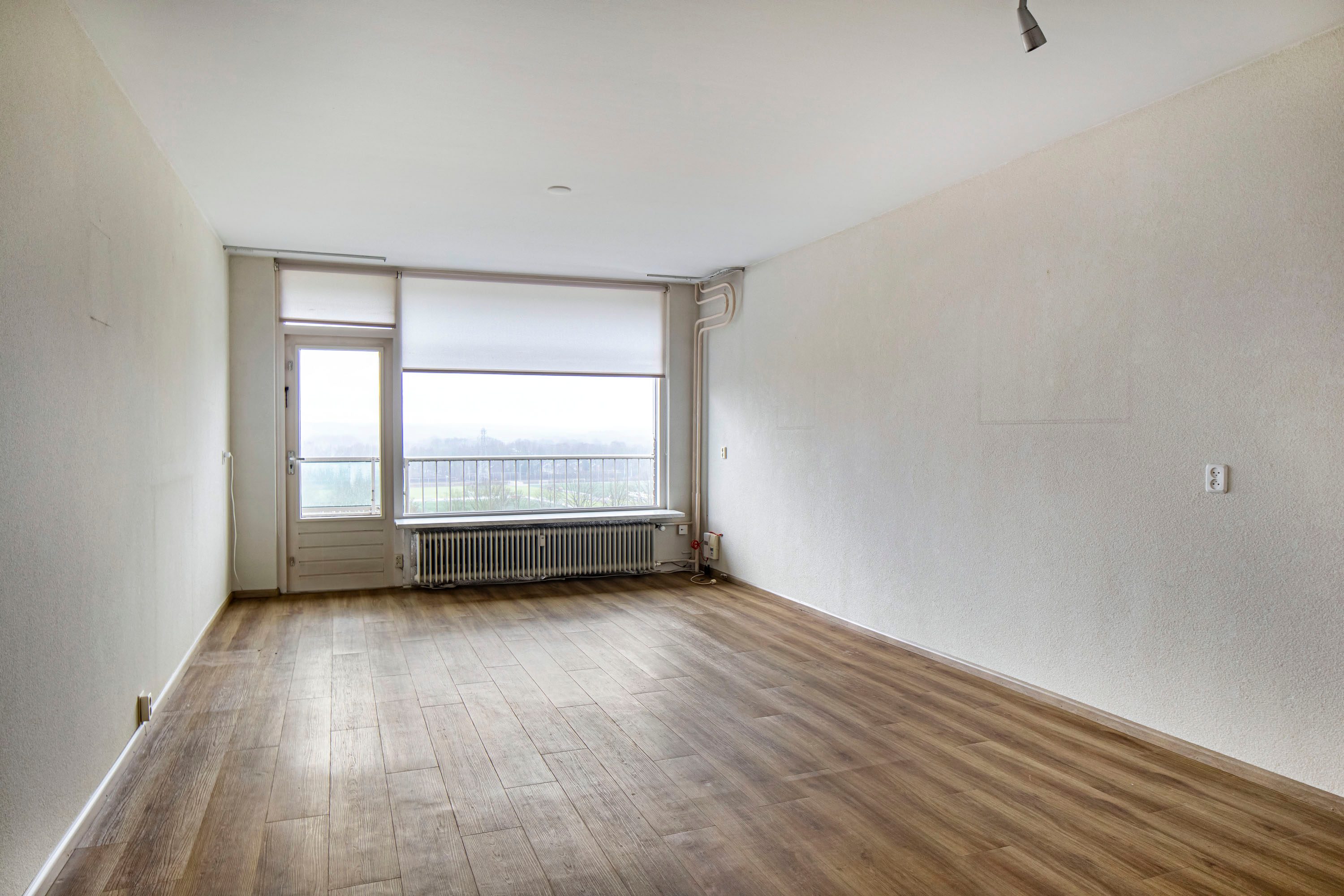 Via de entree kom je binnen in de hal met de meterkast en een vaste kastenwand. Vanuit hier loop je door naar de ruime woonkamer, waar je direct het vrije uitzicht en de prettige lichtinval ervaart. De woonkamer geeft toegang tot het balkon, gelegen op het zuidwesten, een heerlijke plek waar je een groot deel van de dag van de zon kunt genieten. Daarnaast is er in de woonkamer een vaste inbouwkast, handig voor extra bergruimte.