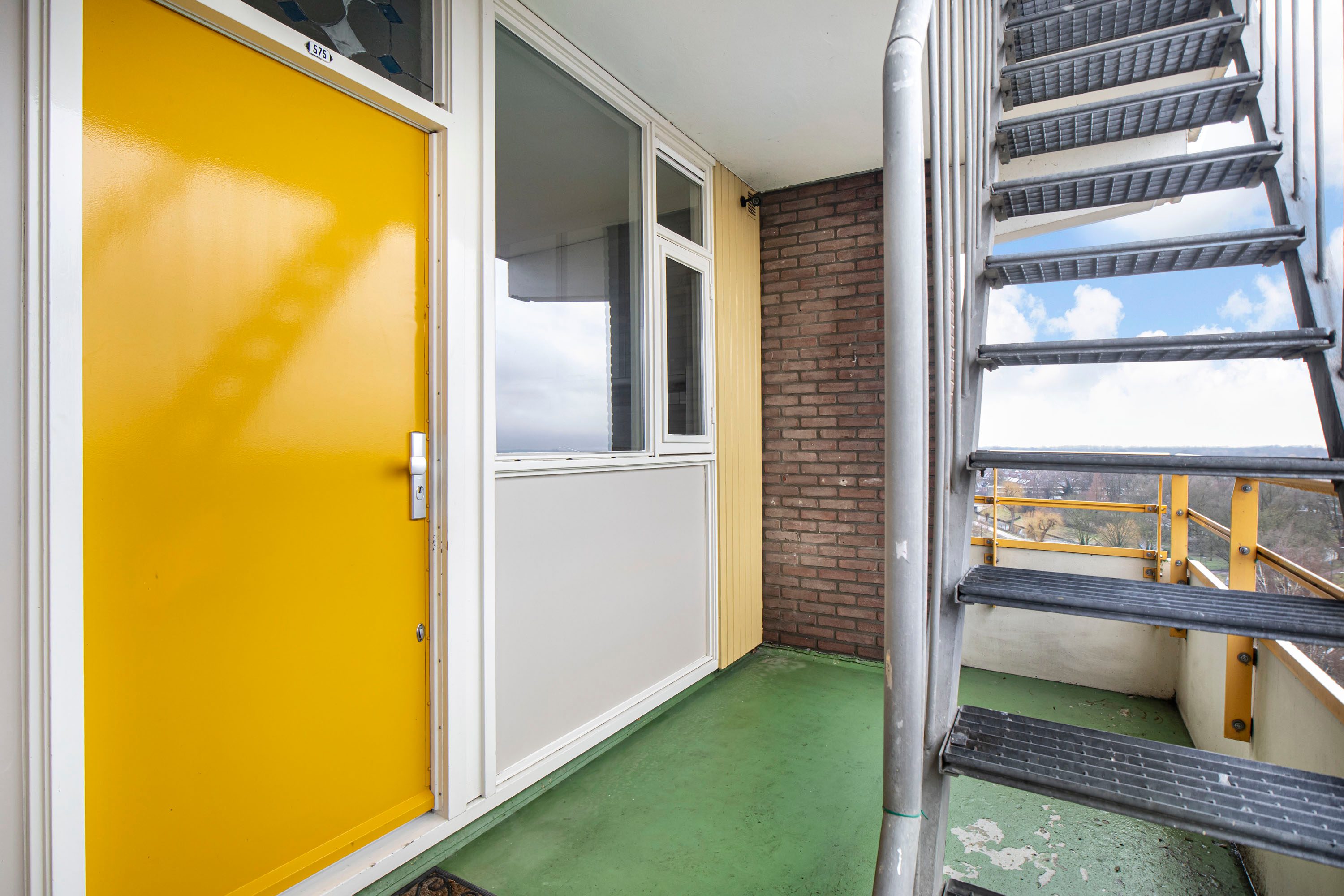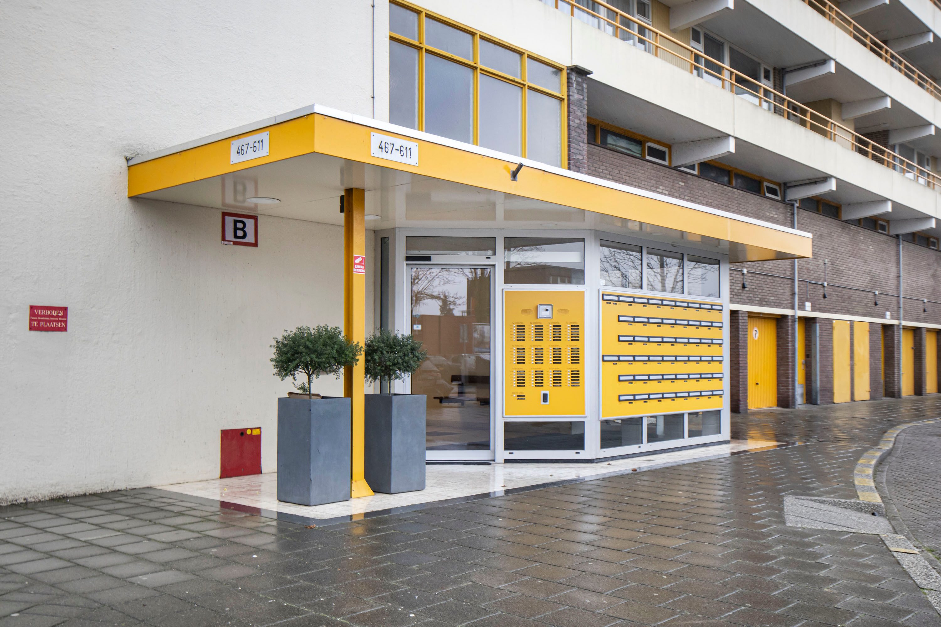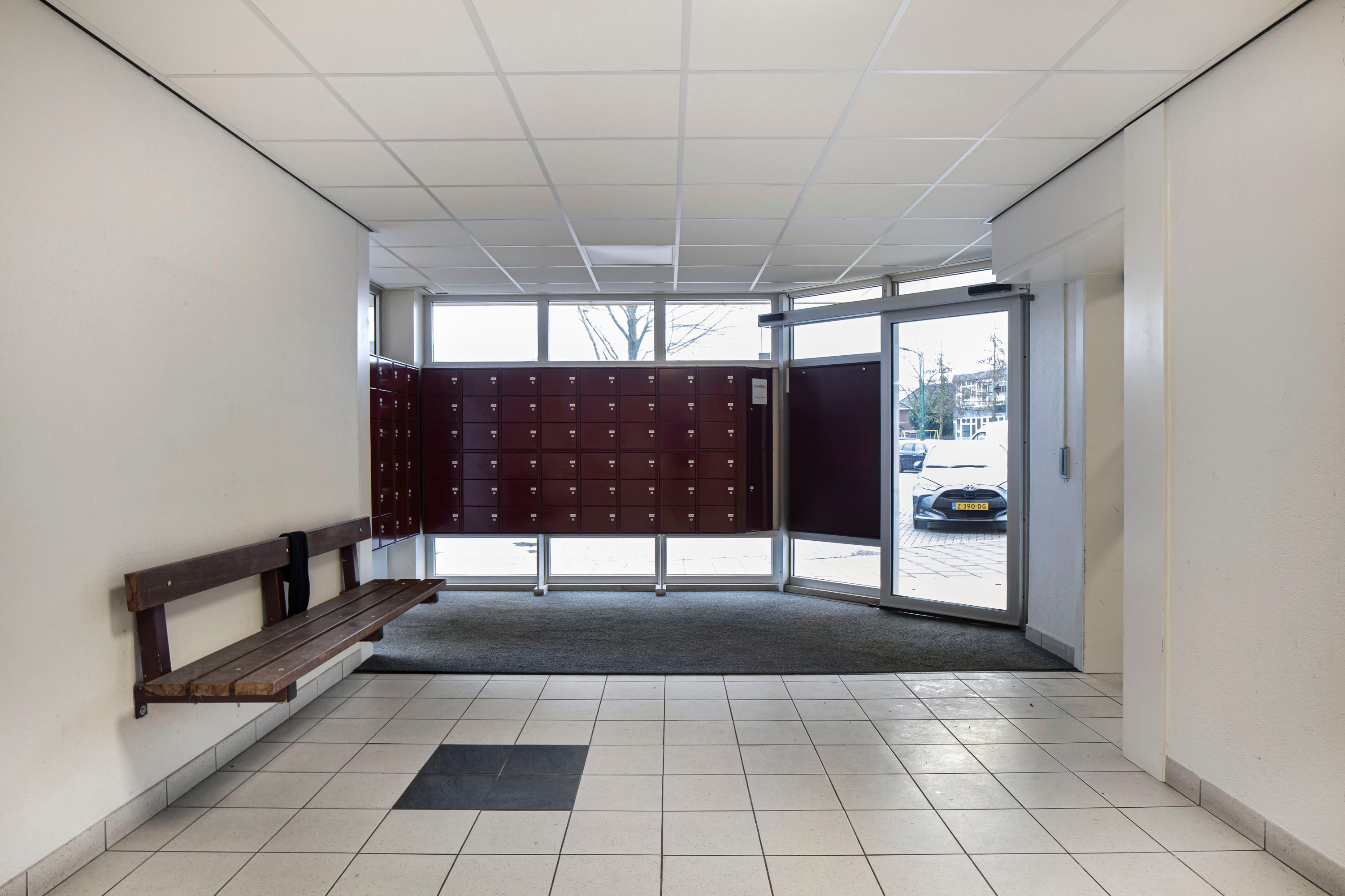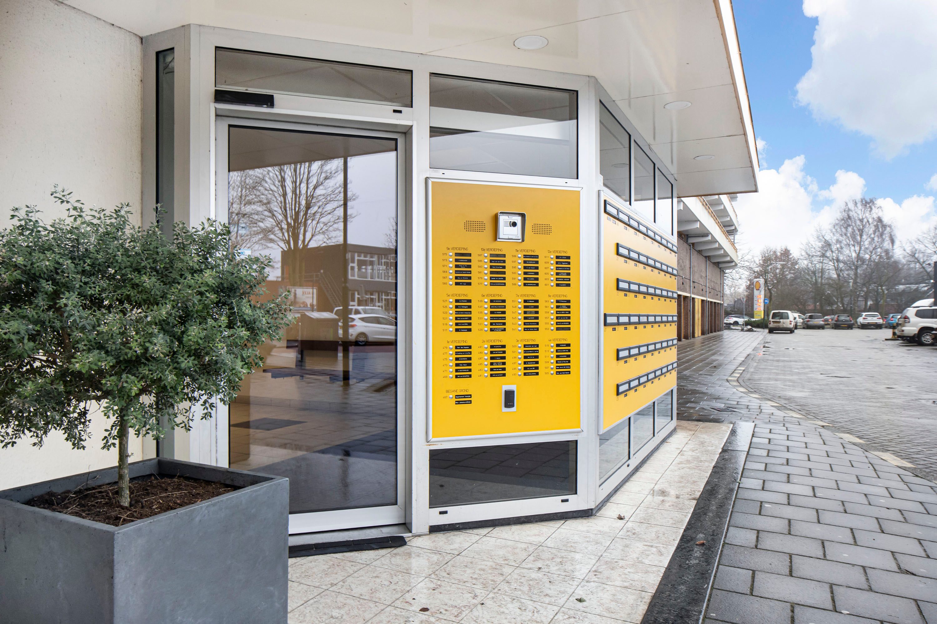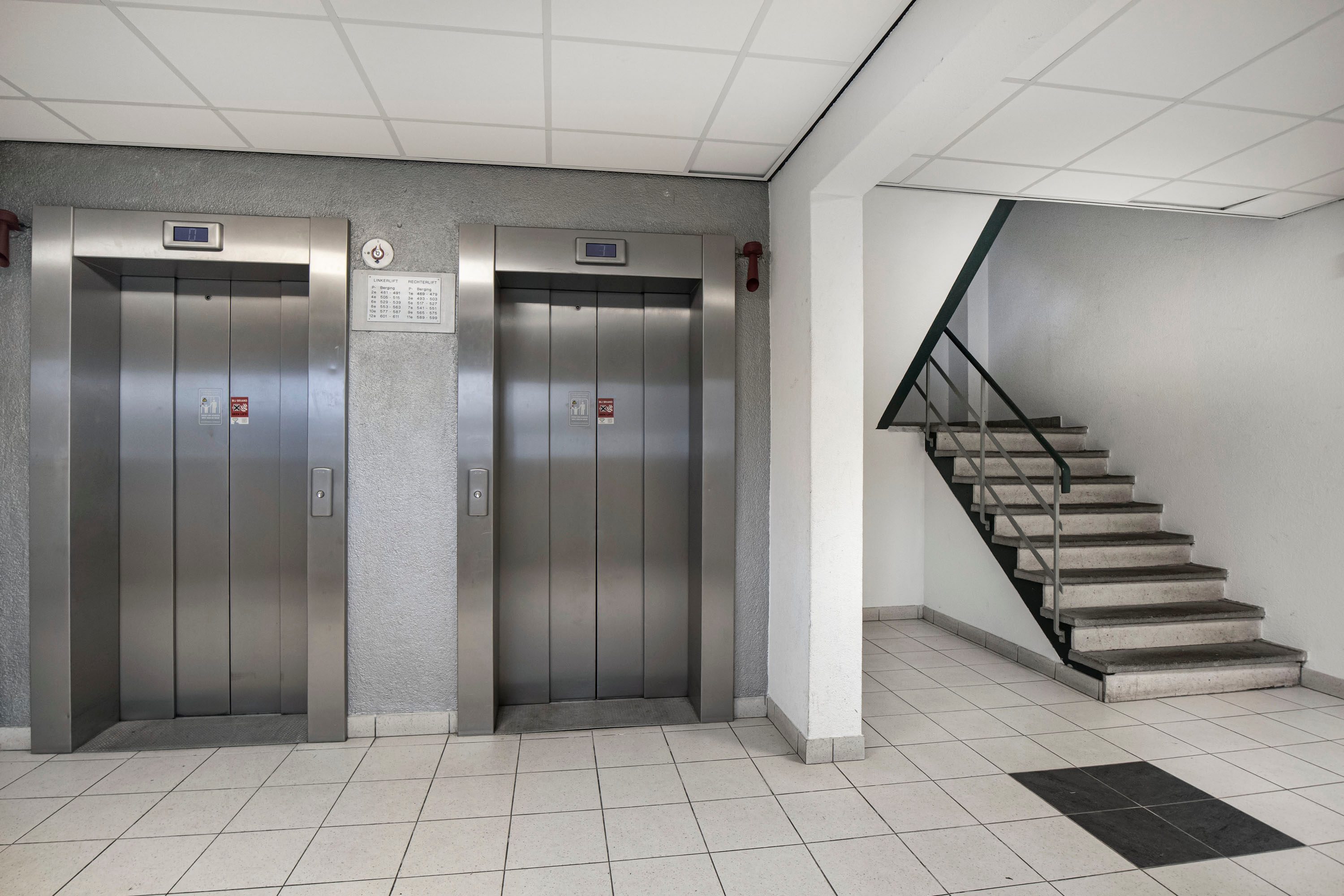 Beneden vind je het bellentableau en de brievenbussen. Zodra je binnen bent, kun je via de trap of de lift naar de 9e verdieping gaan.