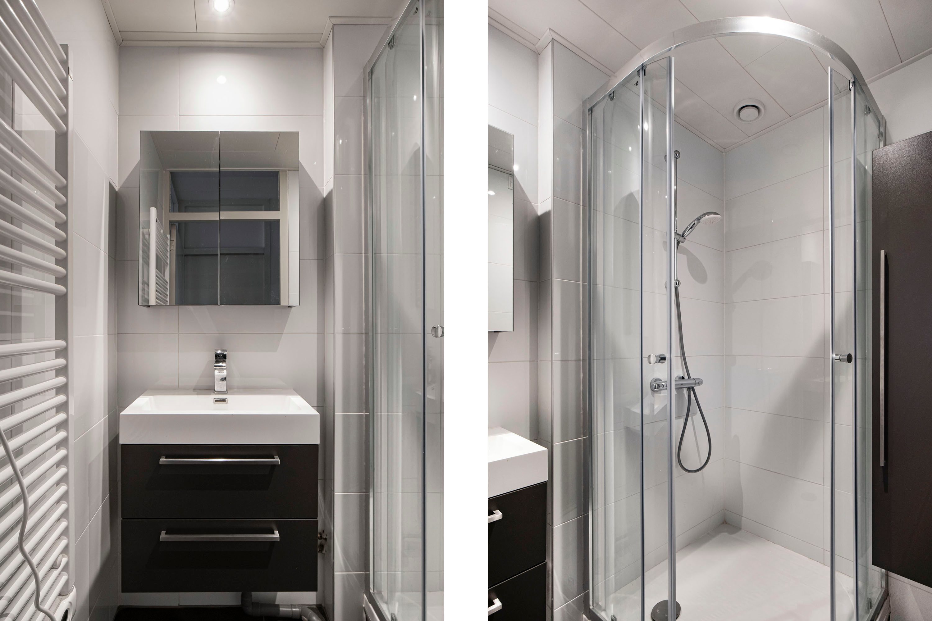 Het toilet is separaat van de badkamer. De badkamer verkeert in goede staat, is recent vernieuwd en uitgerust met een douche, een wastafel met meubel, een designradiator en een kolomkast voor extra opbergruimte.