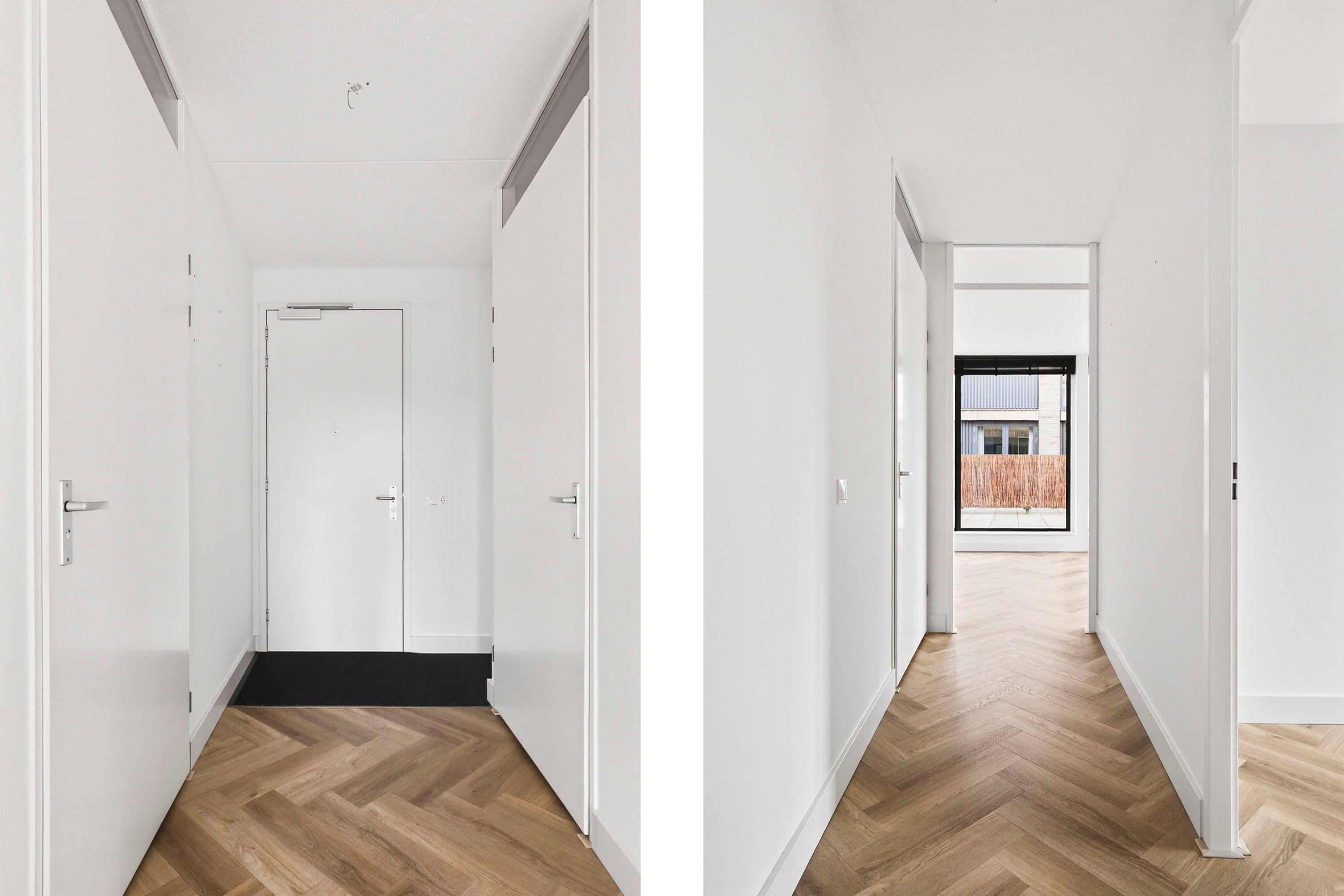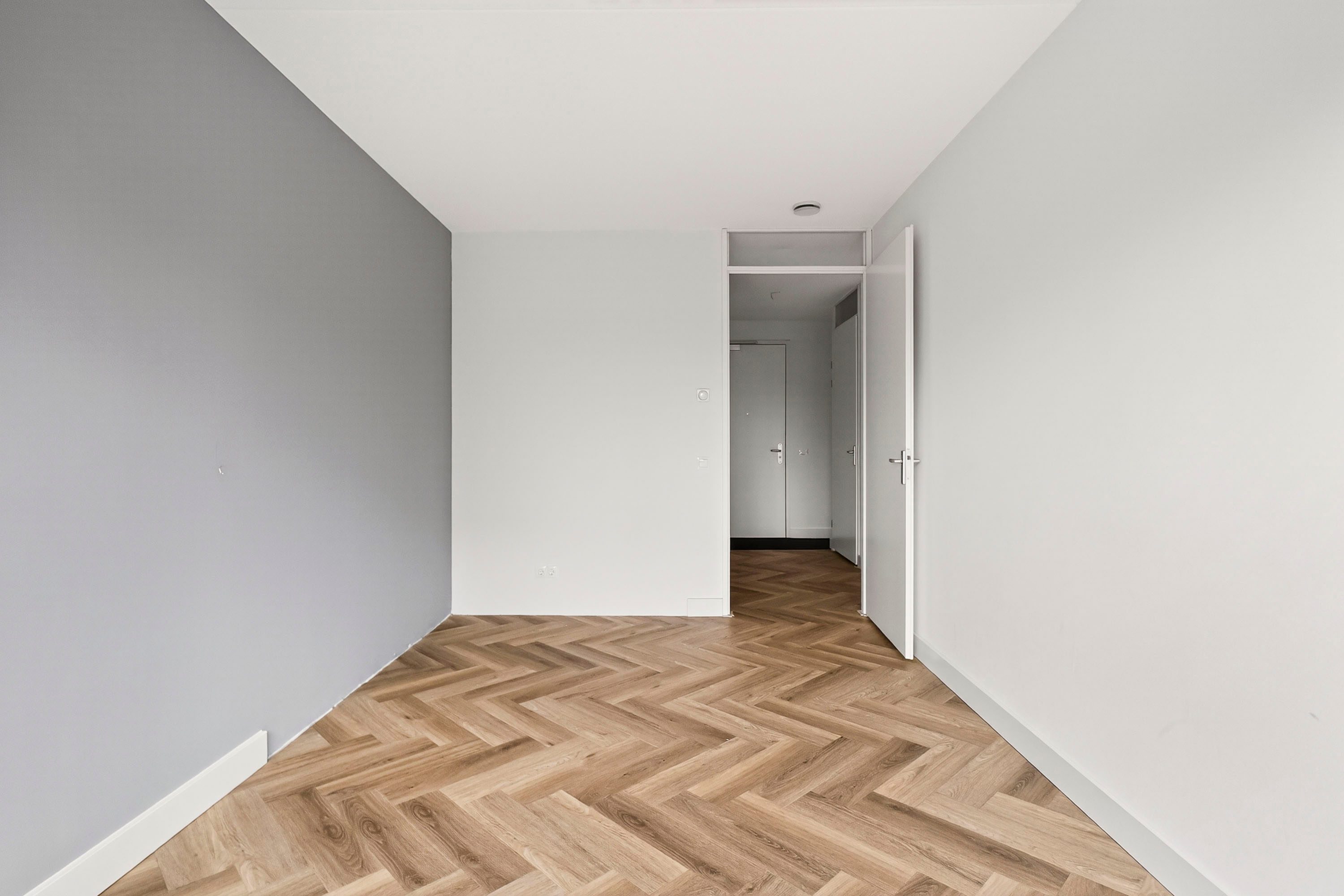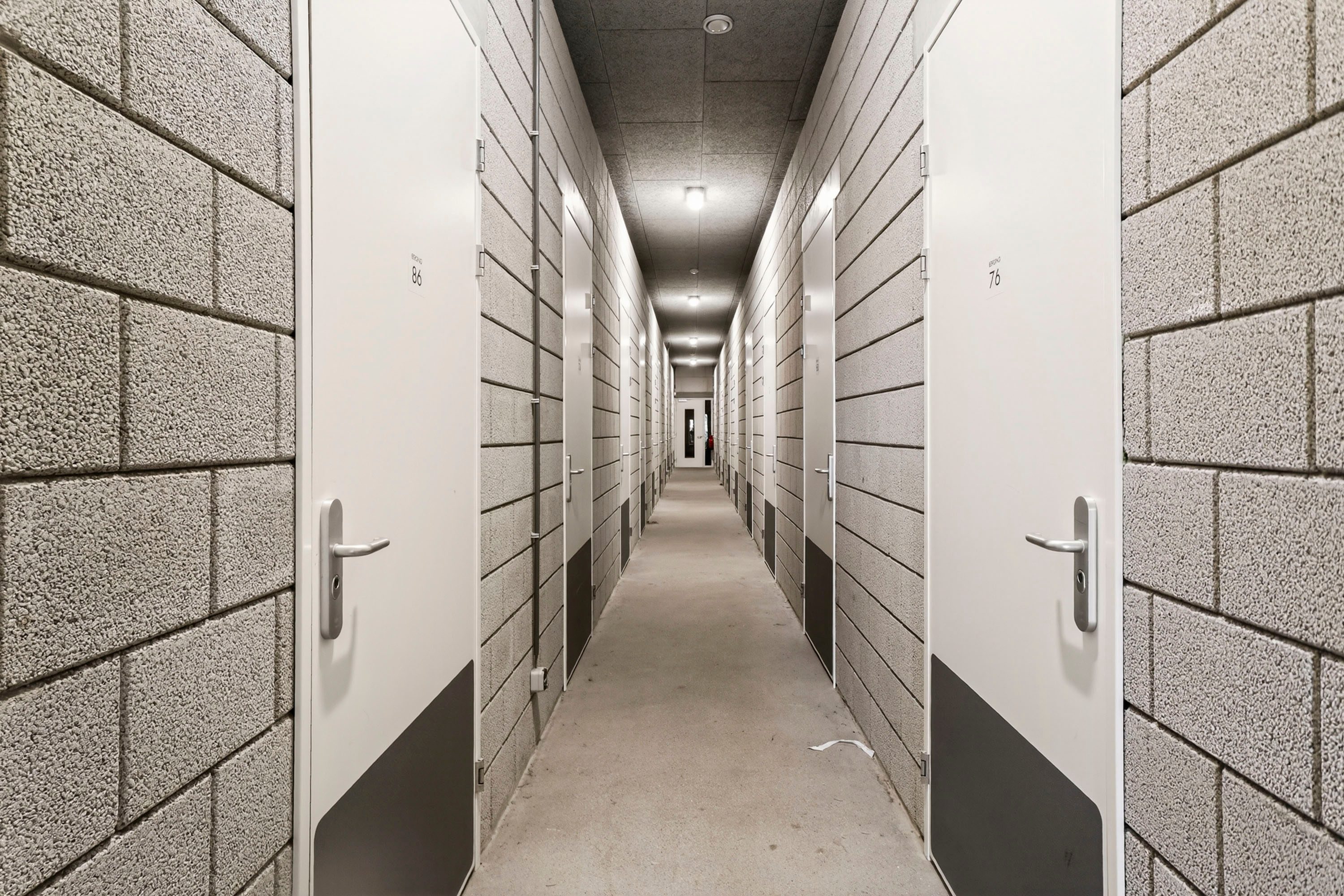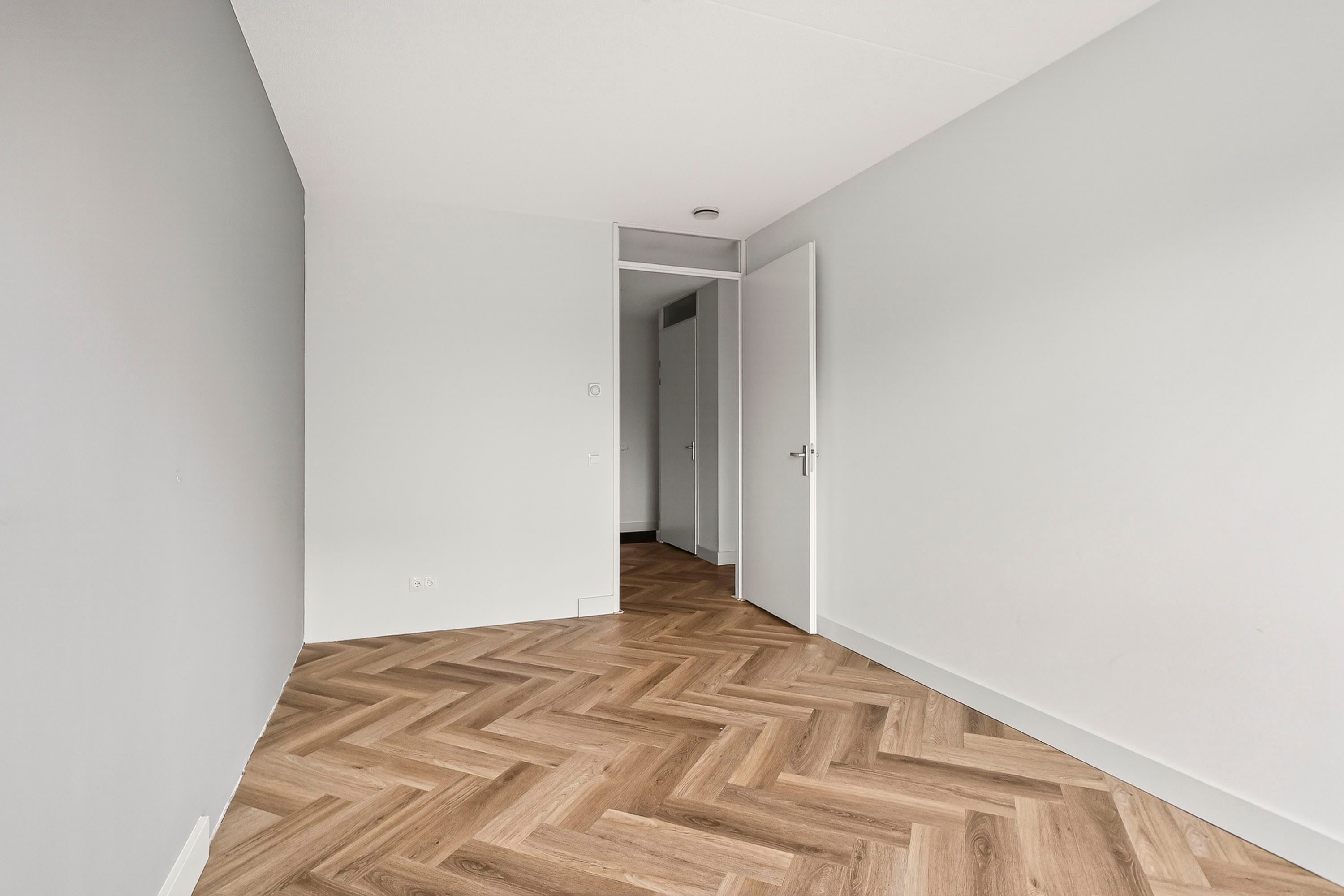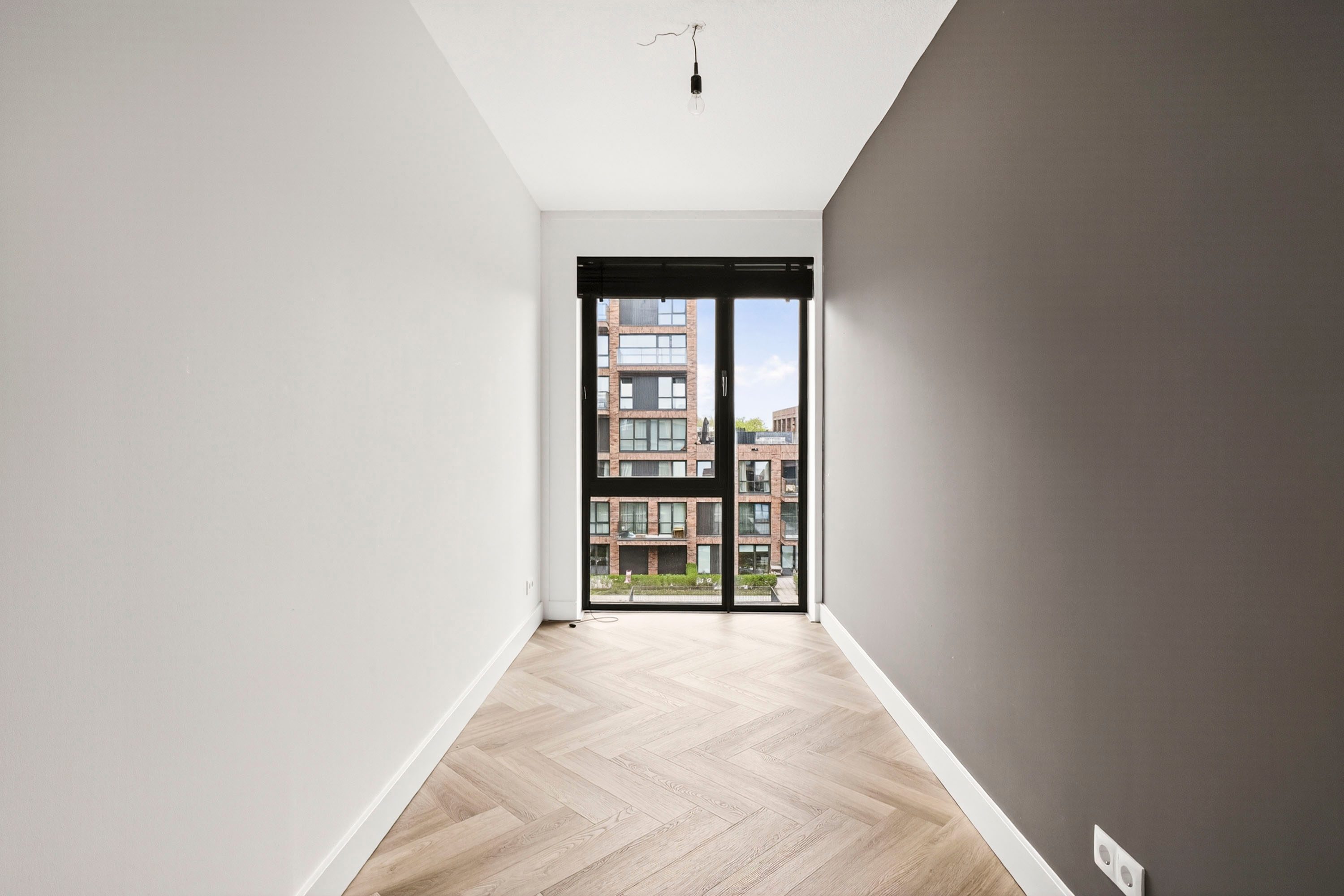 De twee slaapkamers hebben een fijne afmeting en zijn voorzien van voldoende daglicht. De badkamer is opgesteld in een lichte kleurstelling en is voorzien van een ruime inloopdouche, wastafel en wasmachine-aansluiting. Tegenover de badkamer bevindt zich de technische ruimte waar de warmtepomp staat opgesteld.