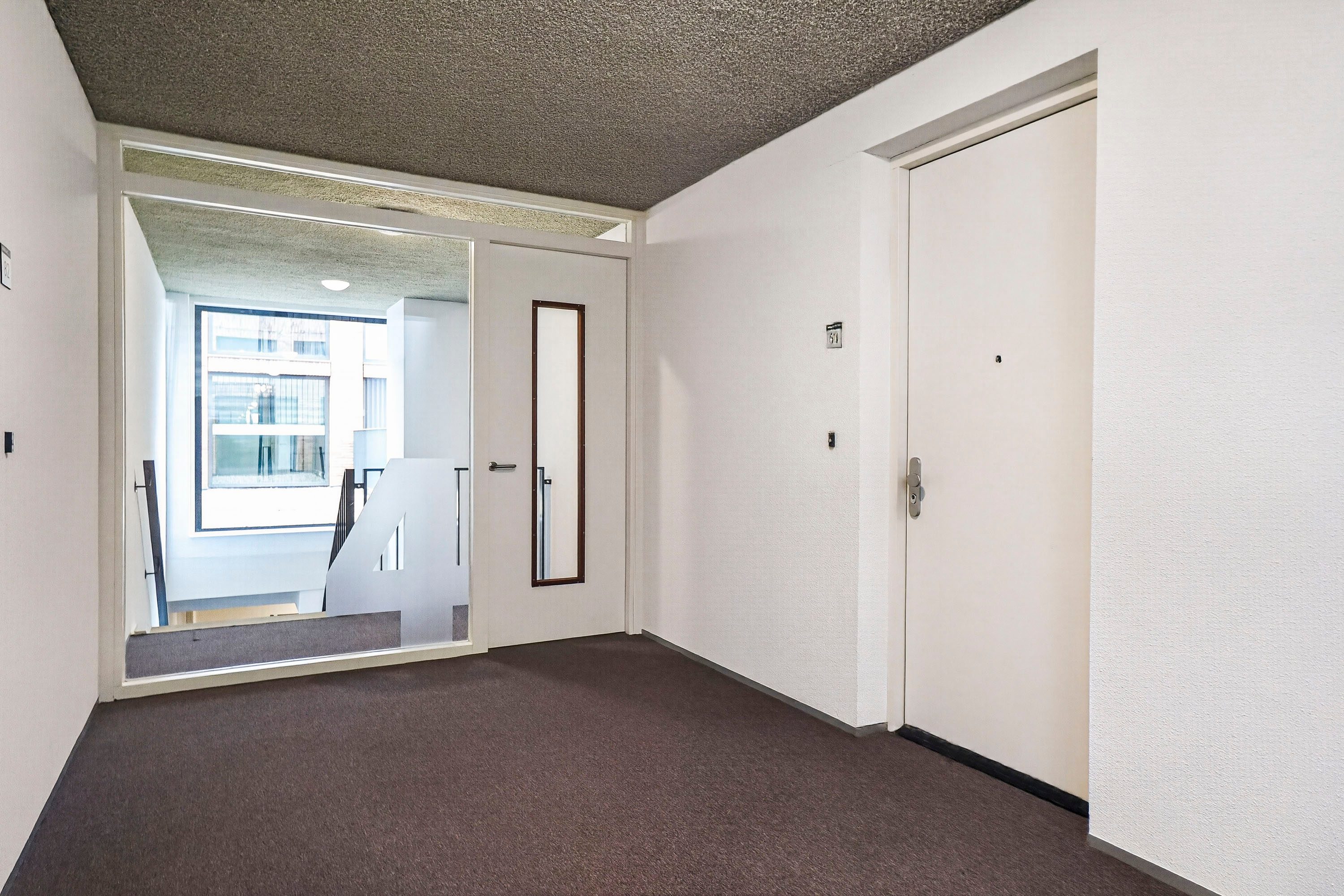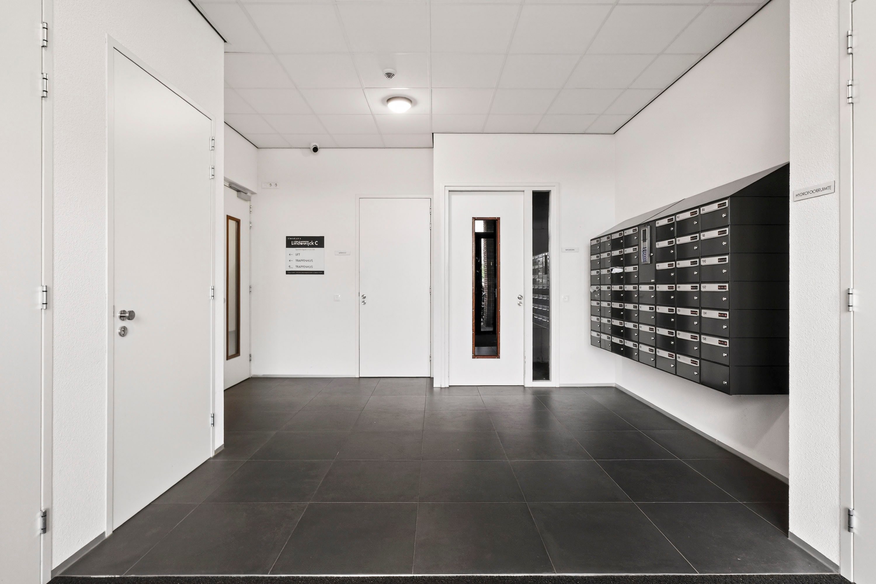 Via de centrale hal met entree, brievenbussen en bellentableau krijg je toegang tot de lift en het trappenhuis richting het appartement.