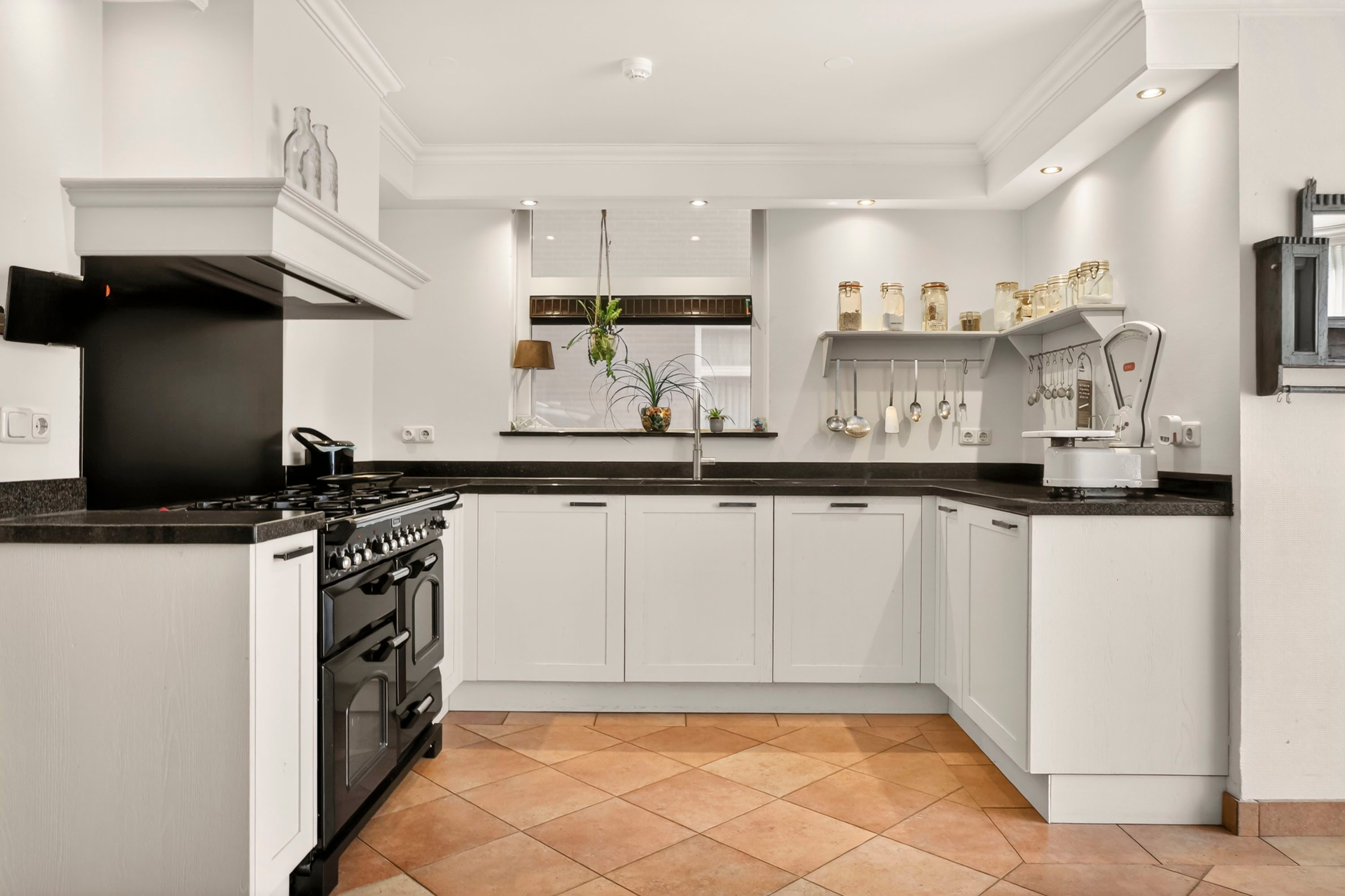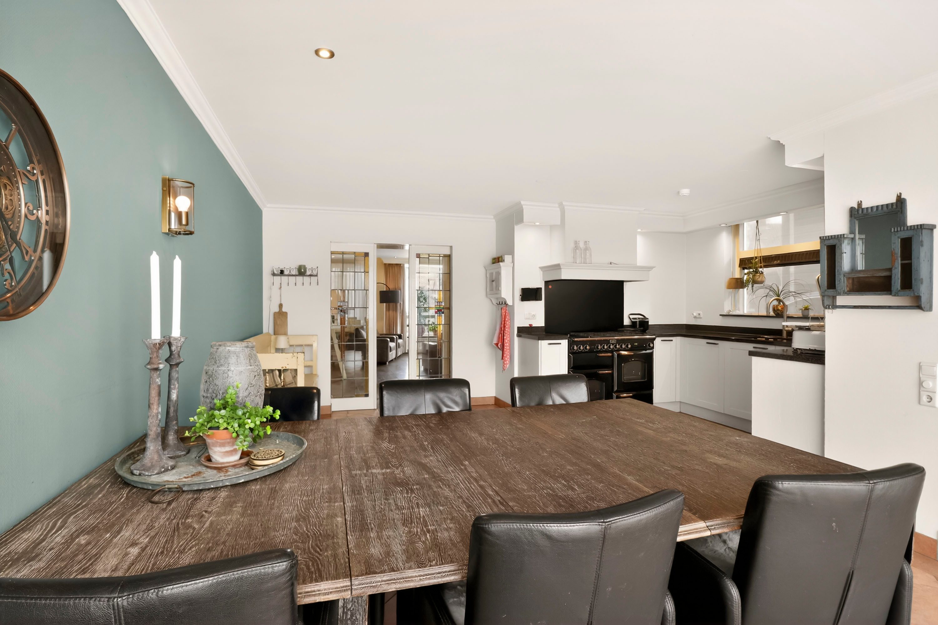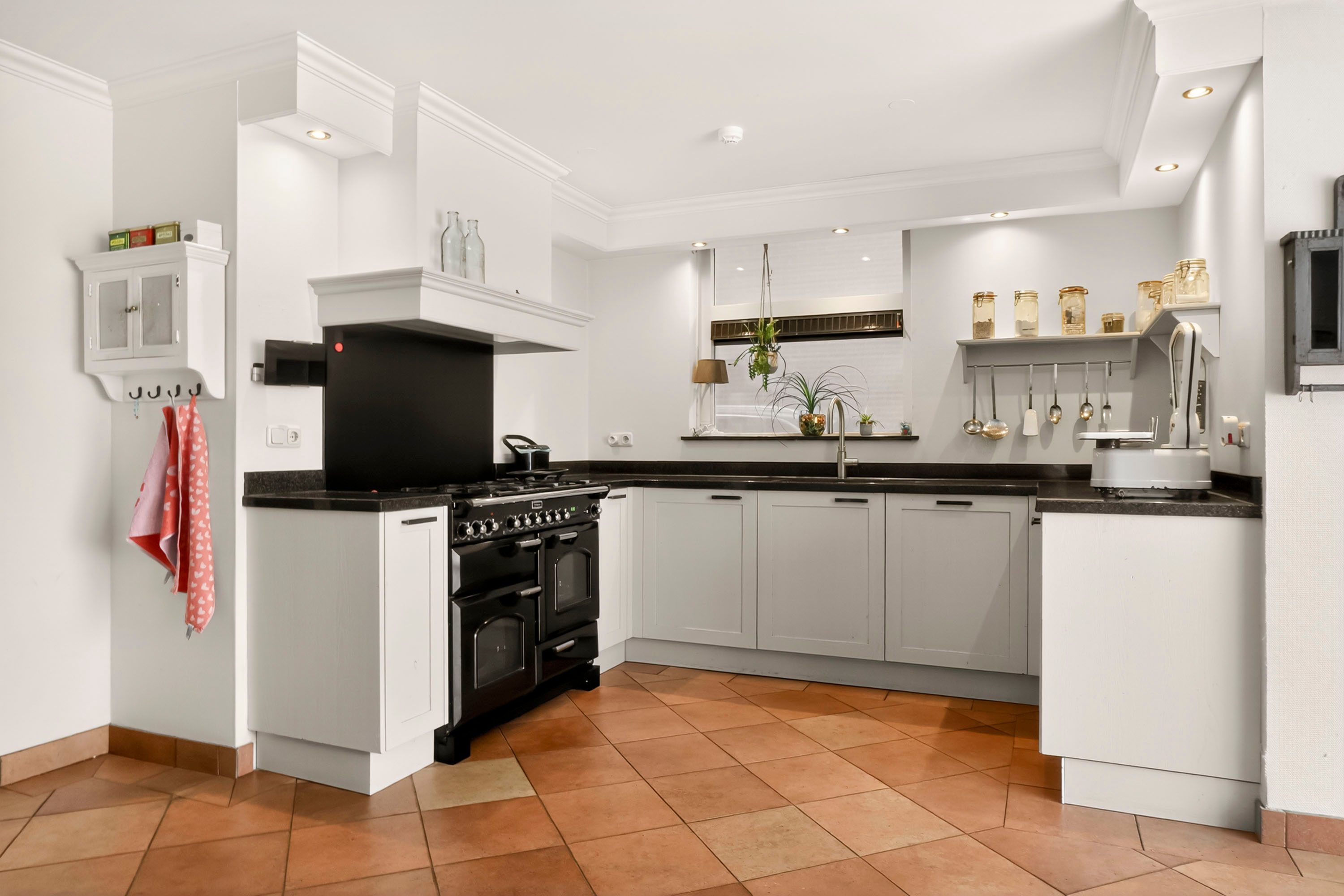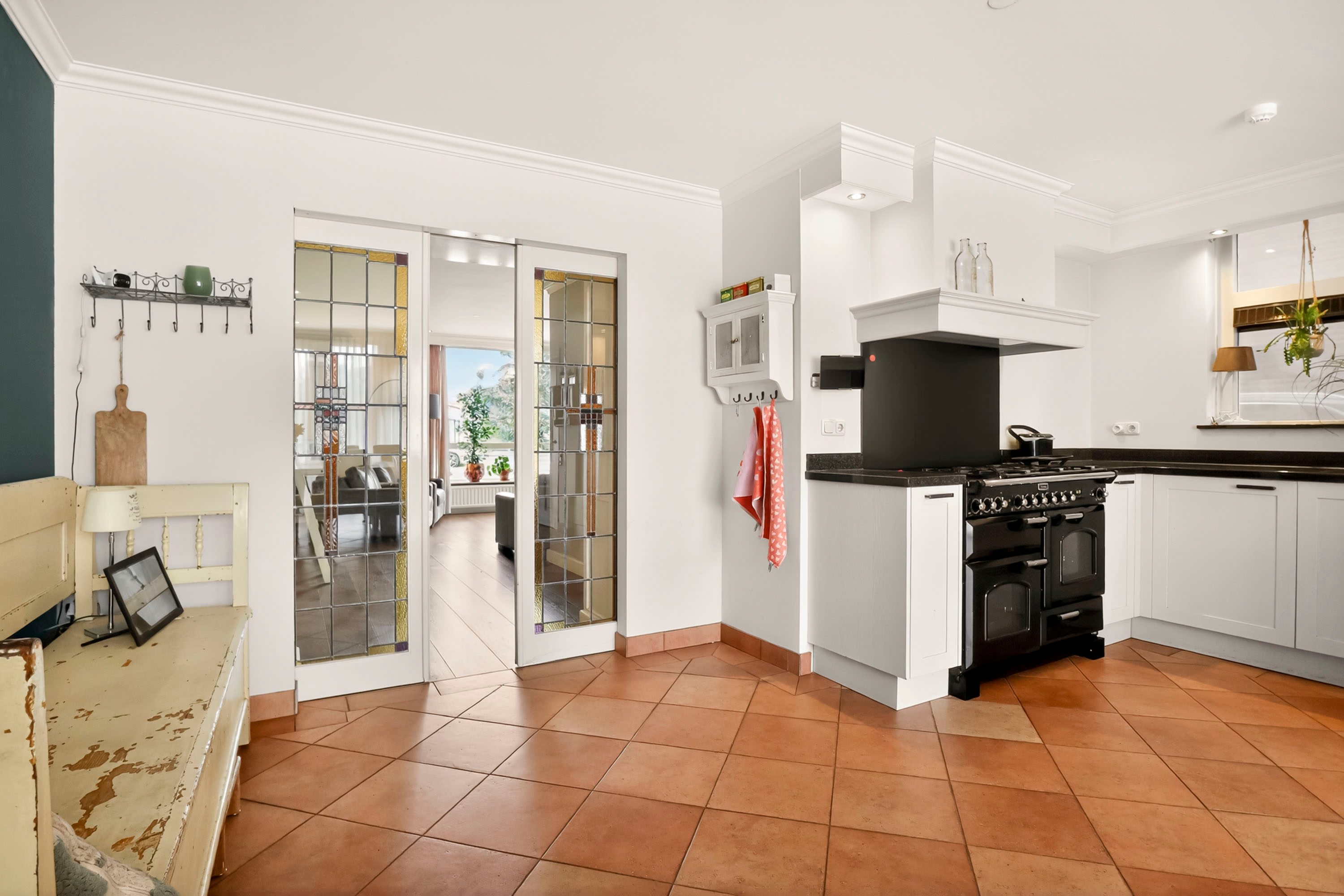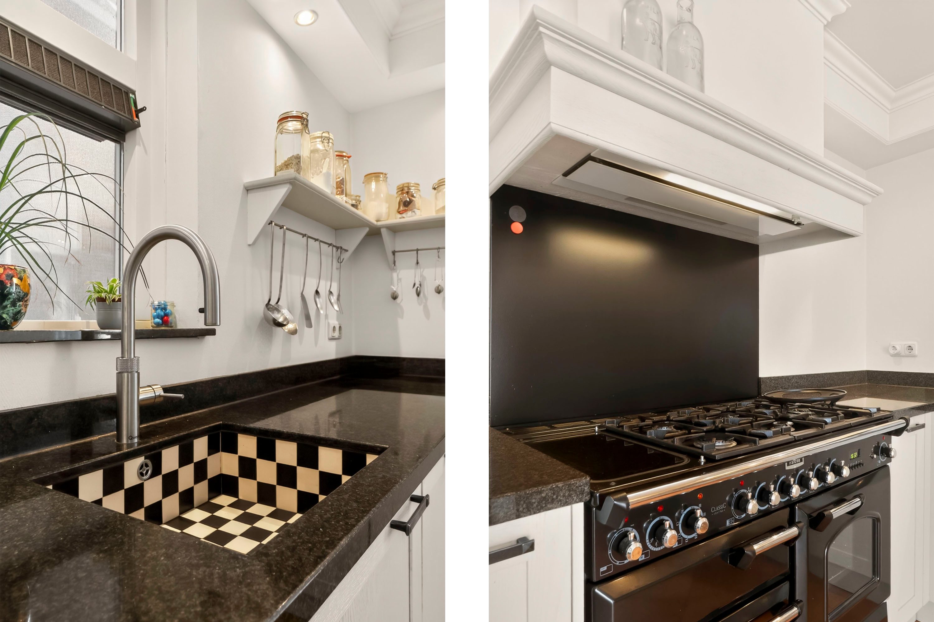Door de ruime oprit kom je bij de entree. Je komt binnen in een lichte hal met de meterkast en trapopgang. De woonkamer aan de voorzijde straalt karakter uit dankzij de authentieke en-suite deuren. De straatgerichte zithoek is voorzien van een sfeer haard op gas en airconditioning voor de warme zomerdagen. Via de en-suite deuren bereik je de riante woonkeuken aan de achterzijde. Dit is de plek waar geleefd wordt. De robuuste inbouwkeuken is een droom voor elke kookliefhebber, uitgerust met een groot fornuis voorzien van vijf gaspitten, twee ovens, grill en een bakplaat. Uiteraard zijn ook een vaatwasser, koelkast en afzuigkap aanwezig. Door de uitbouw op de begane grond is er volop ruimte voor een grote eettafel.
