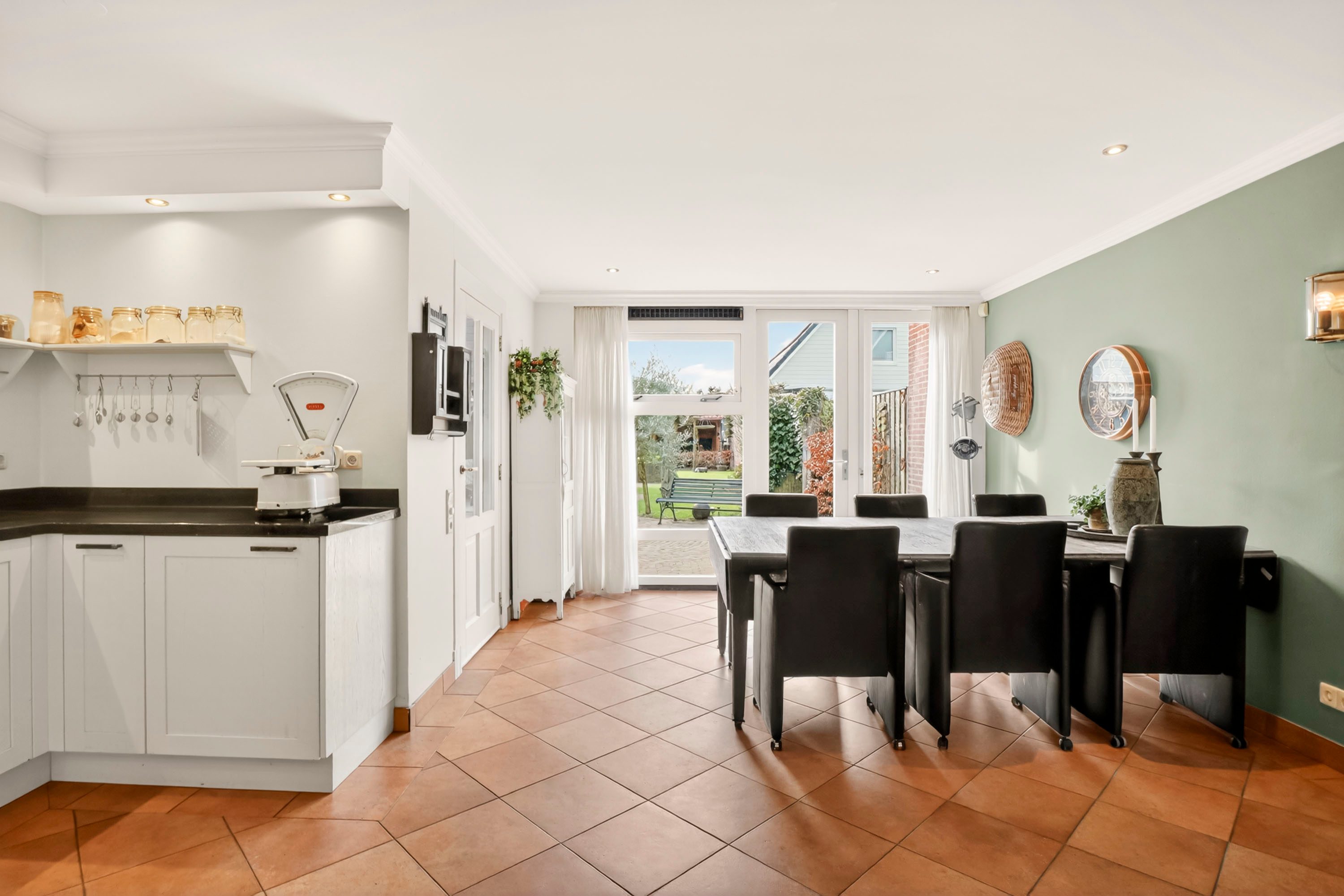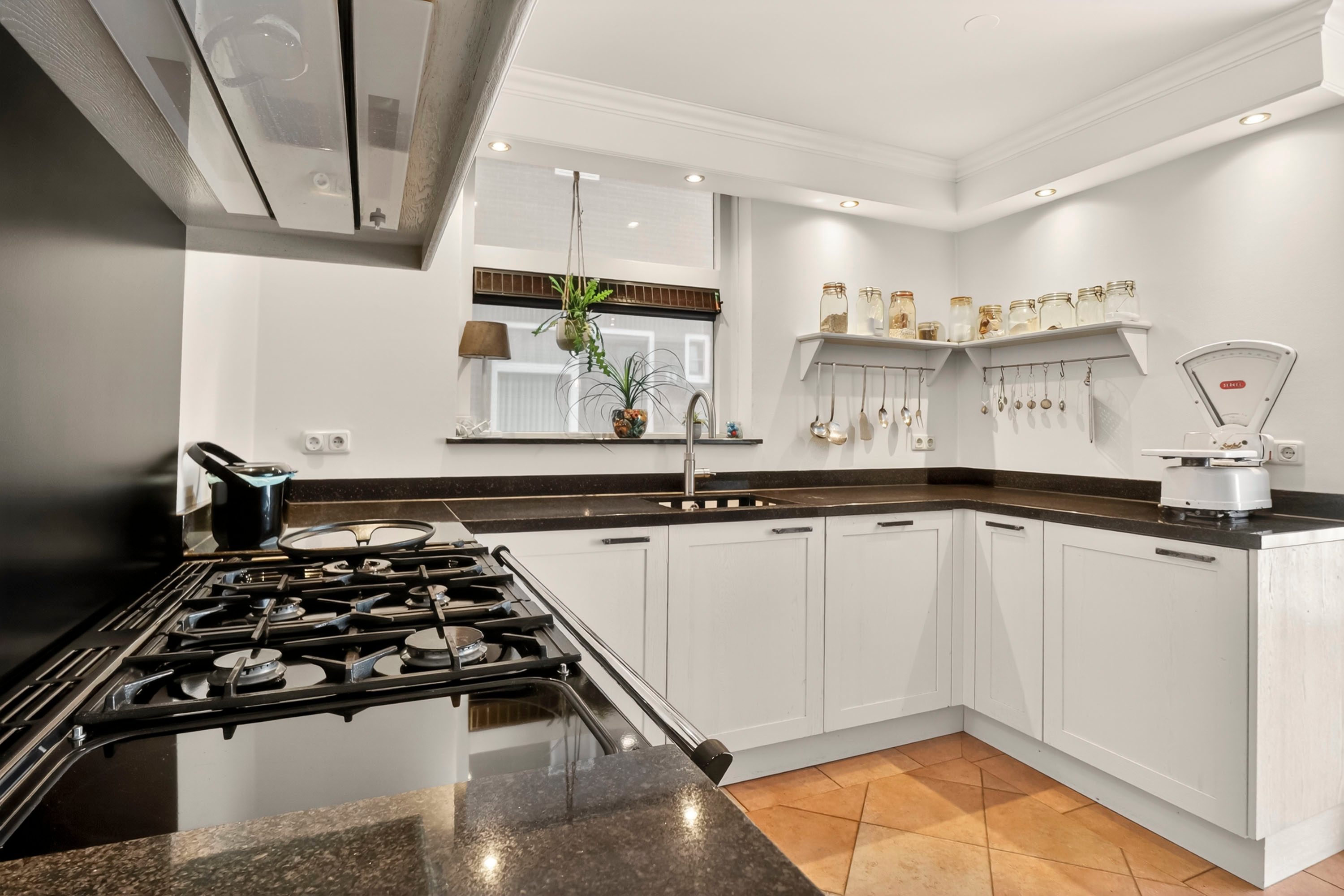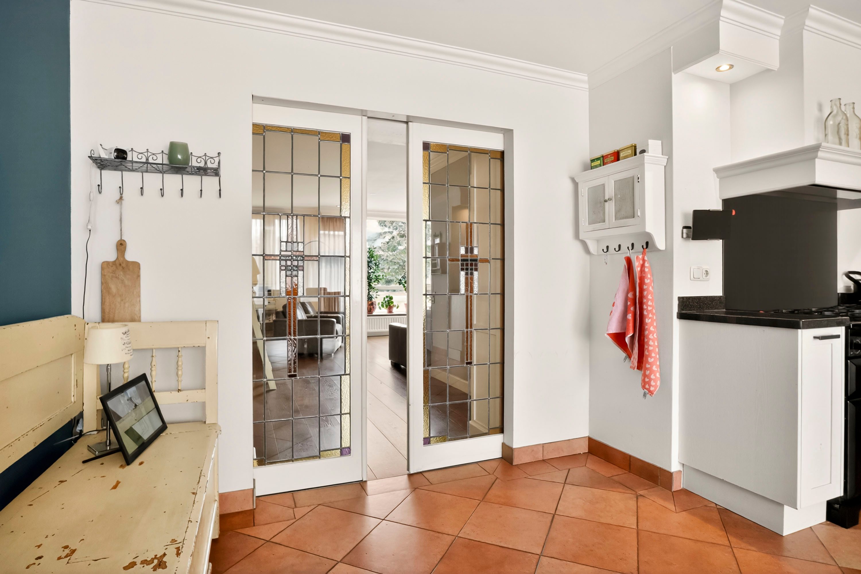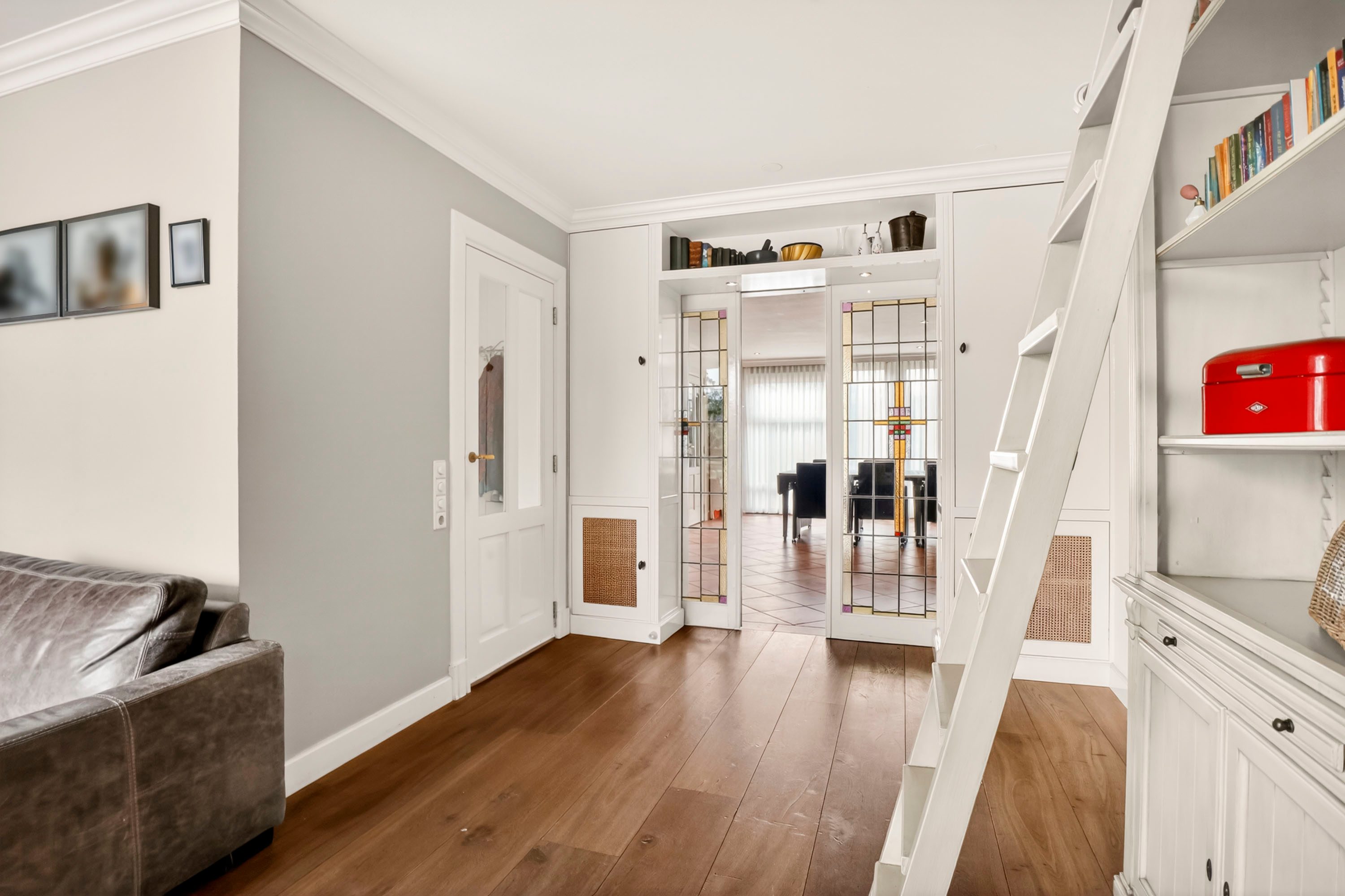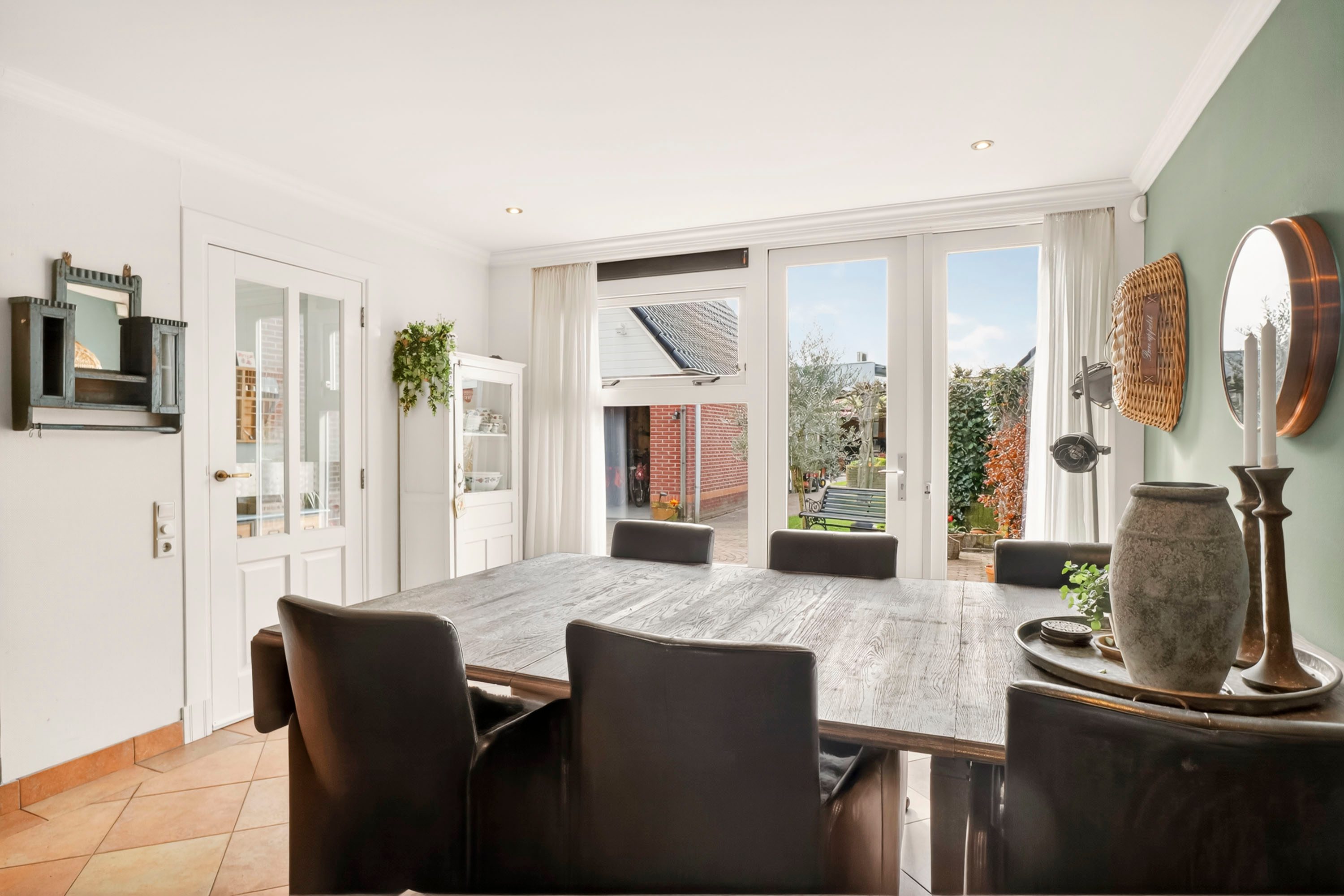 Door de ruime oprit kom je bij de entree. Je komt binnen in een lichte hal met de meterkast en trapopgang. De woonkamer aan de voorzijde straalt karakter uit dankzij de authentieke en-suite deuren. De straatgerichte zithoek is voorzien van een sfeer haard op gas en airconditioning voor de warme zomerdagen. Via de en-suite deuren bereik je de riante woonkeuken aan de achterzijde. Dit is de plek waar geleefd wordt. De robuuste inbouwkeuken is een droom voor elke kookliefhebber, uitgerust met een groot fornuis voorzien van vijf gaspitten, twee ovens, grill en een bakplaat. Uiteraard zijn ook een vaatwasser, koelkast en afzuigkap aanwezig. Door de uitbouw op de begane grond is er volop ruimte voor een grote eettafel.