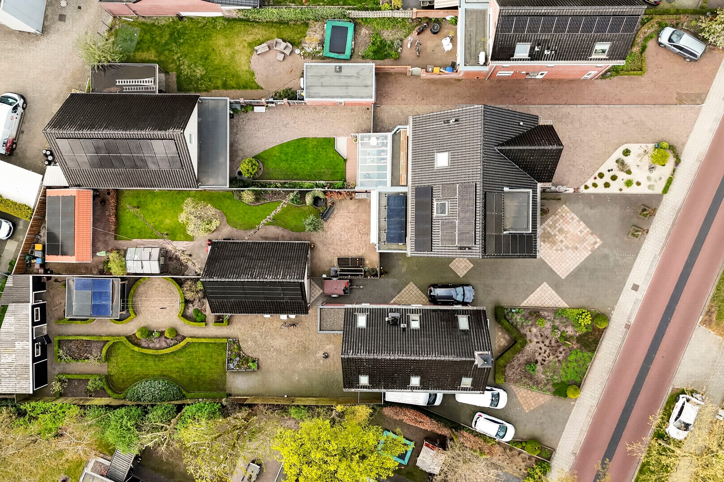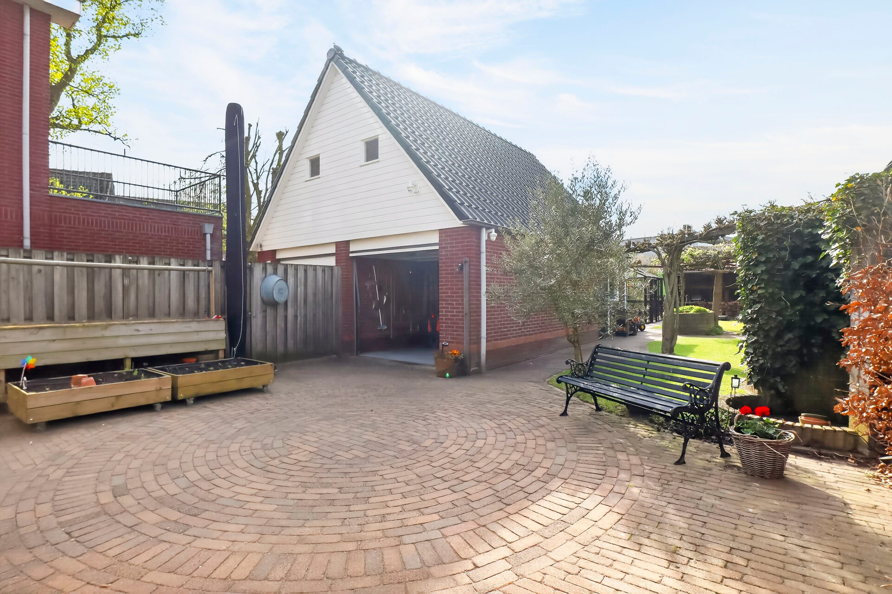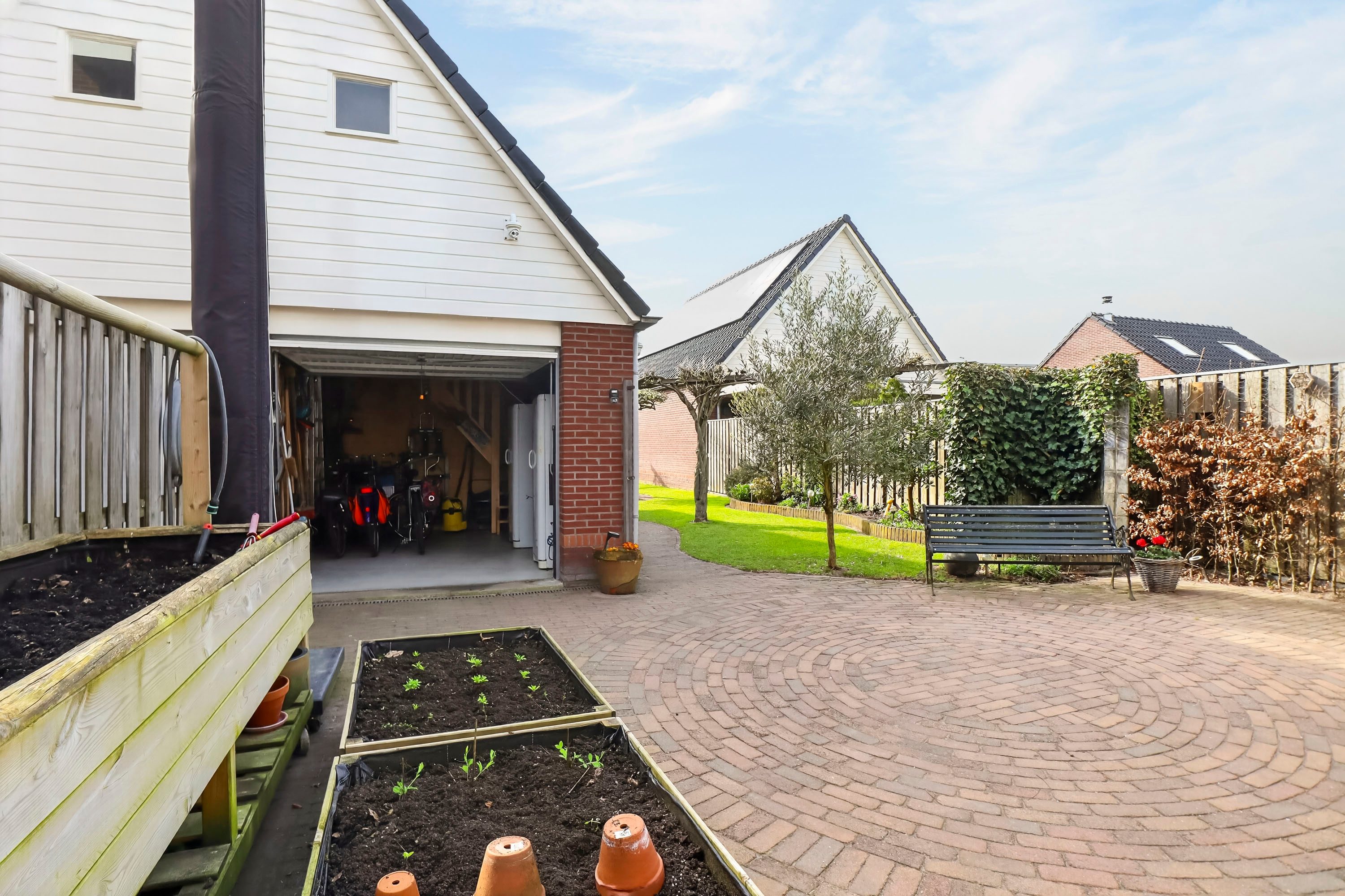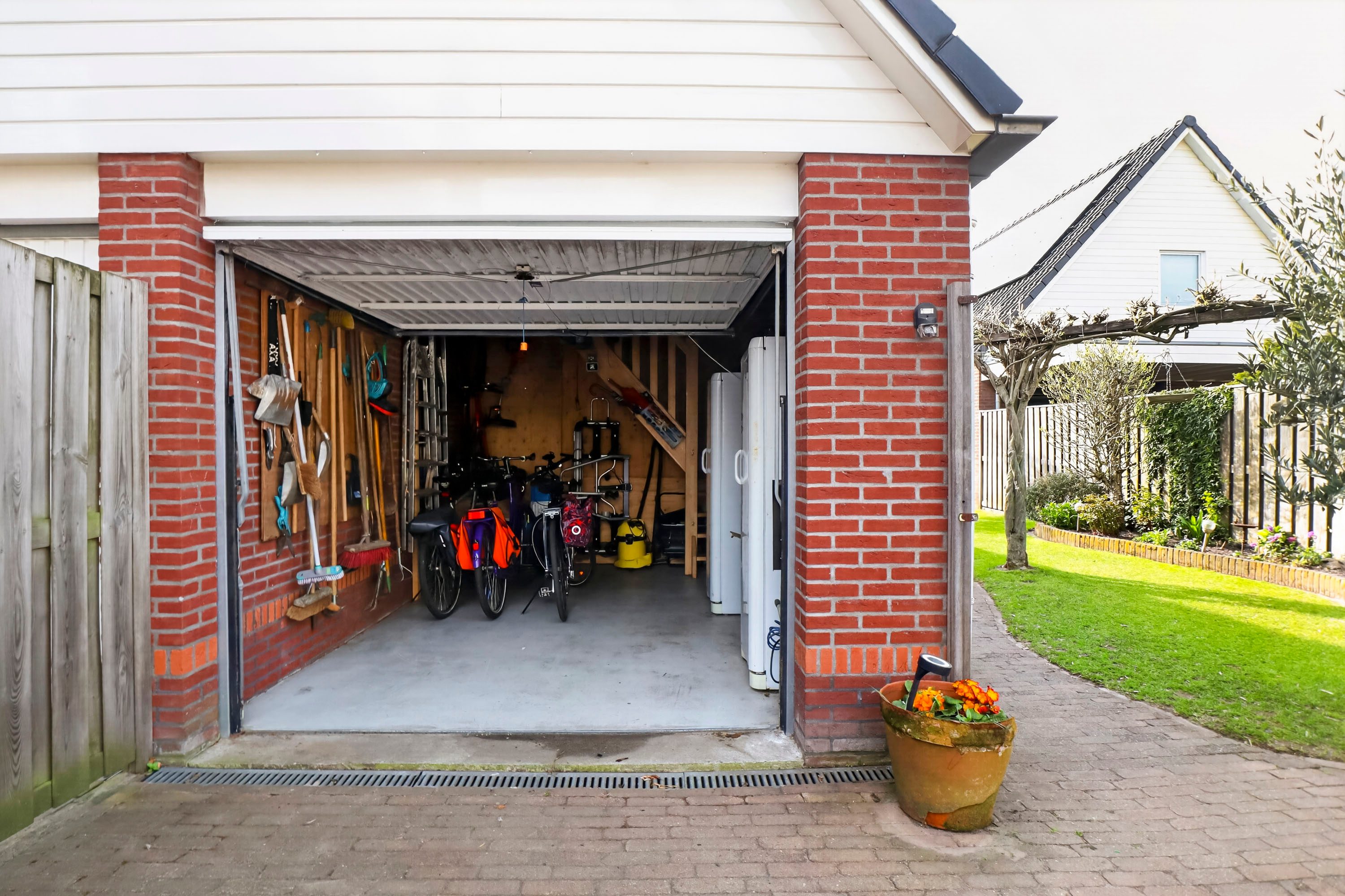 De stenen garage is voorzien van een elektrische kanteldeur en een ruime bergzolder die via een vaste trap bereikbaar is — ideaal als extra hobbyruimte of opslag. Op de eigen oprit is plek voor meerdere auto's.