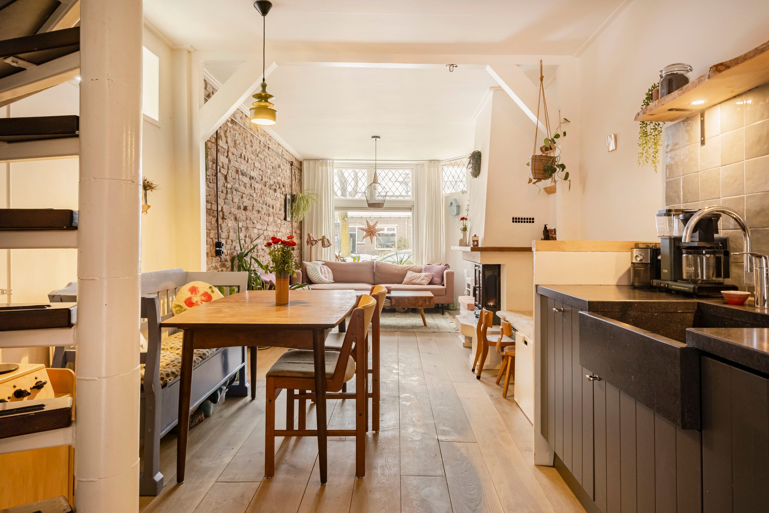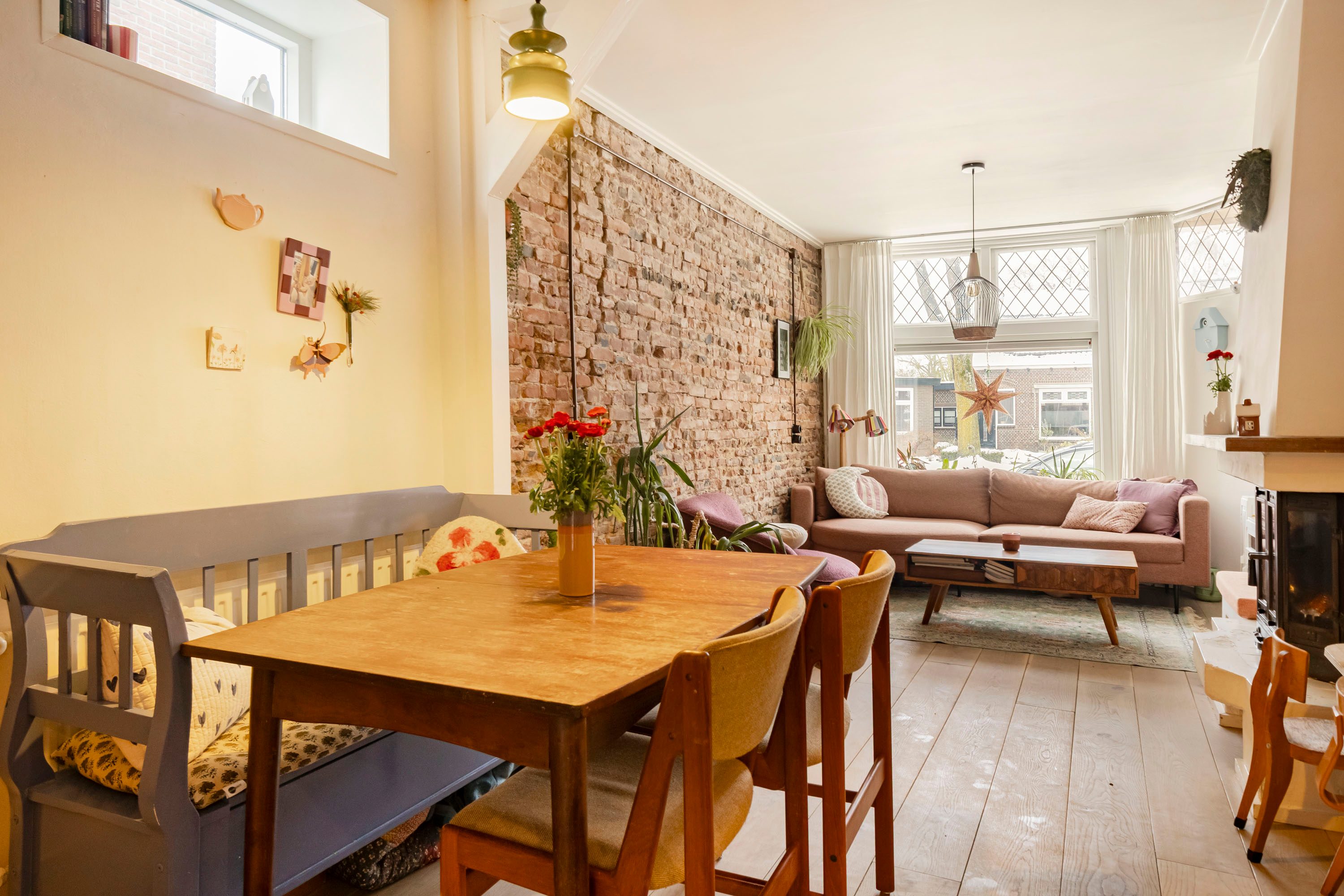 Via de entree kom je direct binnen in de lichte woonkamer van 16,4 m². De sfeervolle erker zorgt voor een prettige lichtinval en biedt voldoende ruimte voor een comfortabele hoekbank en een gezellige zithoek. De open haard maakt deze ruimte extra aangenaam tijdens de koude wintermaanden.