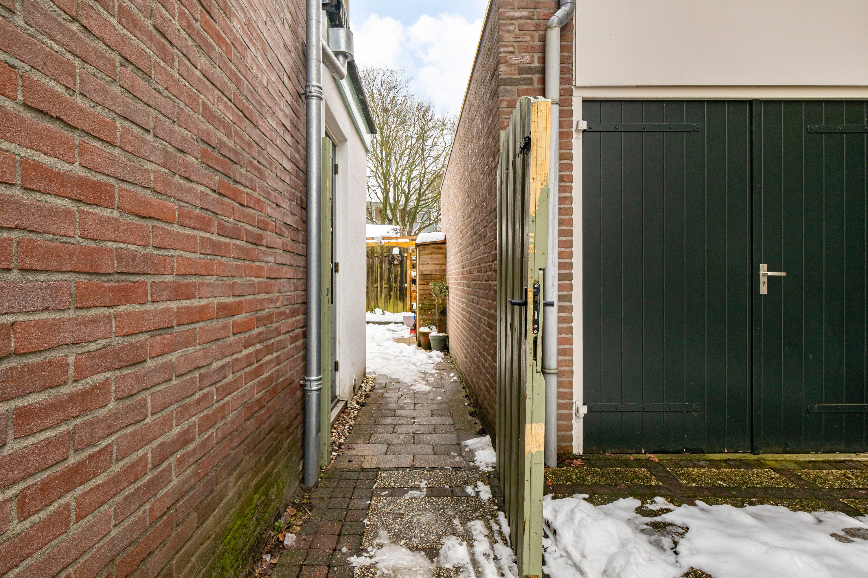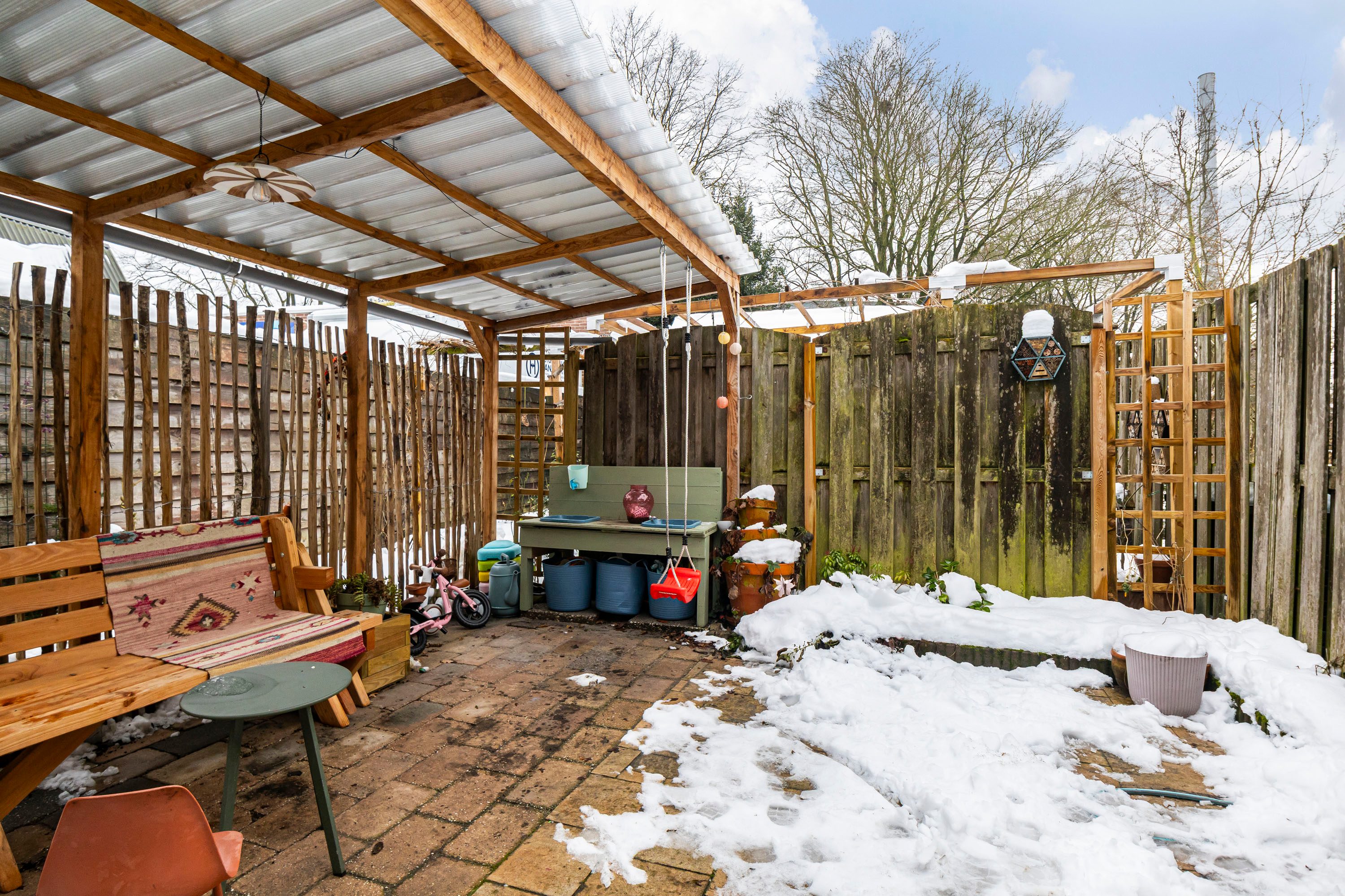 De zonnige achtertuinen zijn gelegen op het zuidwesten en bieden volop ruimte voor een gezellige loungehoek en een speelplek voor kinderen. Tevens is er een houten berging van 6,1 m², ideaal voor fietsen en tuingereedschap. De tuin is bovendien via de zijkant van de woning bereikbaar, wat extra praktisch is. Een gedeelte van de tuin is bereikbaar via het naastgelegen perceel, met een vastgelegd recht van overpad.
