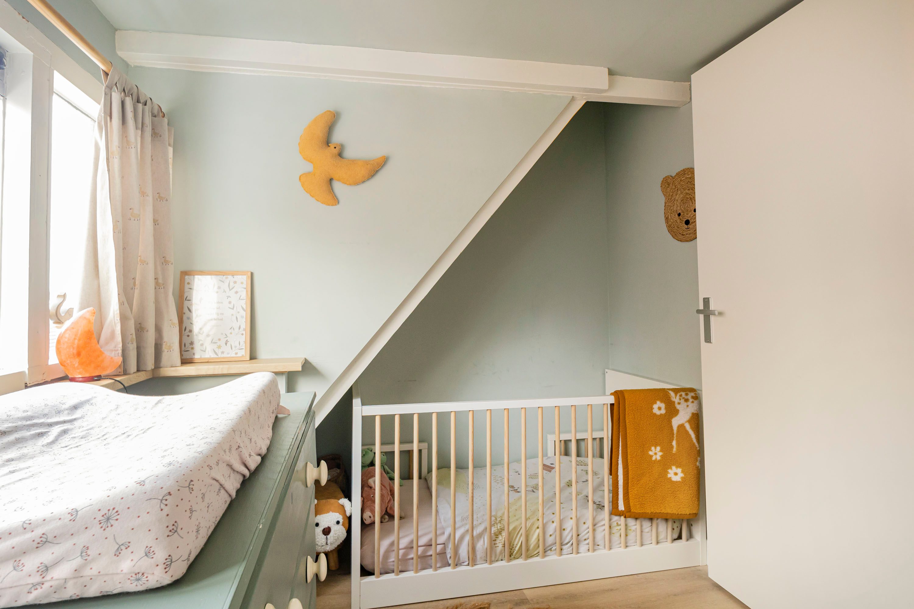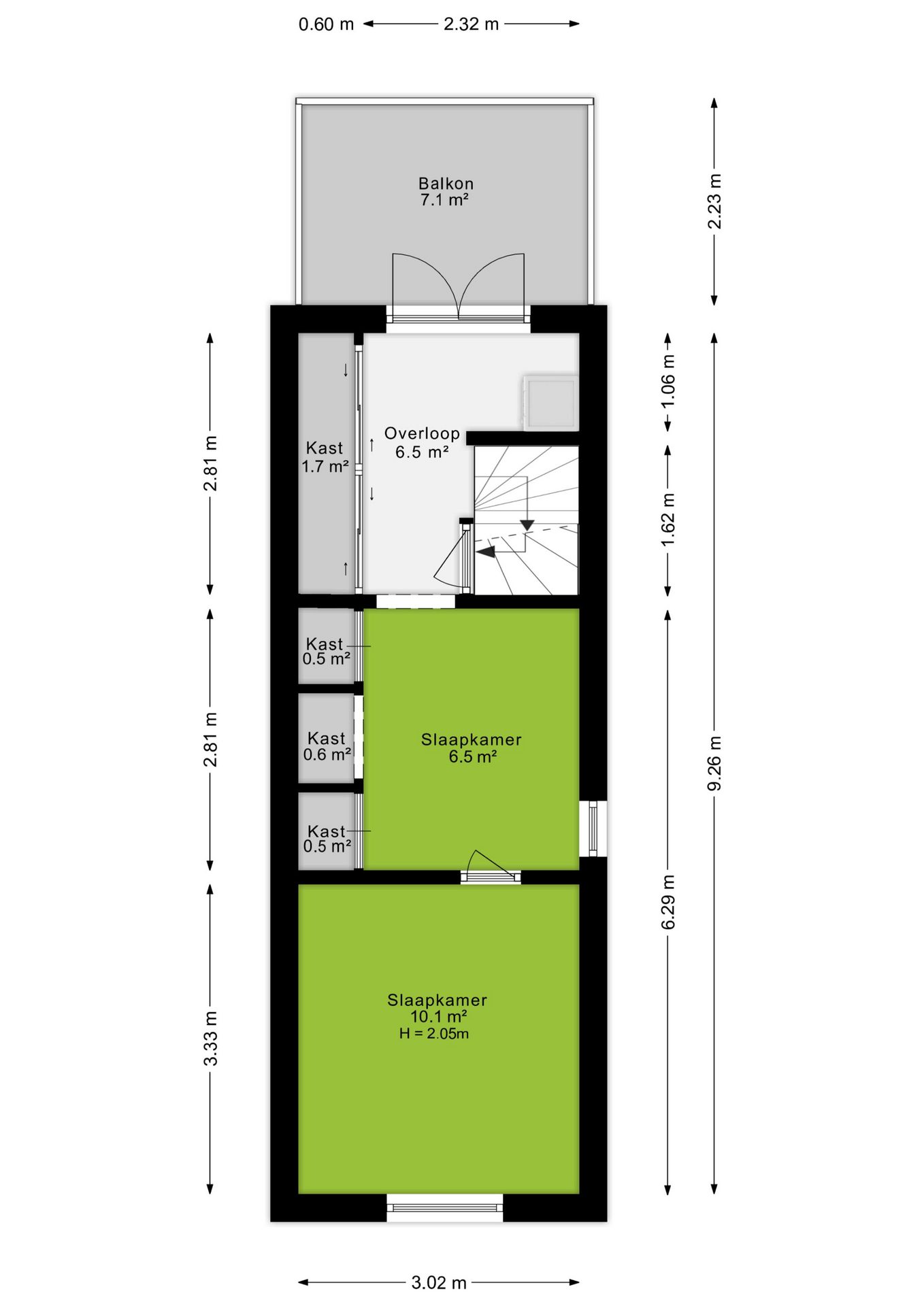 De verdieping beschikt over een slaapkamer van 6,5 m² met een ingebouwde kastenwand. Vanuit deze kamer is de tweede slaapkamer van 10,1 m² bereikbaar. Beide slaapkamers genieten van een prettige lichtinval.