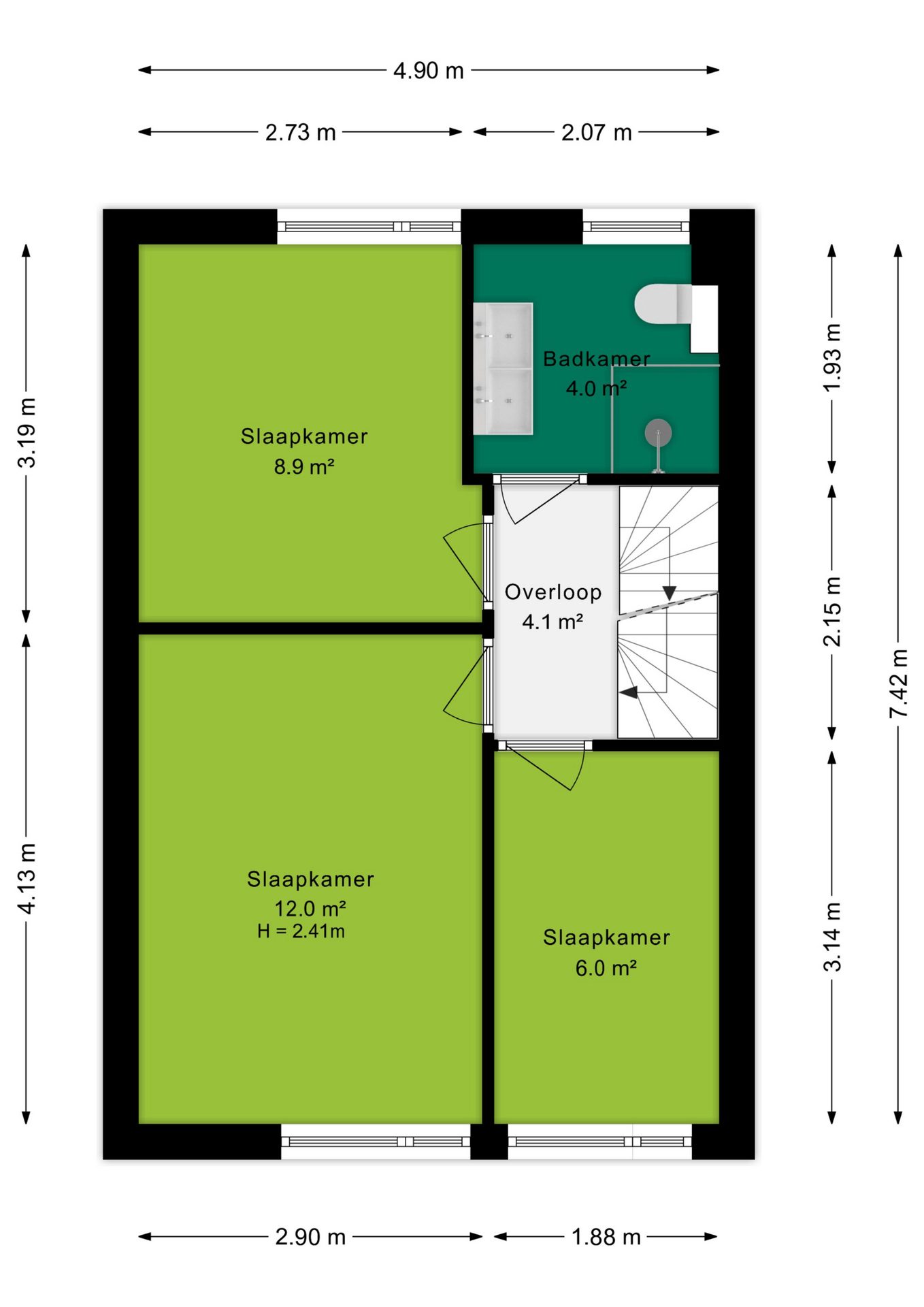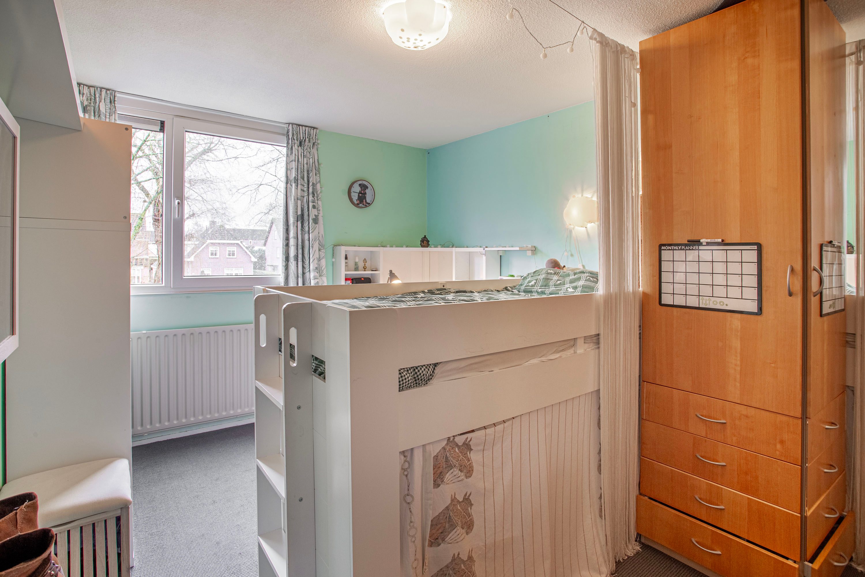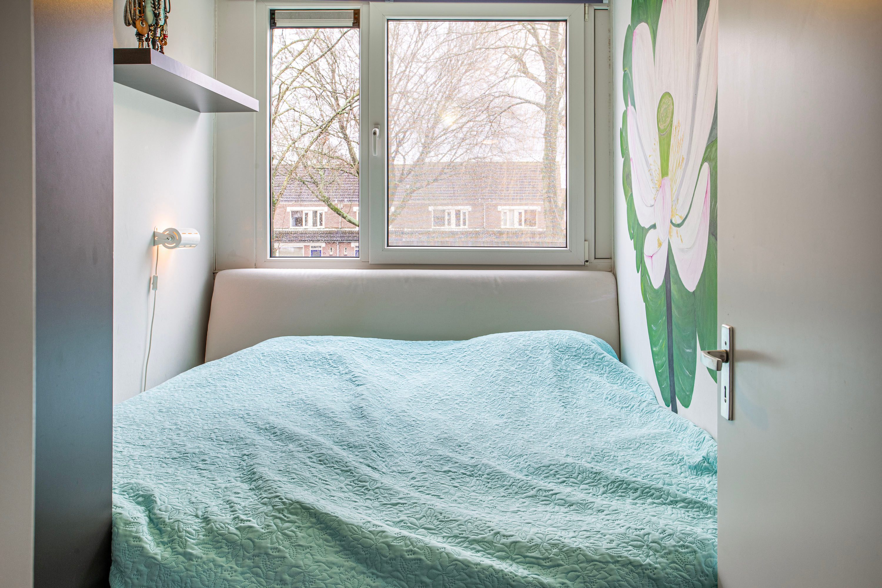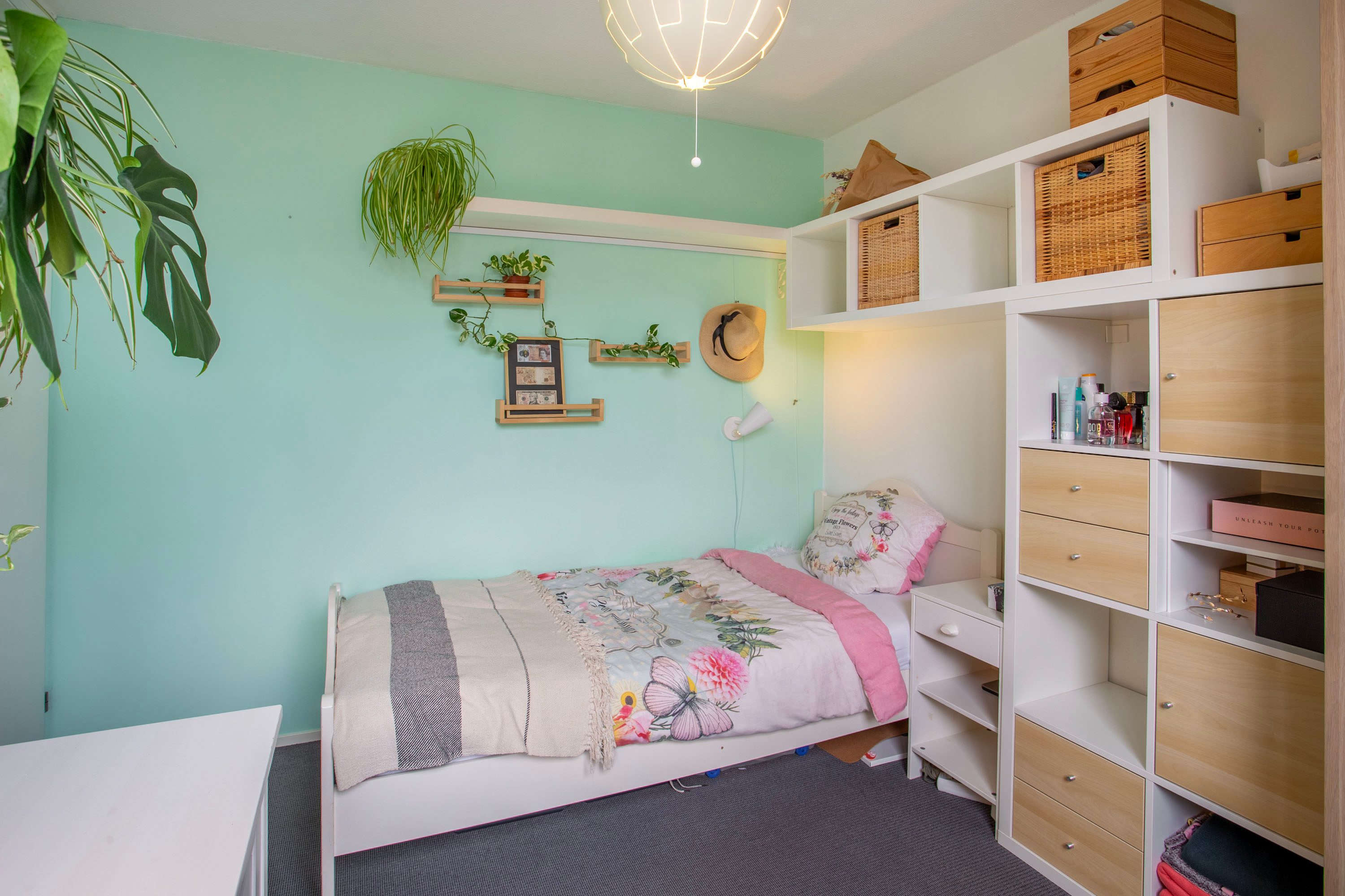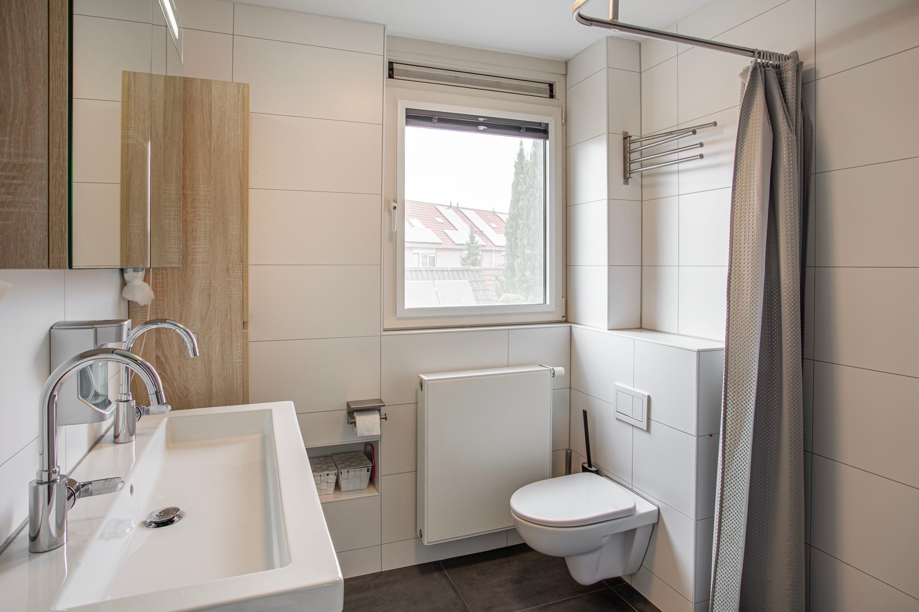 De overloop geeft toegang tot de 3 slaapkamers en de badkamer. De slaapkamers hebben een afmeting van ca. 12m², 9m² en 6m². De slaapkamers zijn voorzien van voldoende lichtinval en een nette afwerking. De badkamer is in 2021 vernieuwd, heeft een moderne kleurstelling en beschikt over een inloopdouche, wastafel met wastafelmeubel, toilet en een raam om extra goed te kunnen ventileren.