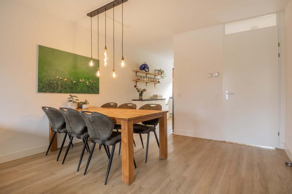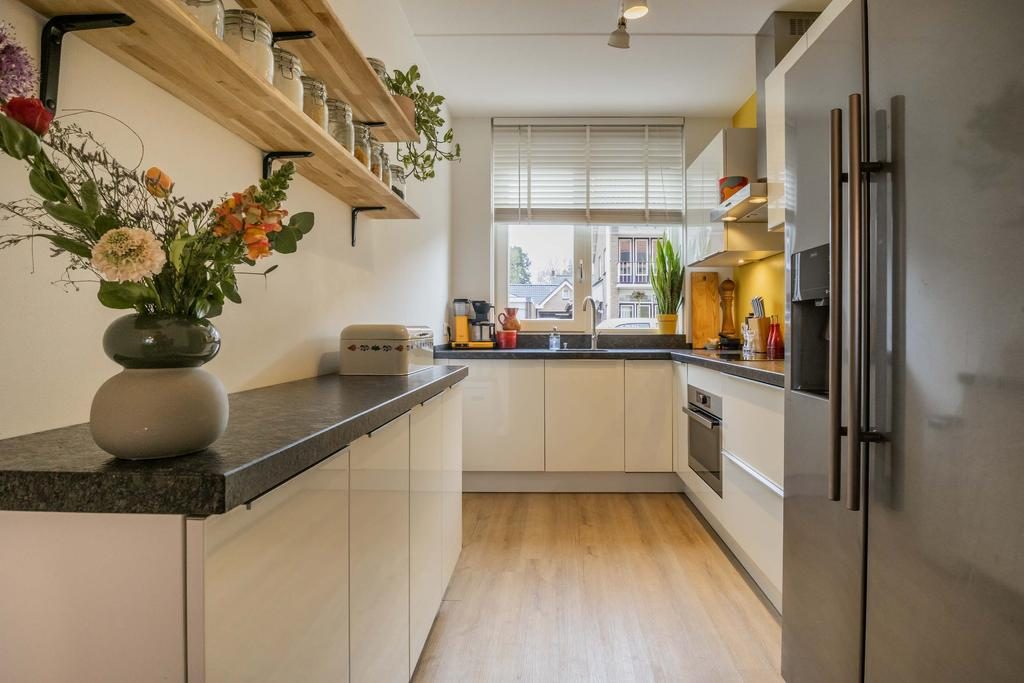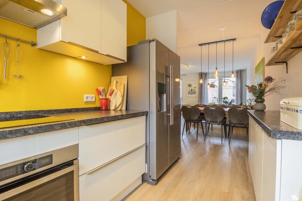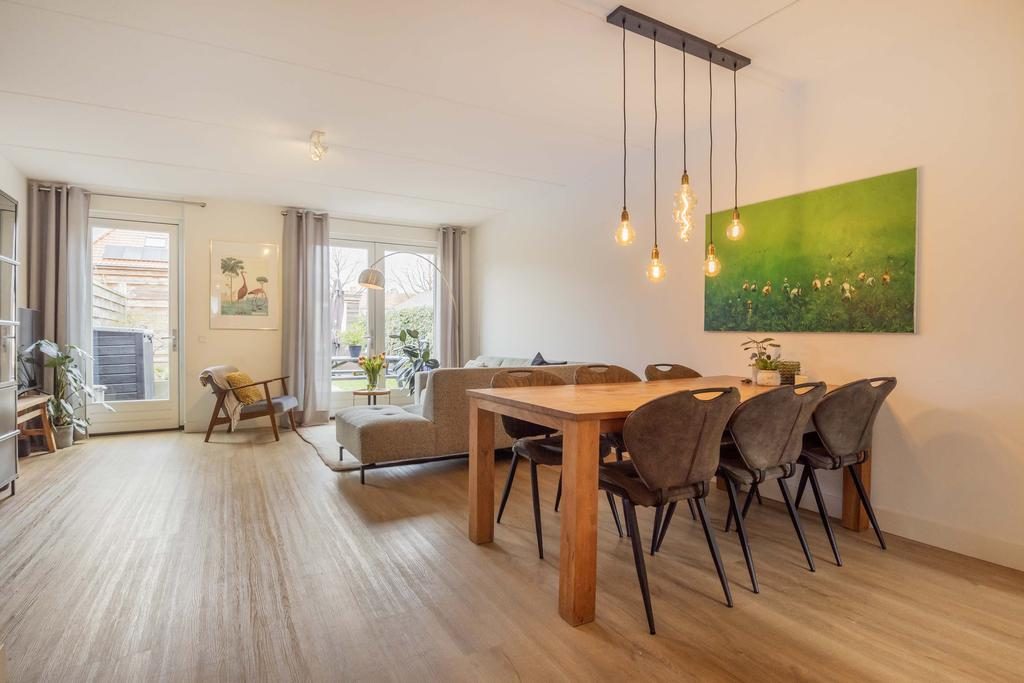 Via de entree kom je bij de ruime hal met meterkast, berging, toiletruimte, trapopgang en deur naar de woonkamer. De woonkamer is tuingericht en beschikt door de dubbele openslaande tuindeuren met grote raampartijen over veel daglichtinval. Centraal tussen de woonkamer en keuken bevindt zich het eetgedeelte. Hier is meer dan voldoende ruimte voor een grote eettafel met stoelen. Een fijne plek om met familie en/of vrienden te genieten van een hapje, drankje en spelletje! Aan de voorzijde van de woning is de keuken gesitueerd. De ruime keukenruimte is uitgevoerd met een luxe en complete inbouwkeuken incl. diverse apparatuur zoals een inductiekookplaat, vaatwasser, combi-oven en een vrijstaande Amerikaanse koel-vriescombinatie. Daarnaast is er veel kastruimte en werkruimte.