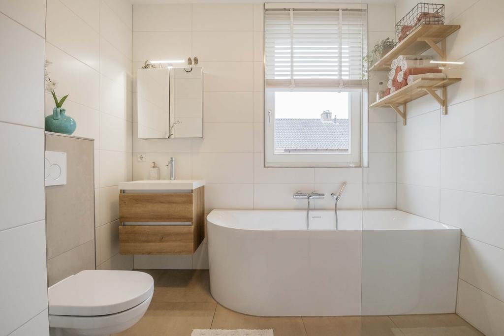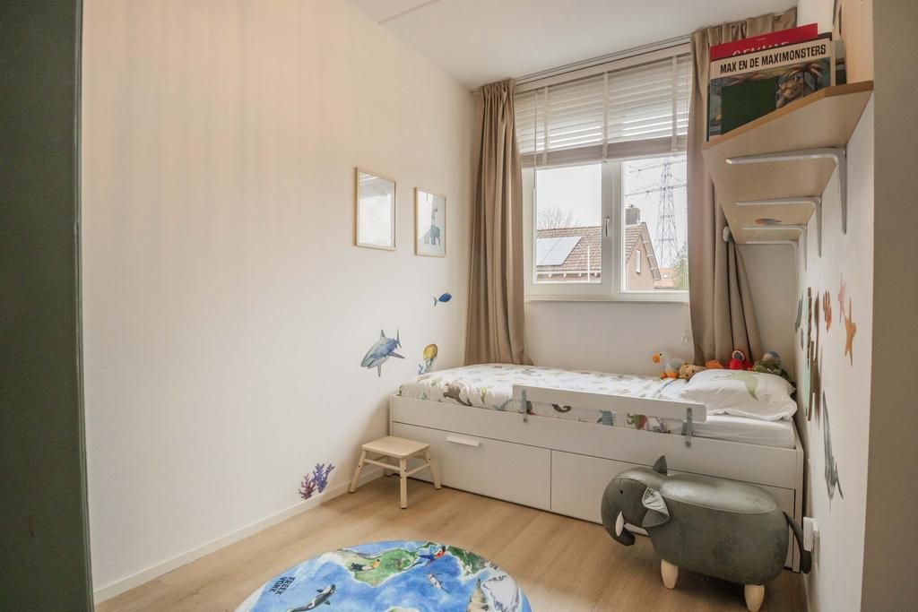 Via de vaste trap kom je bij de overloop met toegang tot drie slaapkamers en de badkamer. Twee slaapkamers zijn gelegen aan de achterzijde van de woning en zijn circa 6 en 12 m². De derde slaapkamer en de badkamer zijn aan de voorzijde gesitueerd. De badkamer is neutraal en in lichte tinten uitgevoerd. Aanwezig is een wastafel met bergmeubel, 2e toilet, een ligbad, een ruime inloopdouche en een te openen raam voor de gewenste natuurlijke ventilatie.