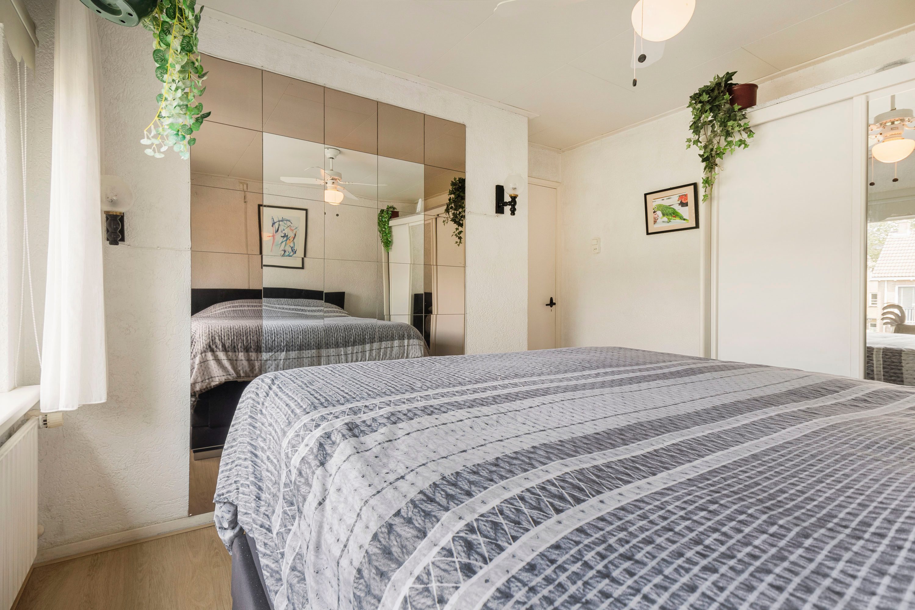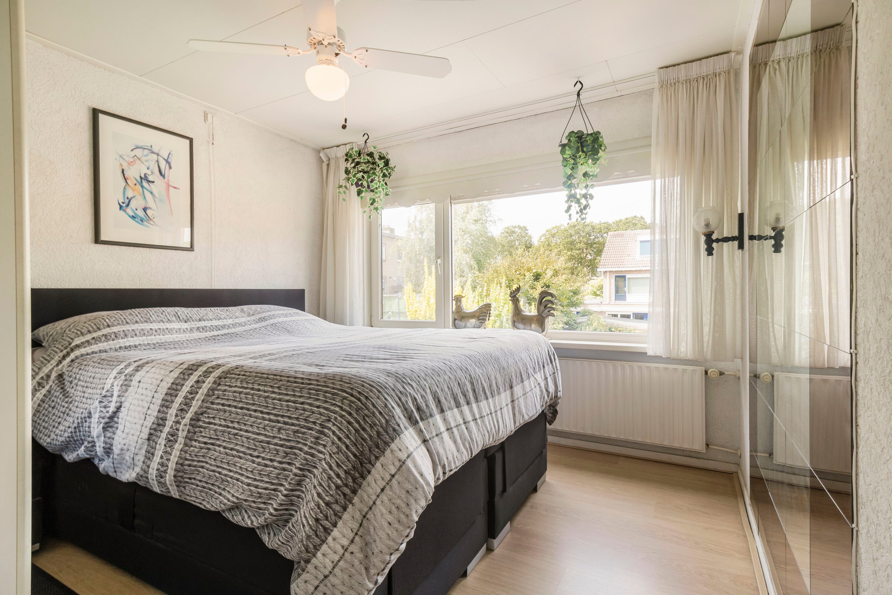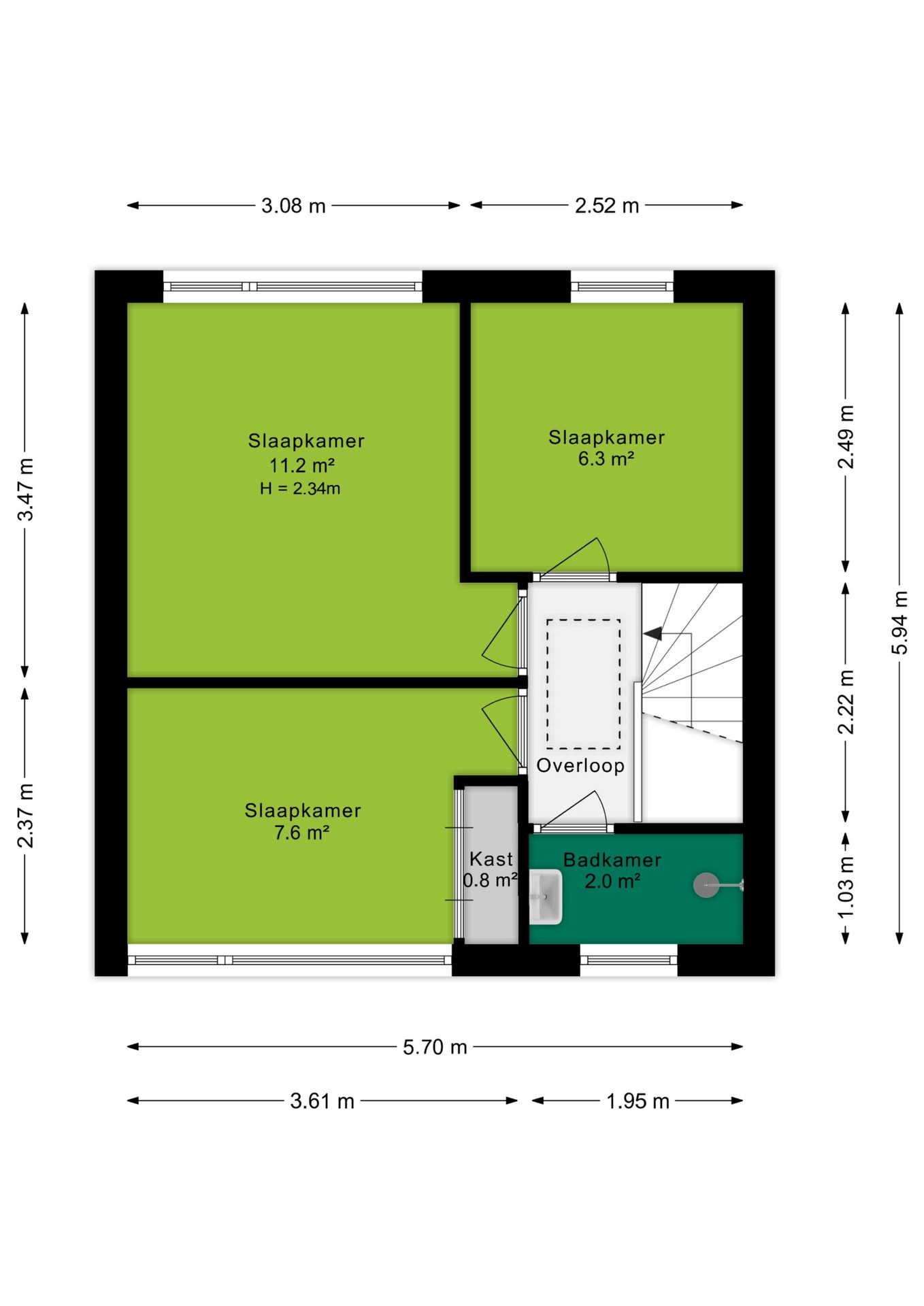 Via de vaste trap bereik je de overloop die toegang geeft tot alle vertrekken. Er zijn drie goed ingedeelde slaapkamers van 11,2 m², 7,6 m² en 6,3 m², allemaal voorzien van grote raampartijen met kunststof kozijnen en HR++ beglazing. De badkamer (2 m²) is voorzien van een wastafel en inloopdouche. Dankzij het raam is er daglicht en de gewenste natuurlijke ventilatie.