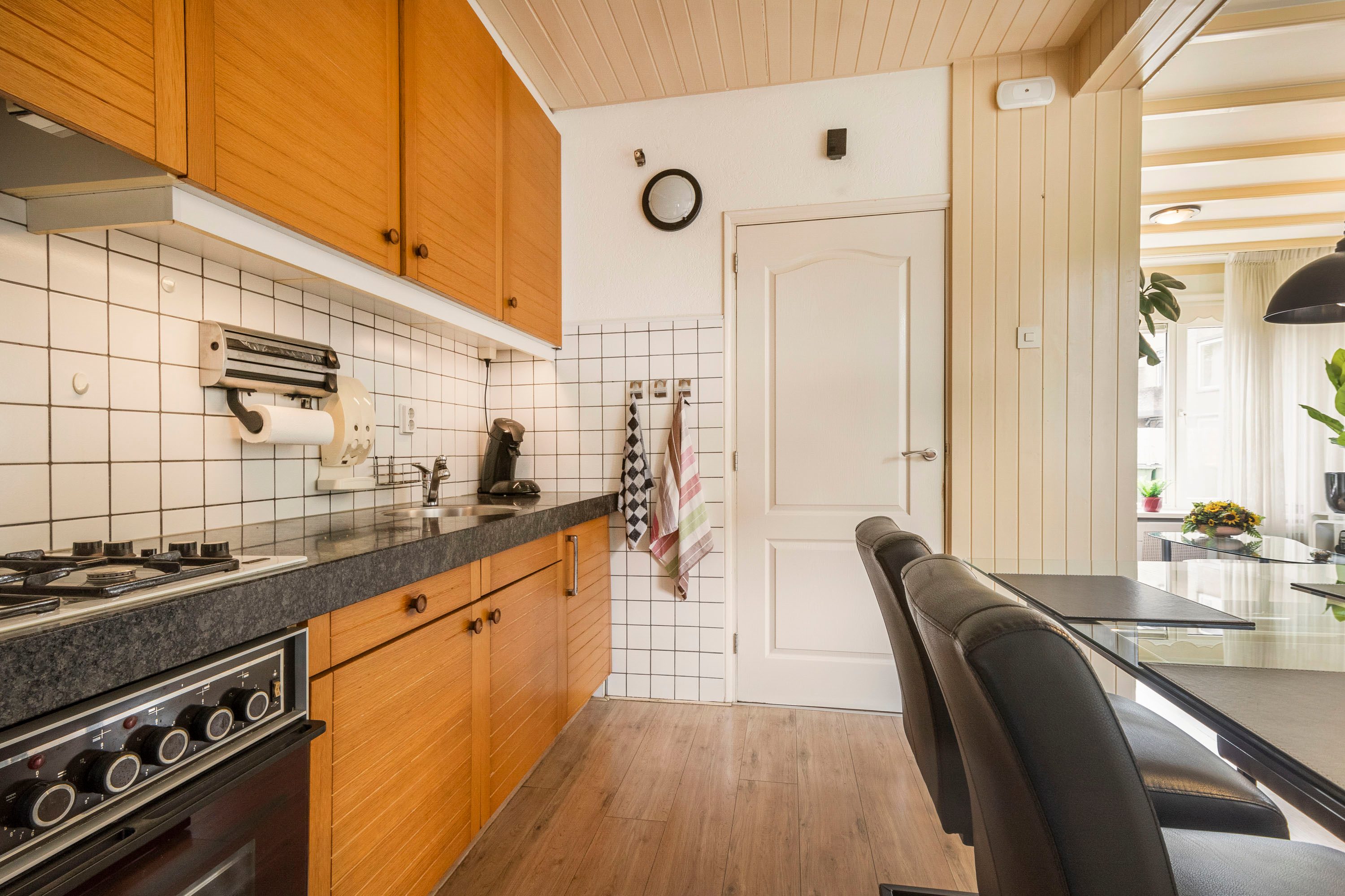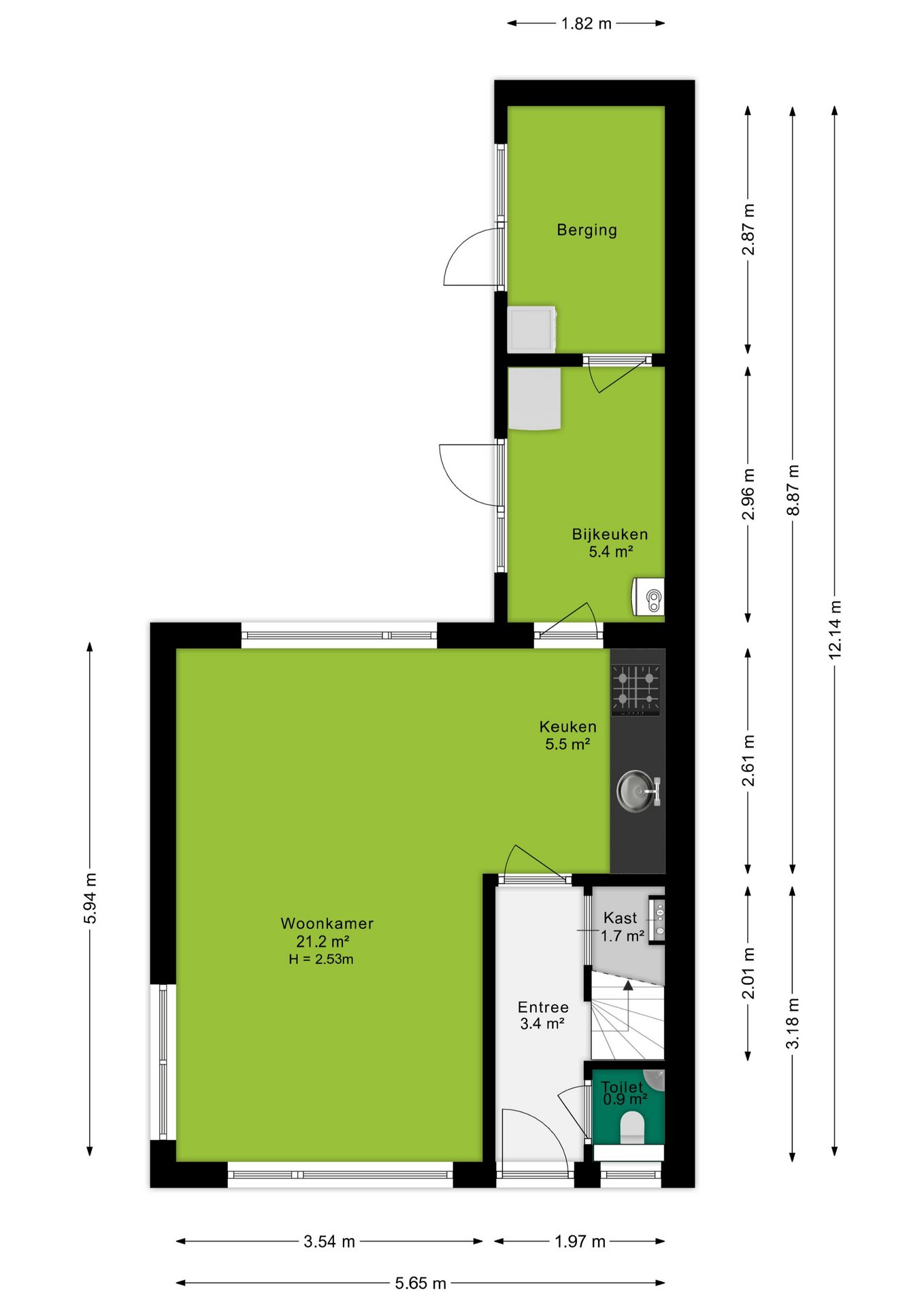 Via de entree, waar het toilet, de trapopgang naar de 1e verdieping en de meterkast zich bevinden, kom je in de lichte woonkamer met royale raampartijen (kunststof kozijnen met HR++ beglazing) aan zowel de voorkant, zijkant als achterkant. Er is plek voor een ruime hoekbank en een gezellig zithoek. Aansluitend vind je het eetgedeelte met de keuken, voorzien van inbouwapparatuur zoals o.a. een kookplaat met afzuigkap, een oven en een koelkast. Vanuit de keuken loop je door naar de bijkeuken met ruimte voor opbergkasten om vervolgens naar de achtergelegen 2e bijkeuken/berging met aansluitingen voor wasmachine en/of droger.