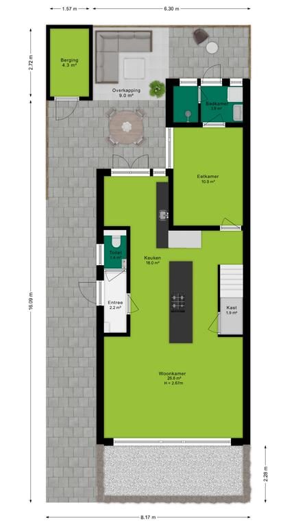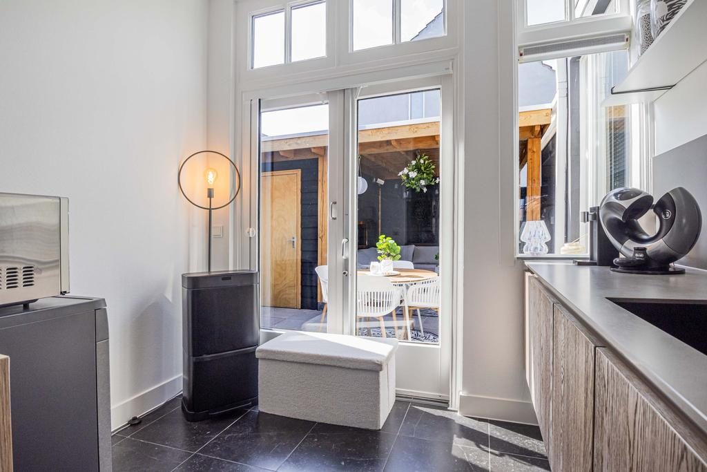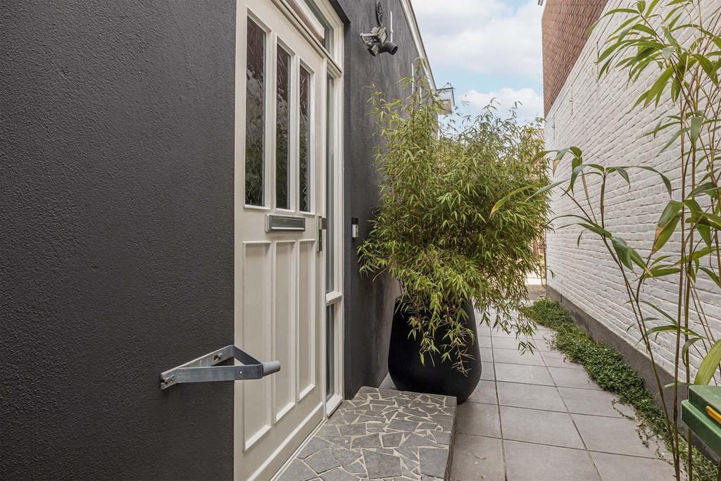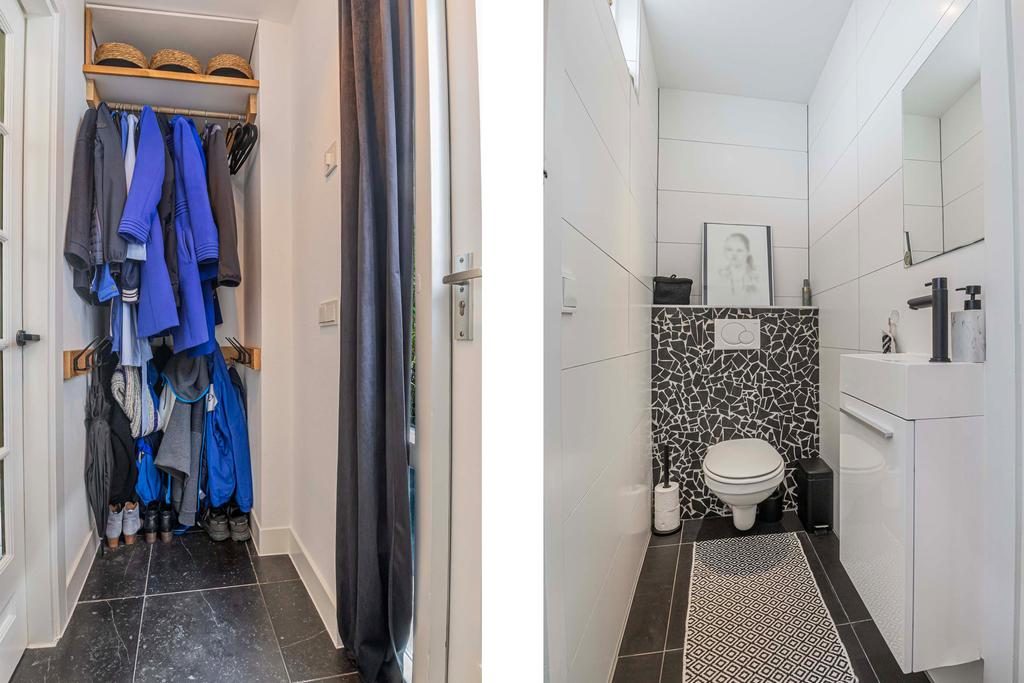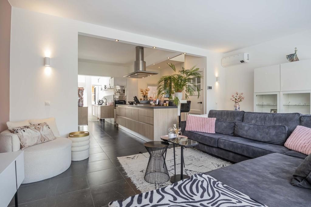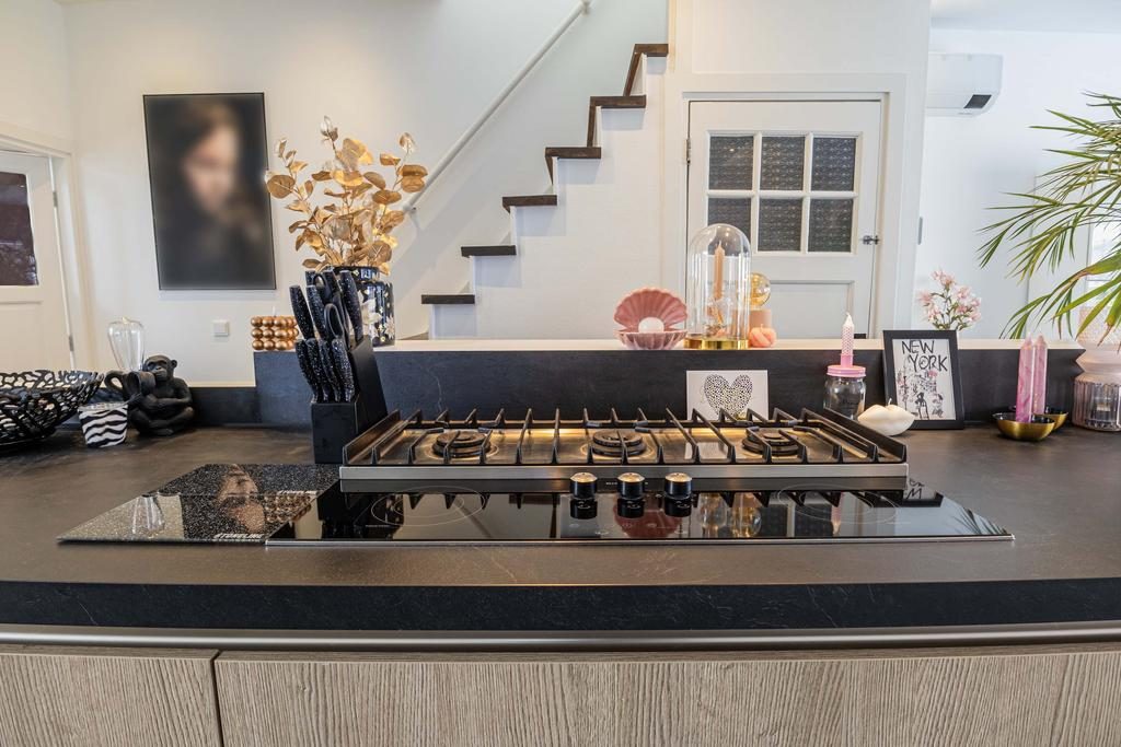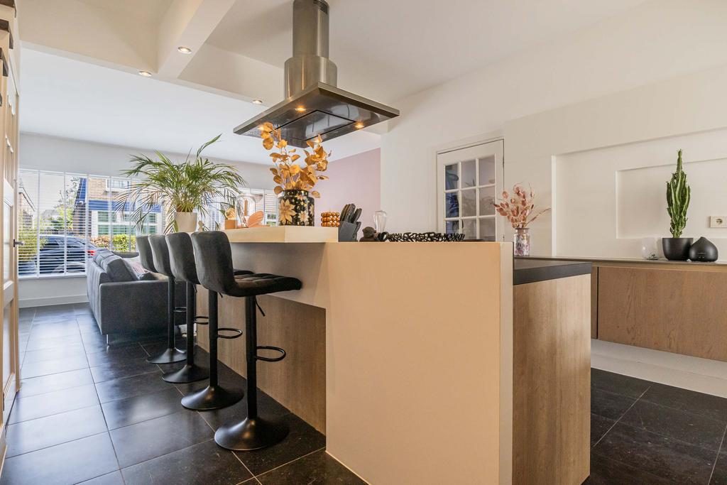 Aan de zijkant van de woning bevindt zich de entree, waar je binnenkomt in de hal met direct toegang tot het toilet. Loop je verder, dan kom je in de stijlvolle keuken waar een prachtig kookeiland centraal staat. Deze keuken loopt door tot aan de openslaande deuren naar de tuin, waardoor je tijdens het koken niet alleen geniet van het uitzicht op buiten, maar ook gezellig in contact blijft met iedereen in de woonkamer. Het kookeiland en de open indeling maken deze keuken echt het kloppende hart van het huis.