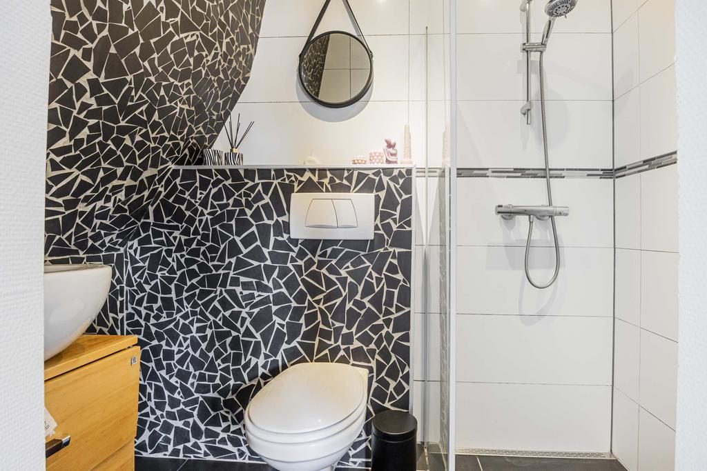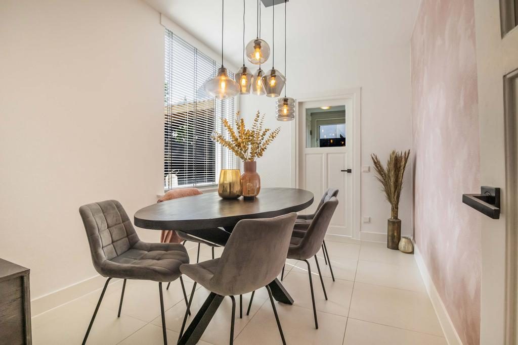 De eetkamer bereik je eenvoudig via een deur vanuit de keuken. Een perfecte plek om uitgebreid te tafelen terwijl je geniet van het uitzicht op de tuin. Loop je nog een deur verder, dan kom je in de badkamer, waar zich ook de aansluiting voor de wasmachine bevindt.