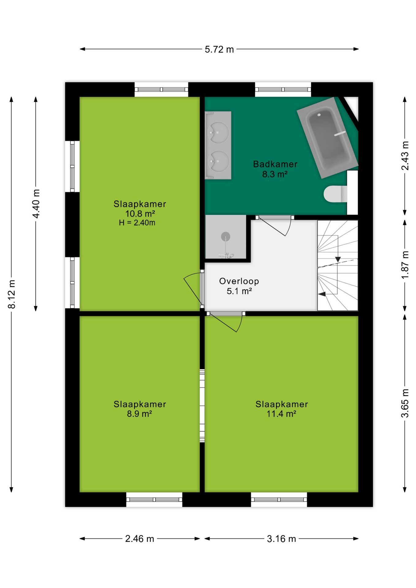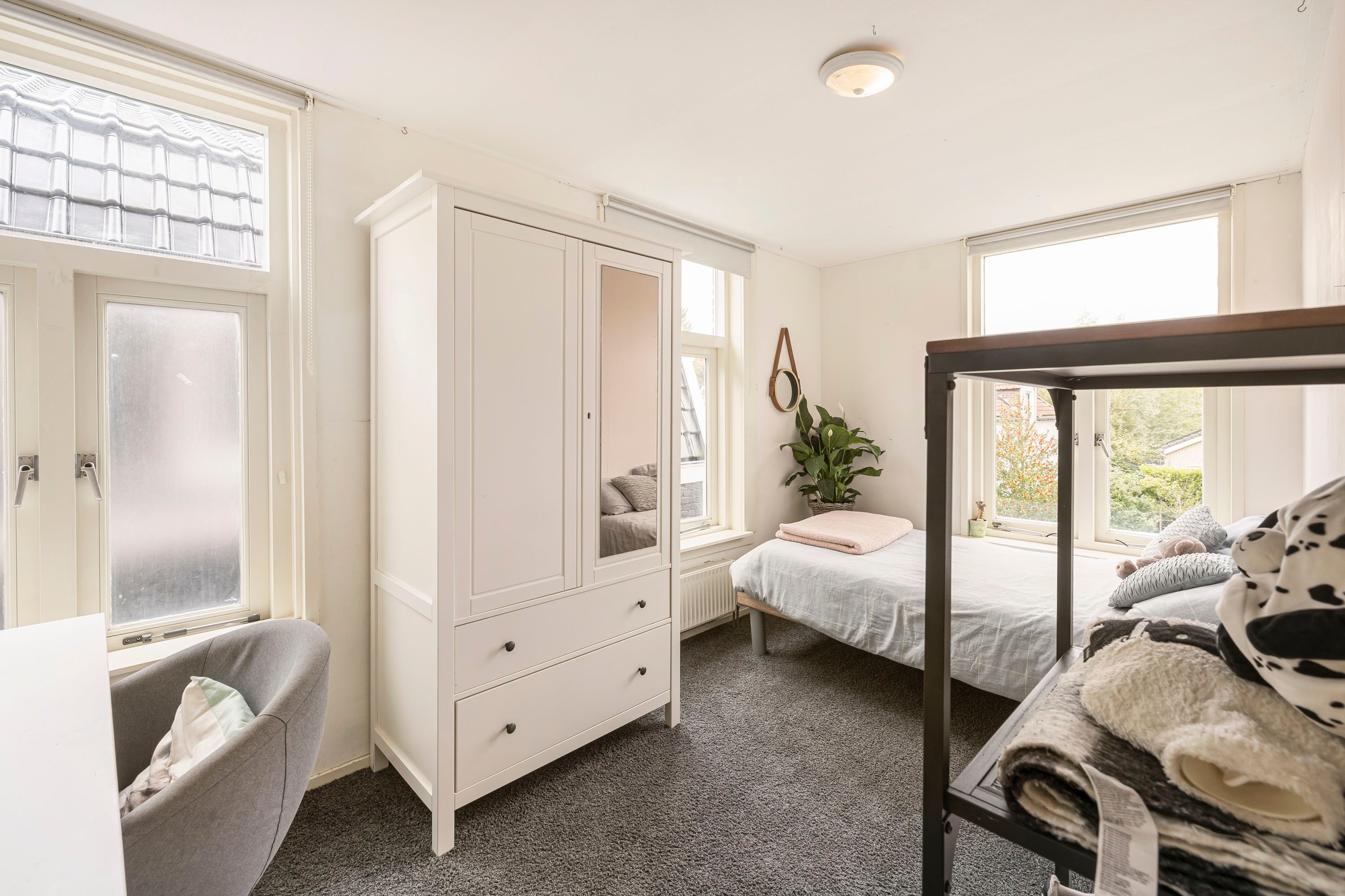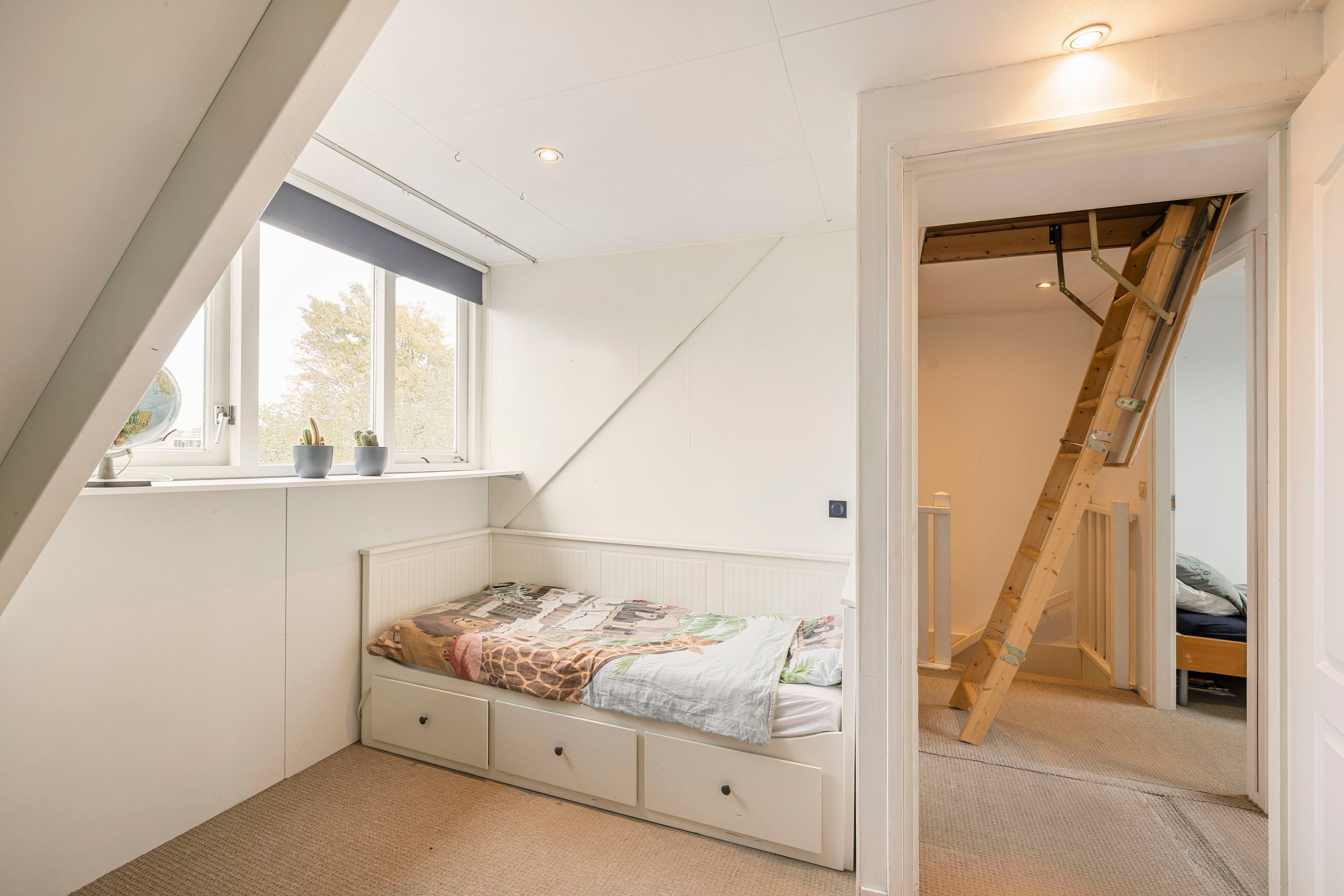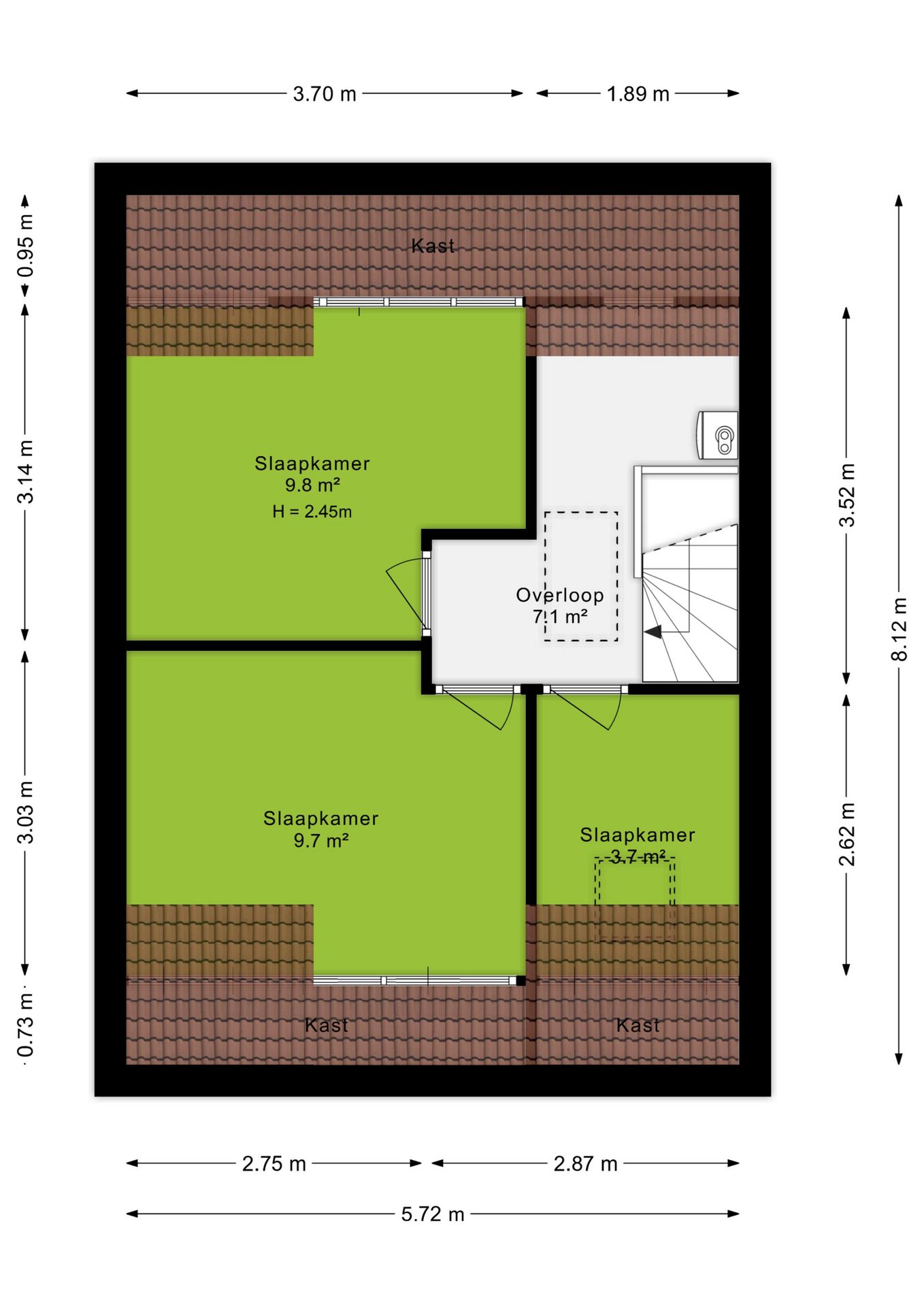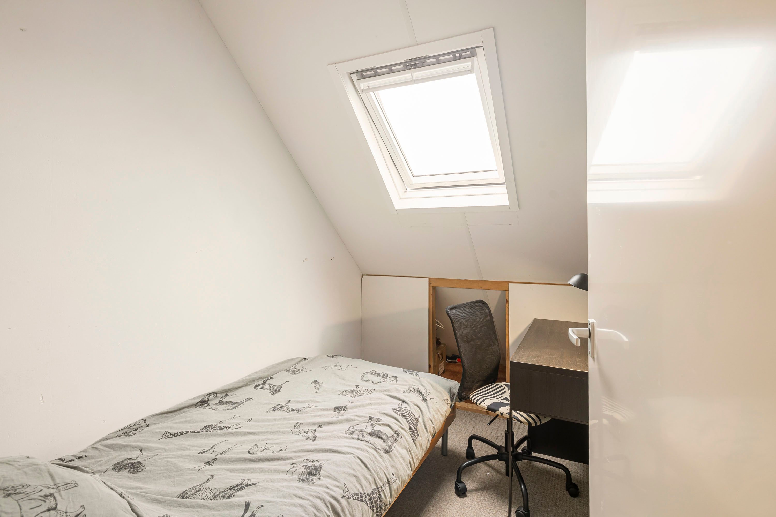Een ruime overloop verbindt de andere drie slaapkamers, met afmetingen van 9,8 m², 9,7 m² en 3,7 m². Elke kamer beschikt over een raampartij en opbergschotten, zodat er voldoende ruimte is voor opslag en organisatie. Via een vlizotrap op de overloop is een ruime vliering te bereiken.