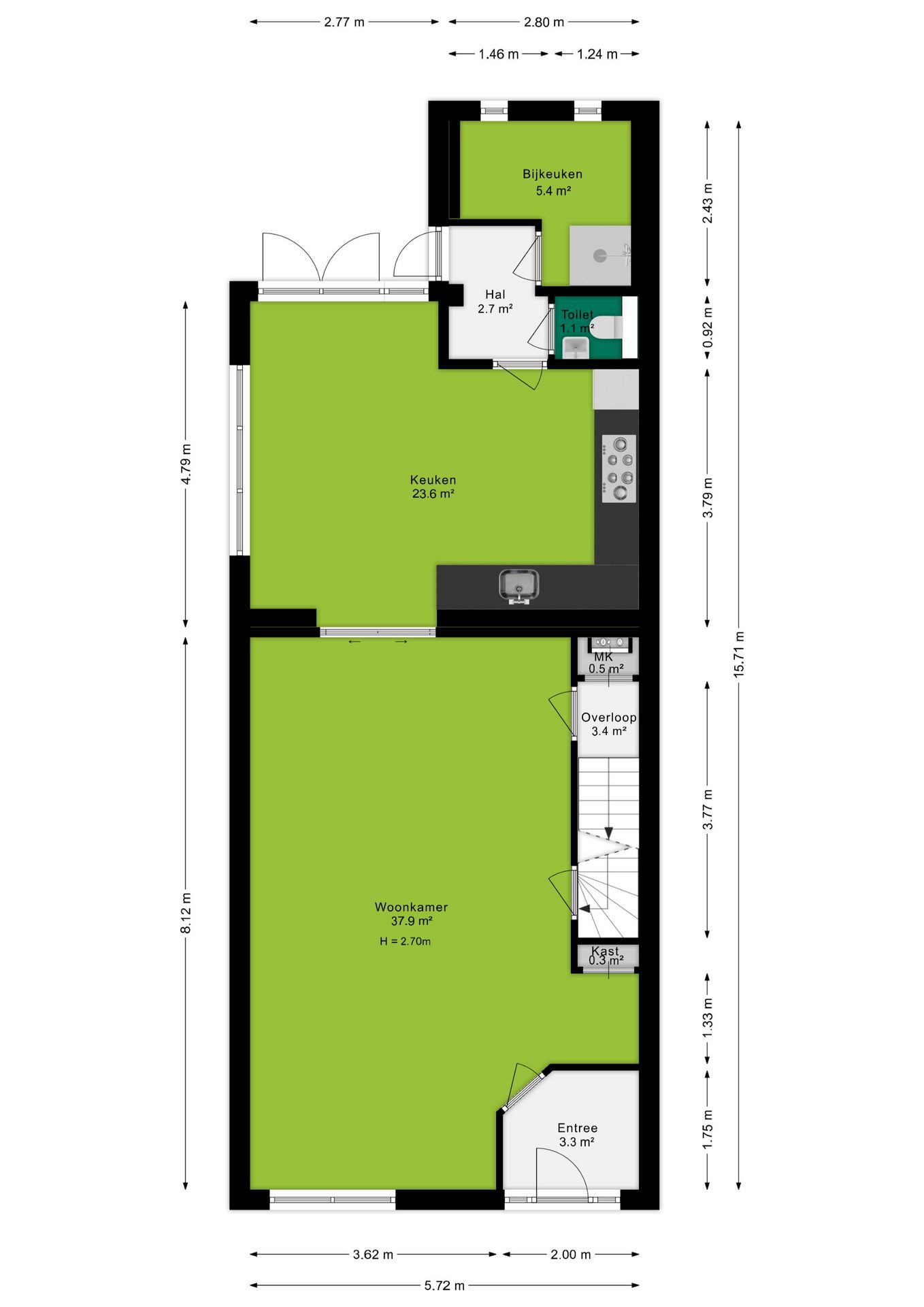 Bij binnenkomst betreed je een lichte, open woonkamer van 37,9 m², waar een grote familiebank en diverse zithoeken ideaal zijn om te ontspannen. Een heerlijke ruimte, welke beschikt over fijn veel daglicht, om te genieten na een lange (werk) dag! Vanuit de woonkamer leiden schuifdeuren, inclusief stijlvolle kasten, naar een royale, 23,6 m² grote leefkeuken. Deze L-vormige keuken, ingericht met witte kastjes en een donker werkblad, biedt voldoende ruimte voor een grote eettafel en is uitgerust met moderne inbouwapparatuur zoals een gasfornuis, afzuigkap, oven, koelkast en vaatwasser. Daarnaast geniet de keuken van het comfort van vloerverwarming. Ook is er vanuit de keuken toegang tot een hal met toilet en een bijkeuken van 5,4 m², waarin een douche is geïntegreerd en waar de aansluitingen voor de wasmachine en/of droger zich bevinden.