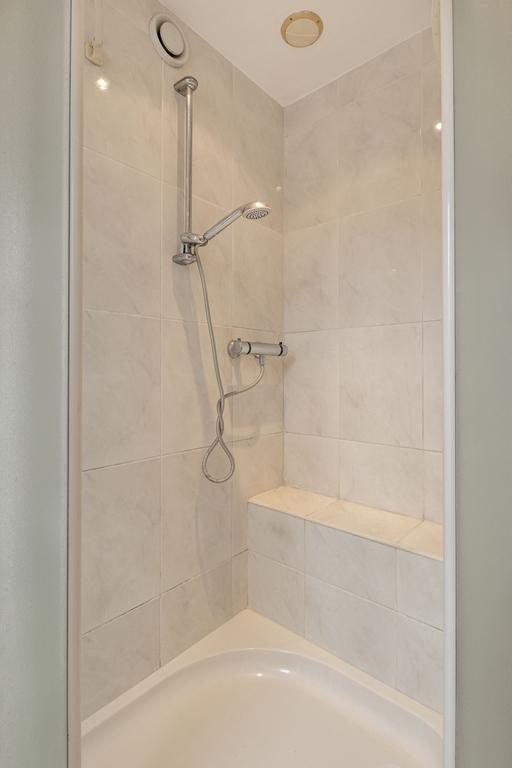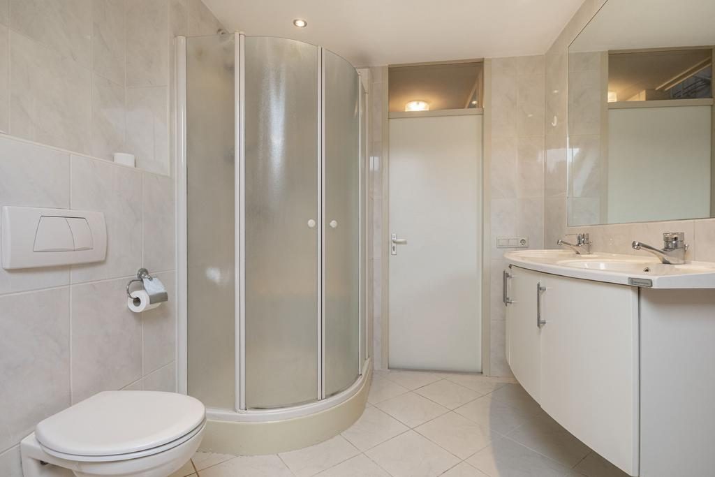 De badkamer is grotendeels betegeld en voorzien van een ligbad, douchecabine, wastafelmeubel met twee wastafels en een toilet. Lichtinval via een dakraam.