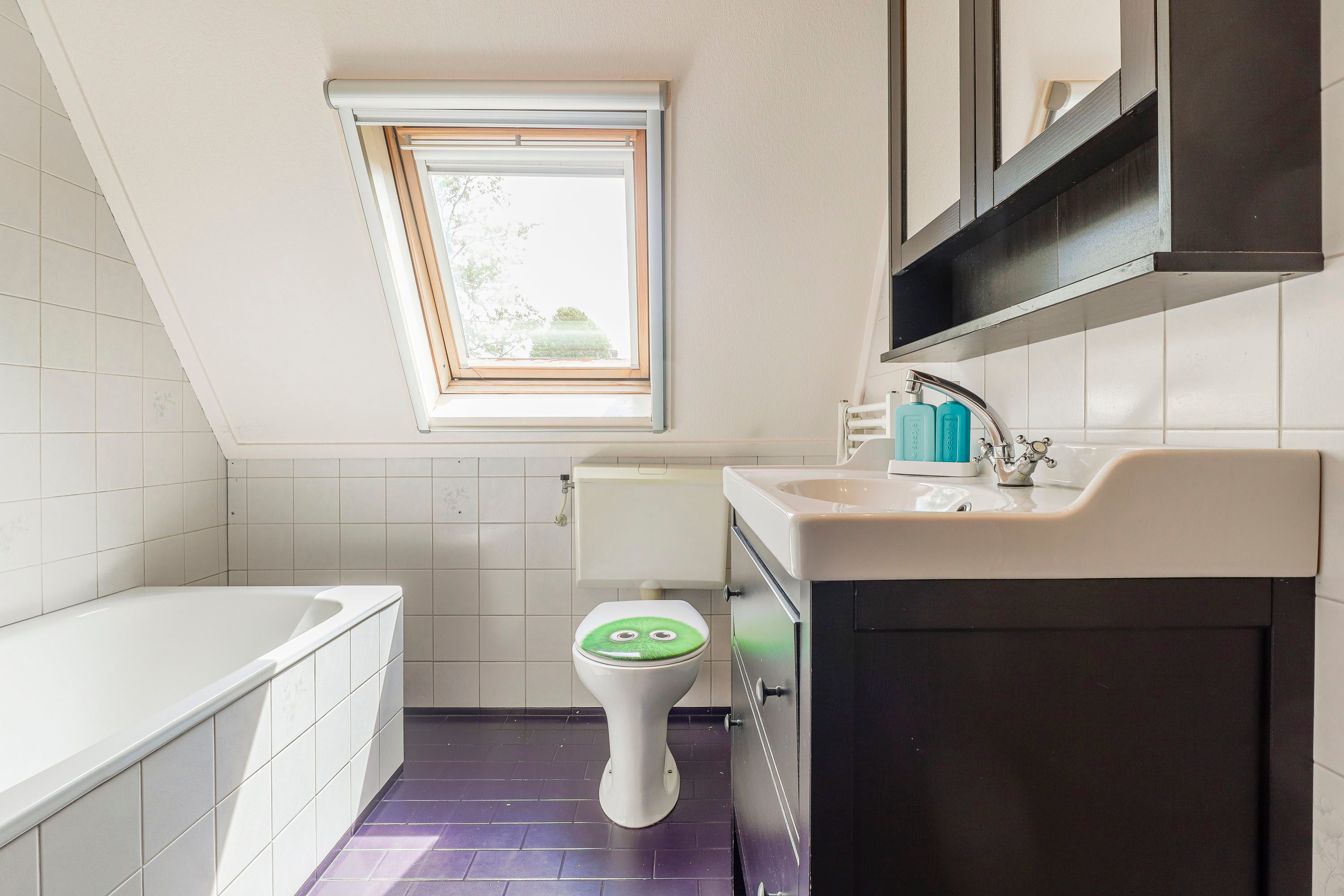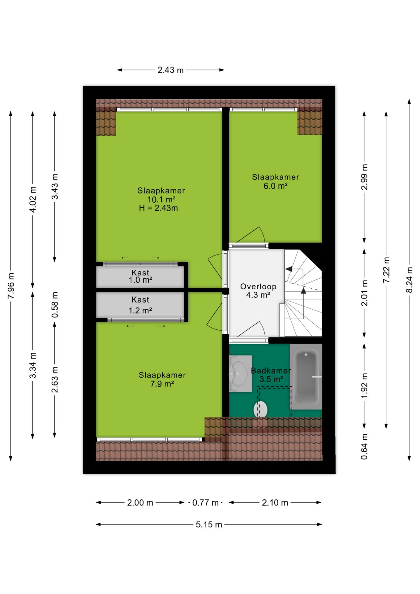 Via de vaste trap bereik je de overloop, die toegang biedt tot drie ruime slaapkamers, alle voorzien van een dakkapel. De kamers hebben een oppervlakte van circa 10m², 8m² en 6m². Daarnaast beschikken de slaapkamers van 10m² en 8m² over een handige vaste kast. De badkamer is volledig betegeld en voorzien van een ligbad met douche, wastafelmeubel en een toilet.