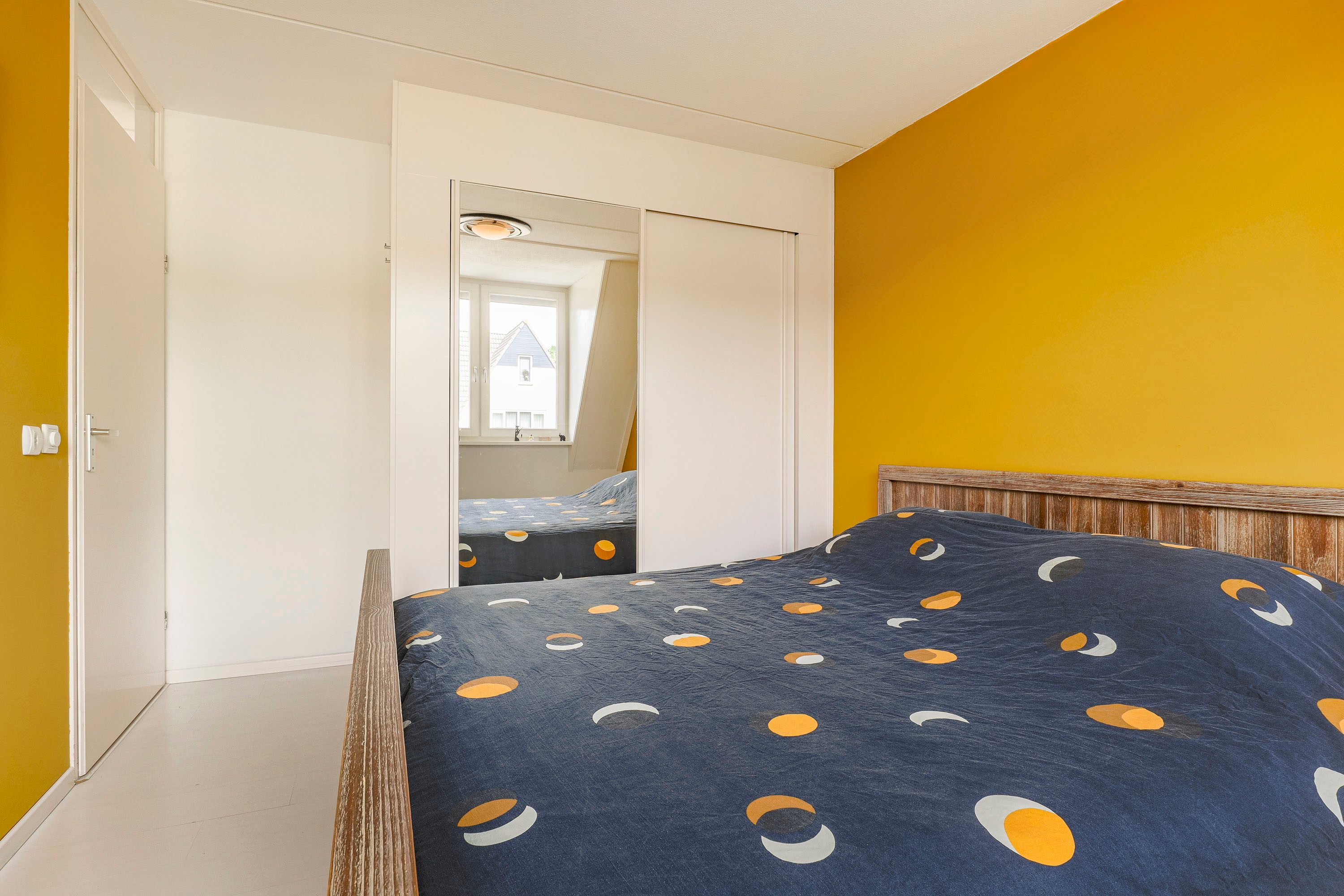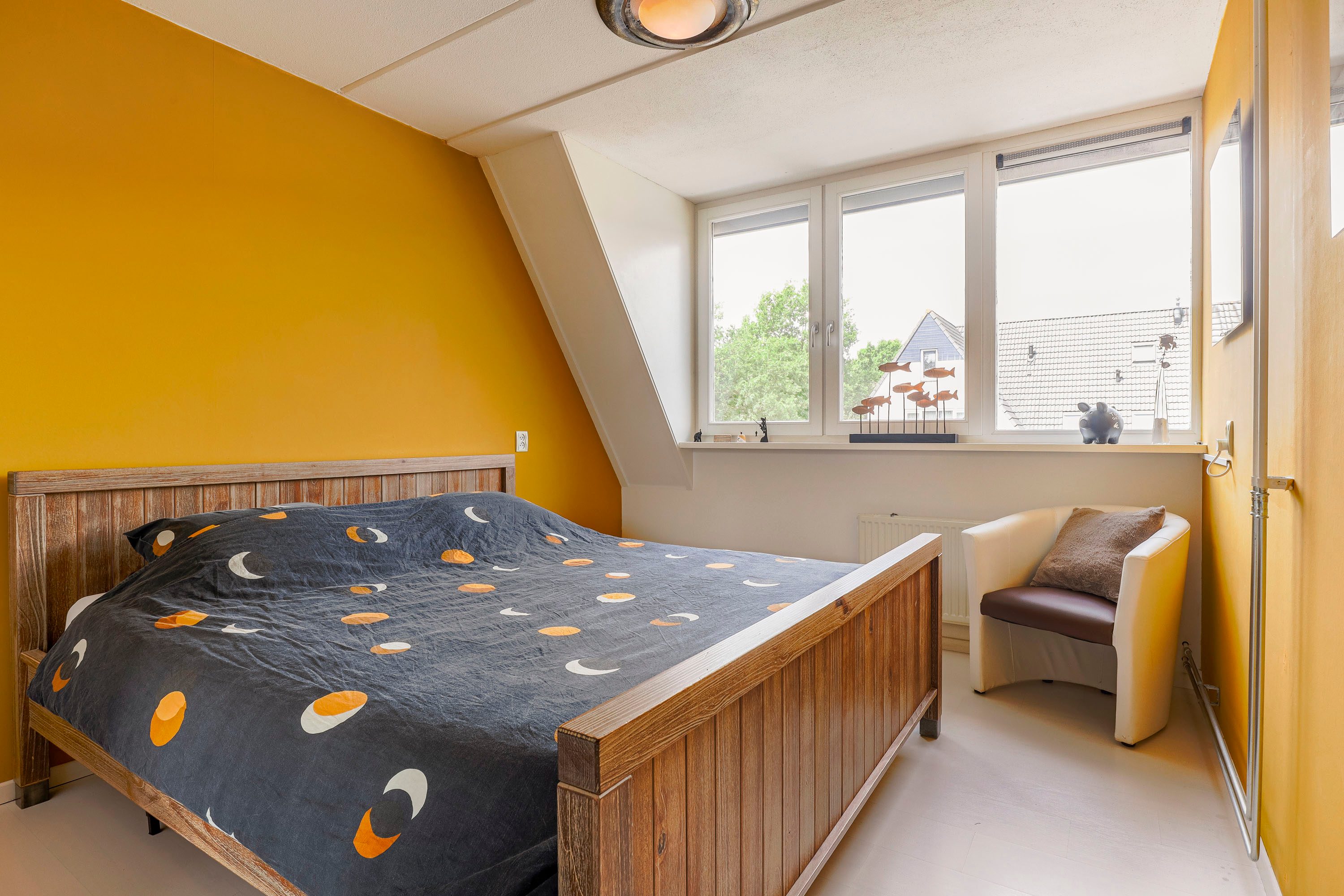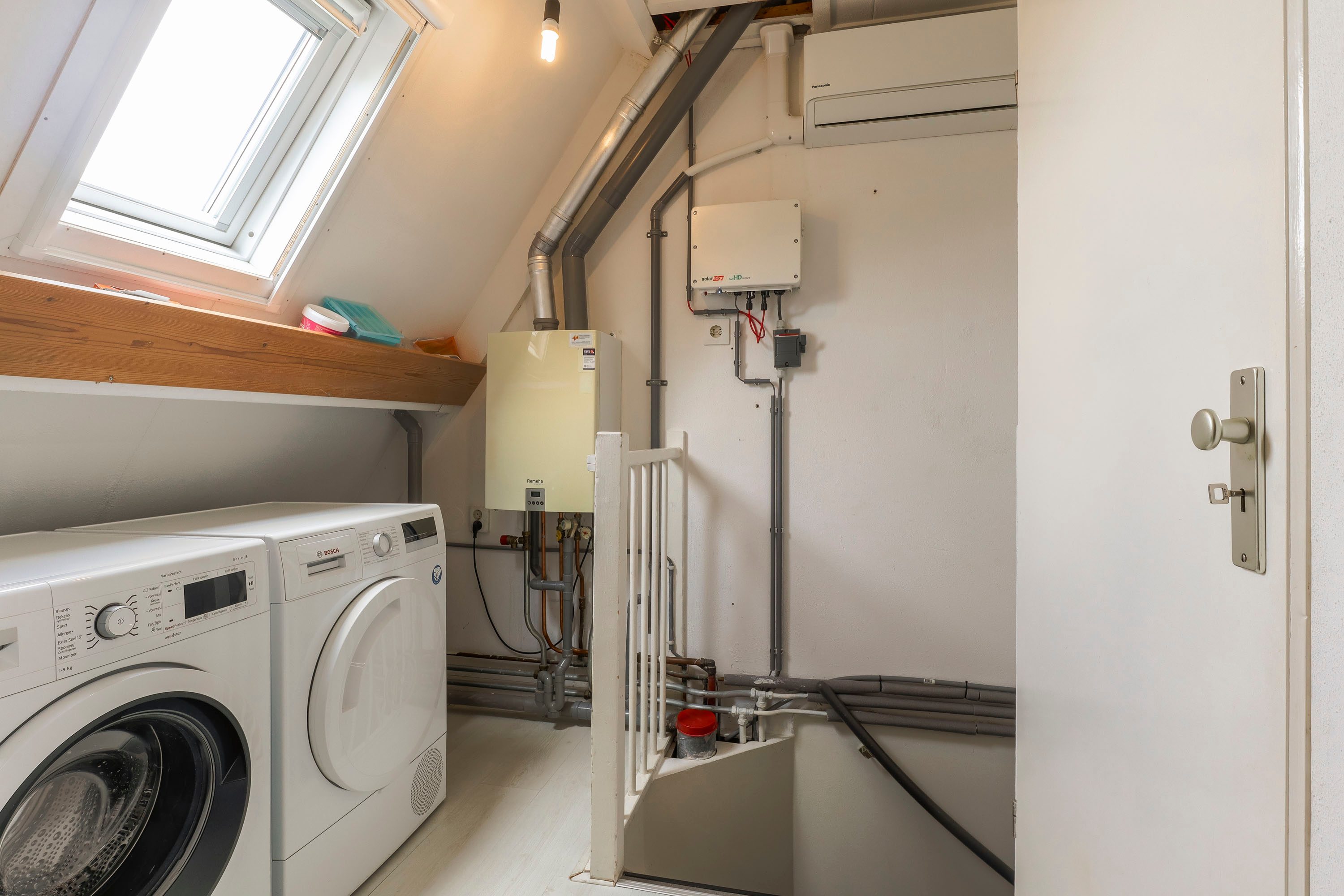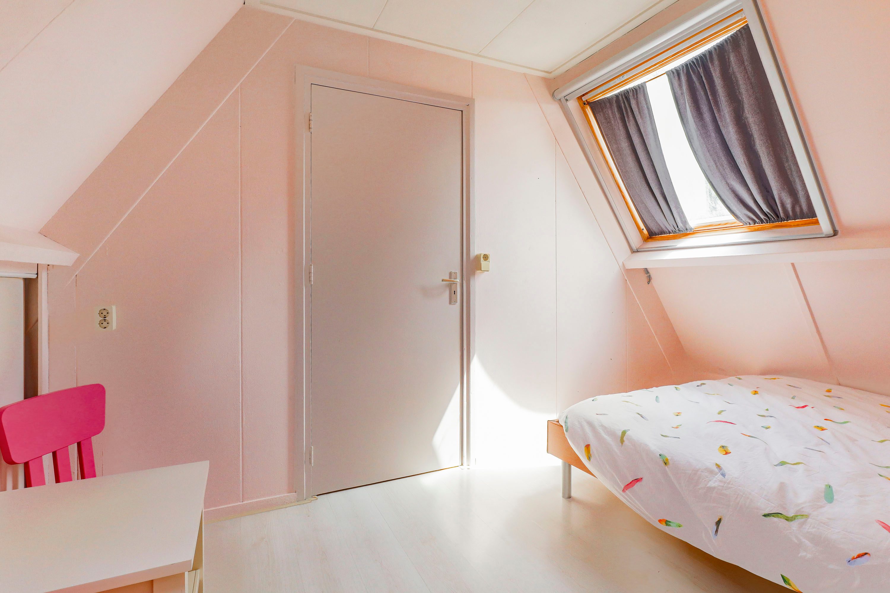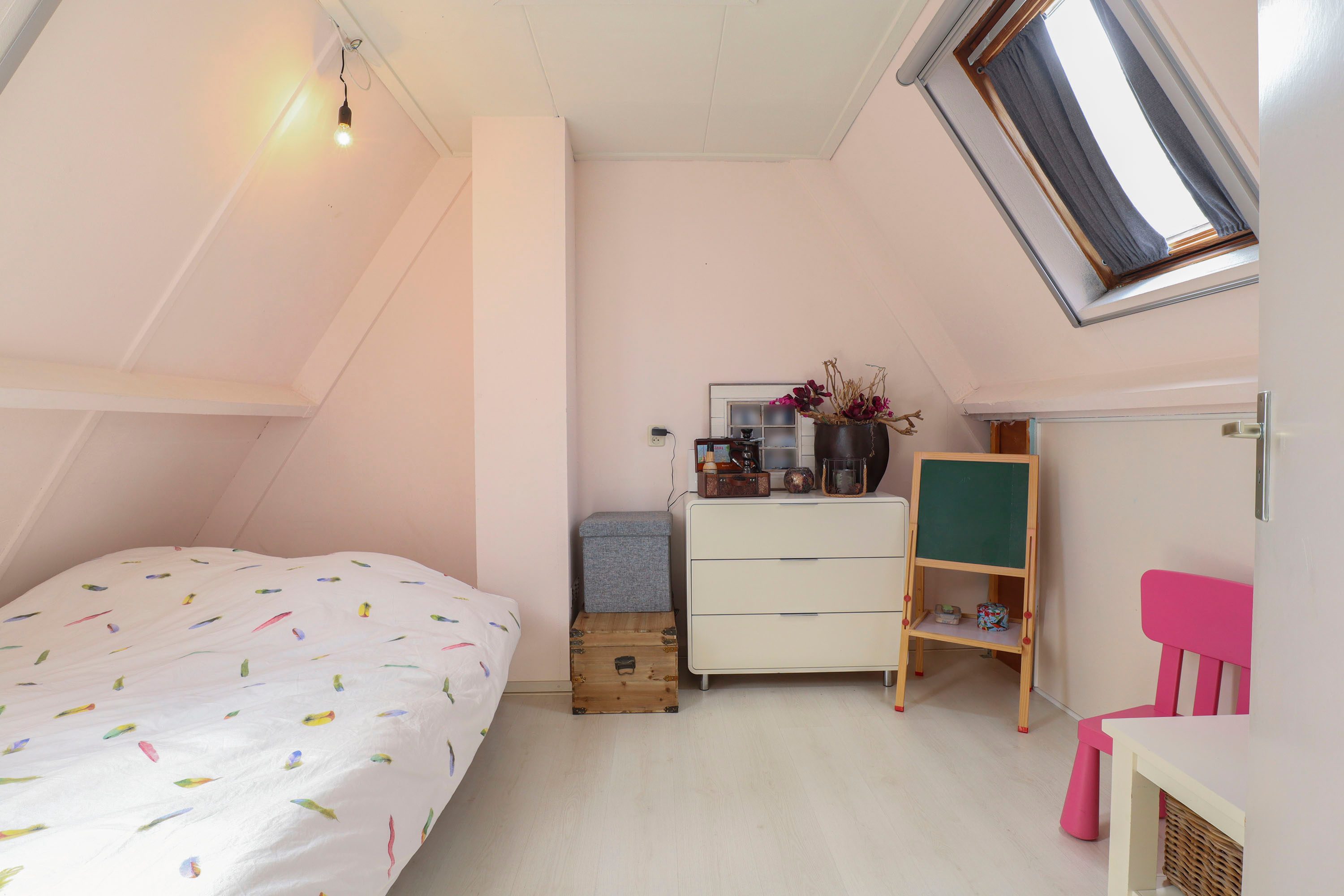 Via een vaste trap bereik je de tweede verdieping, waar een vierde slaapkamer te vinden is. Deze kamer wordt verlicht door een dakraam. Daarnaast biedt deze verdieping praktische bergruimte, ideaal voor het opbergen van spullen.