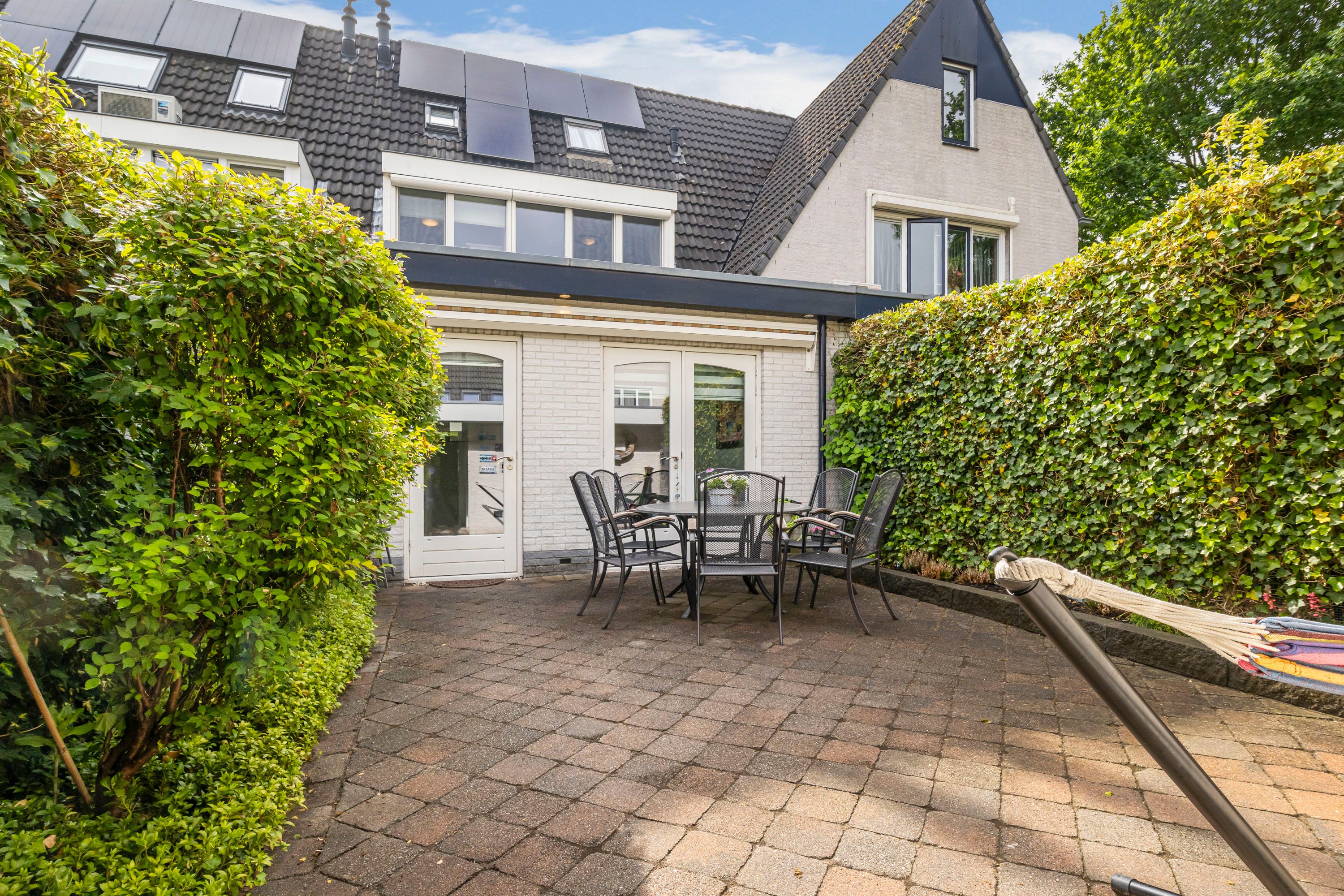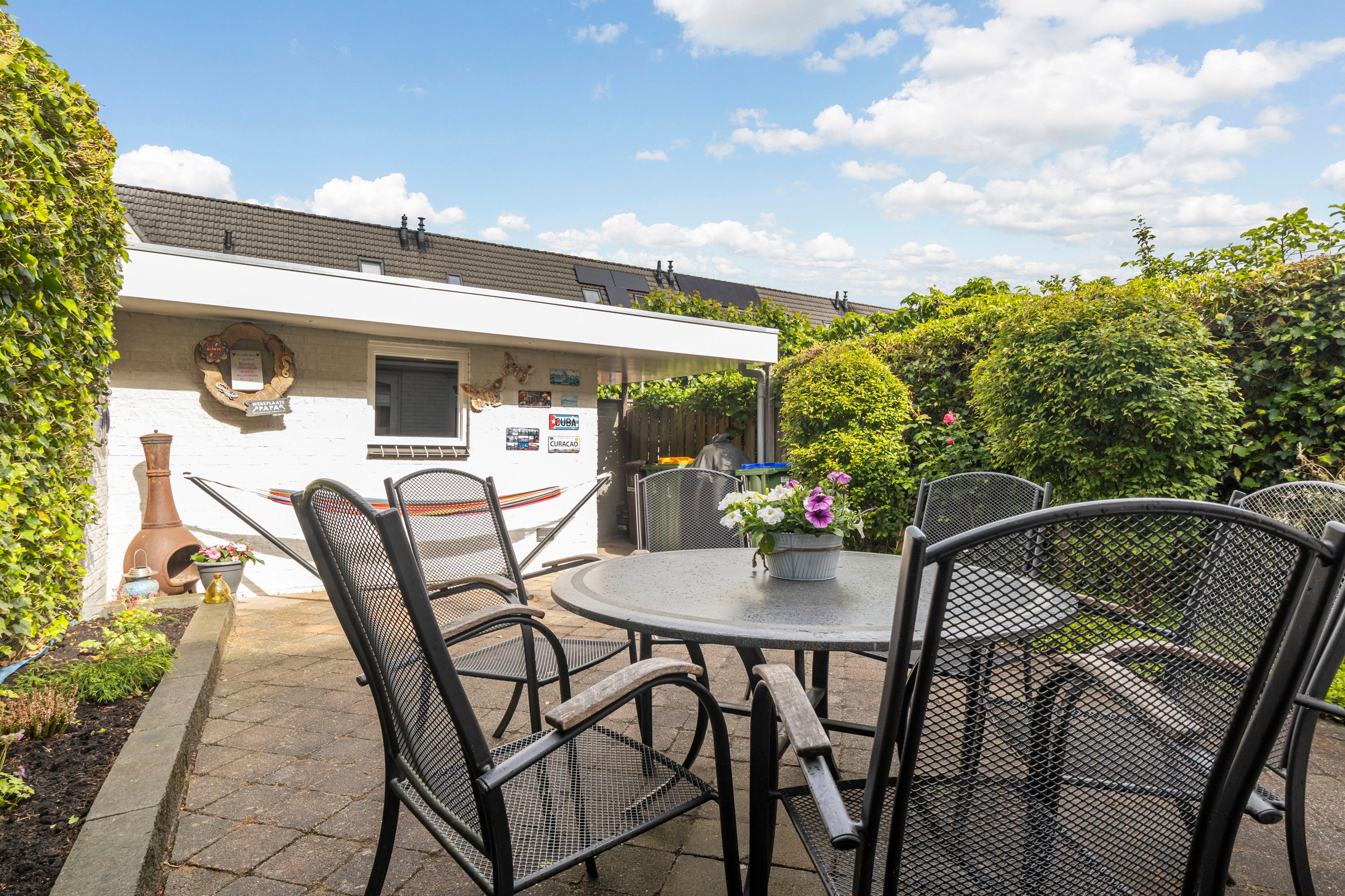 De achtertuin is heerlijk gelegen op het zonnige zuidwesten en voorzien van een zonnescherm voor extra comfort. Daarnaast vind je hier een praktische stenen berging, ideaal voor opslag.