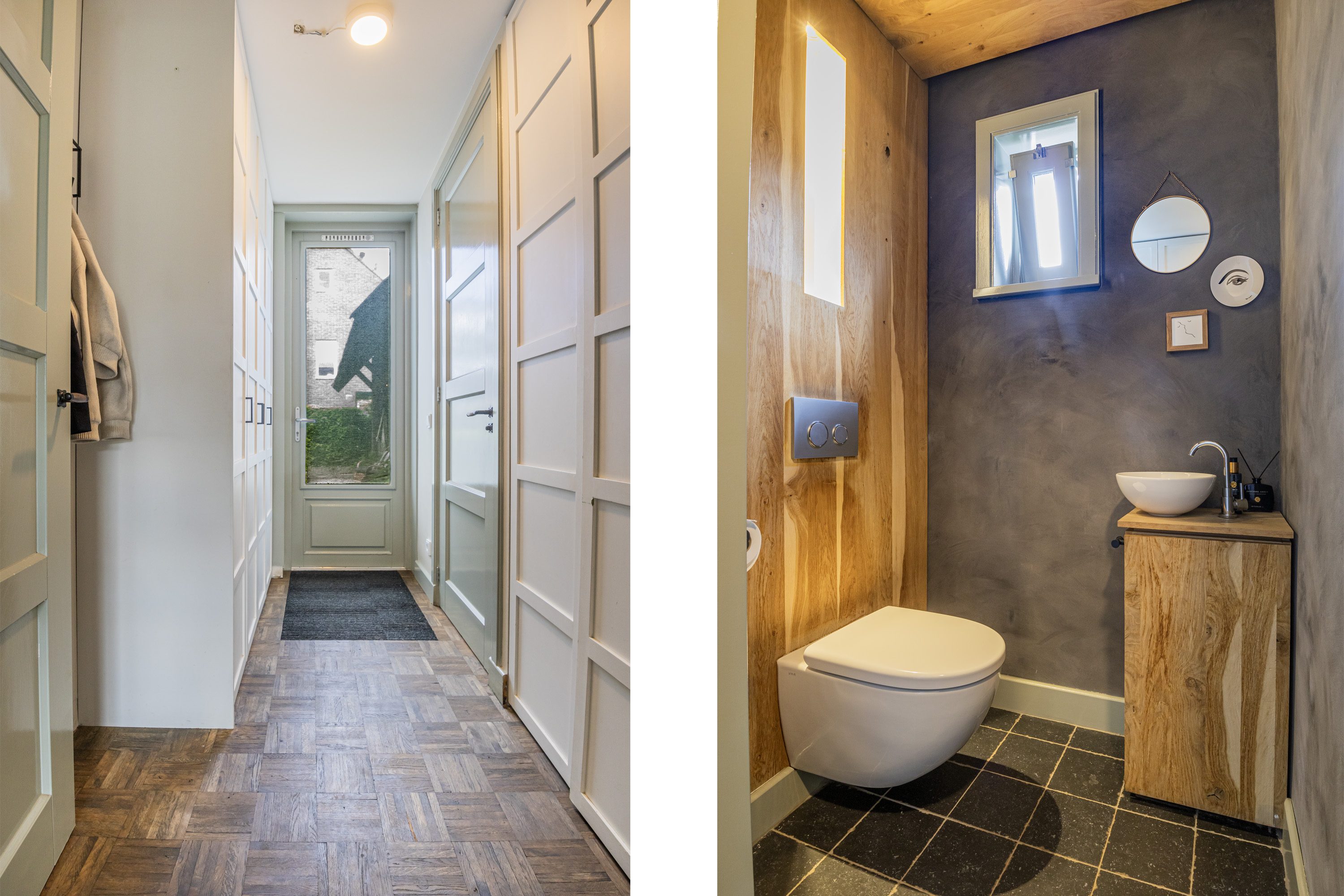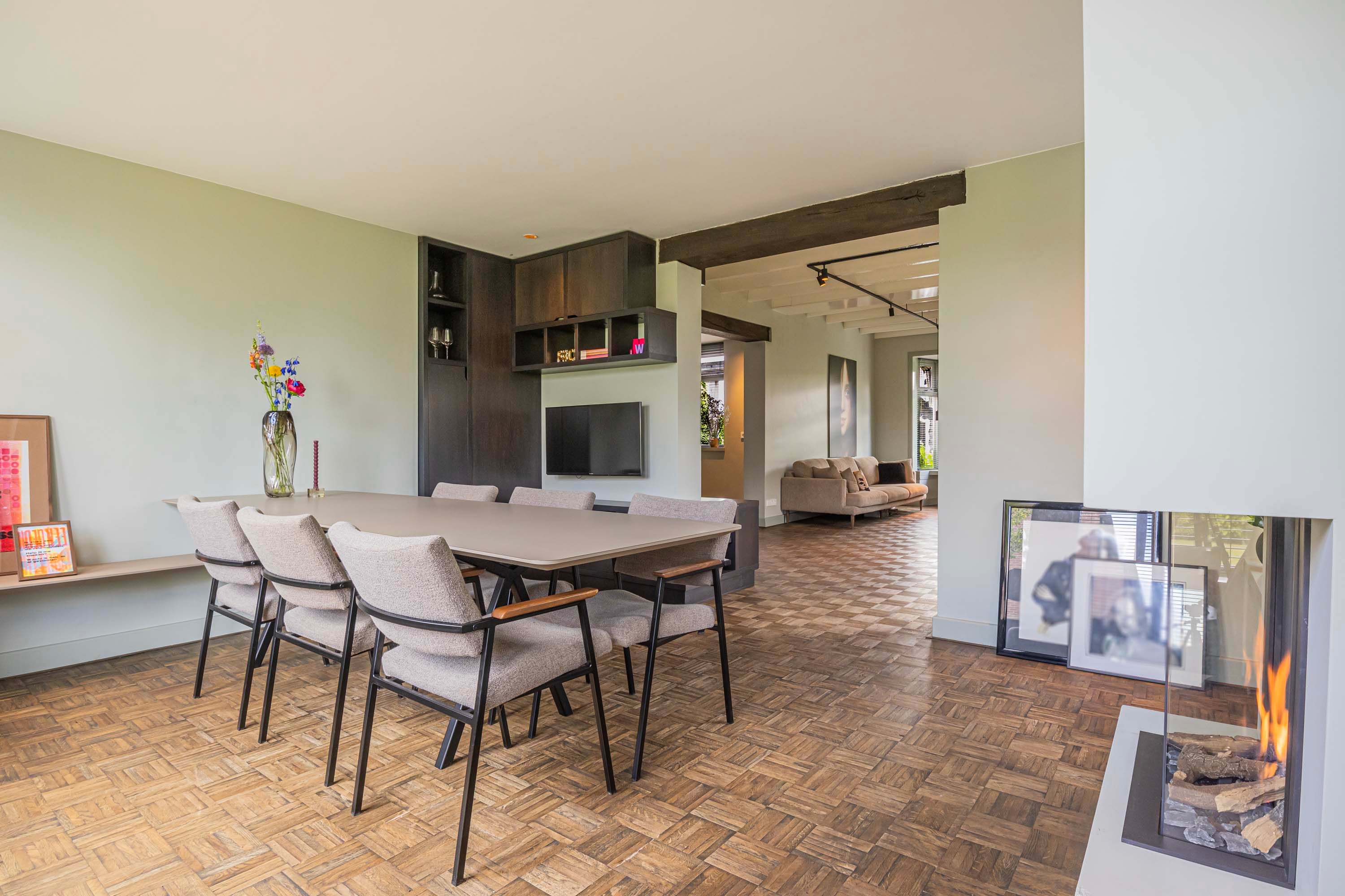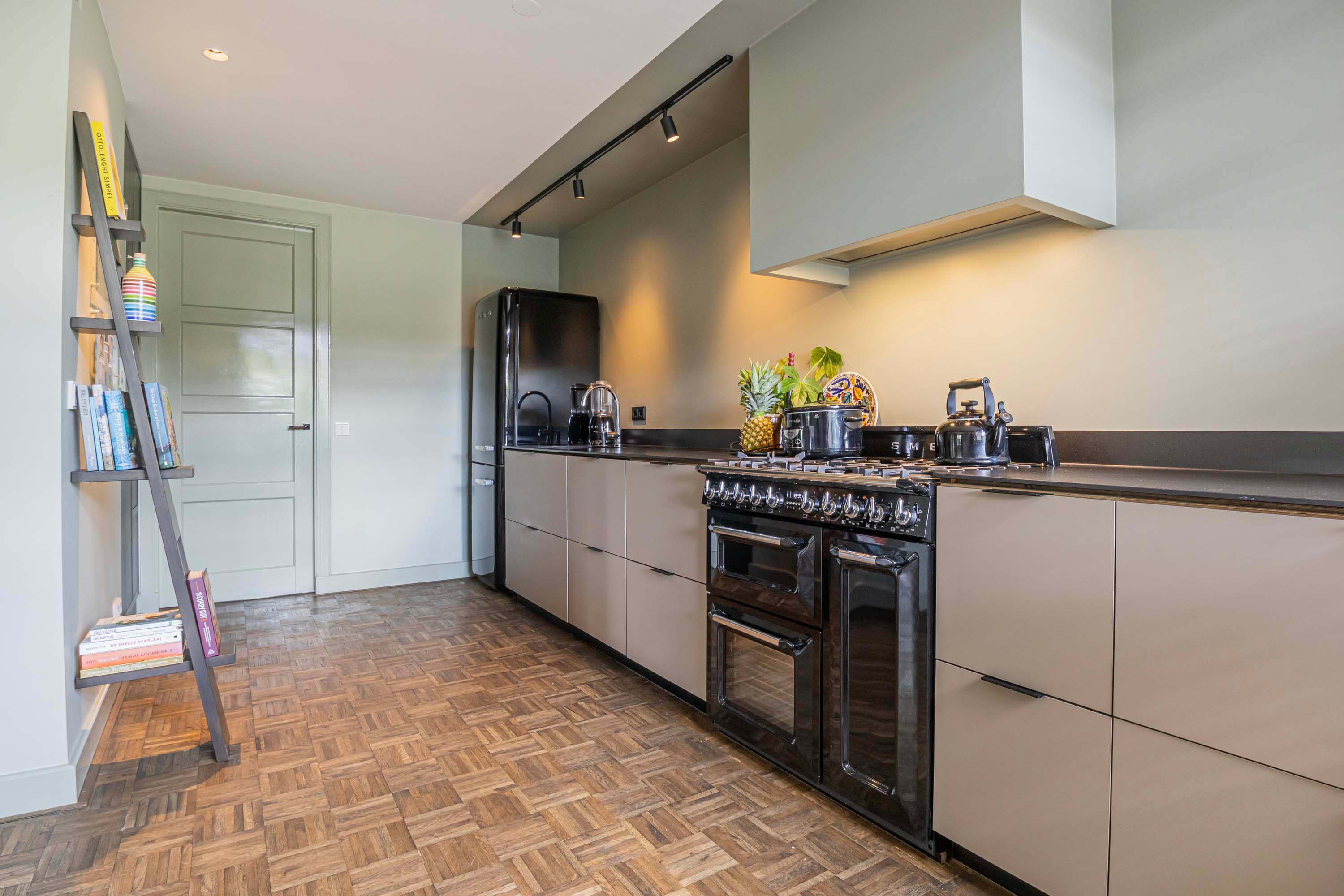 De woonkamer, eetkamer en keuken vormen samen een open en gezellige leefruimte die mooi in elkaar overlopen. Vanuit de eetkamer stap je via openslaande deuren zo de achtertuin in, ideaal voor zonnige dagen en lekker buiten zitten. De moderne keuken is strak afgewerkt met een donker werkblad en lichte kastjes. Hier vind je alle benodigde apparatuur, zoals een afzuigkap, een Smeg-vijfpits gasfornuis inclusief oven, een vaatwasser en een losstaande Smeg koel-vriescombinatie. Vanuit de keuken loop je door naar de bijkeuken, die is voorzien van een toilet en opbergruimte. Via de bijkeuken kom je ook direct in de tuin.