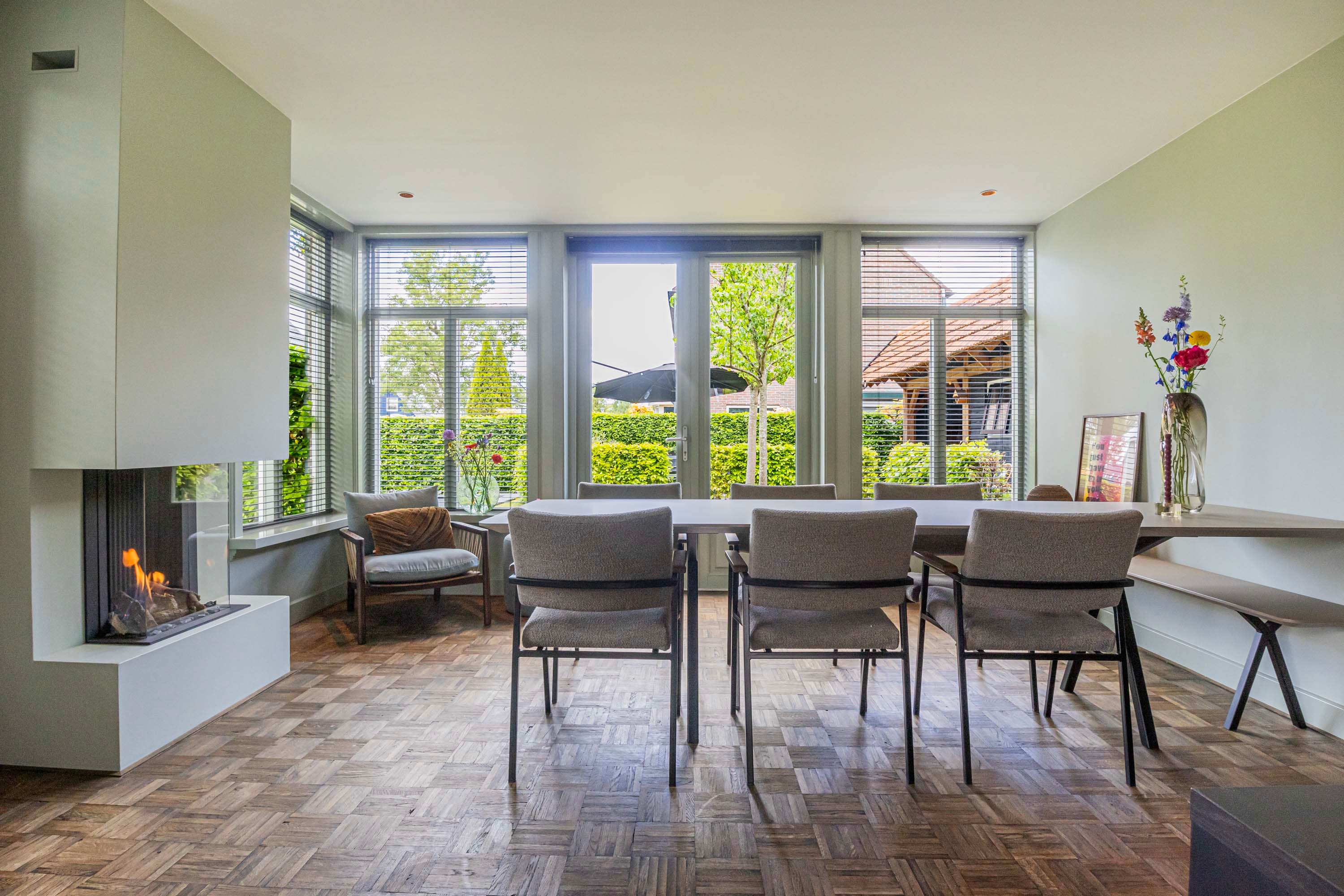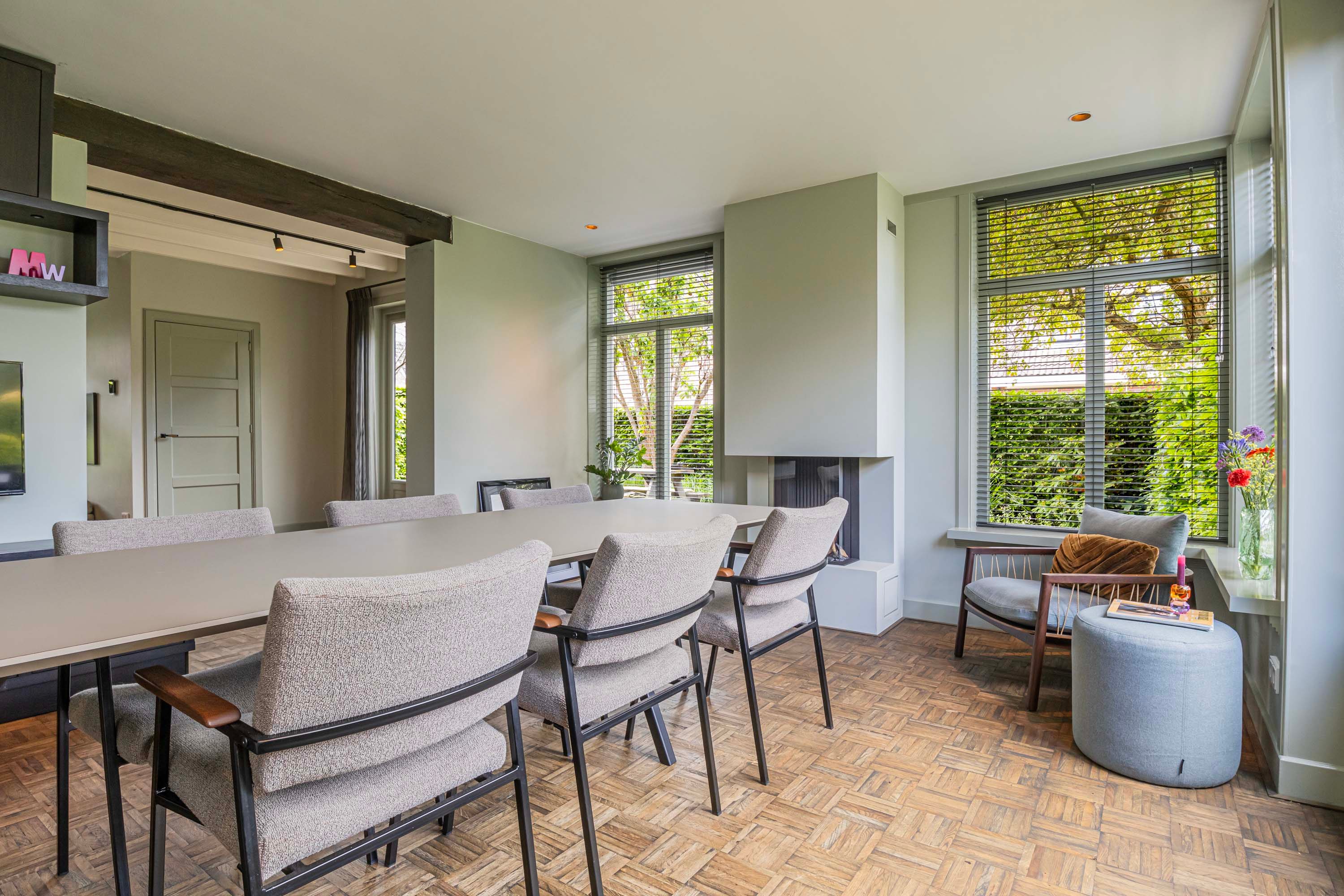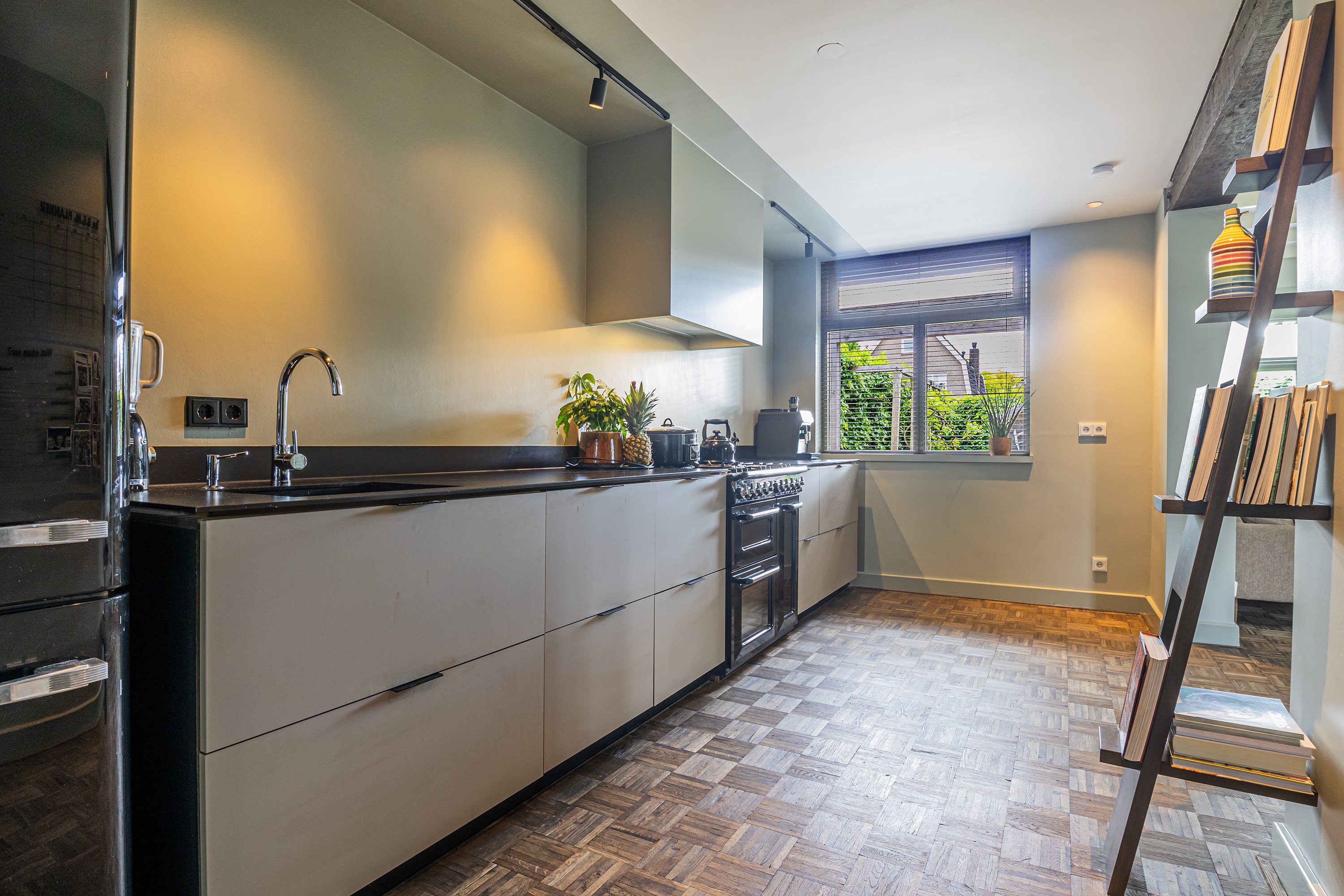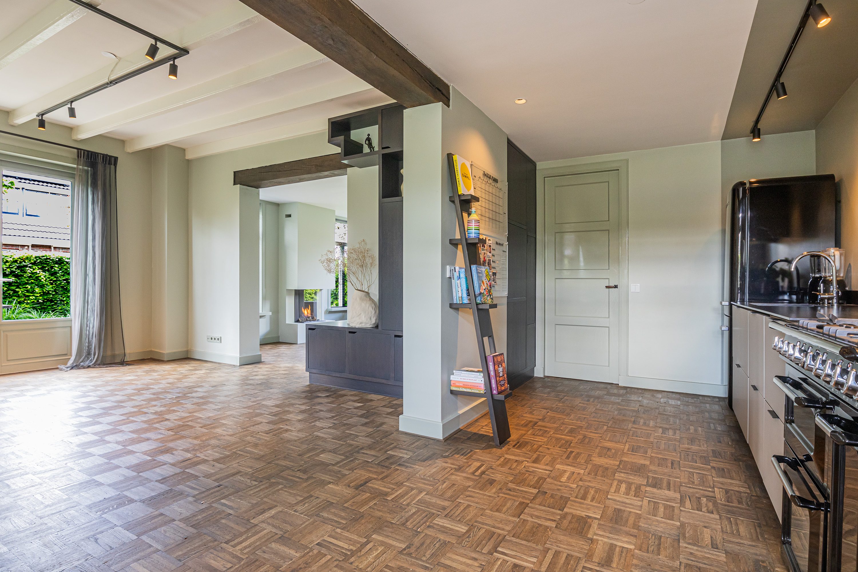 De woonkamer, eetkamer en keuken vormen samen een open en gezellige leefruimte die mooi in elkaar overlopen. Vanuit de eetkamer stap je via openslaande deuren zo de achtertuin in, ideaal voor zonnige dagen en lekker buiten zitten. De moderne keuken is strak afgewerkt met een donker werkblad en lichte kastjes. Hier vind je alle benodigde apparatuur, zoals een afzuigkap, een Smeg-vijfpits gasfornuis inclusief oven, een vaatwasser en een losstaande Smeg koel-vriescombinatie. Vanuit de keuken loop je door naar de bijkeuken, die is voorzien van een toilet en opbergruimte. Via de bijkeuken kom je ook direct in de tuin.