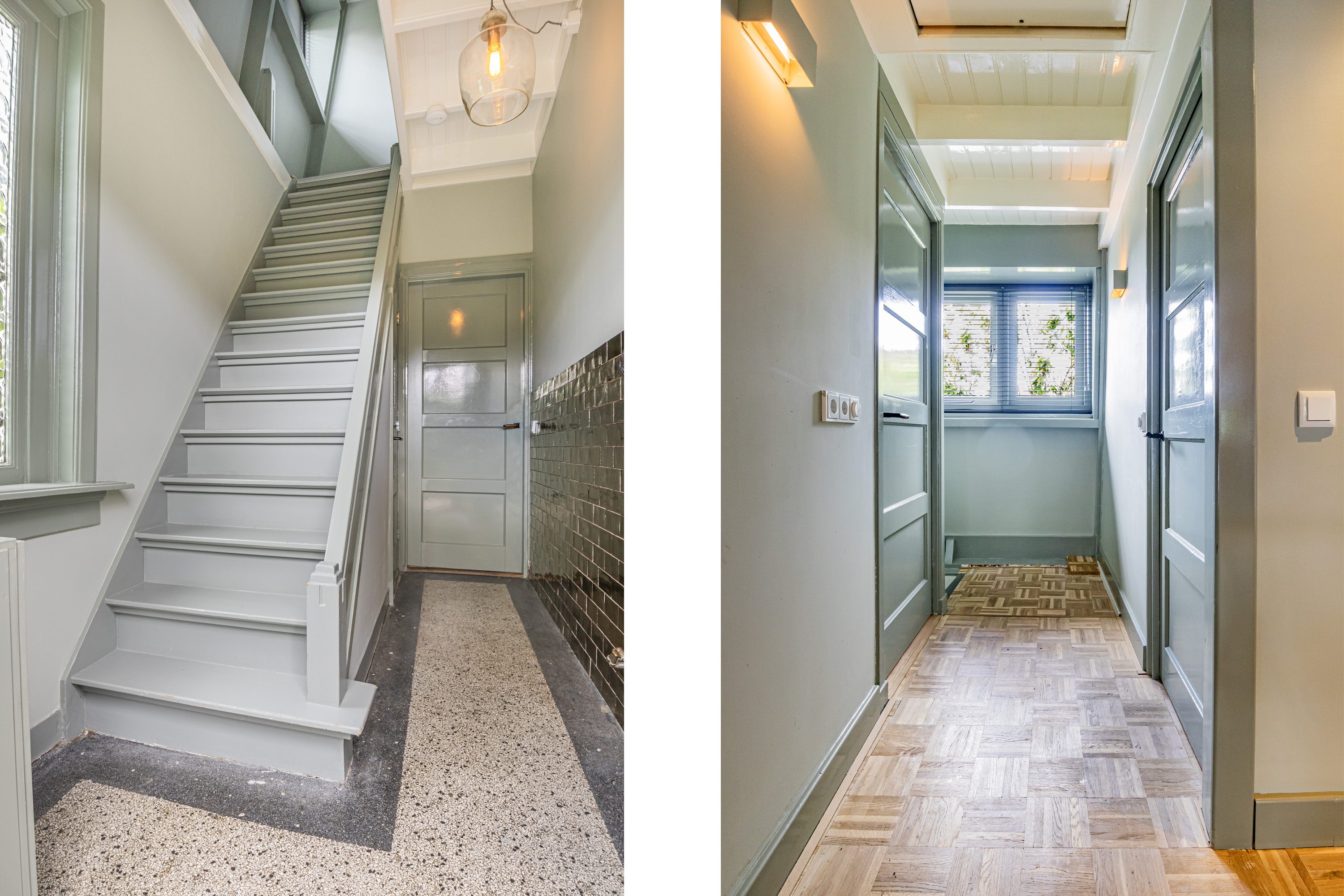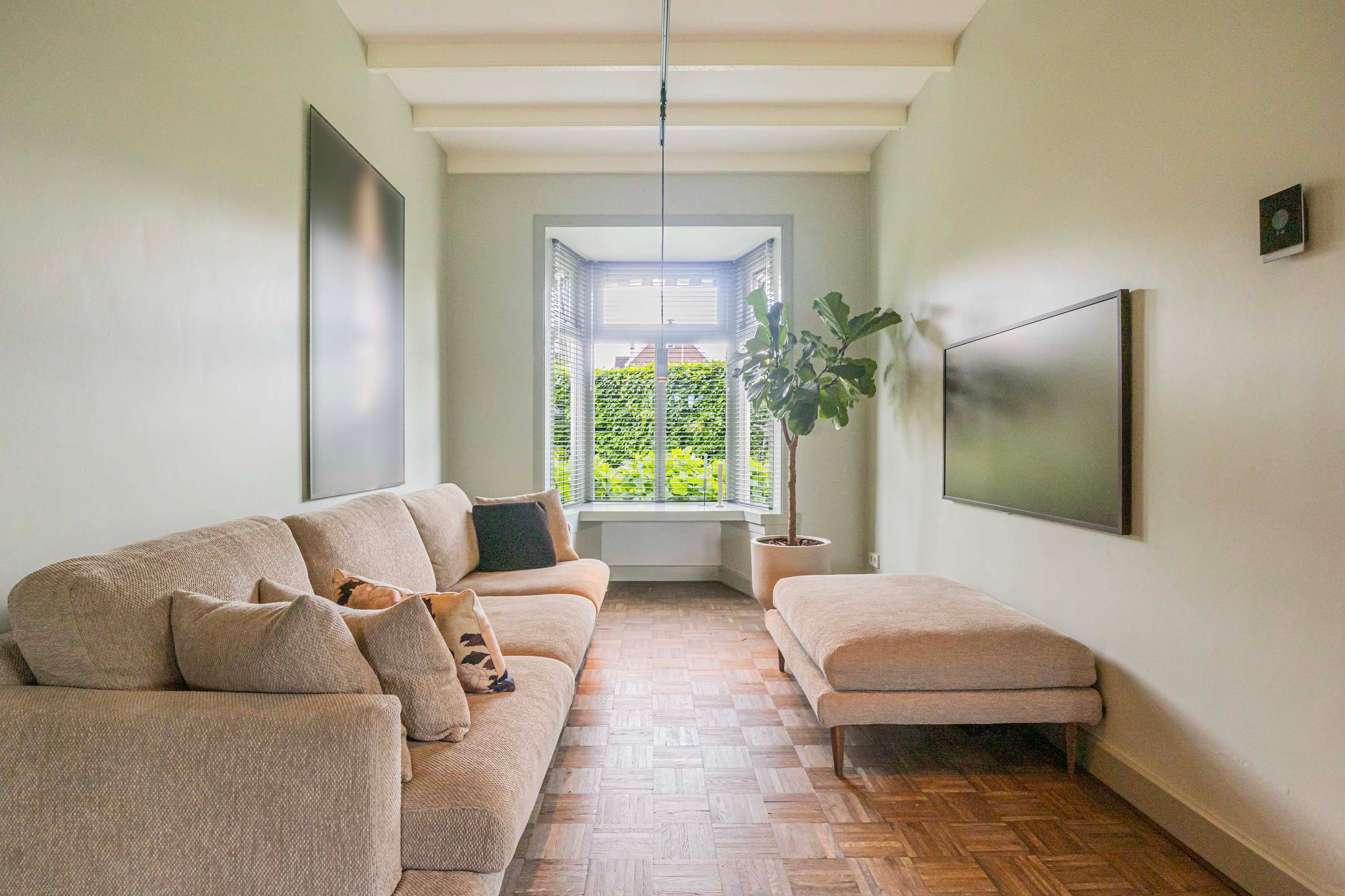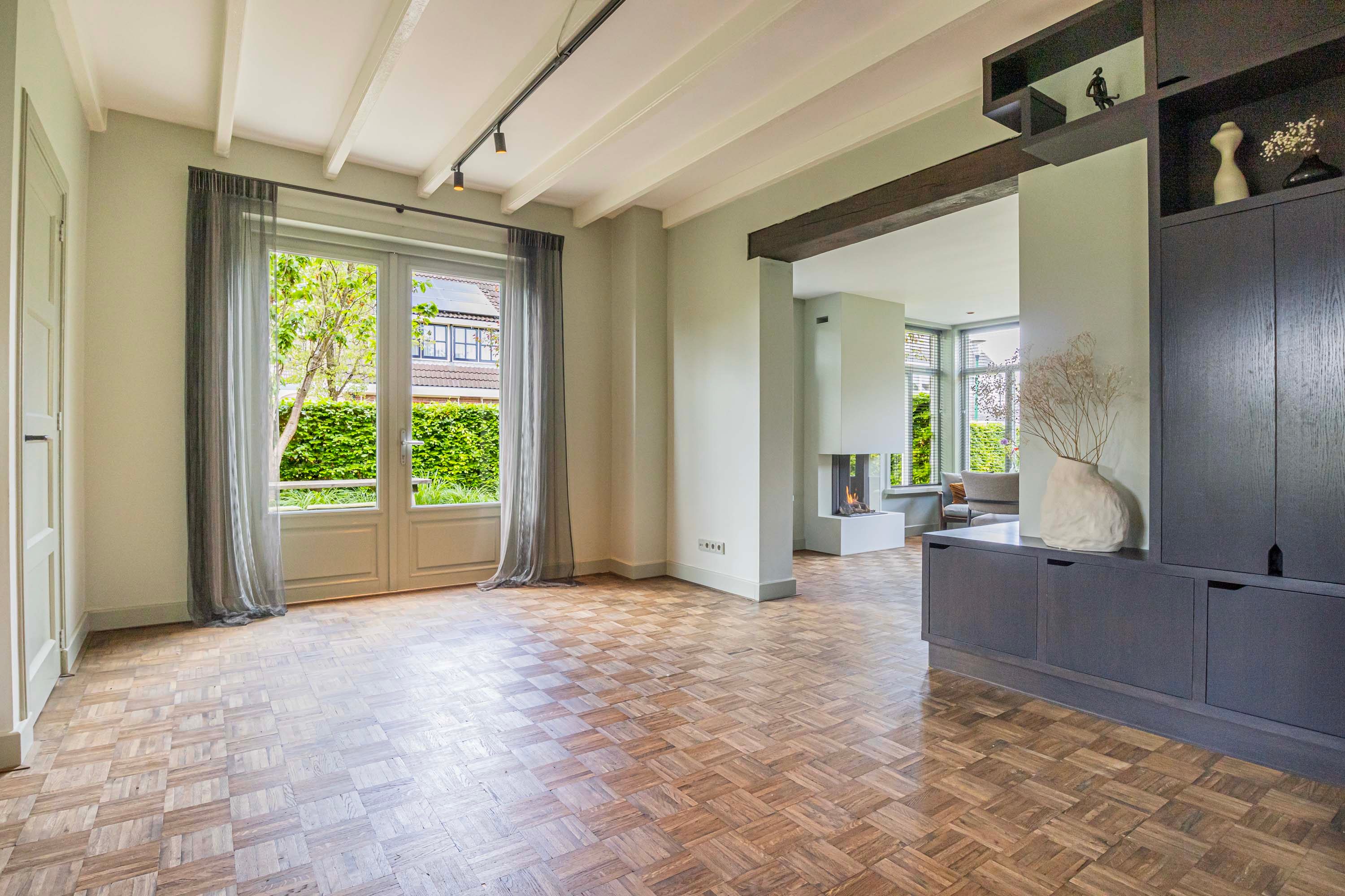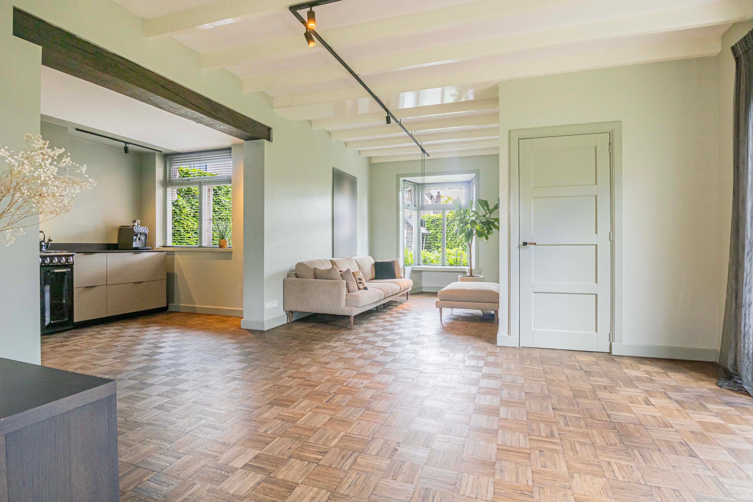 Als je deze charmante woning binnenstapt, kom je terecht in een ruime hal. Vanuit hier heb je toegang tot de woonkamer, de trap naar de eerste verdieping en een praktische voorraadkelder van 6 m². De woonkamer is licht en ruim, met aan de linkerzijde twee openslaande deuren die leiden naar de zijtuin. De prachtige erker geeft extra karakter aan de ruimte en zorgt voor veel natuurlijk licht.